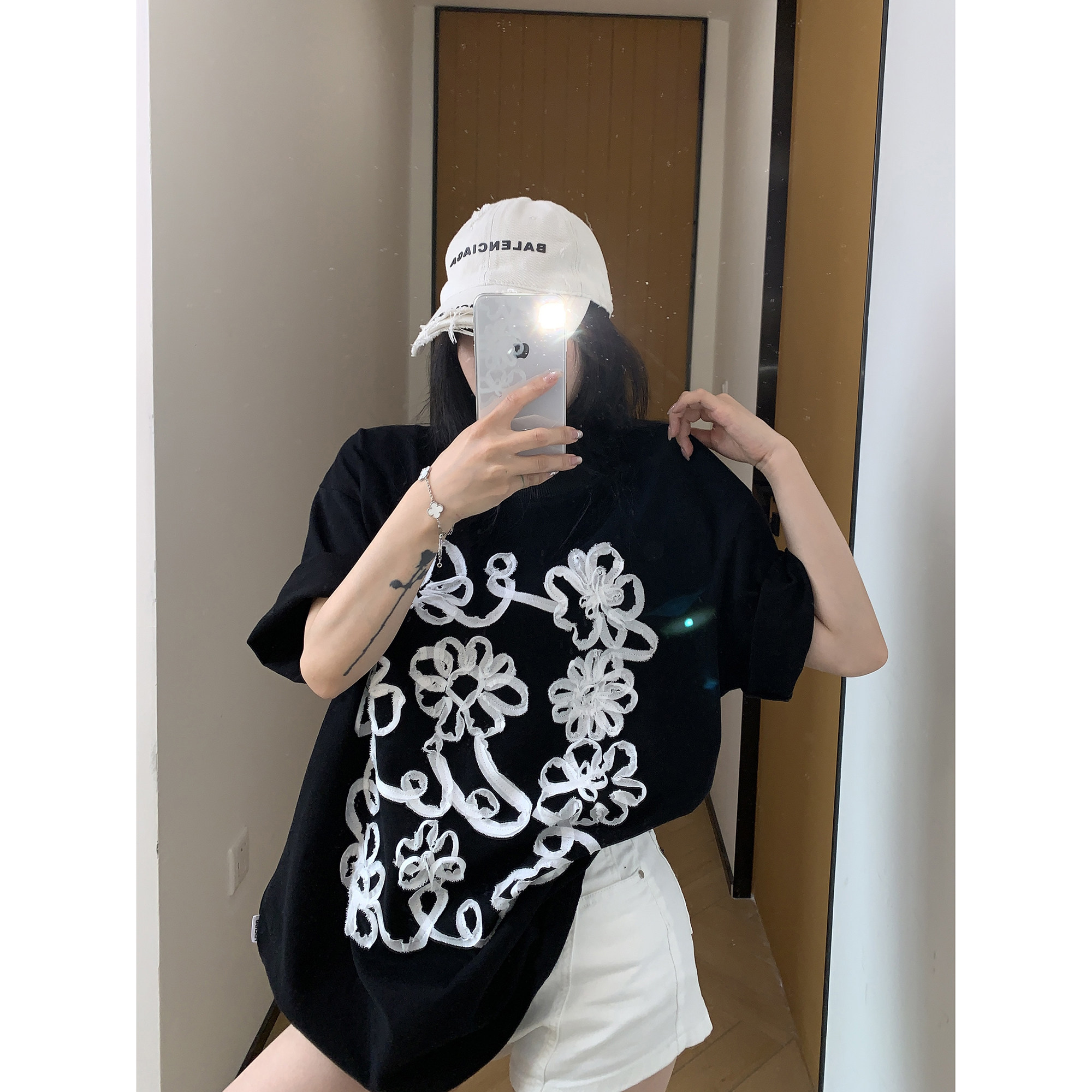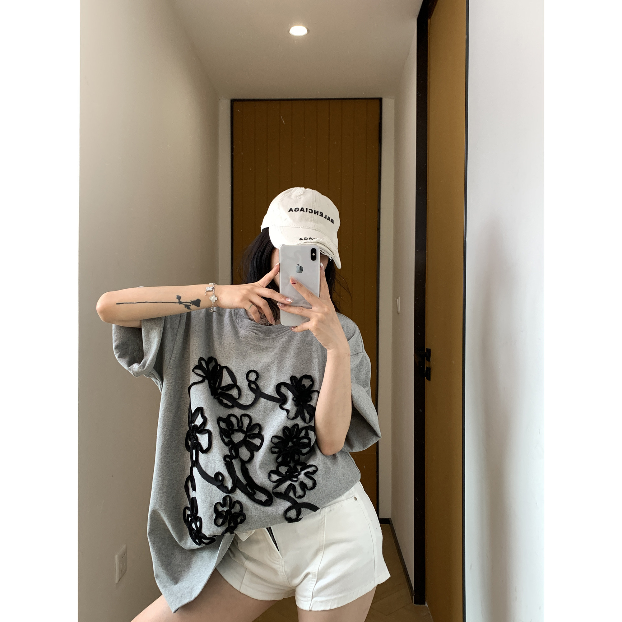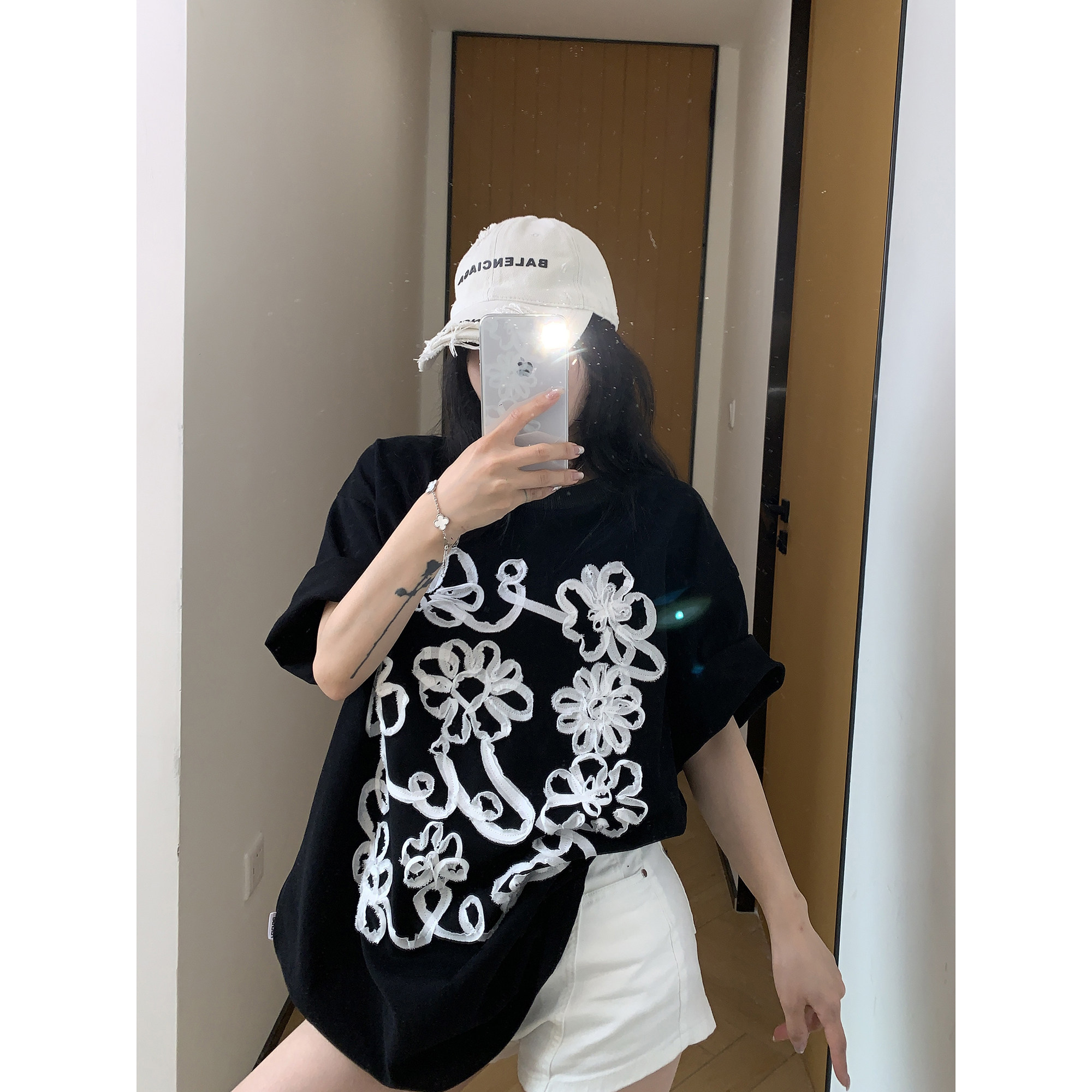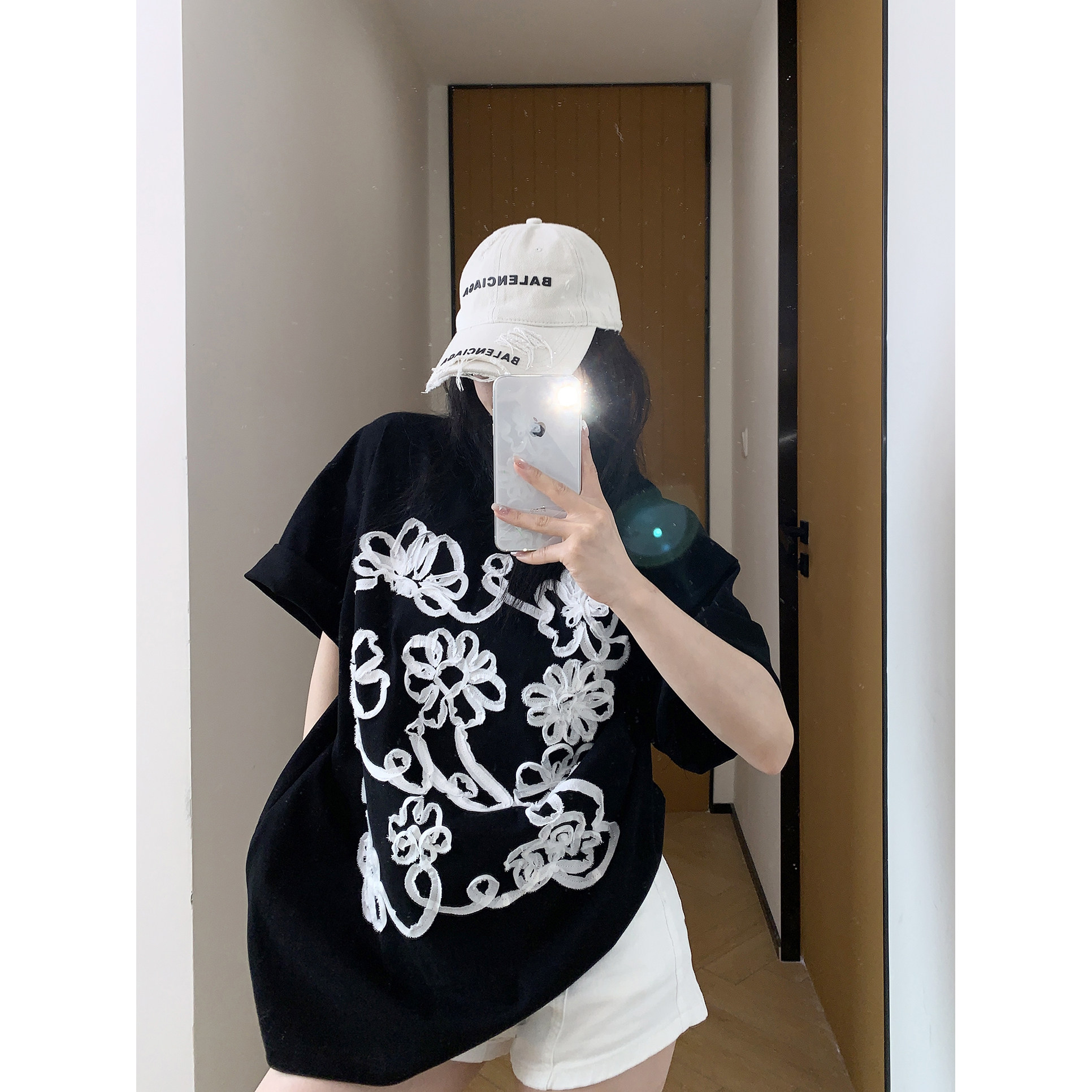【トップス】夏 フラワーワッペン刺繍 コットン Tシャツ 【FCシリーズ】