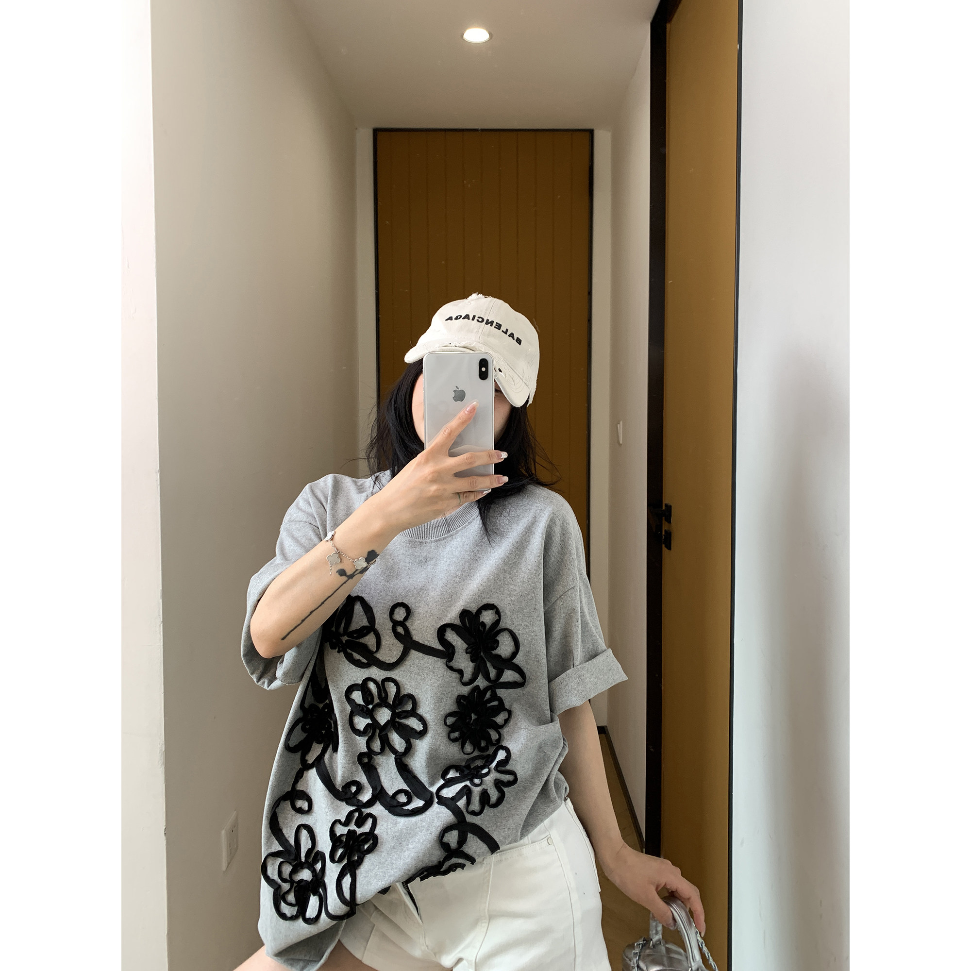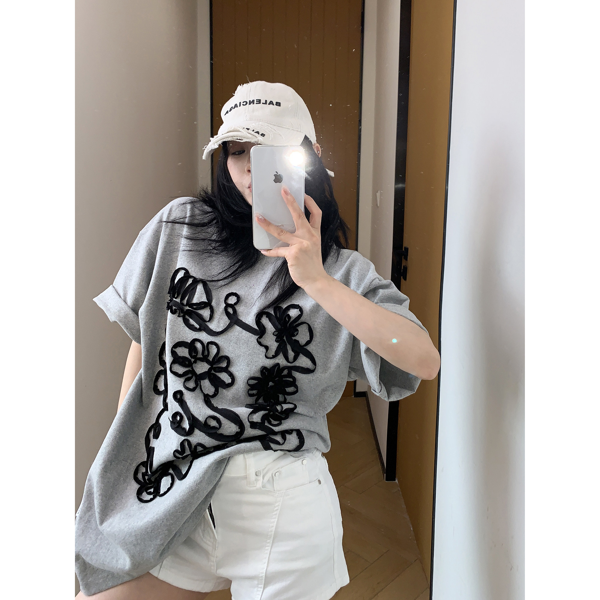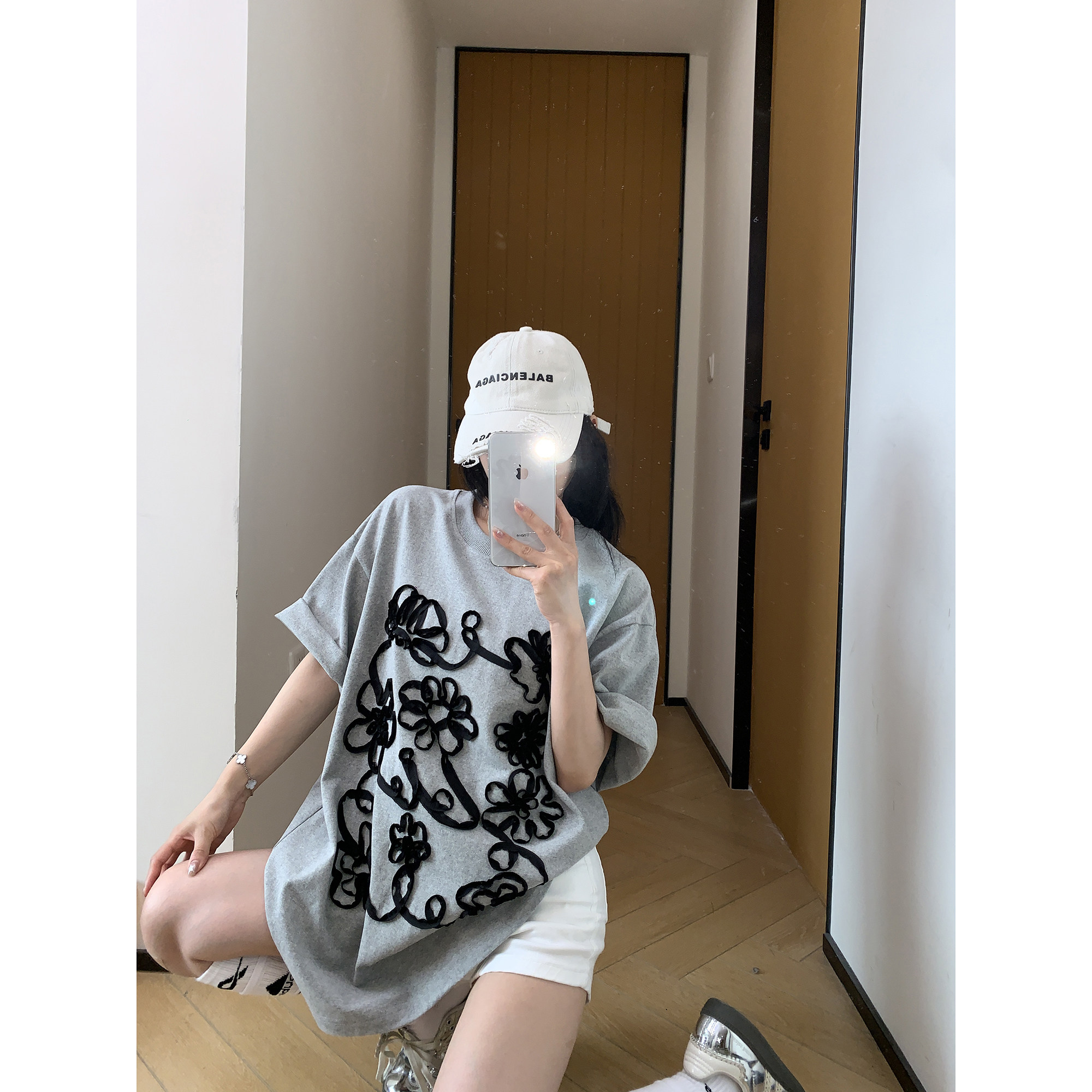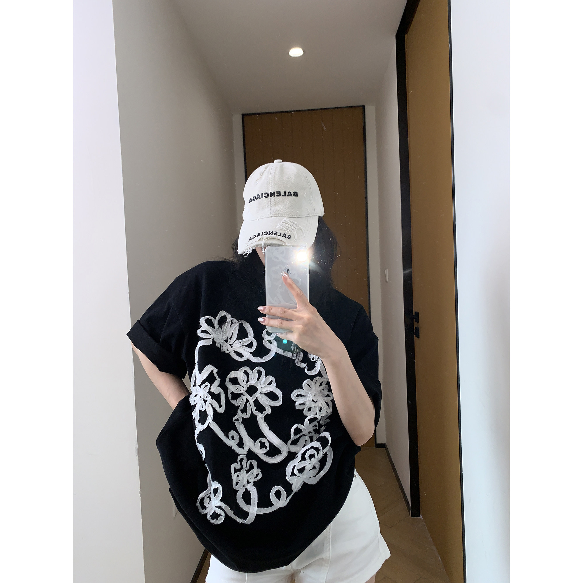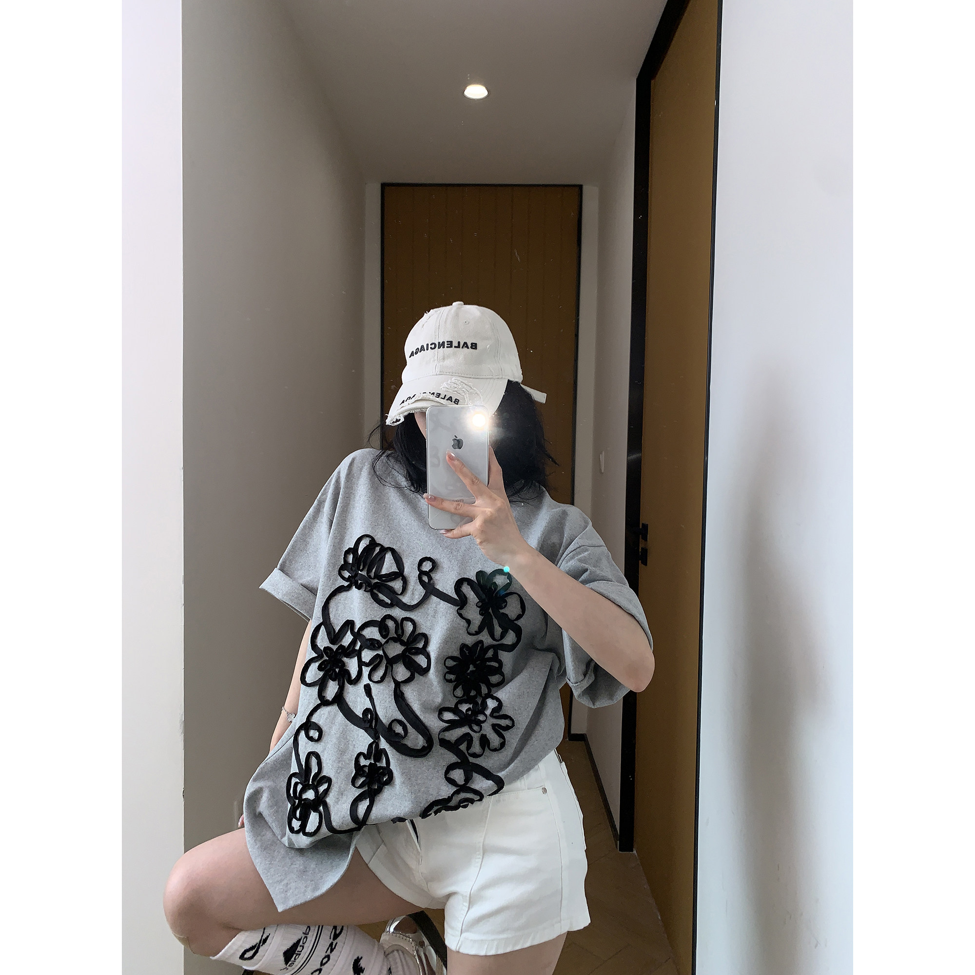 【トップス】夏 フラワーワッペン刺繍 コットン Tシャツ 【FCシリーズ】