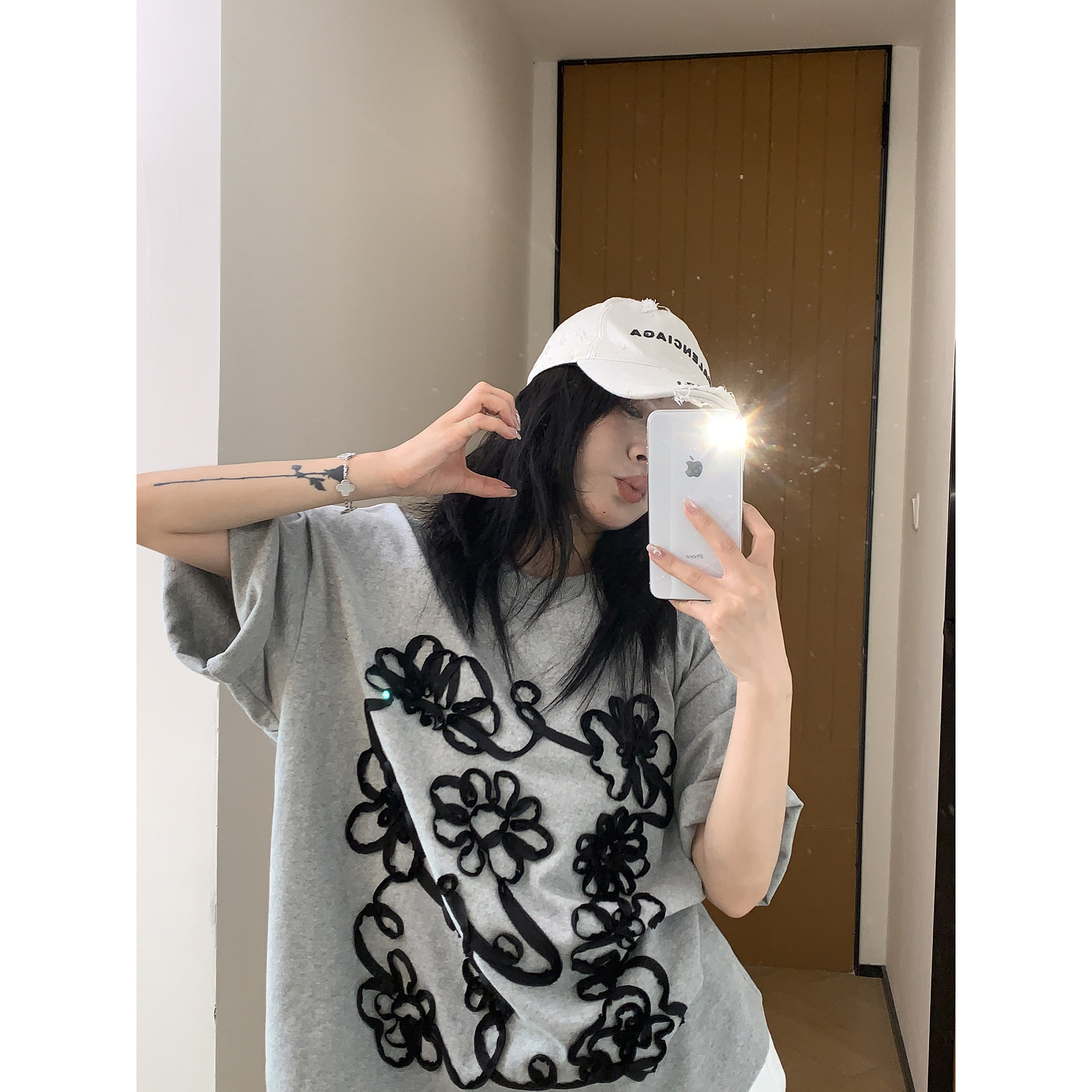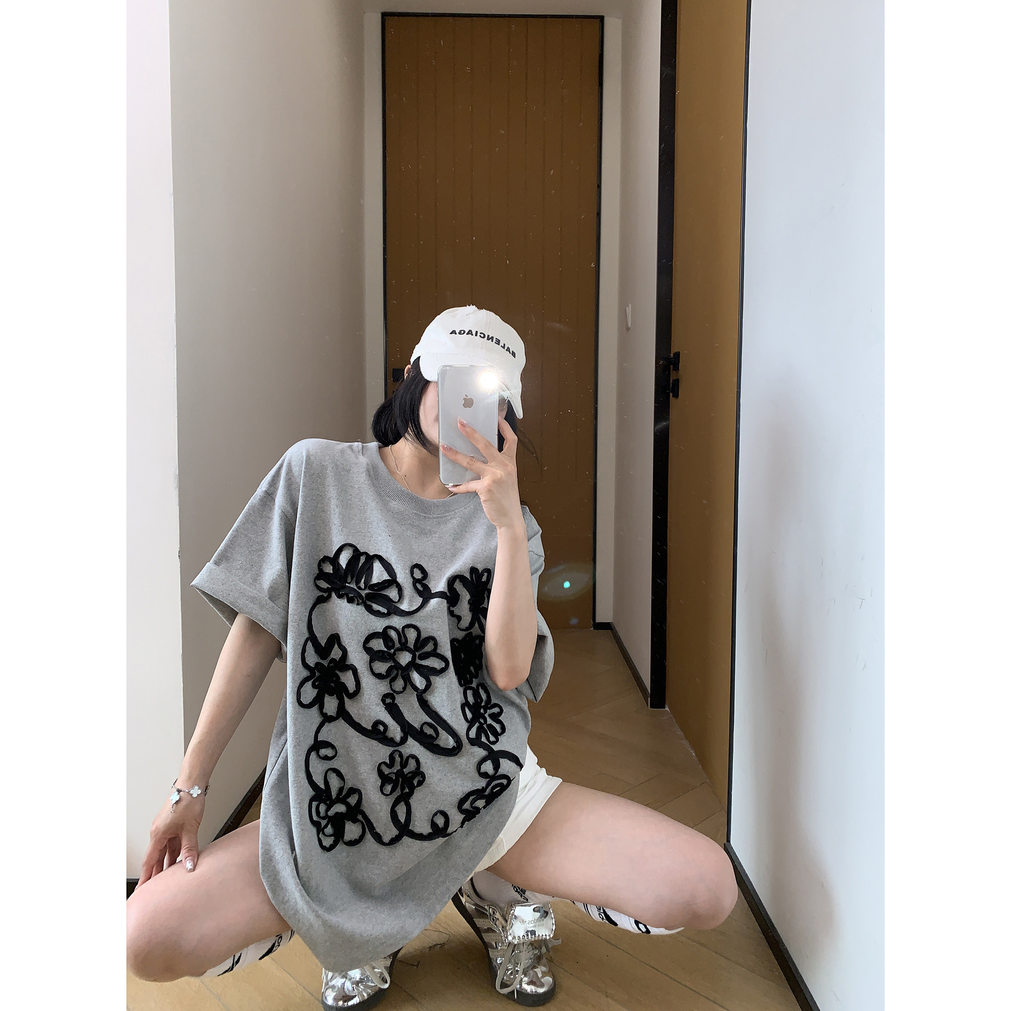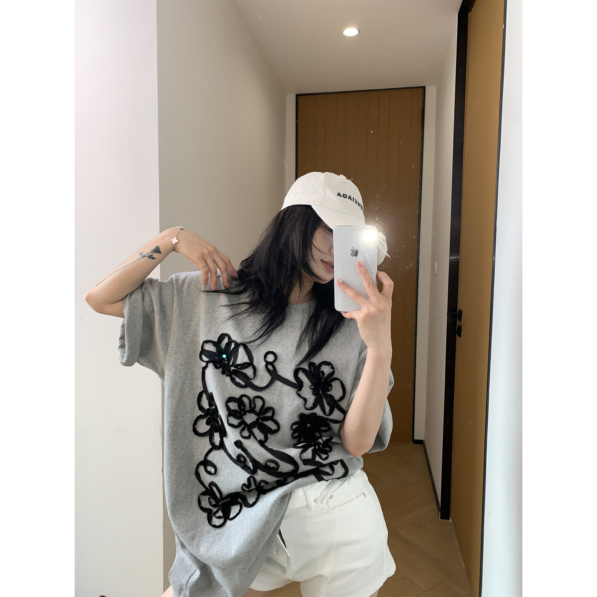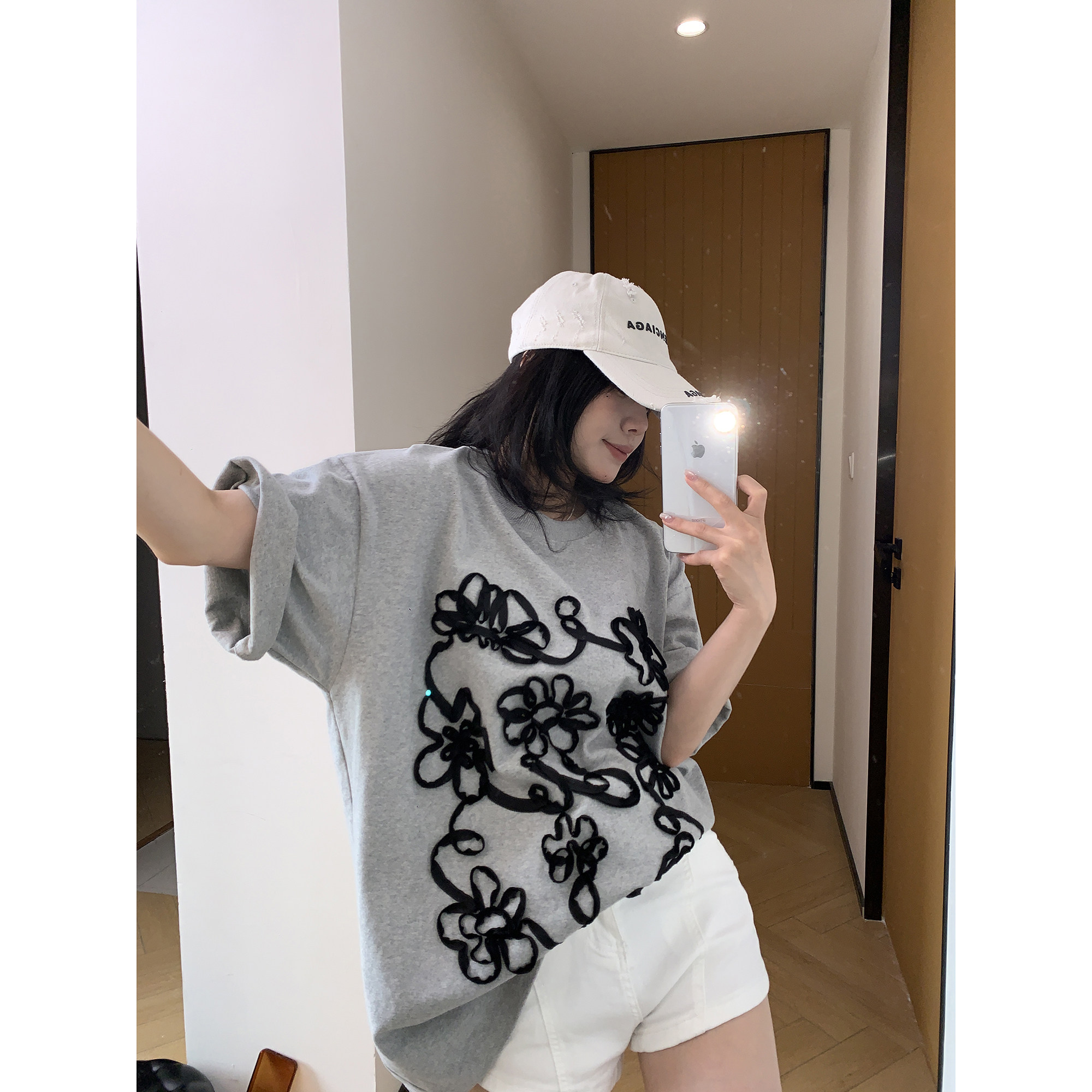 【トップス】夏 フラワーワッペン刺繍 コットン Tシャツ 【FCシリーズ】