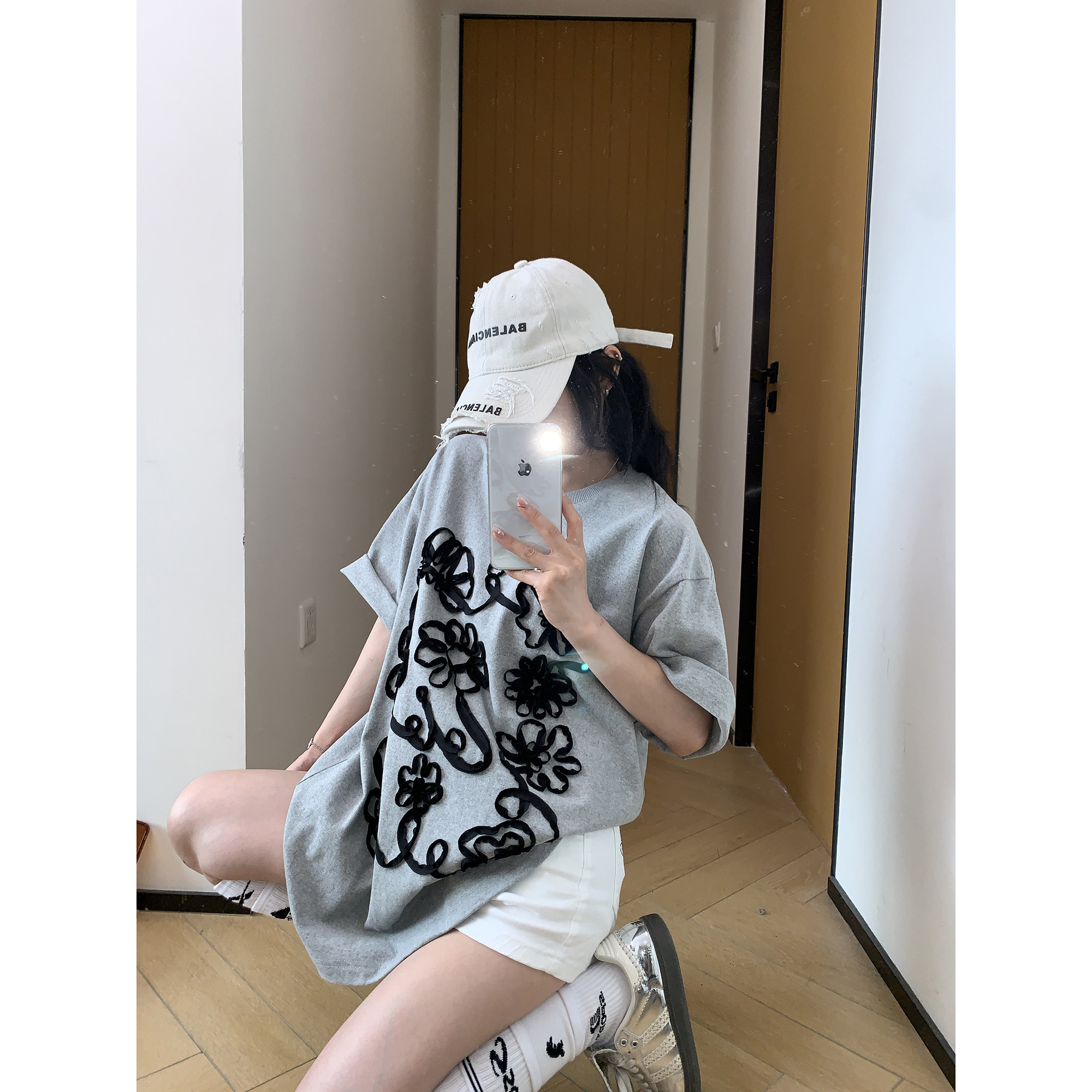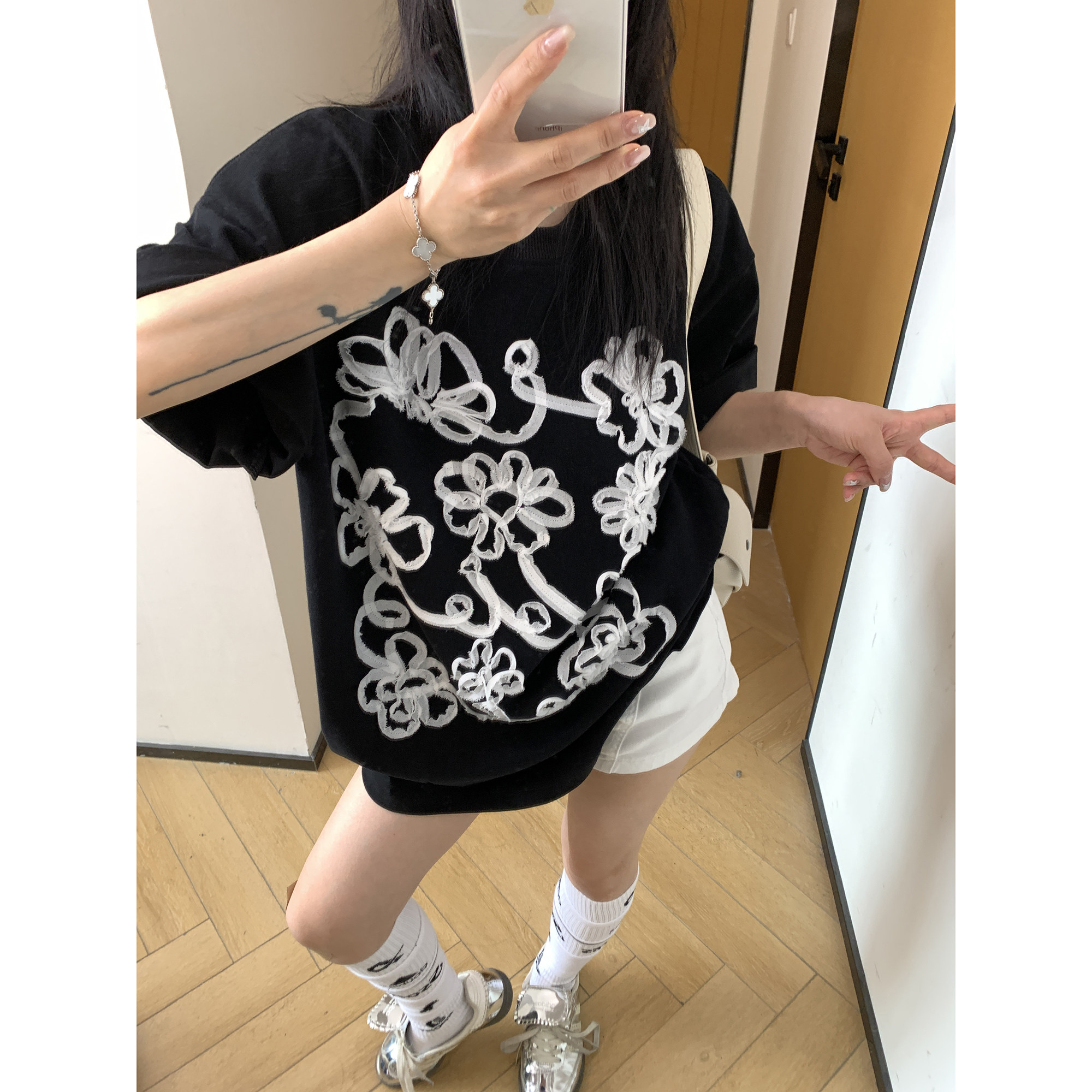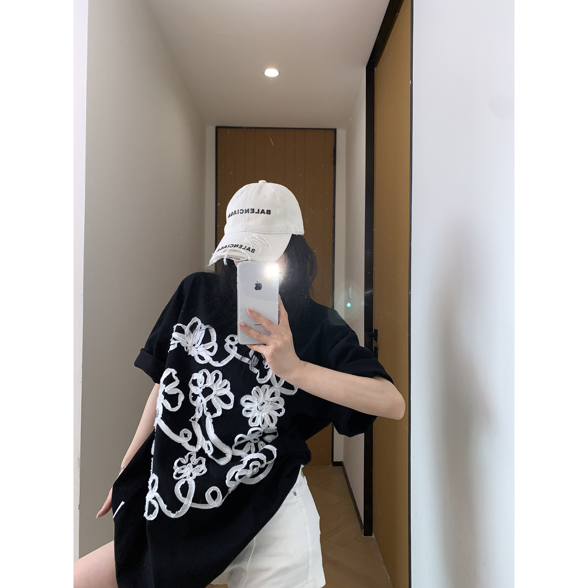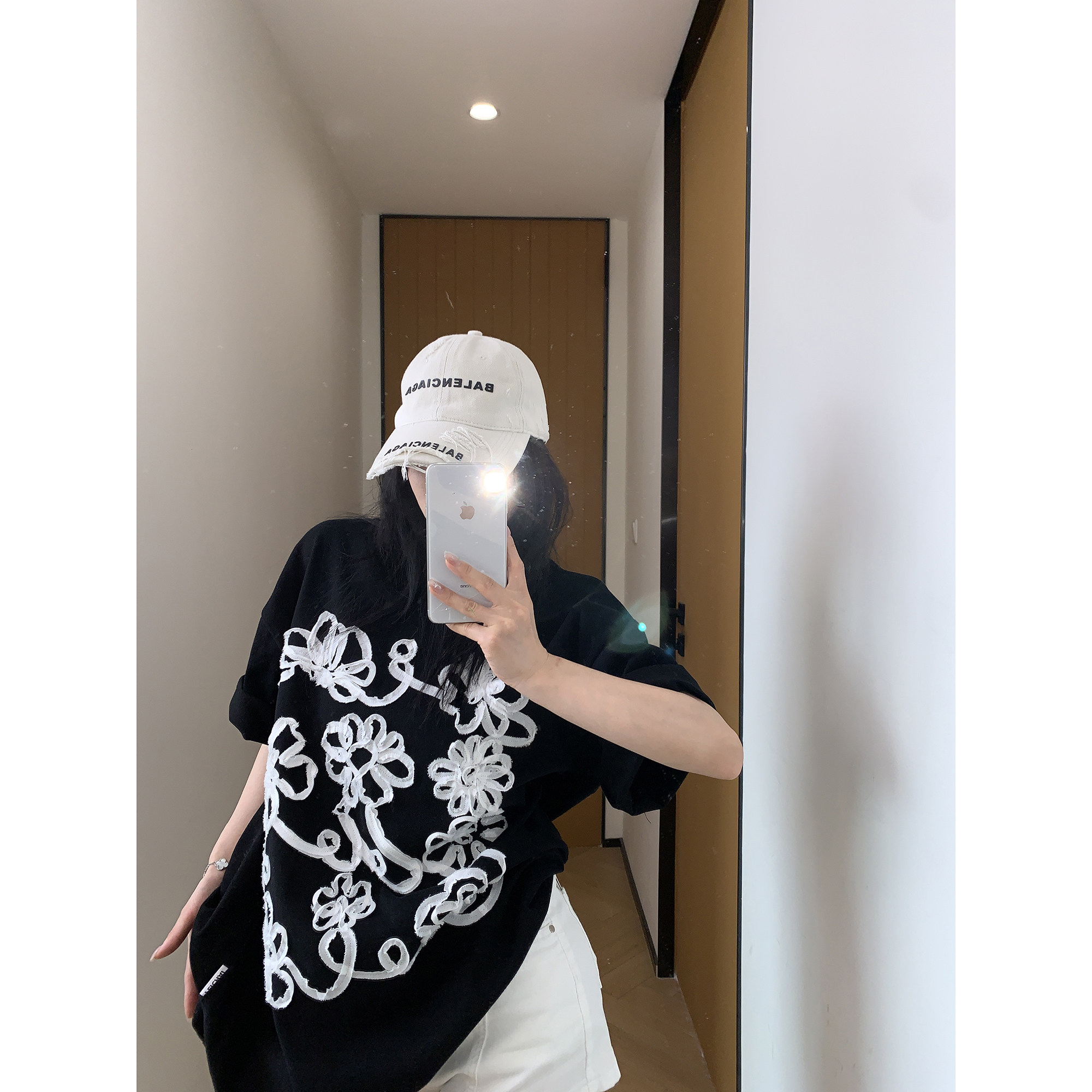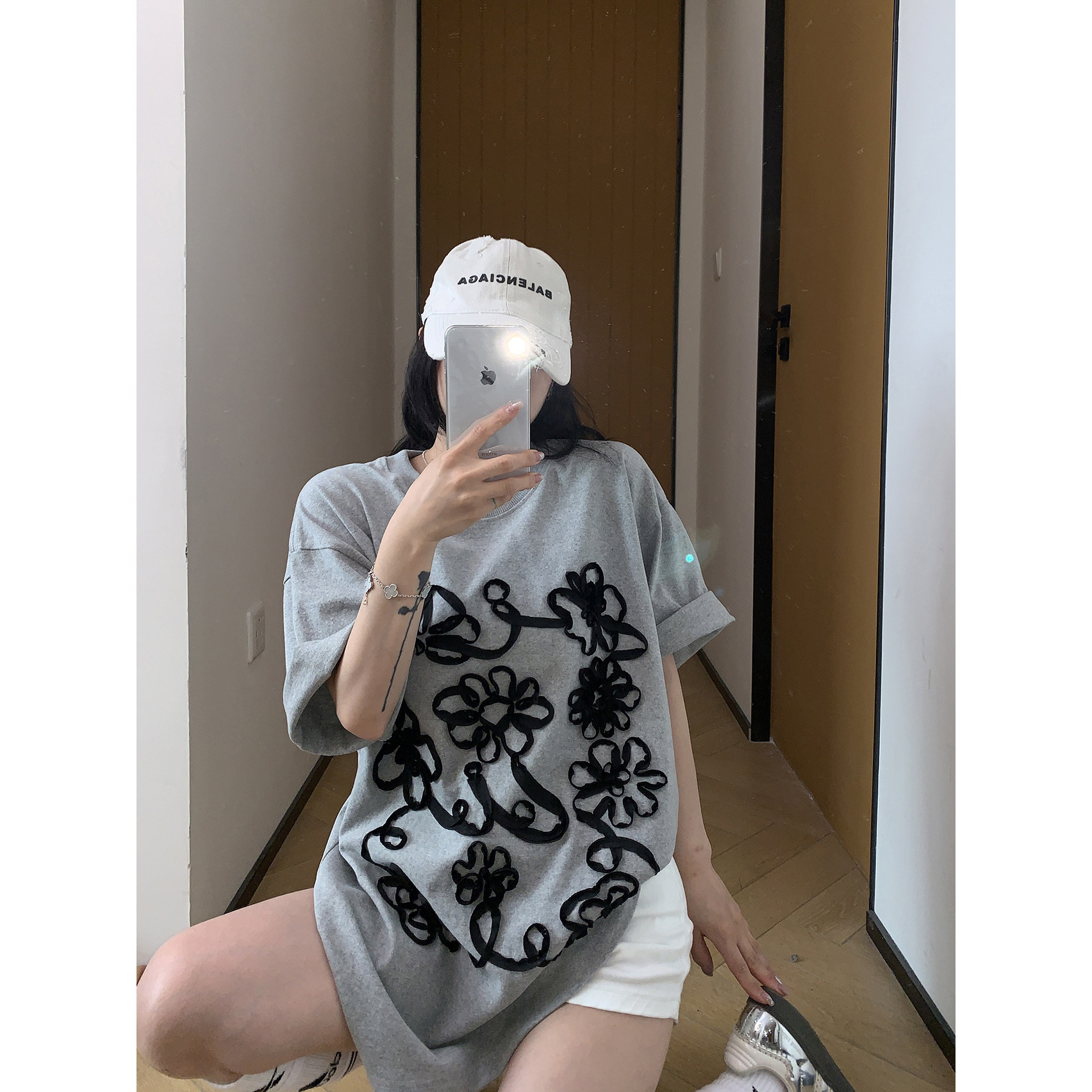 【トップス】夏 フラワーワッペン刺繍 コットン Tシャツ 【FCシリーズ】