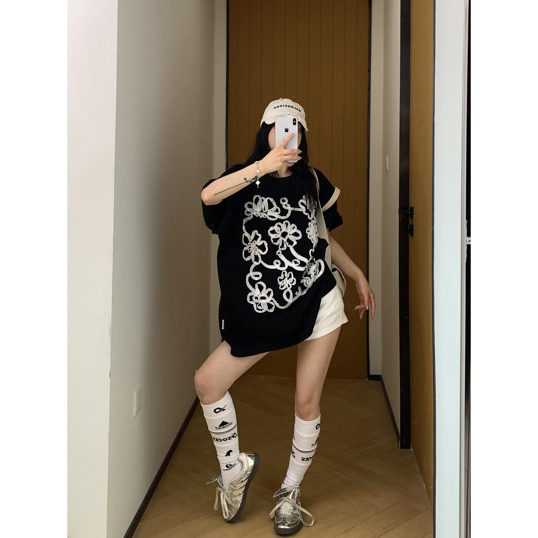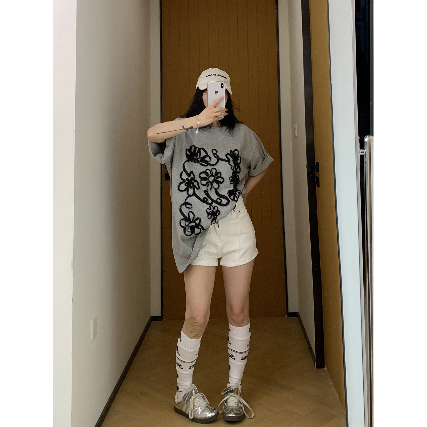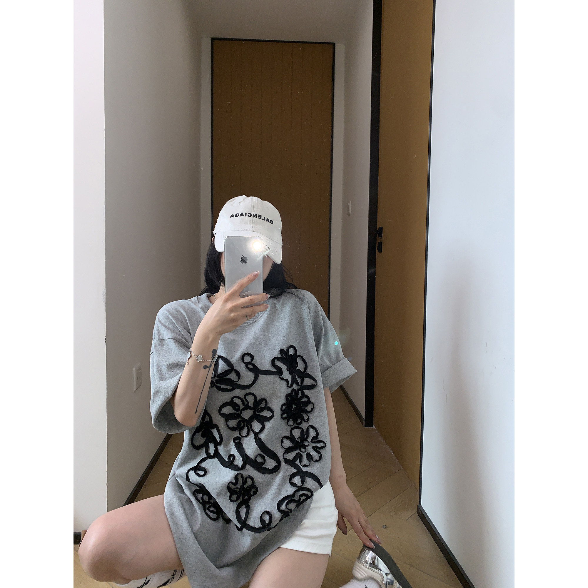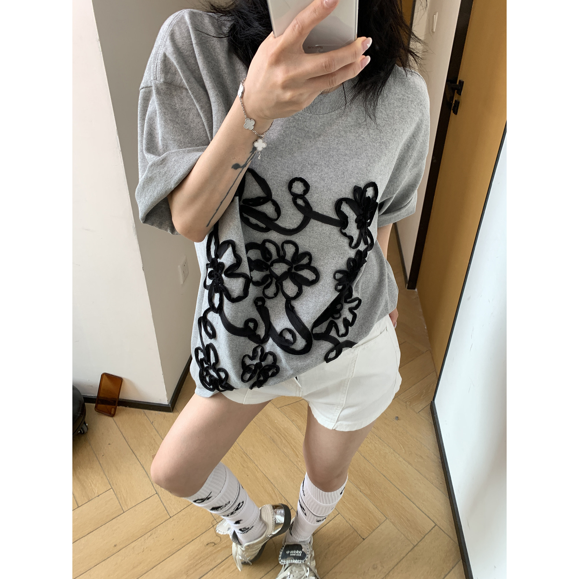 【トップス】夏 フラワーワッペン刺繍 コットン Tシャツ 【FCシリーズ】