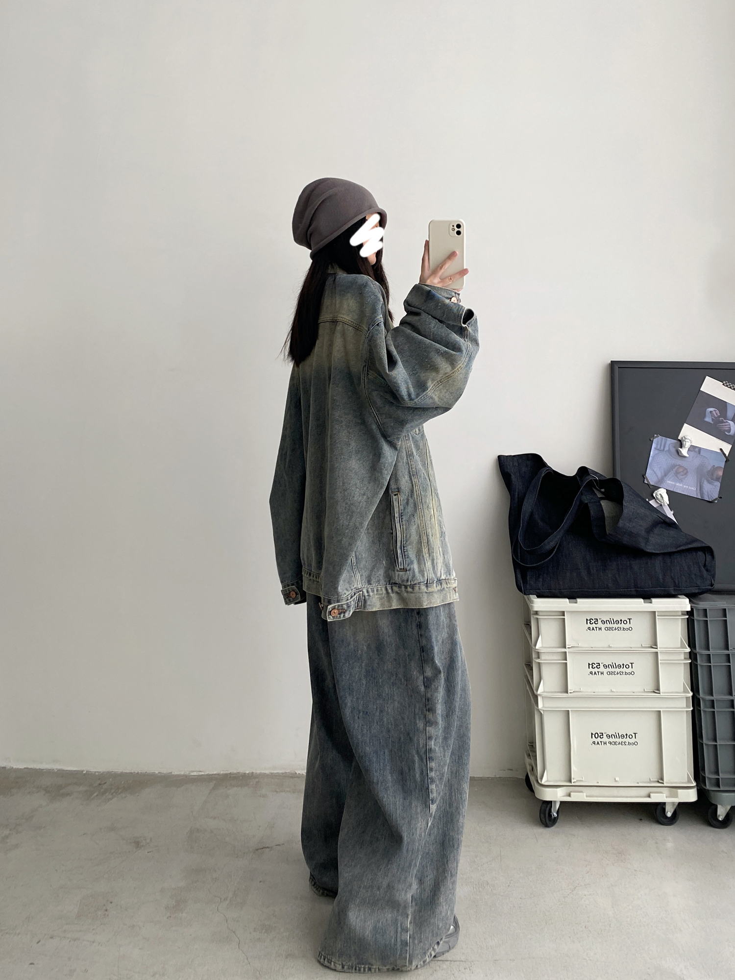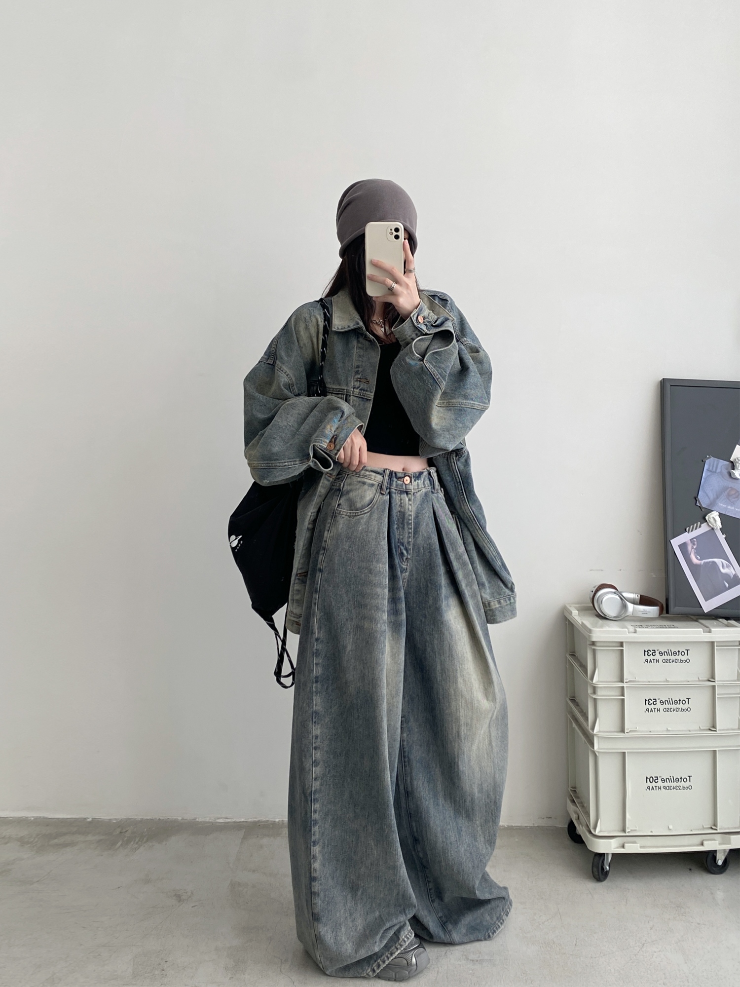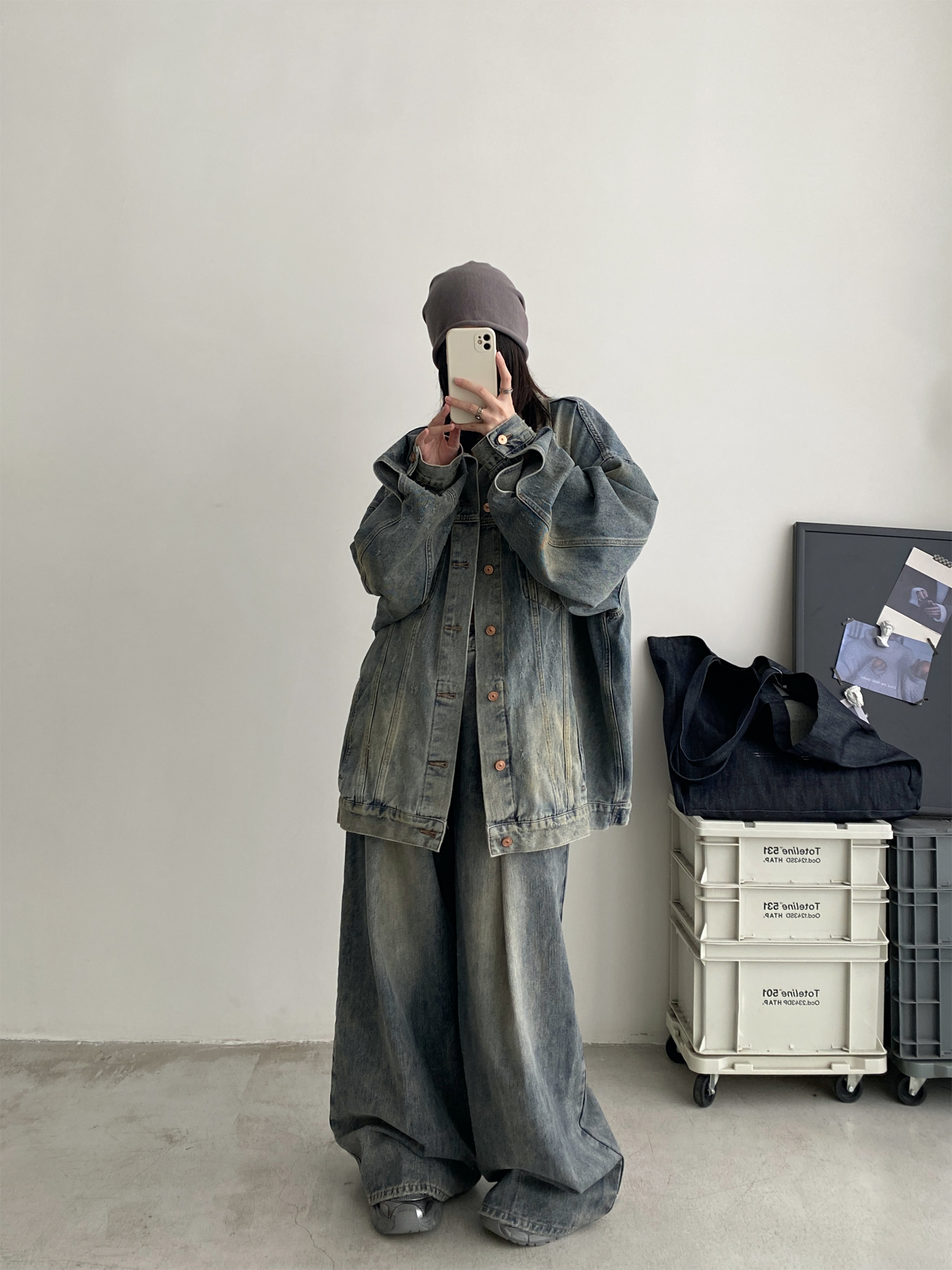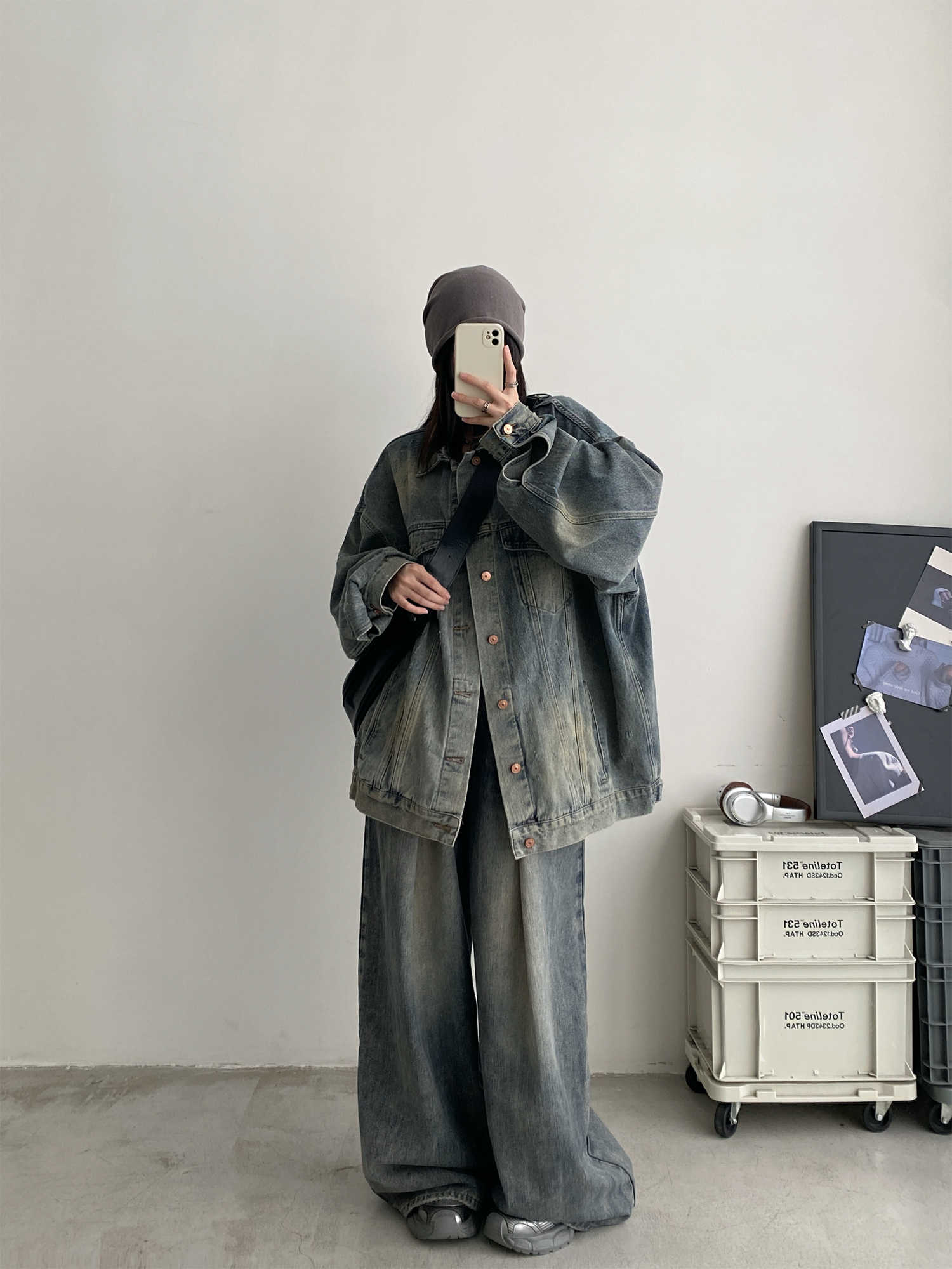 【商品名】【アウター】春 秋 夏 ヴィンテージ風 オーバーサイズ ジャケット+パンツ 2点上下セット【FCシリーズ】