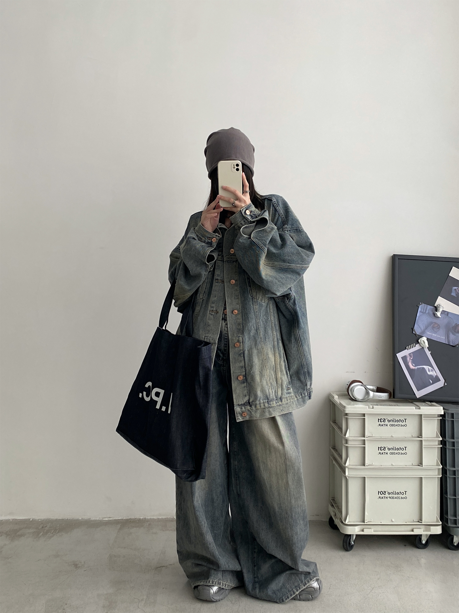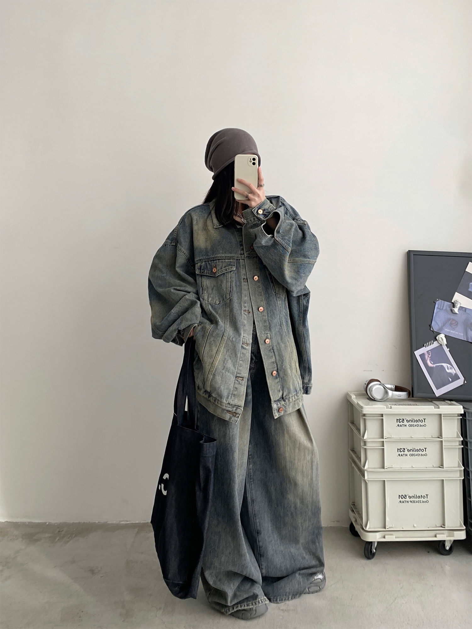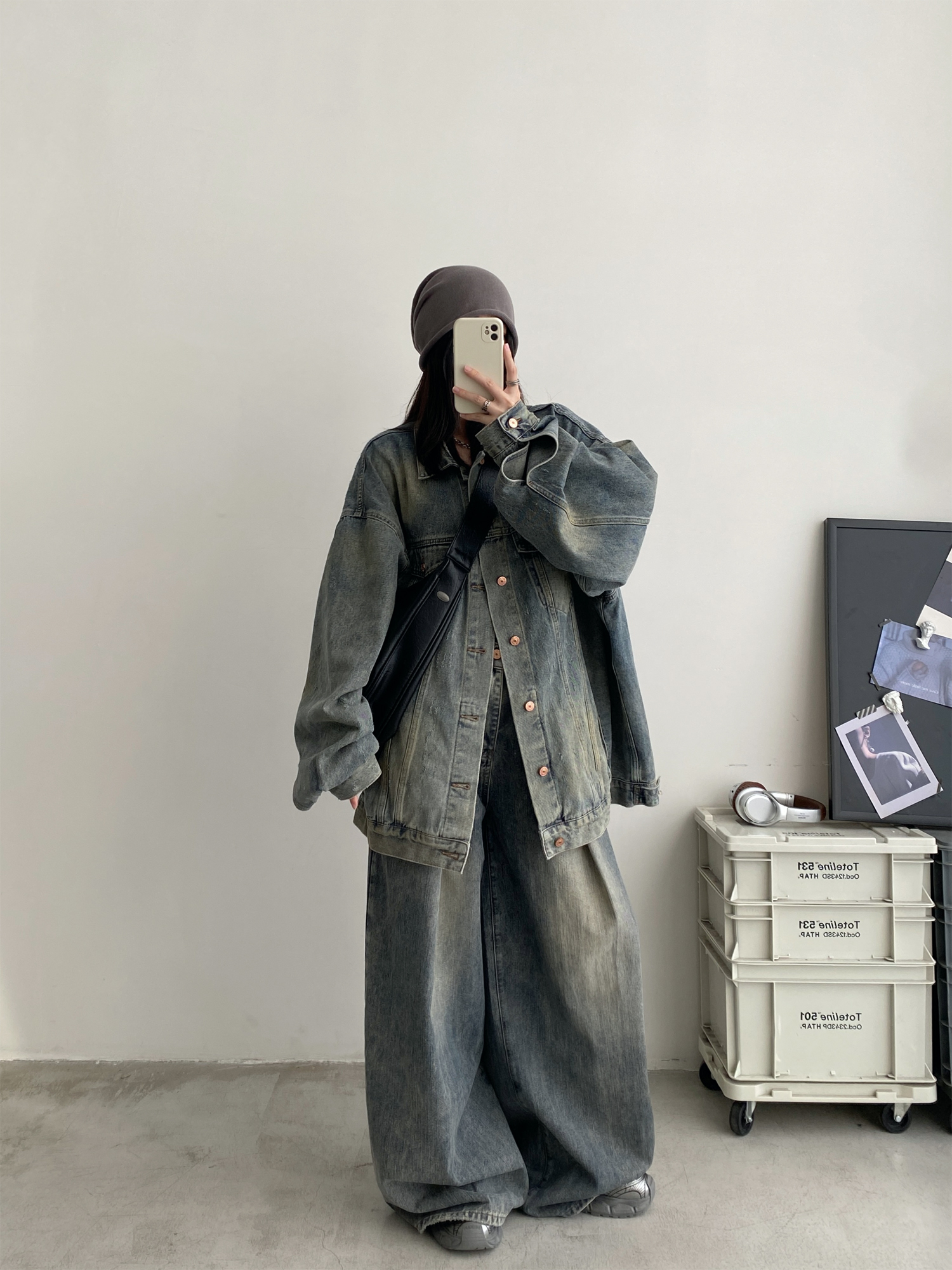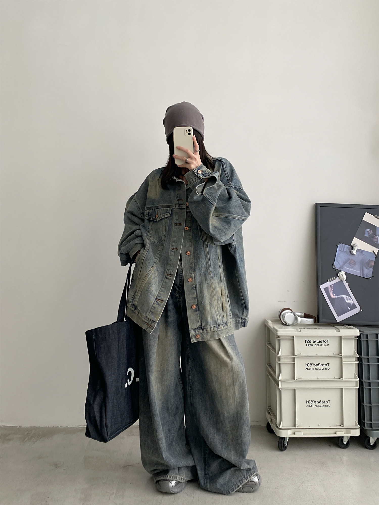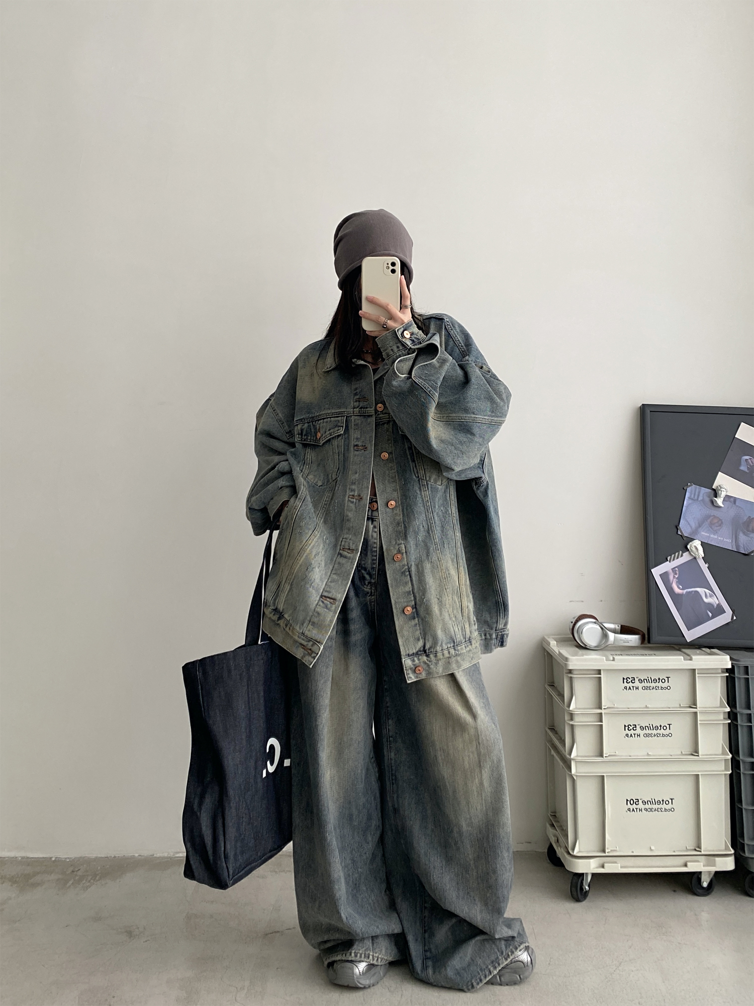 【商品名】【アウター】春 秋 夏 ヴィンテージ風 オーバーサイズ ジャケット+パンツ 2点上下セット【FCシリーズ】