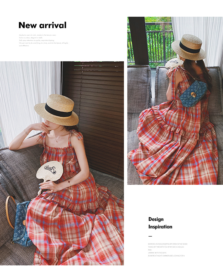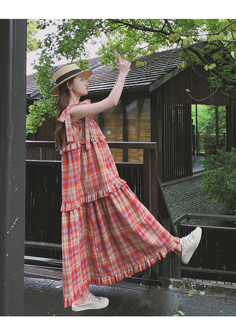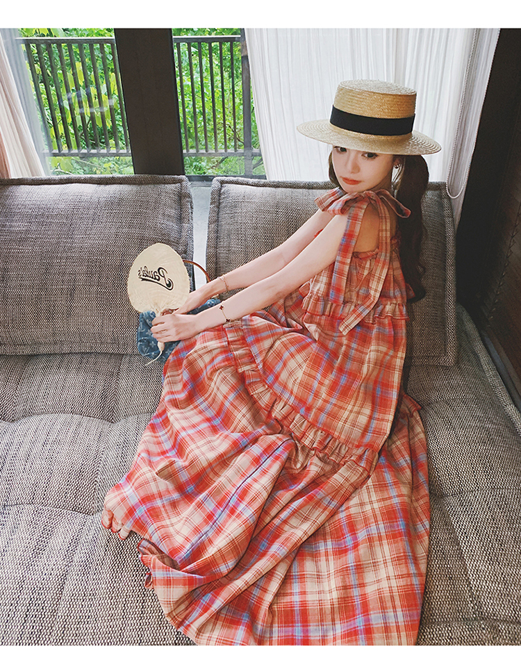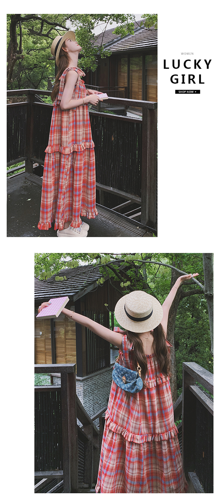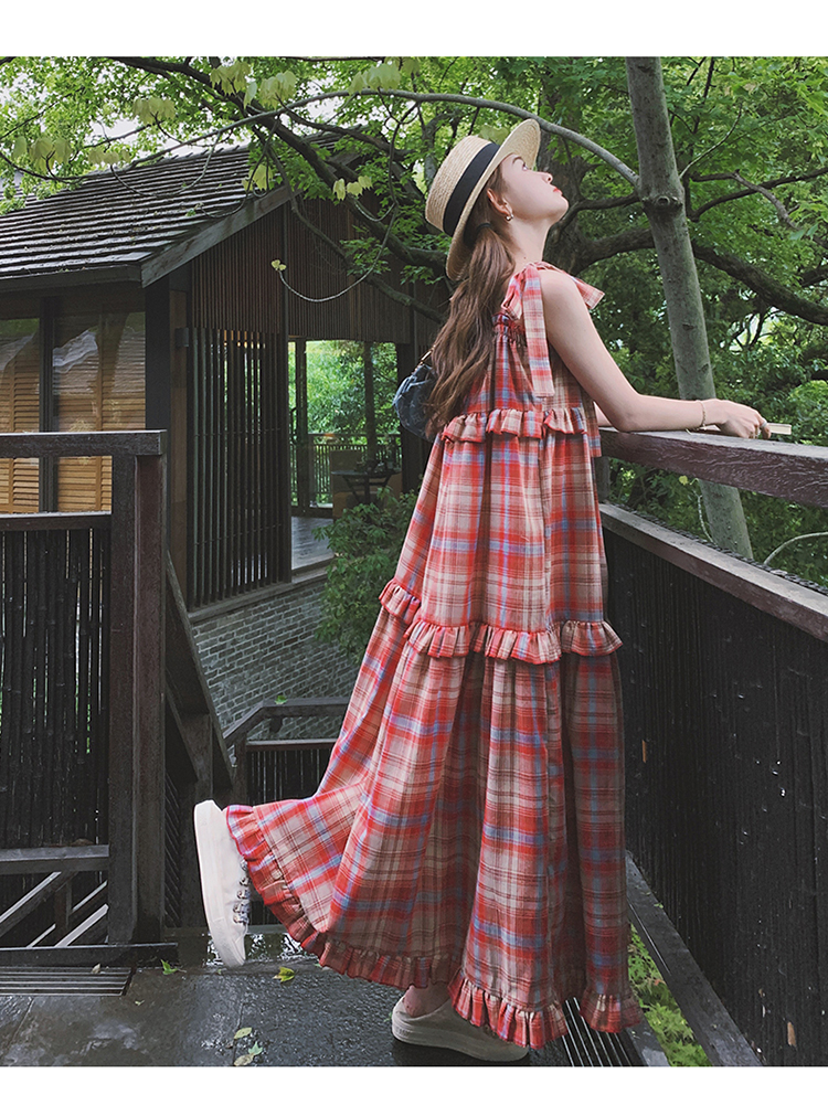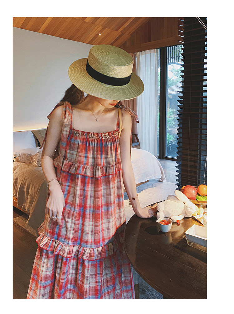 【ワンピース】海辺リゾート ゆったりシルエット 甘め優しげチェック柄ノースリーブワンピース【SHシリーズ】