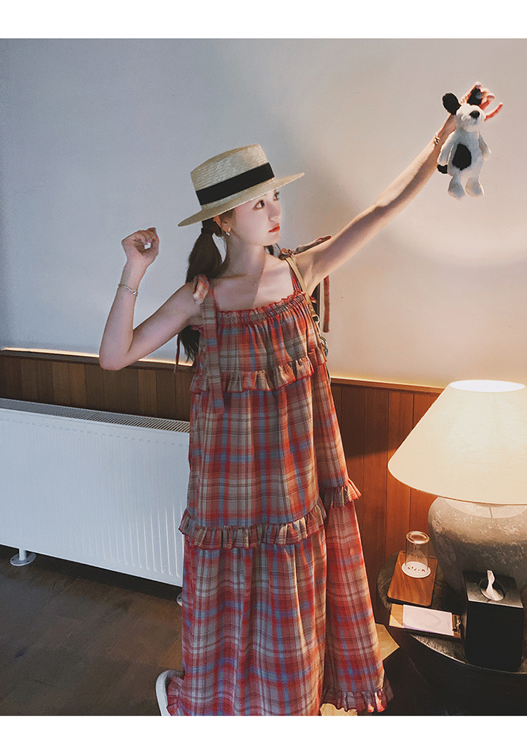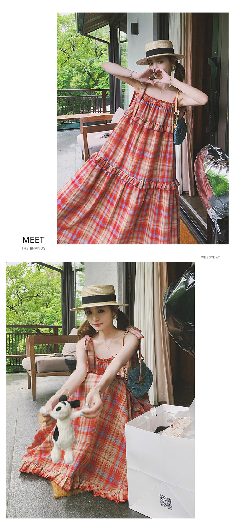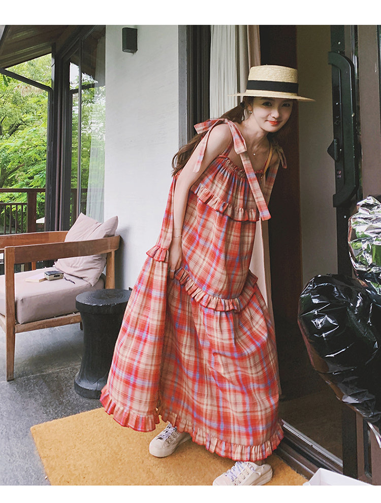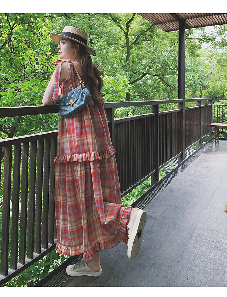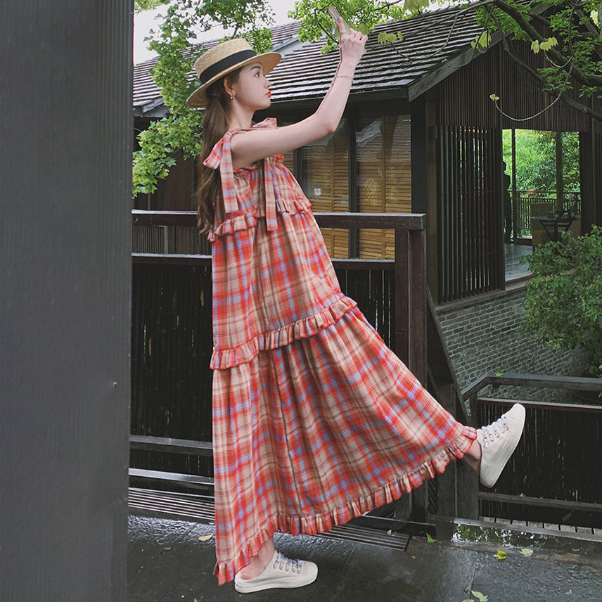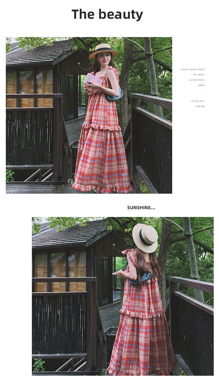 【ワンピース】海辺リゾート ゆったりシルエット 甘め優しげチェック柄ノースリーブワンピース【SHシリーズ】