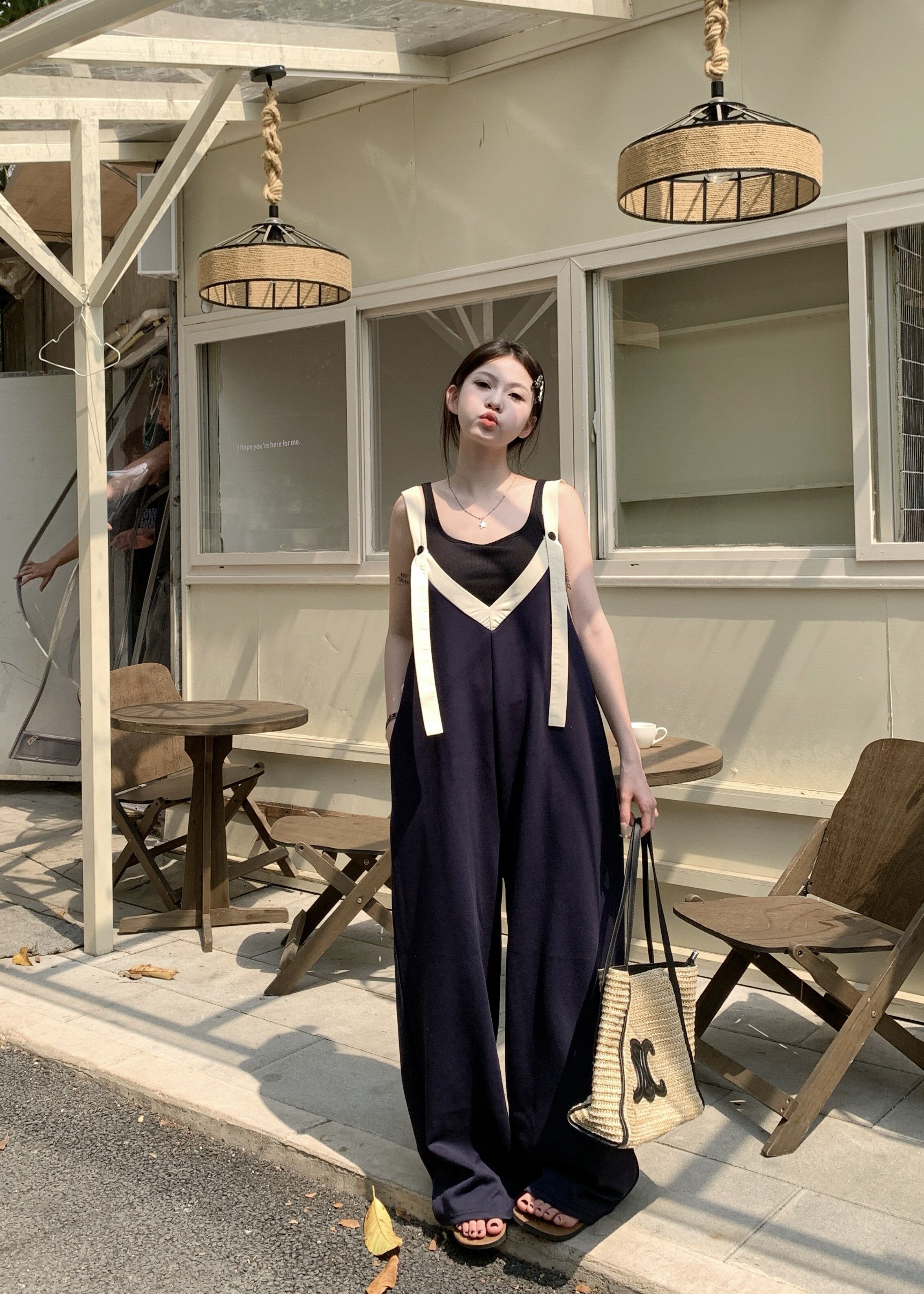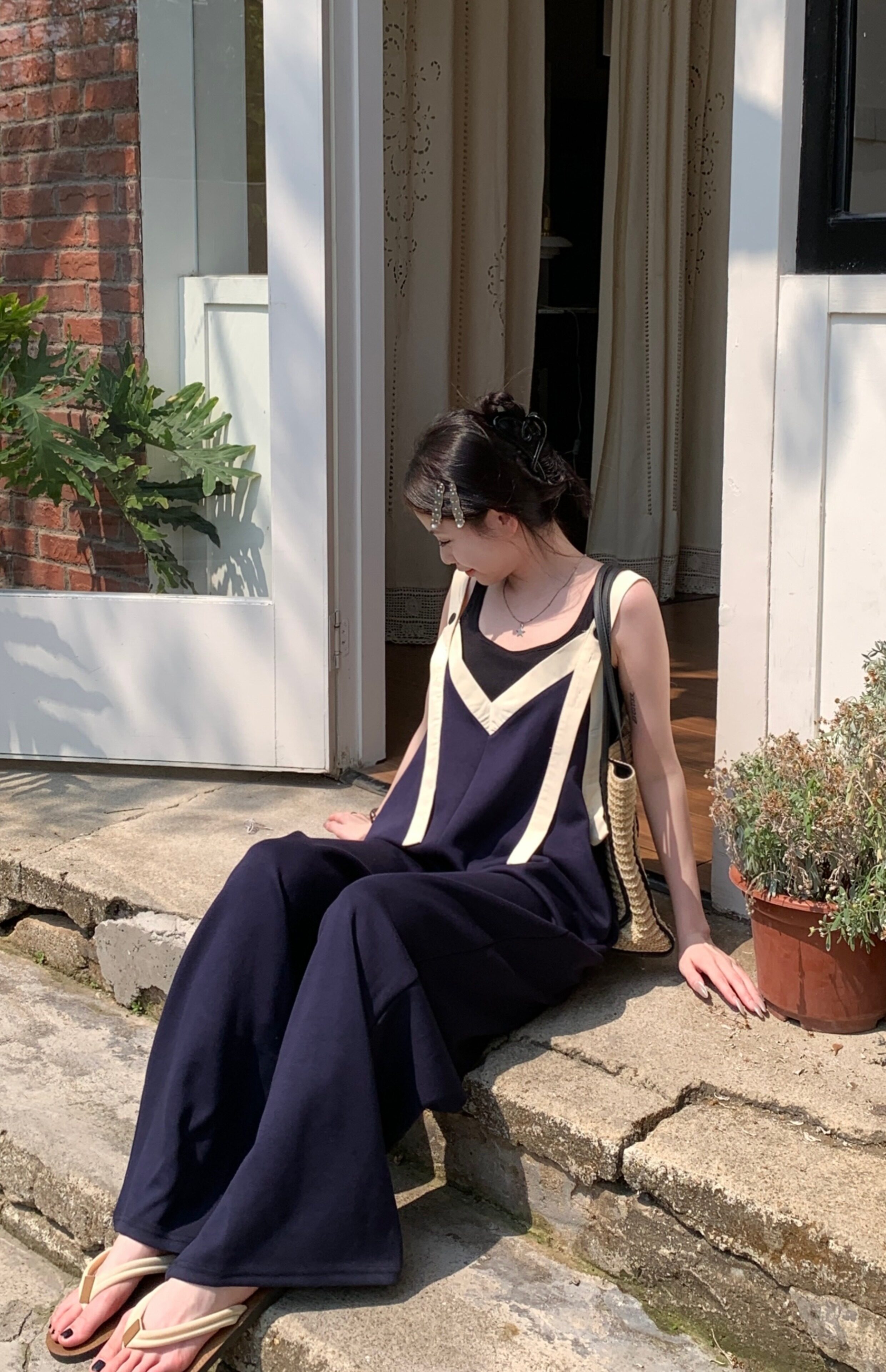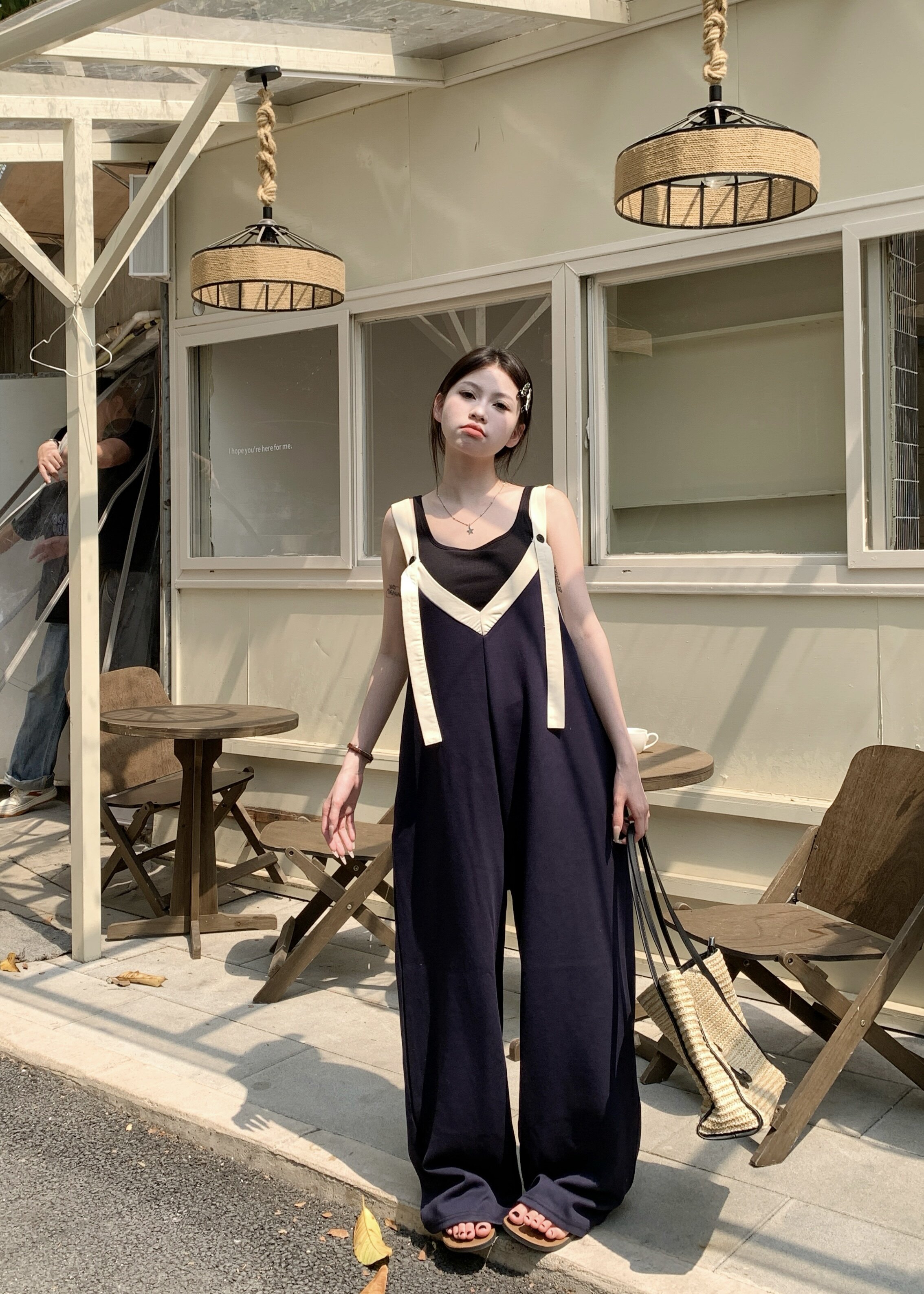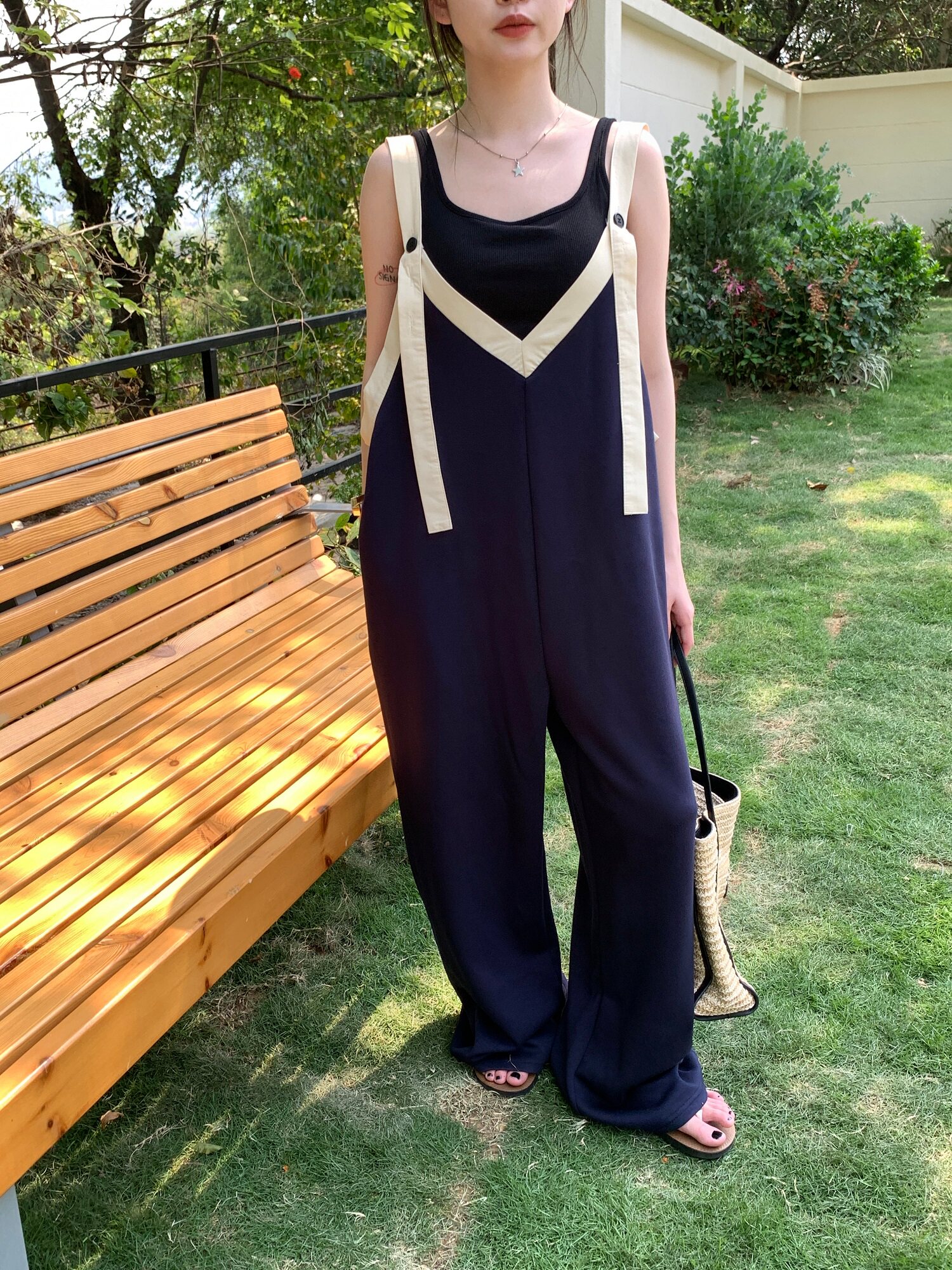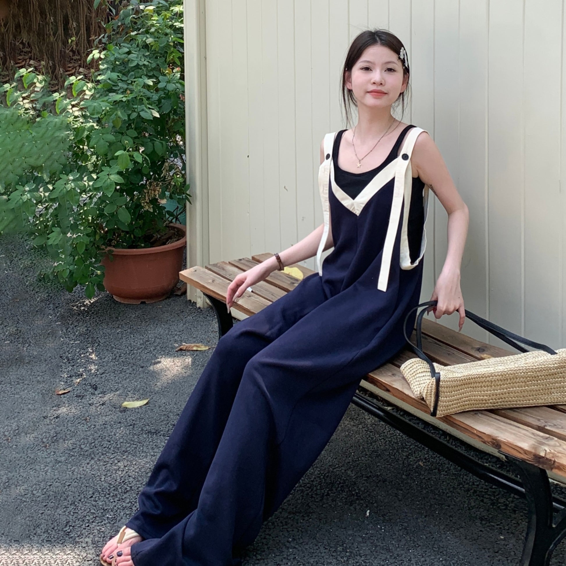 【ボトムス】ヴィンテージ配色Vネック ゆる系夏用カジュアルオールインワン