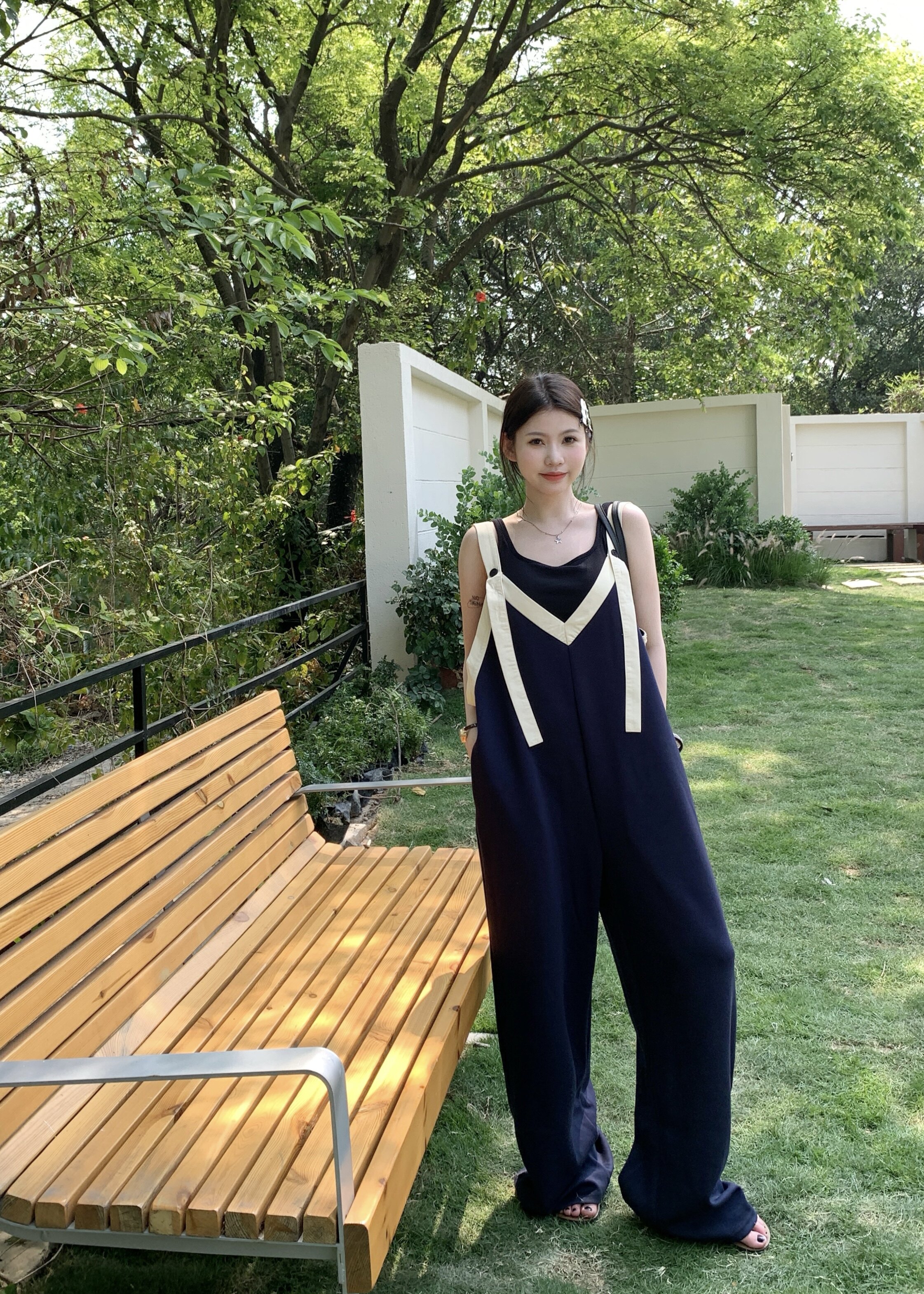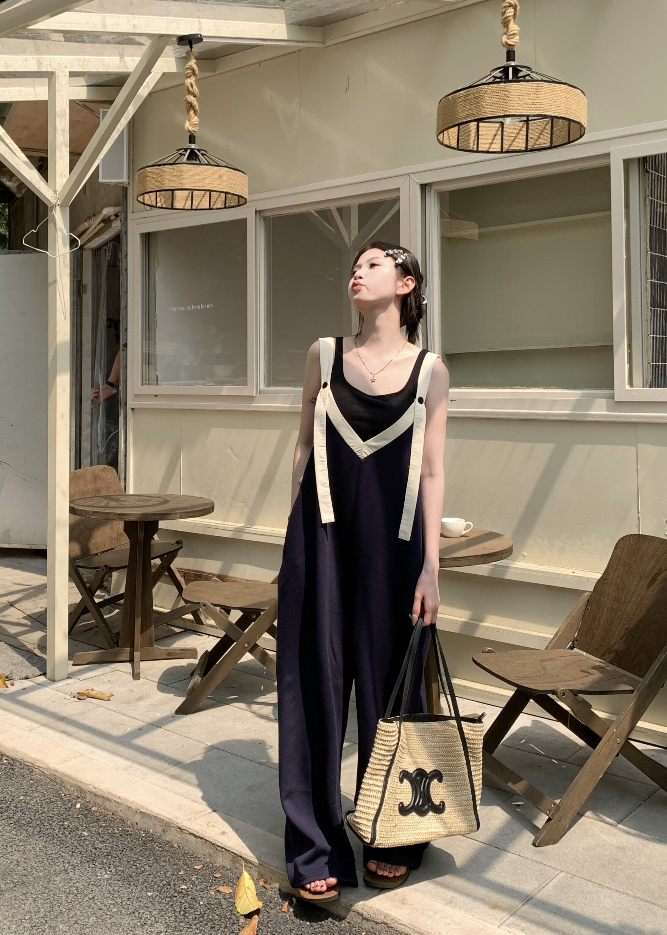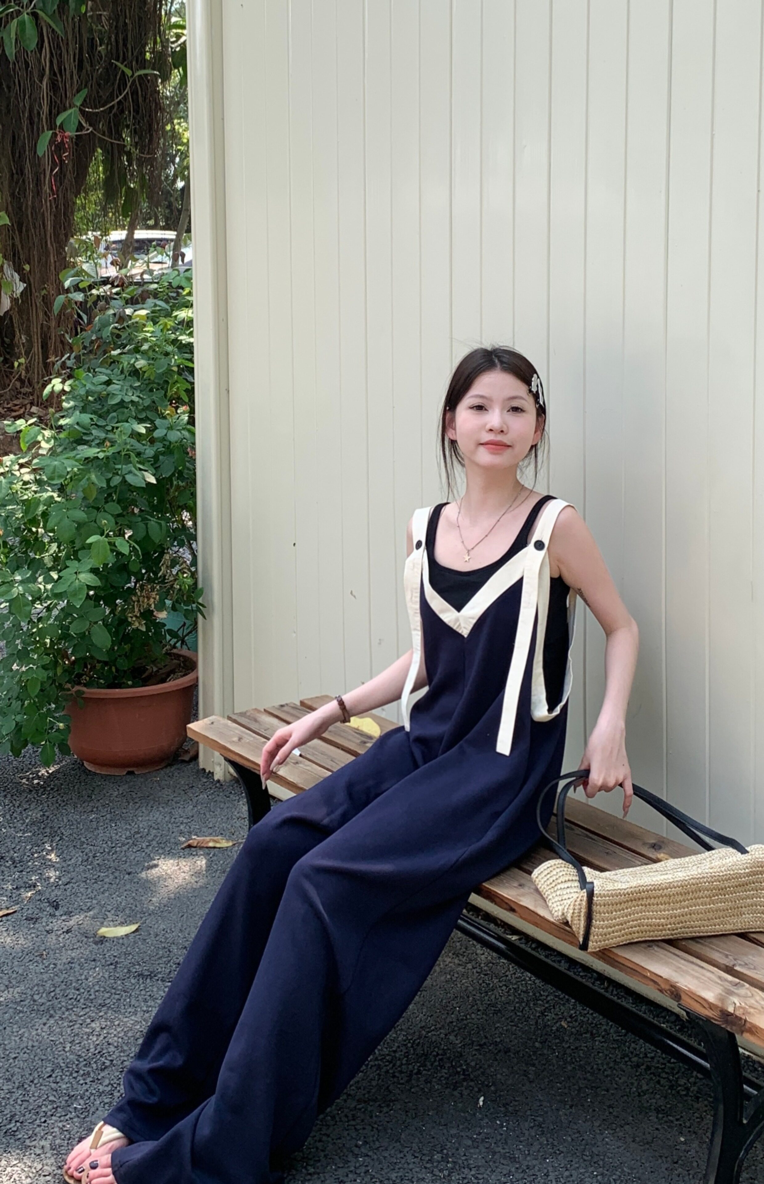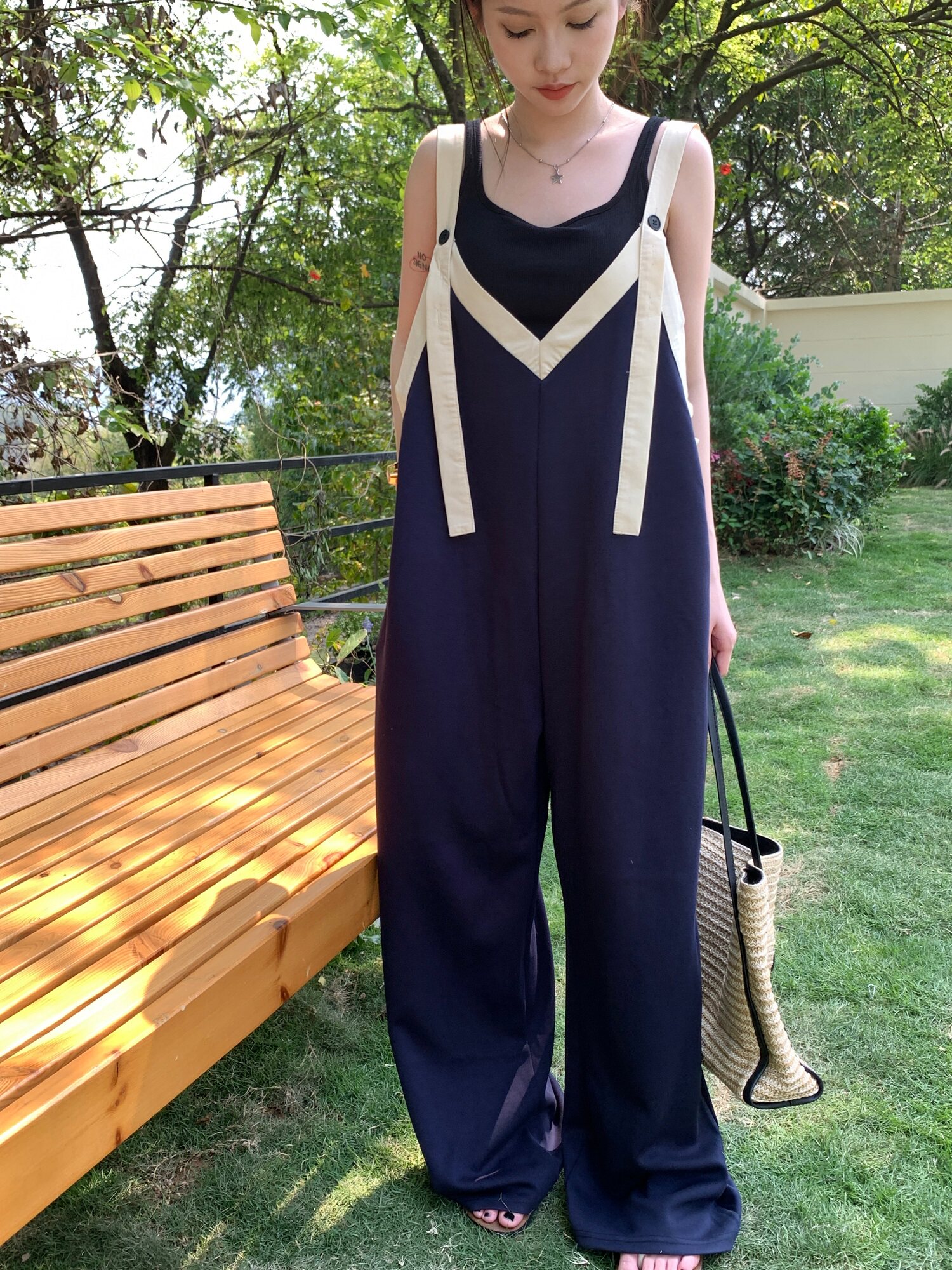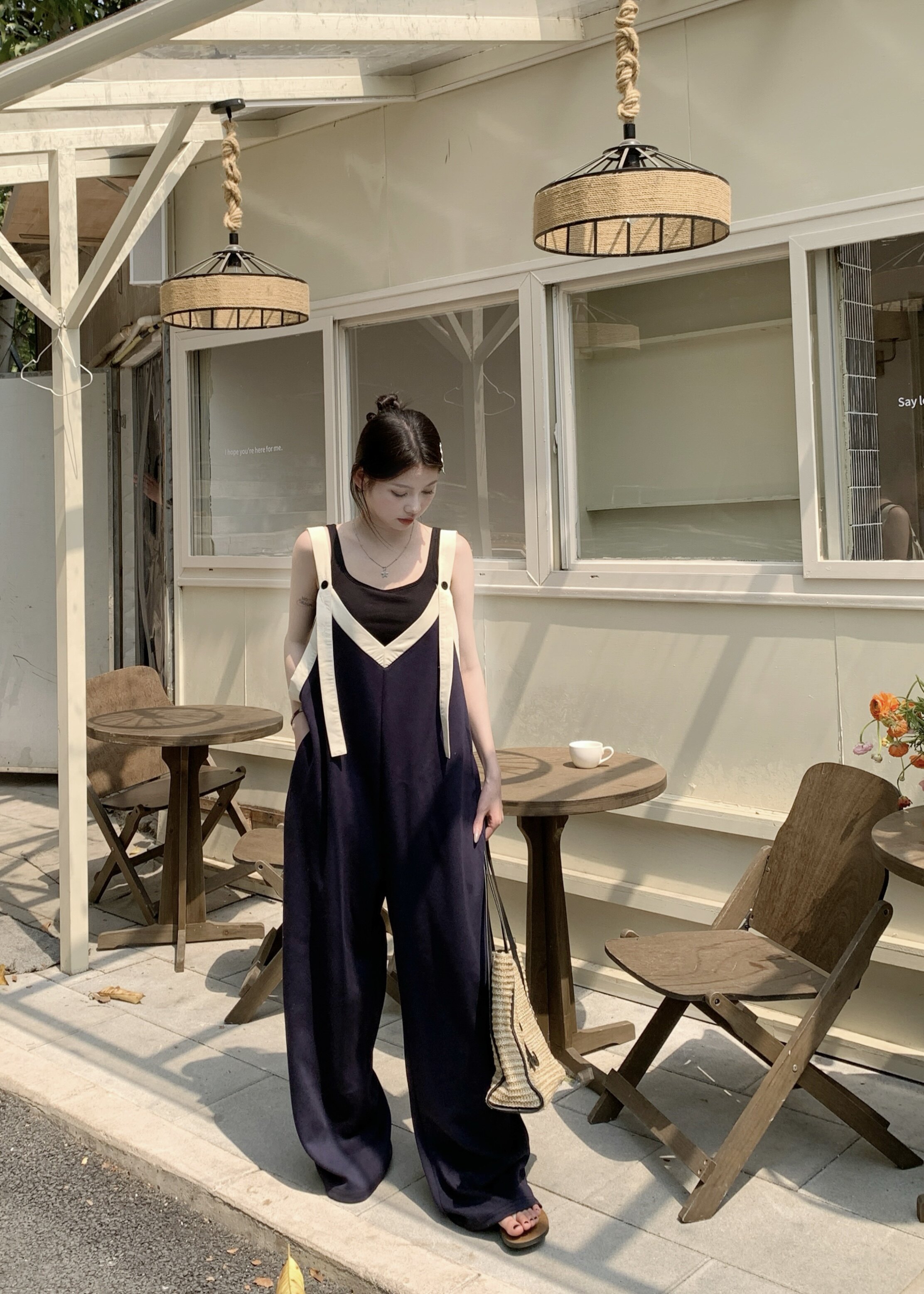 【ボトムス】ヴィンテージ配色Vネック ゆる系夏用カジュアルオールインワン