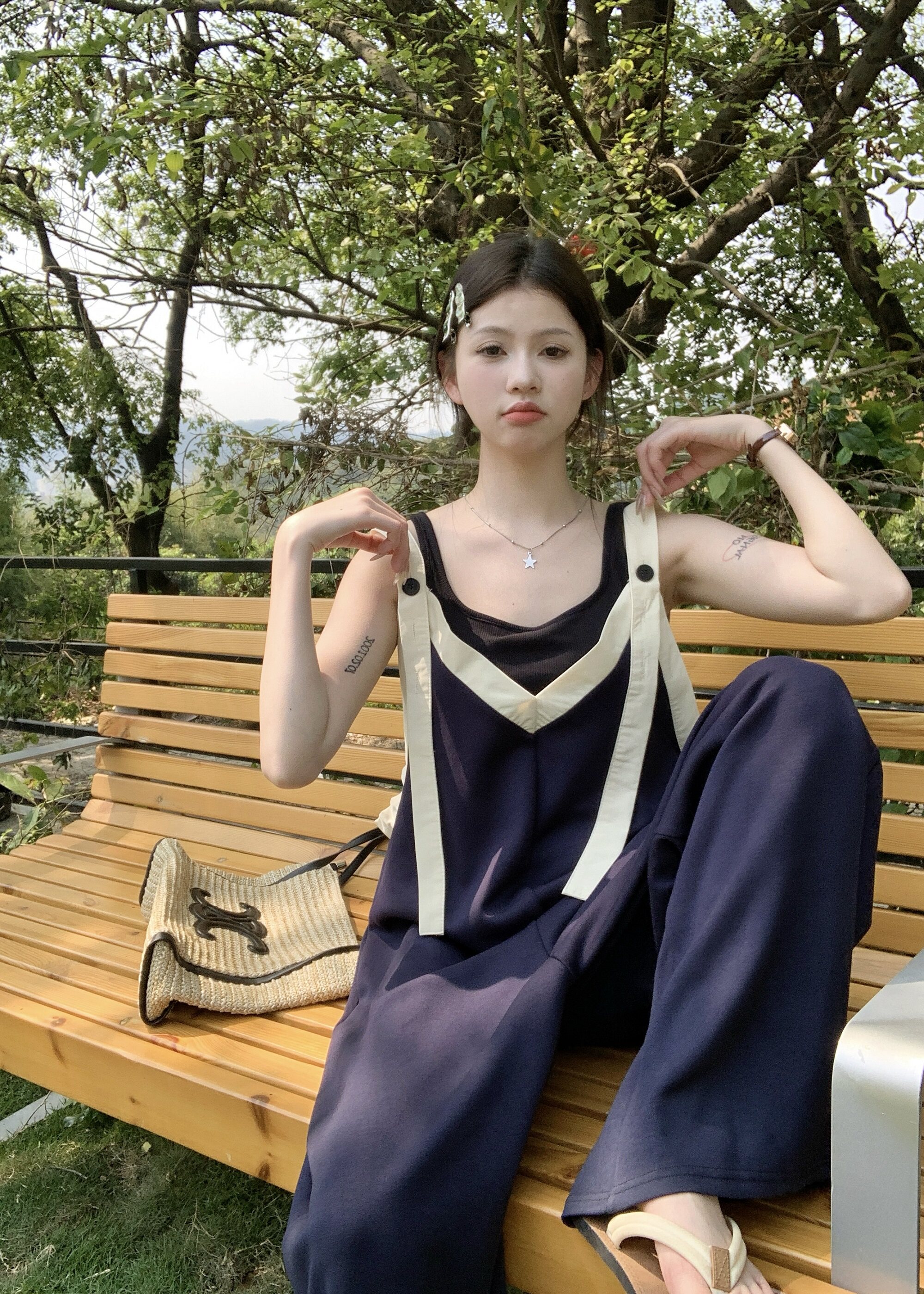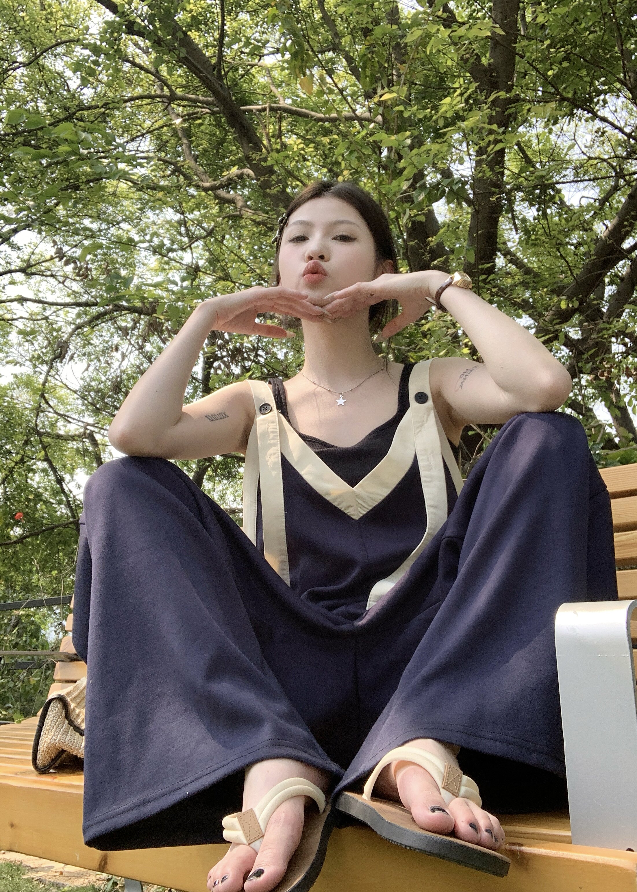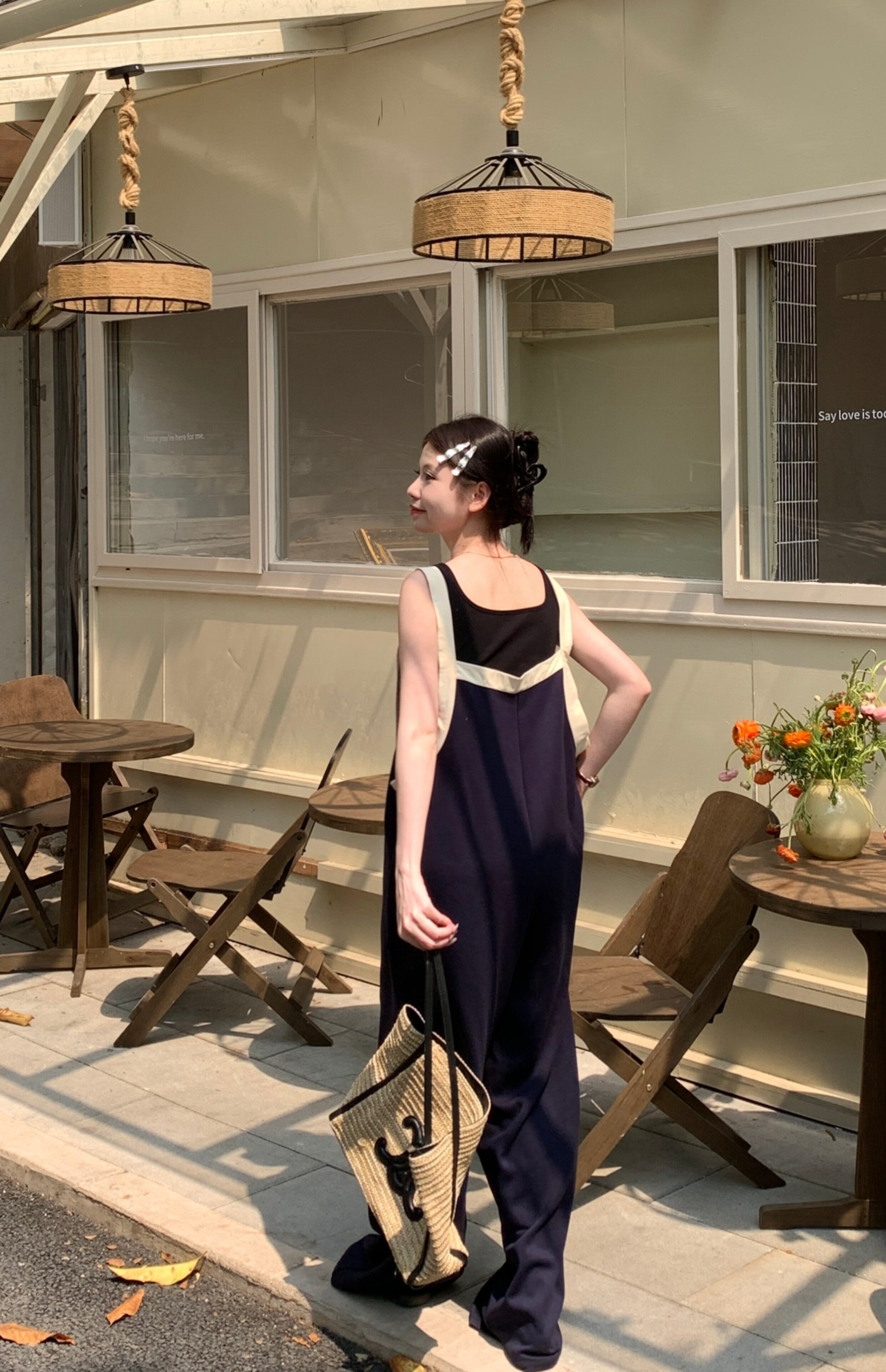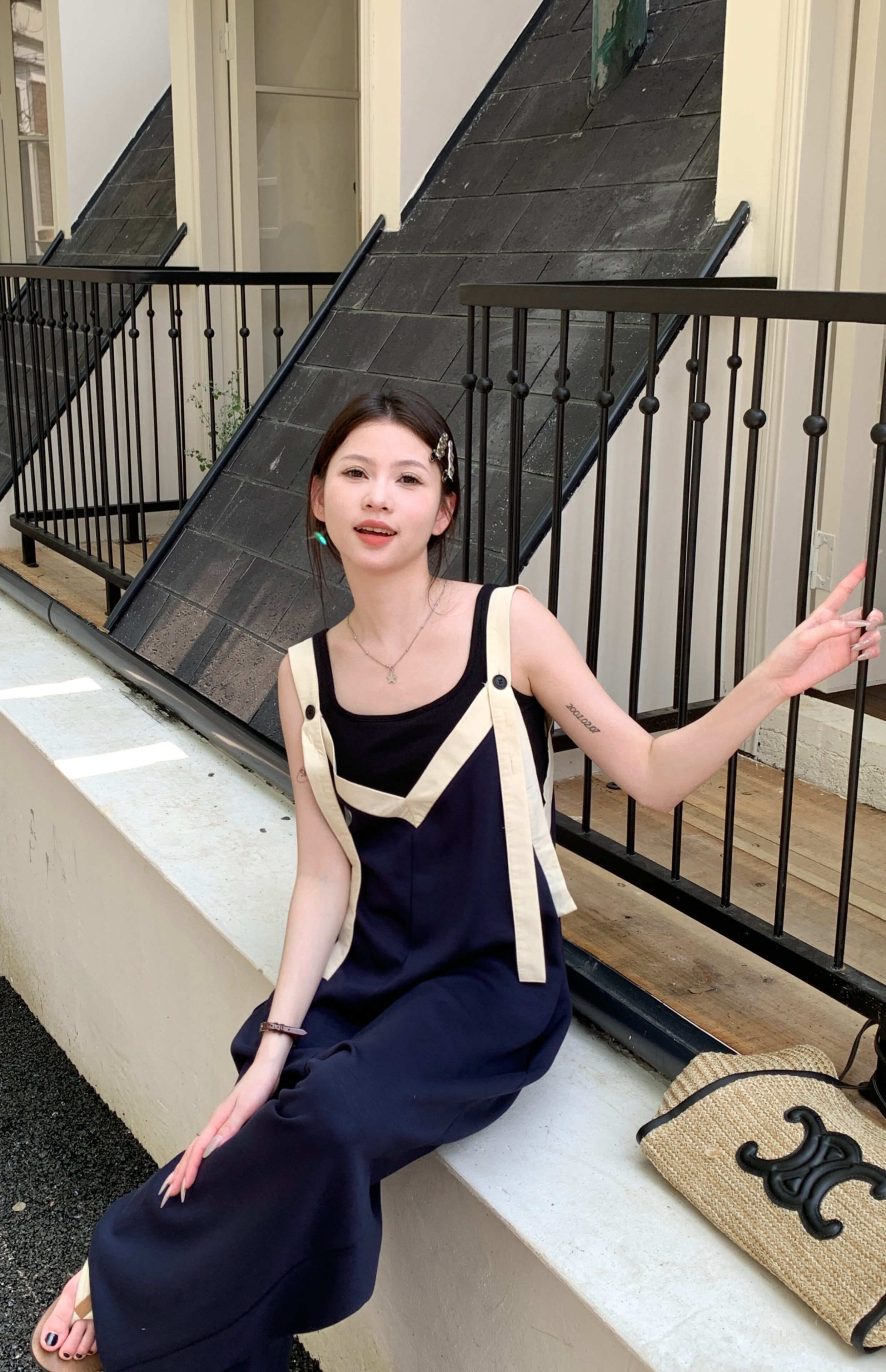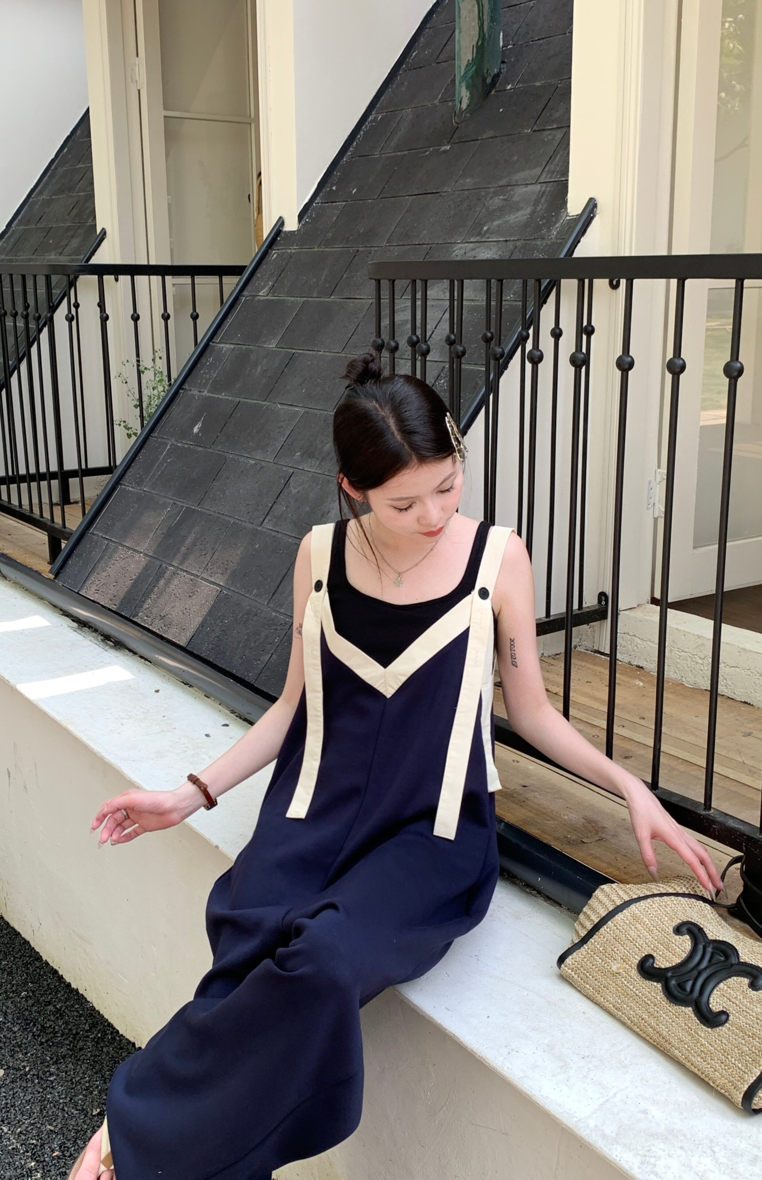 【ボトムス】ヴィンテージ配色Vネック ゆる系夏用カジュアルオールインワン