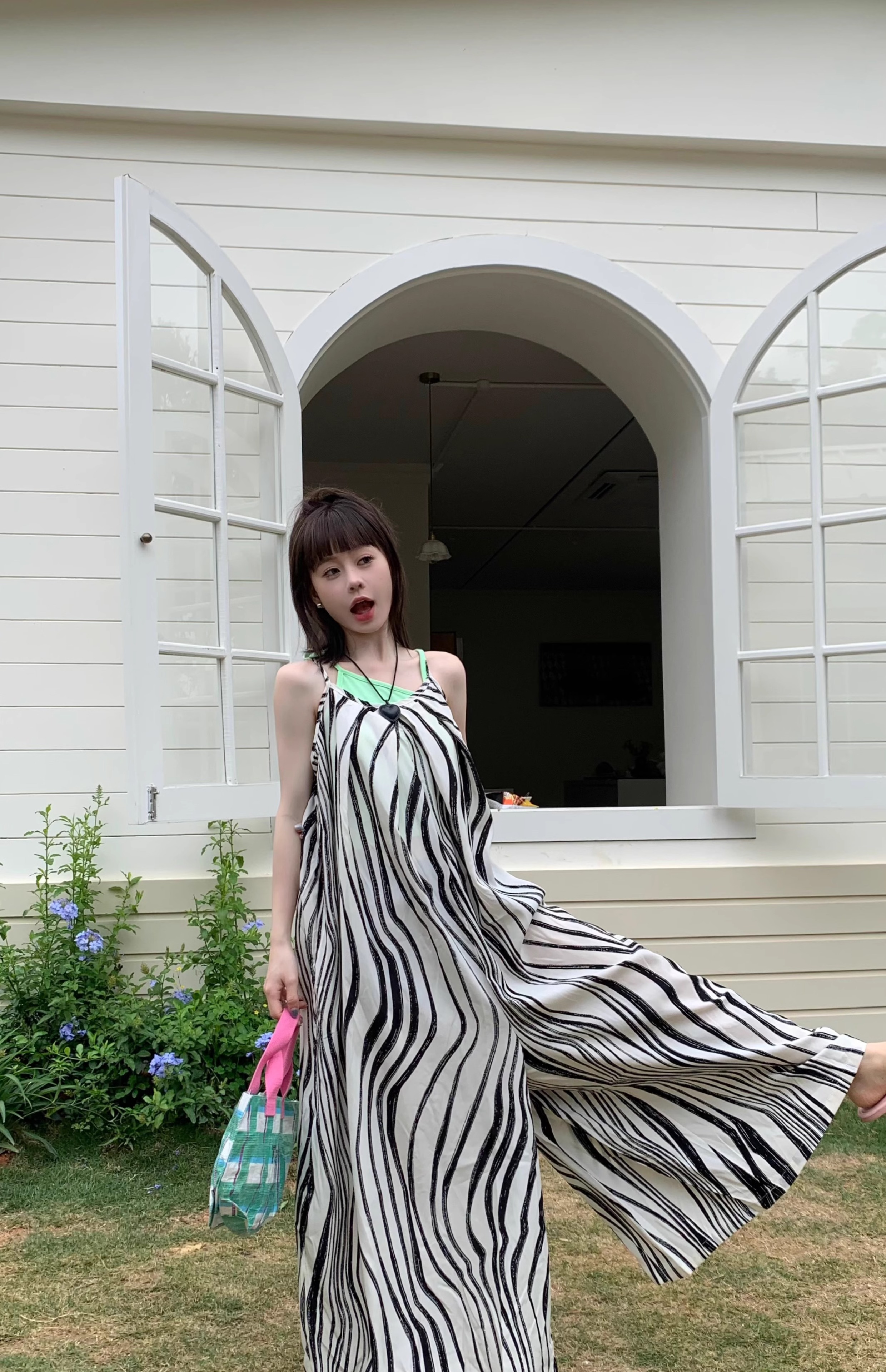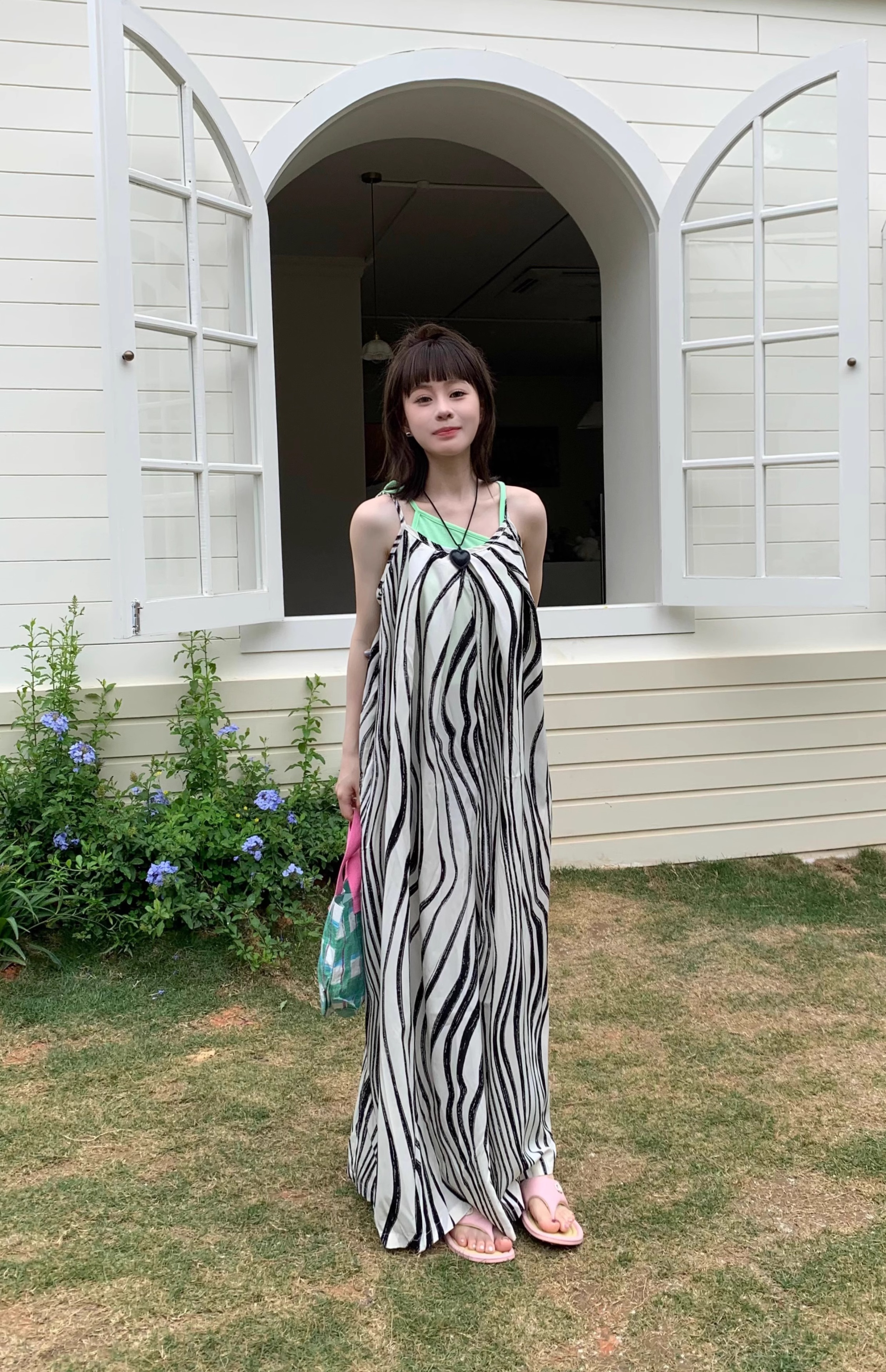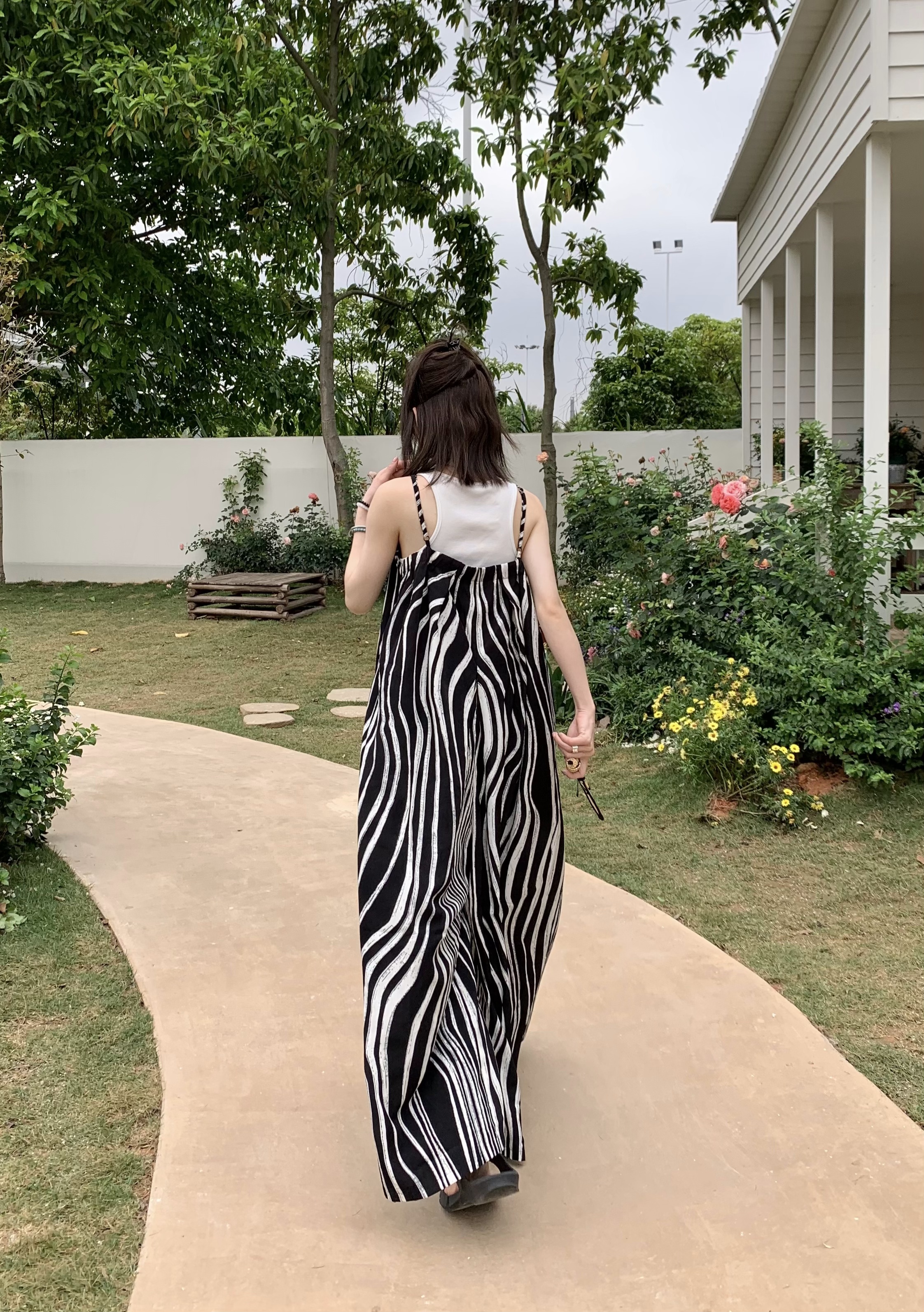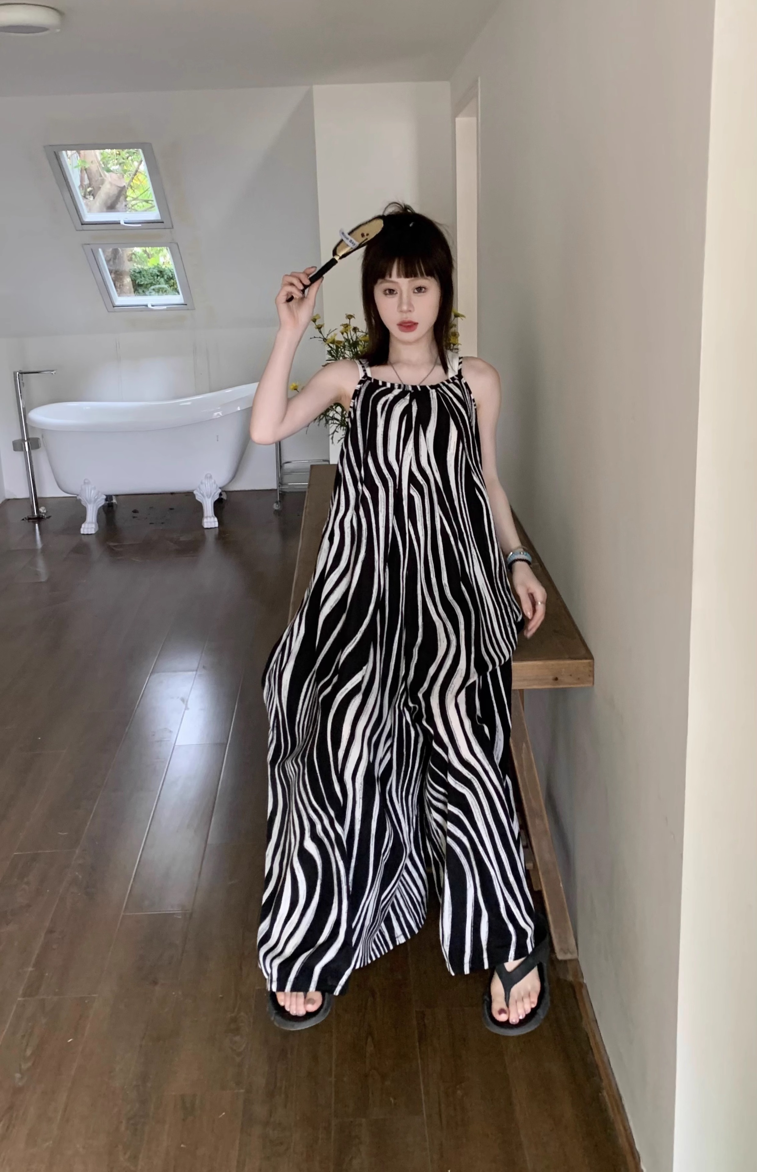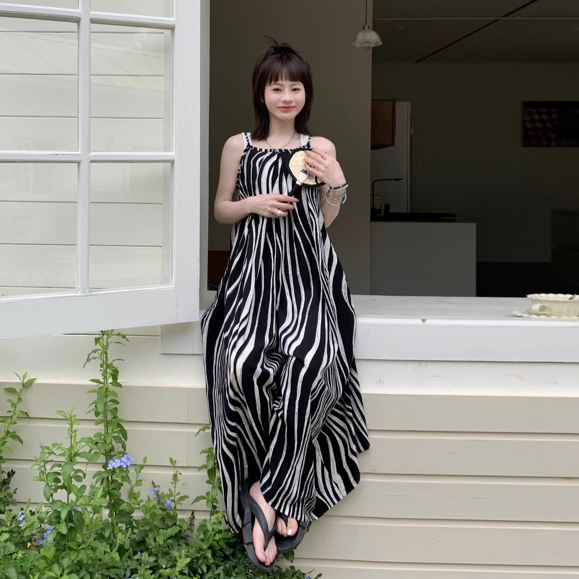 【ボトムス】ゆったりカジュアル 夏用 水波模様 ルーズ感たっぷり オーバーサイズキャミサロペット 【SHシリーズ】