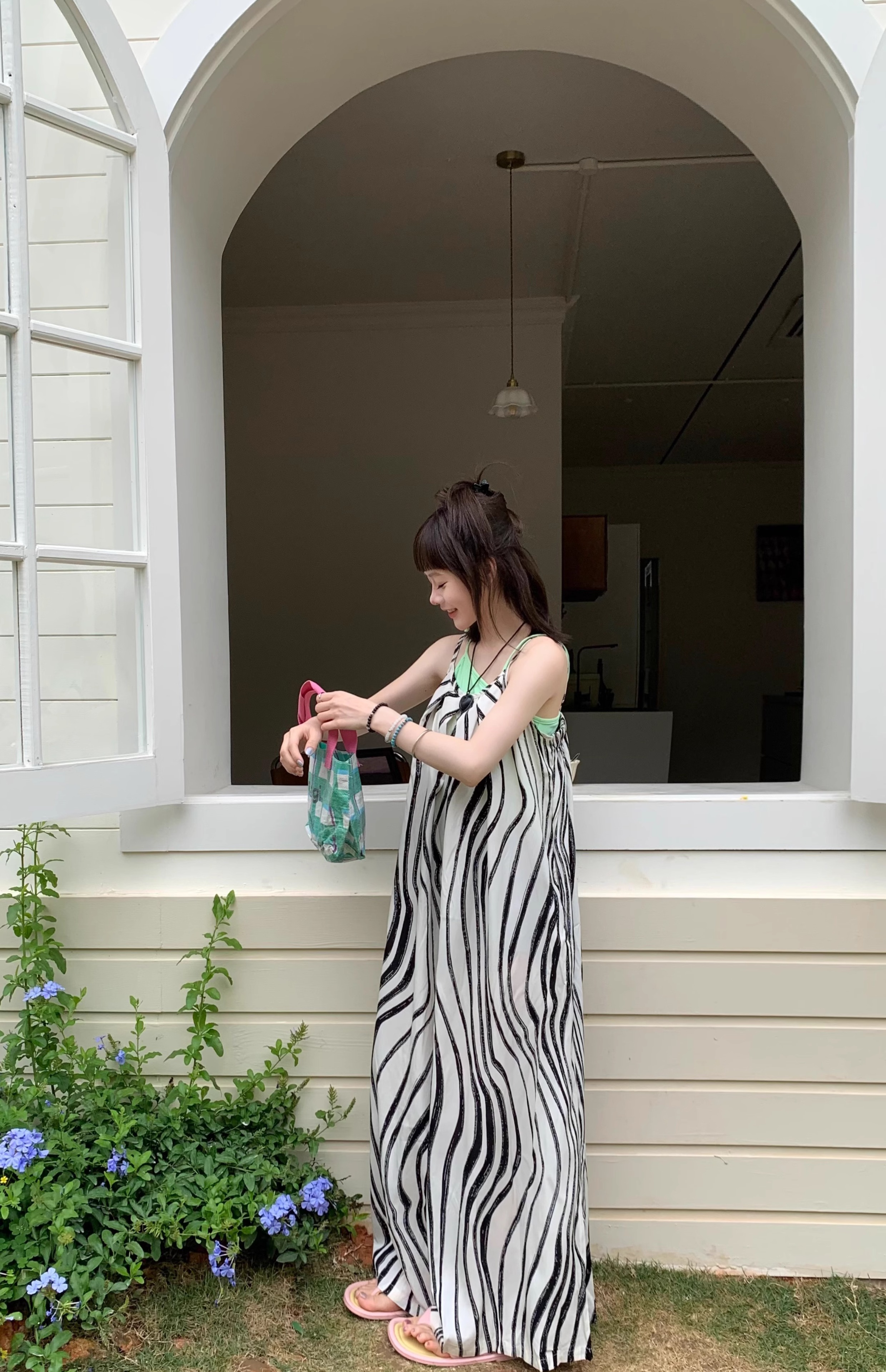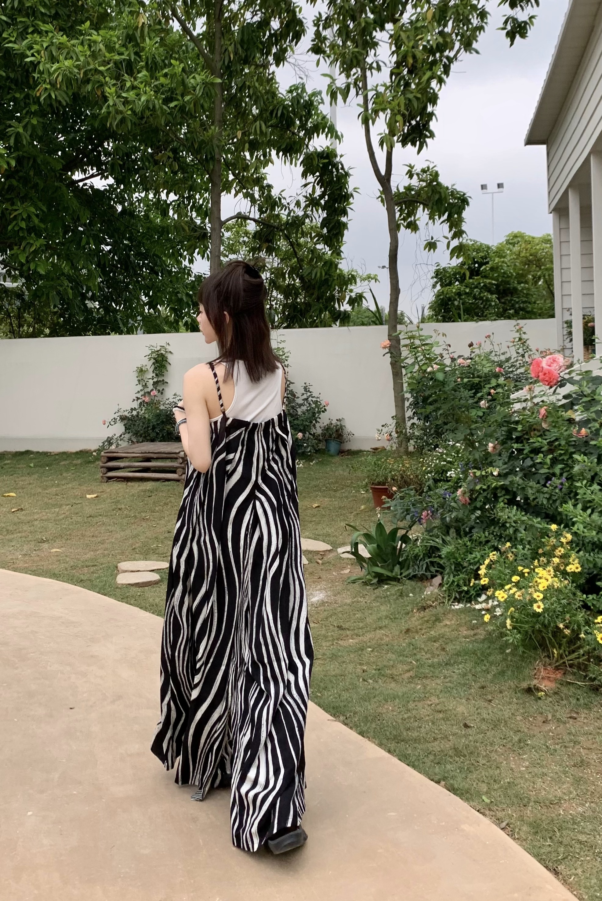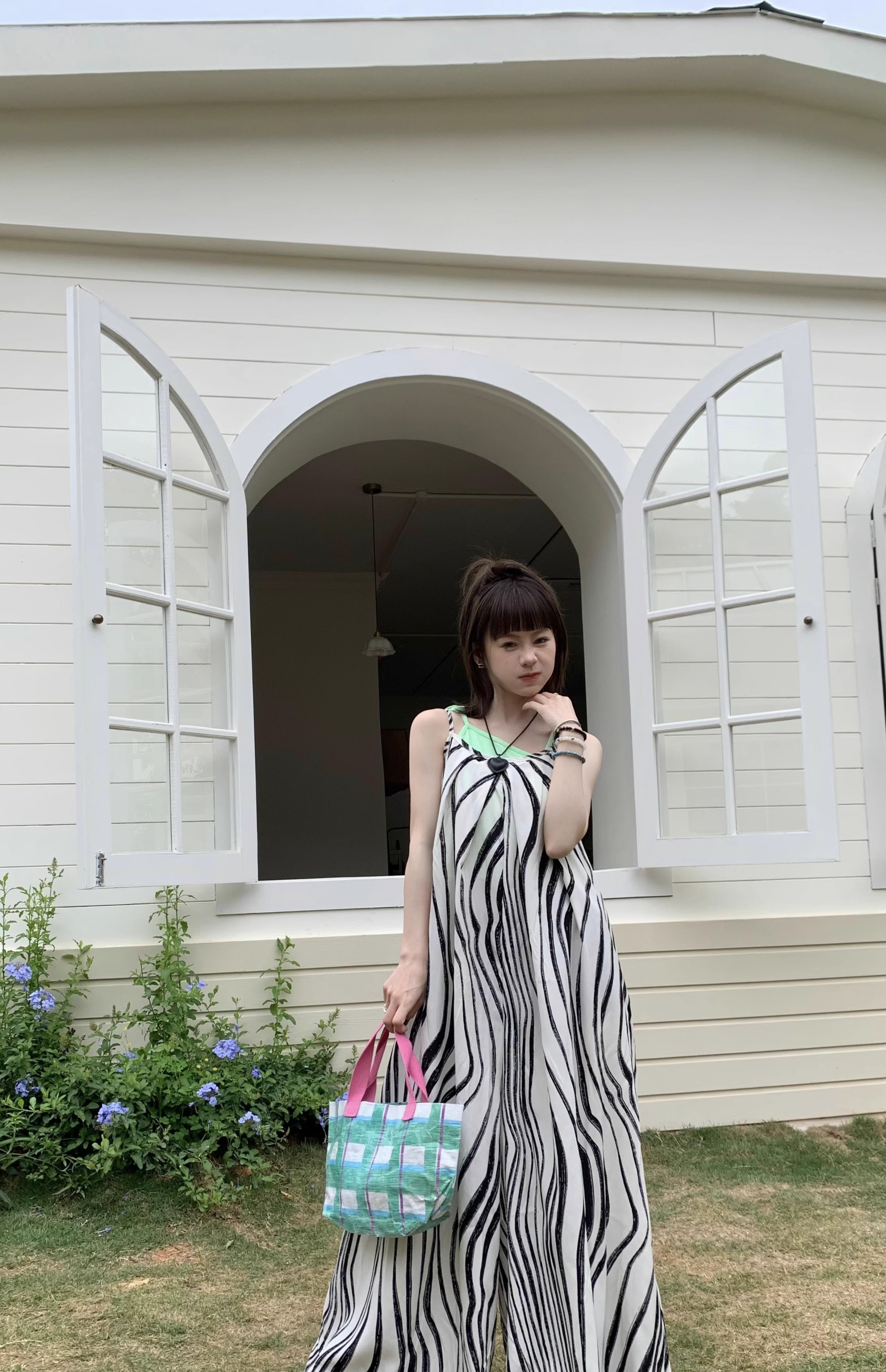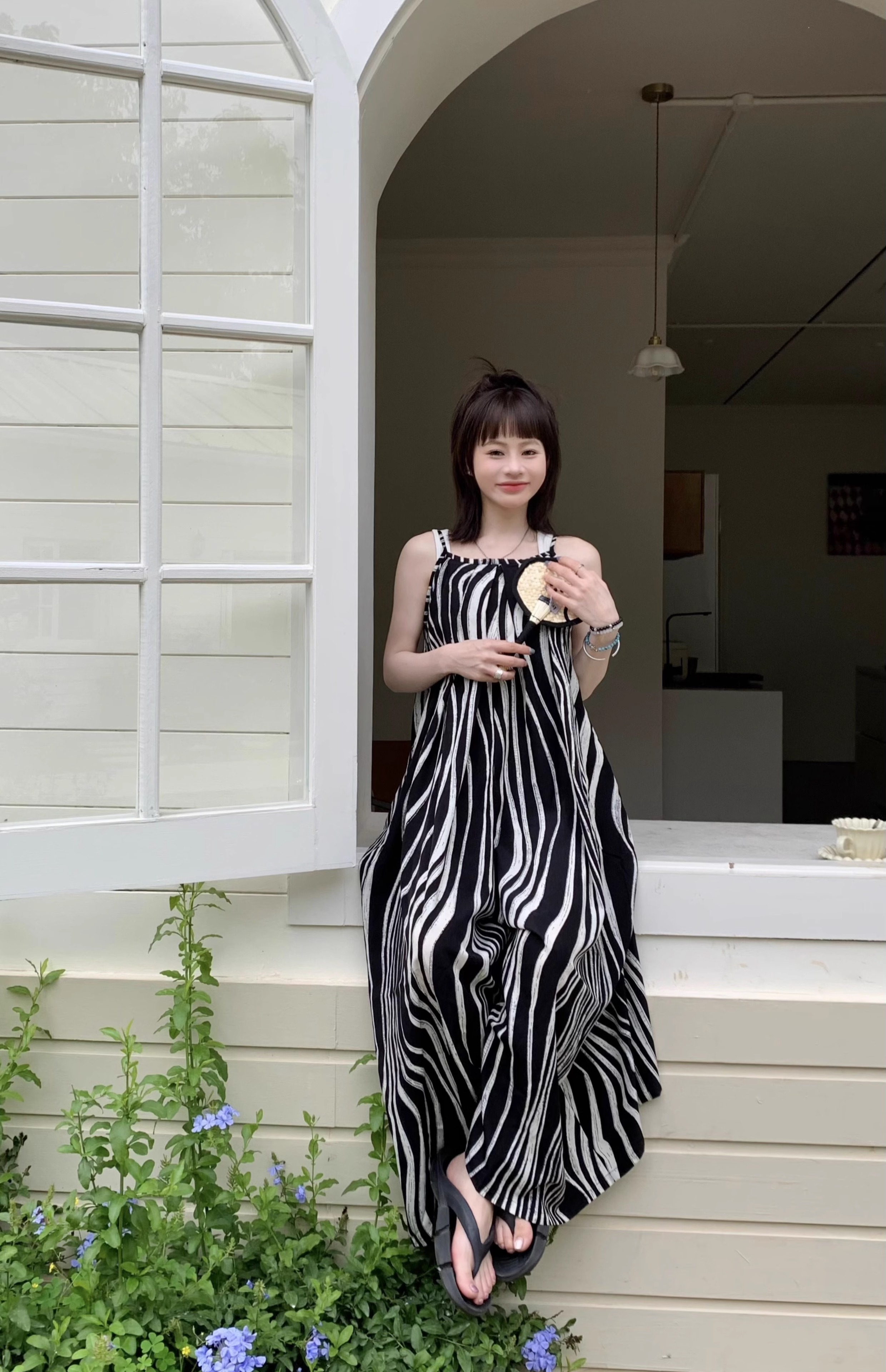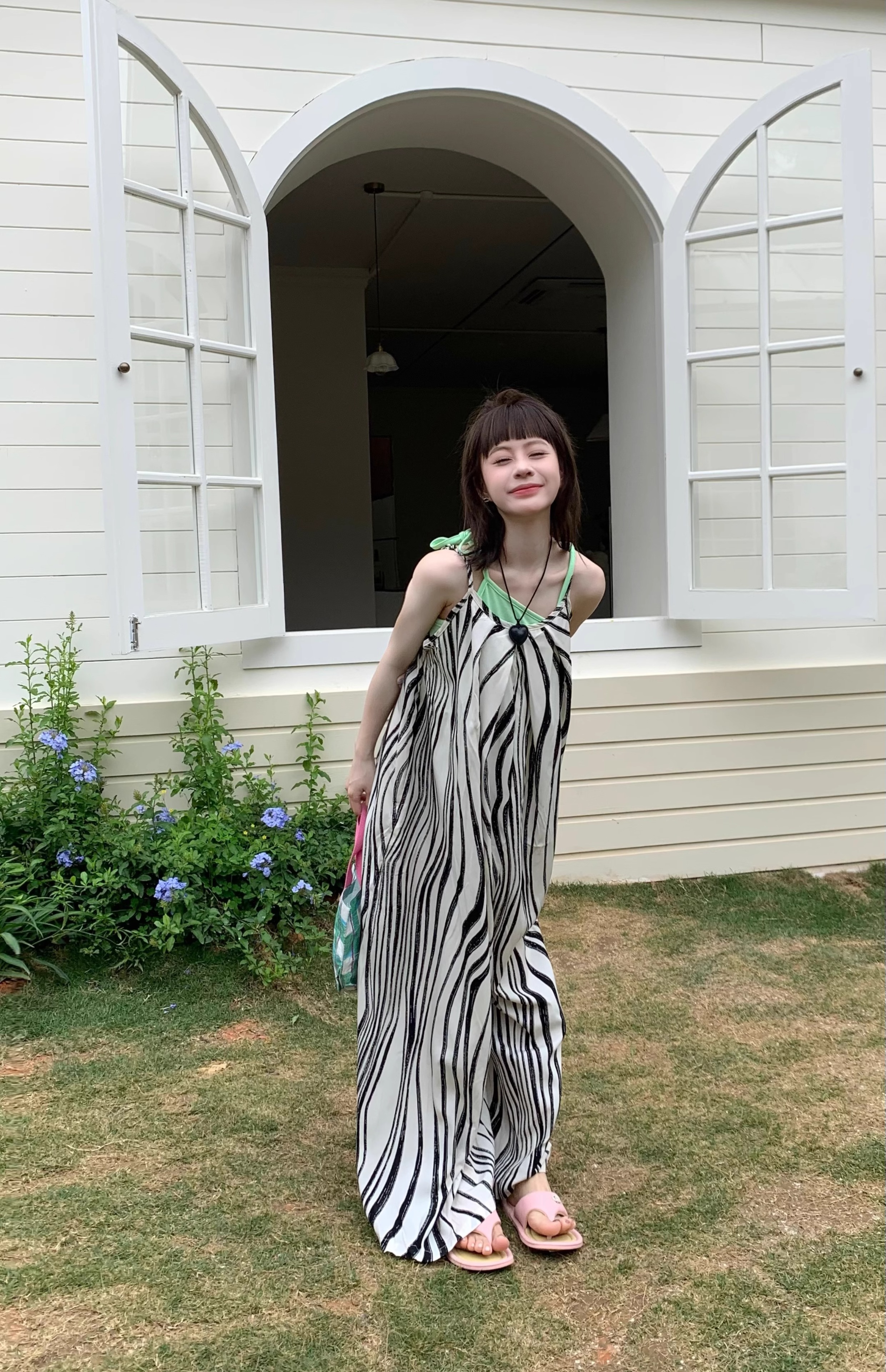 【ボトムス】ゆったりカジュアル 夏用 水波模様 ルーズ感たっぷり オーバーサイズキャミサロペット 【SHシリーズ】