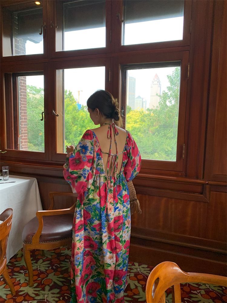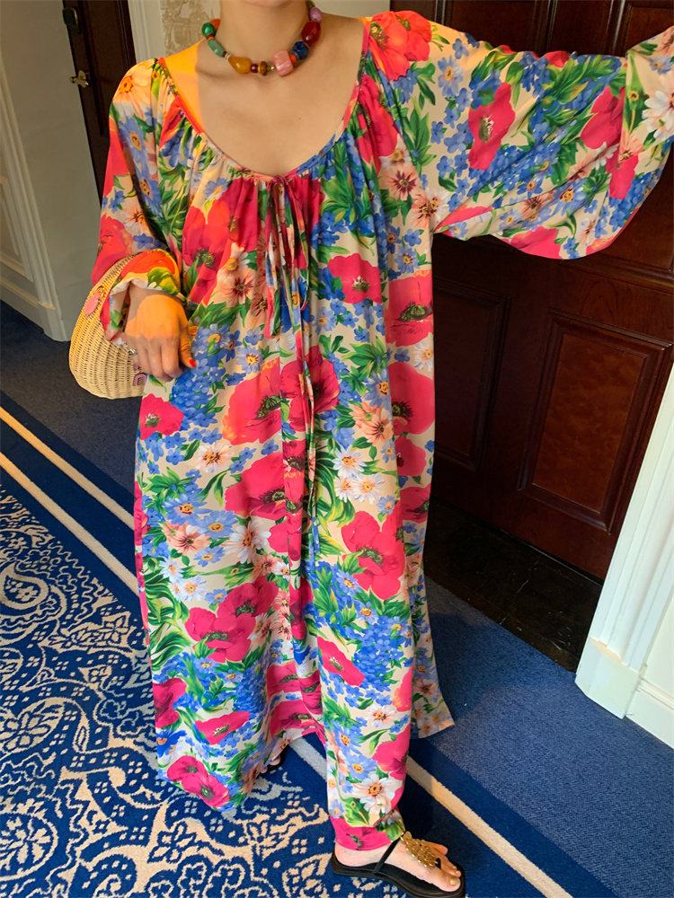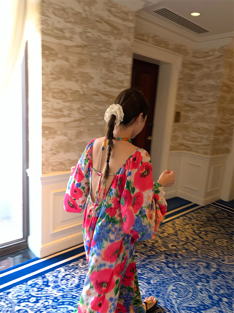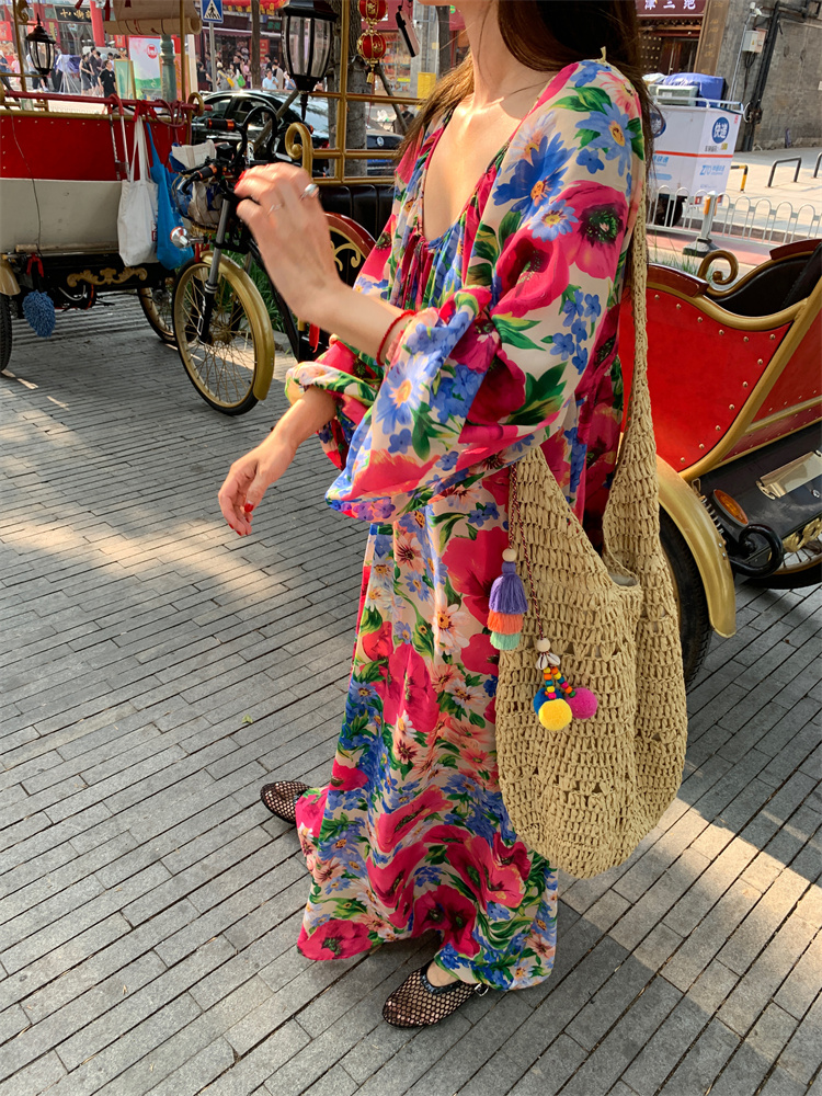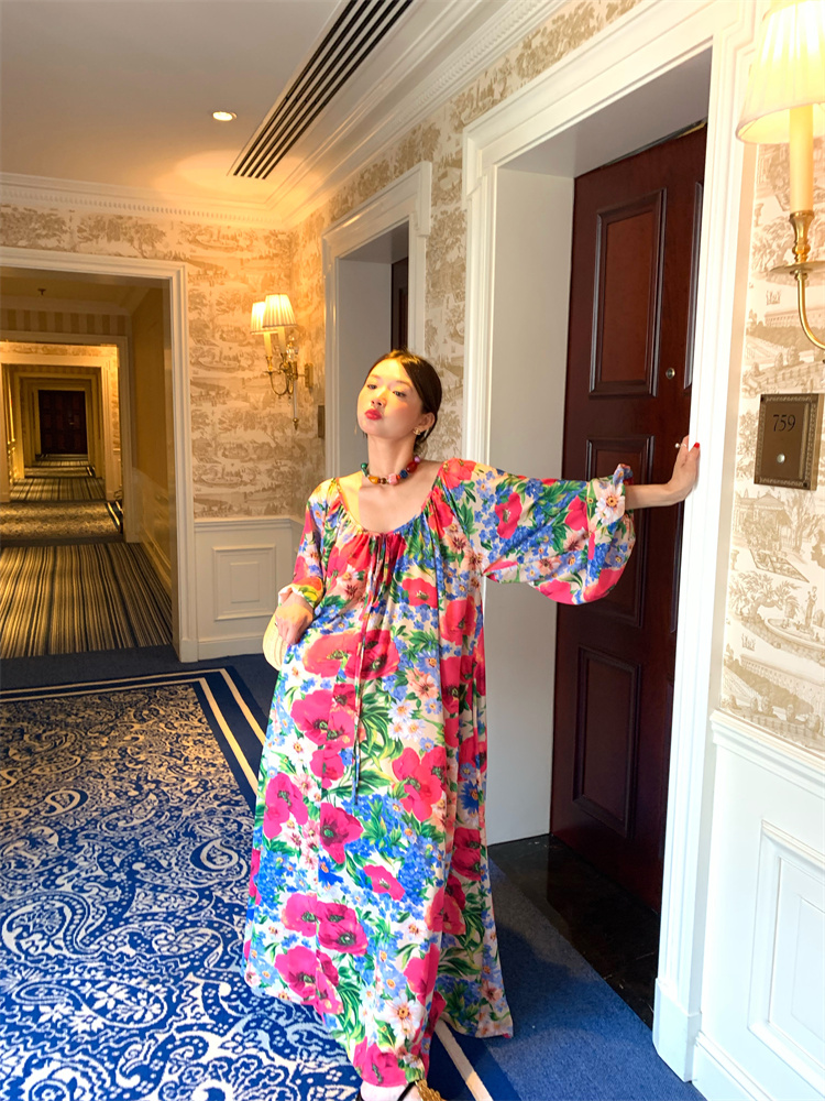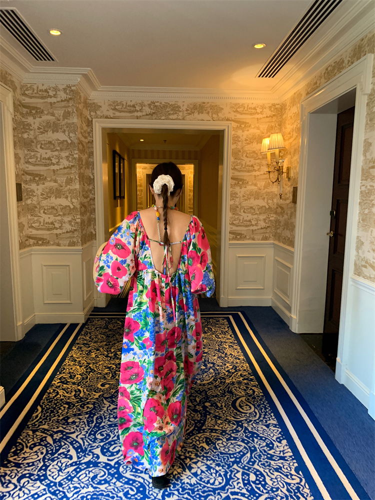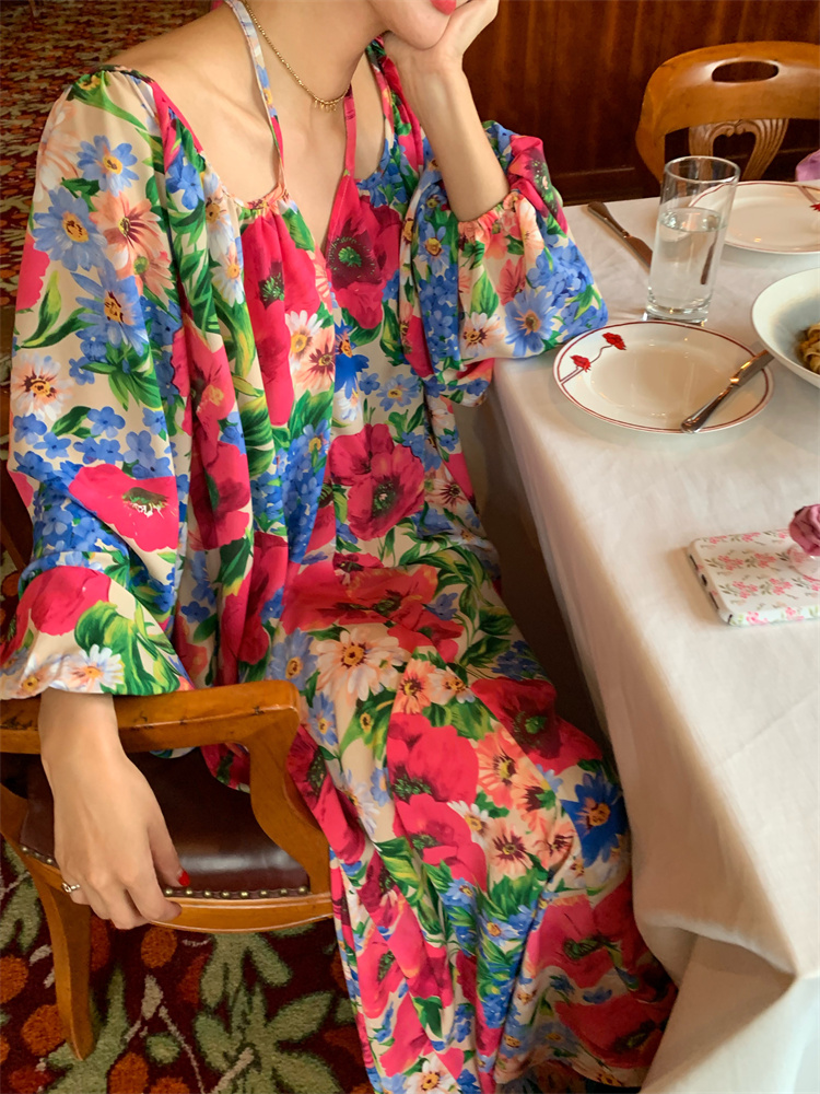 【ワンピース】超可愛い 春夏 ゆったり ロング丈 Vネック 背中あき 花柄 長袖ワンピース【SHシリーズ】