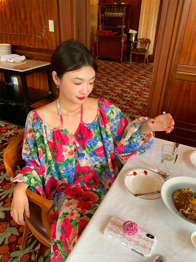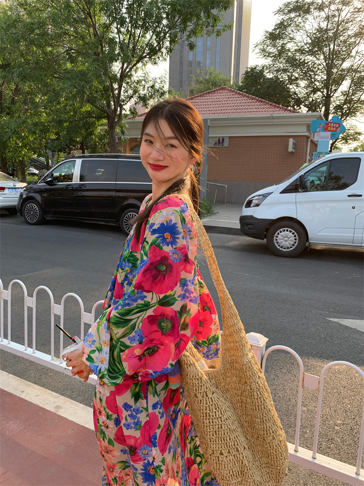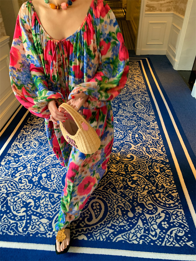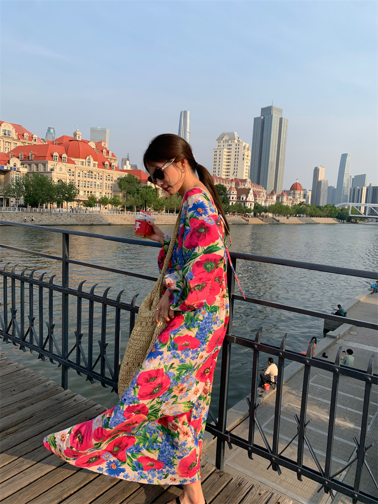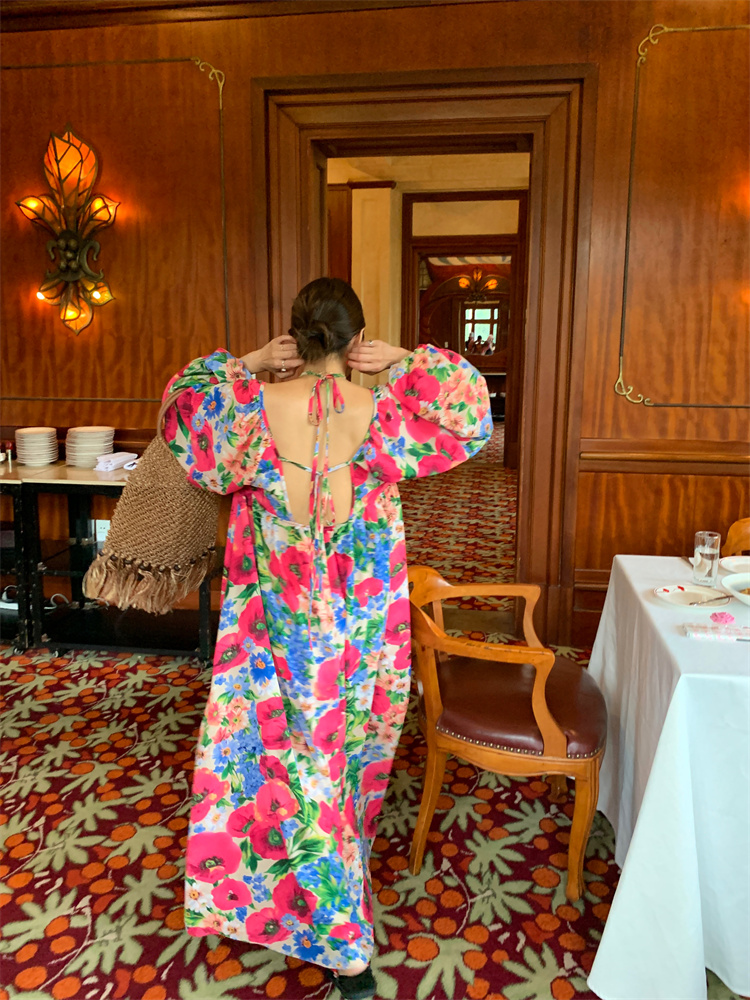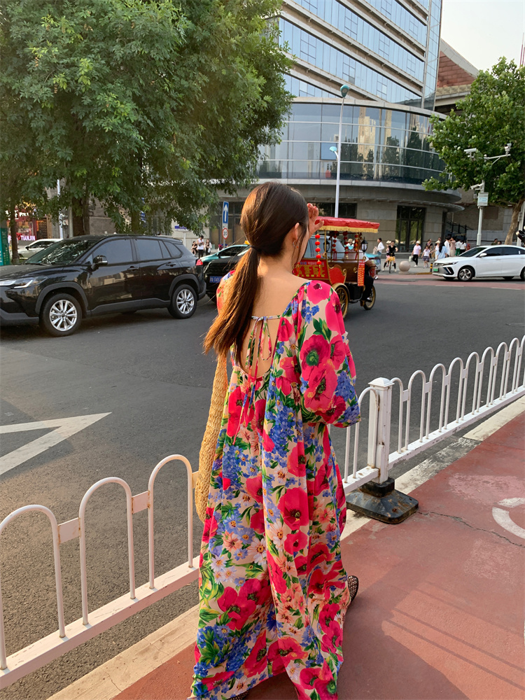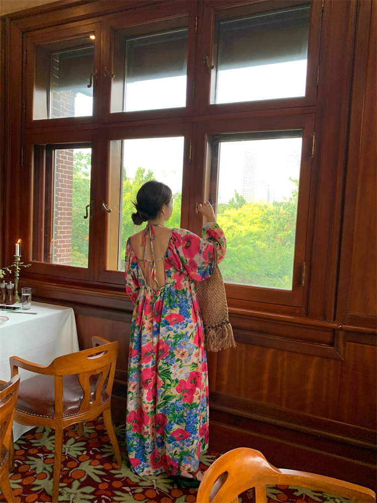 【ワンピース】超可愛い 春夏 ゆったり ロング丈 Vネック 背中あき 花柄 長袖ワンピース【SHシリーズ】