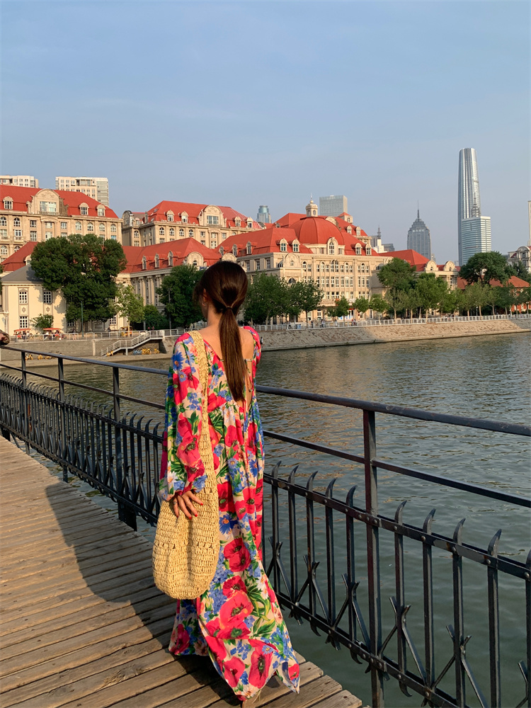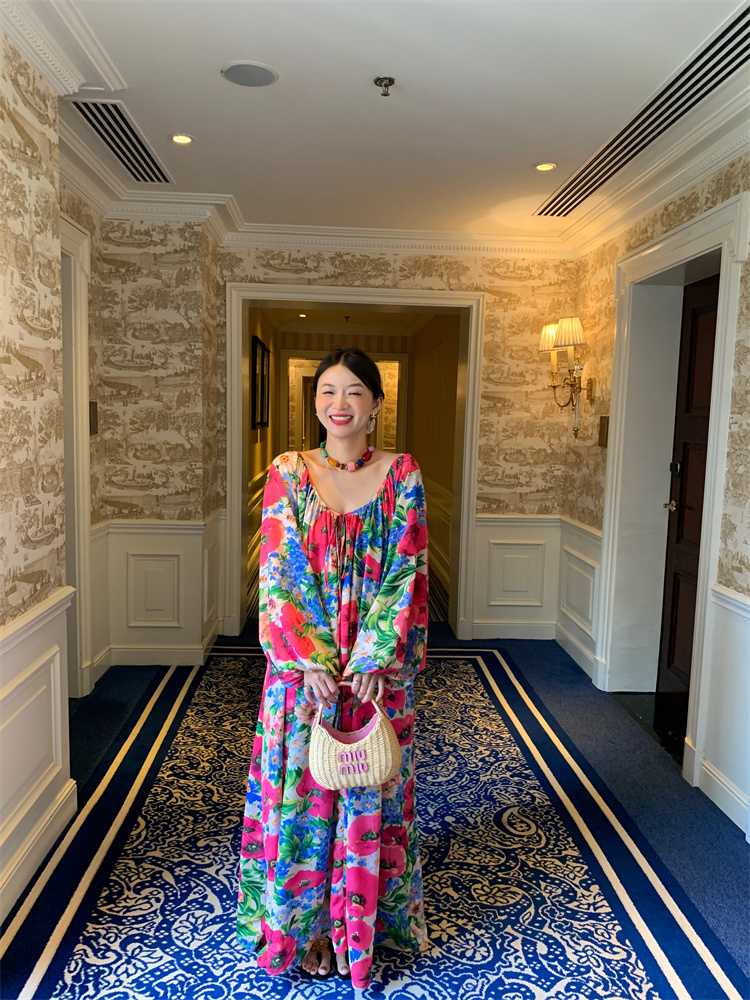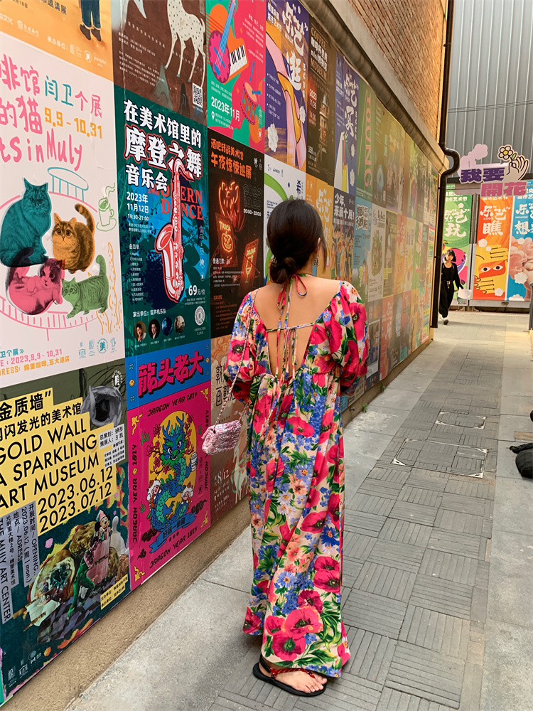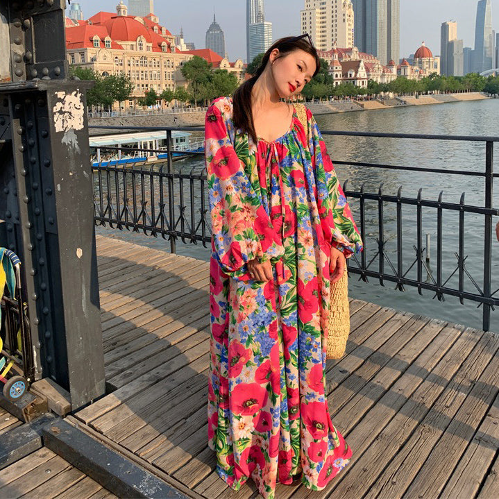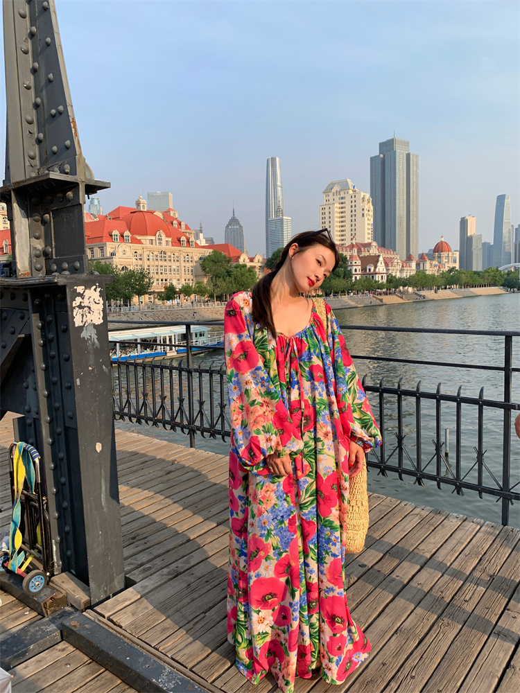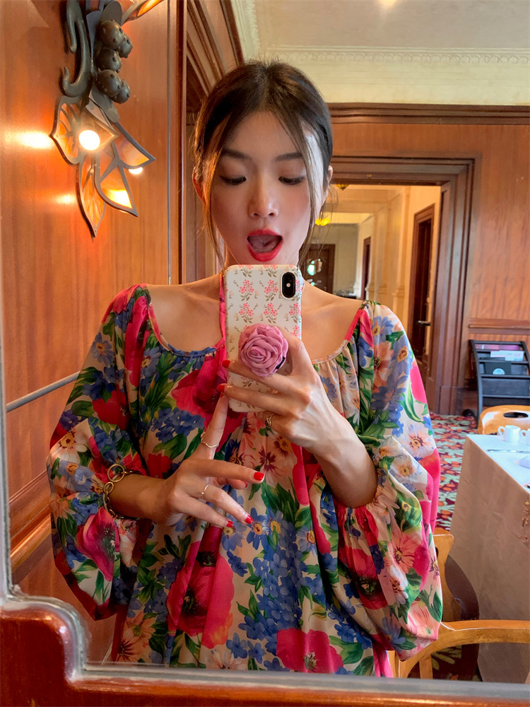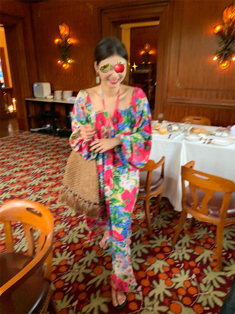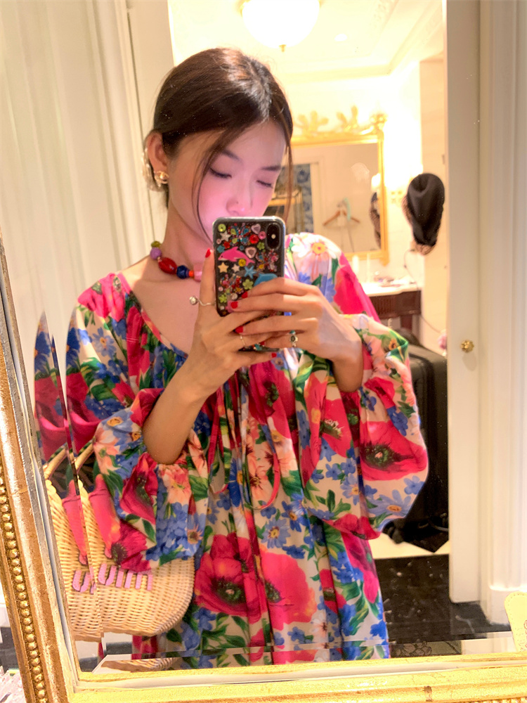 【ワンピース】超可愛い 春夏 ゆったり ロング丈 Vネック 背中あき 花柄 長袖ワンピース【SHシリーズ】