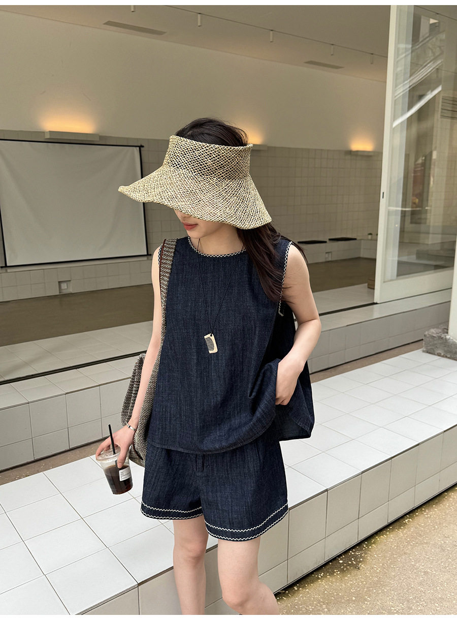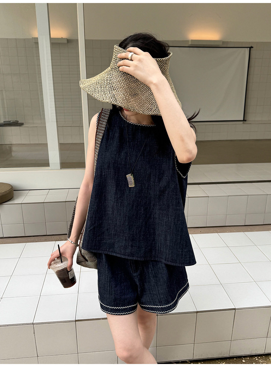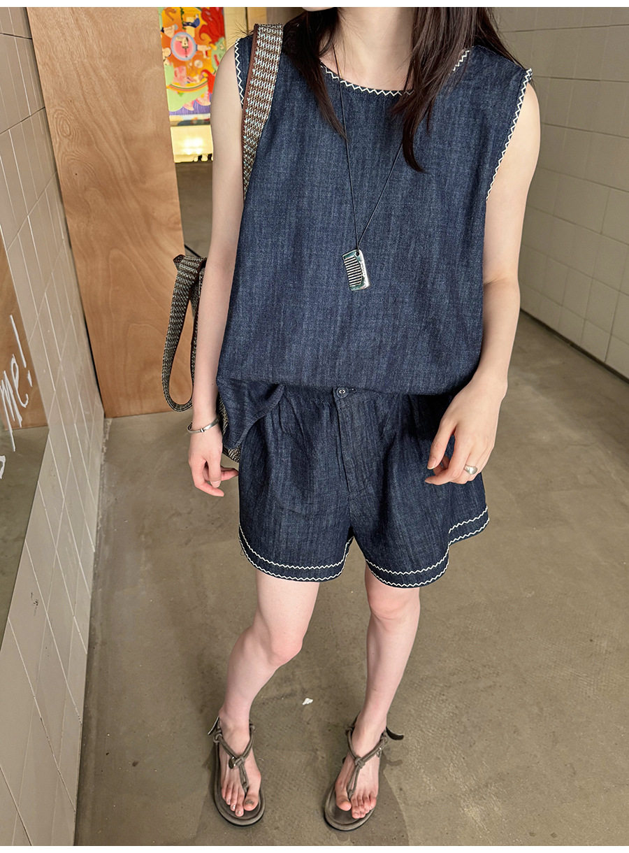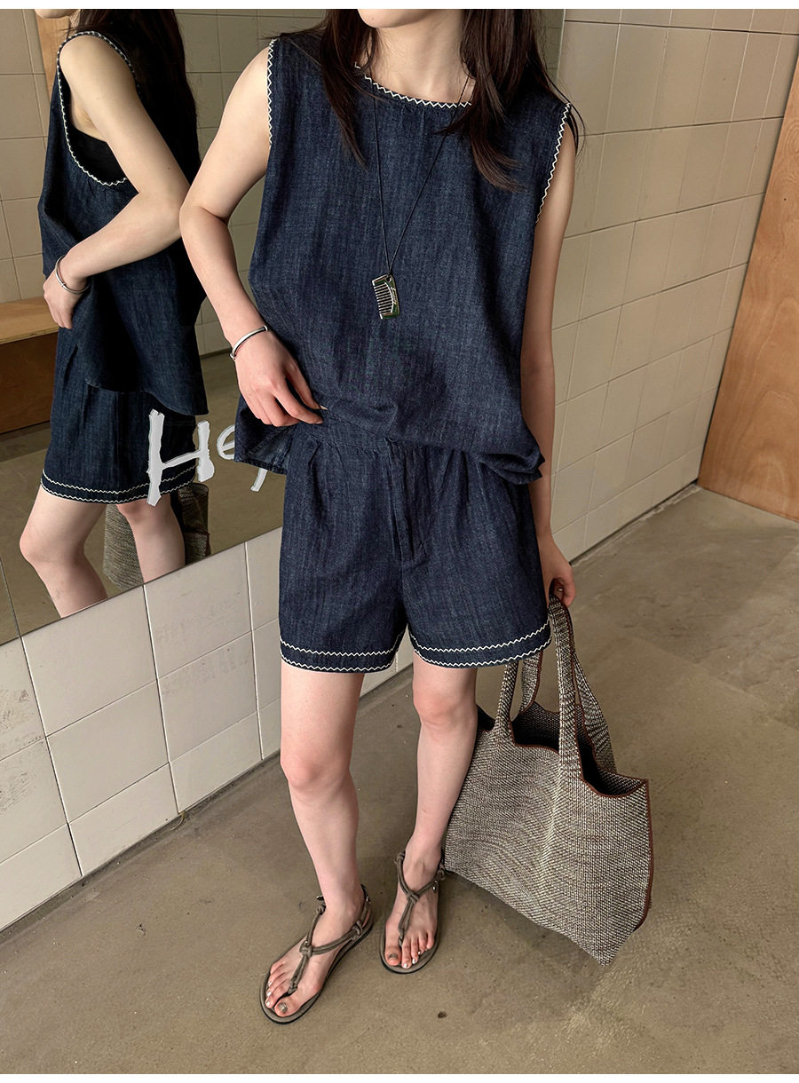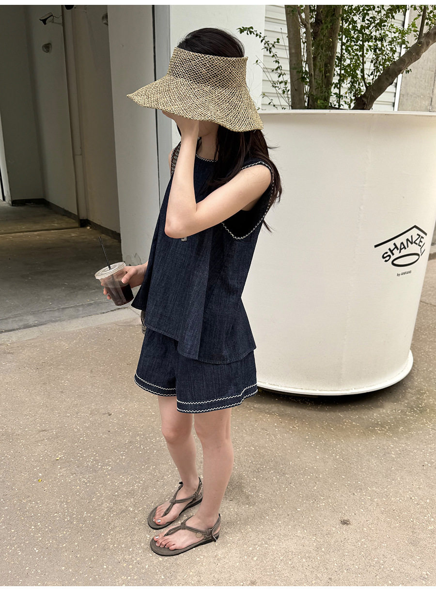 2点セット!【セットアップ】夏新作 韓国風 ベスト+ウエストゴムショートパンツ 配色デニム 上下セットアップ【JZシリーズ】