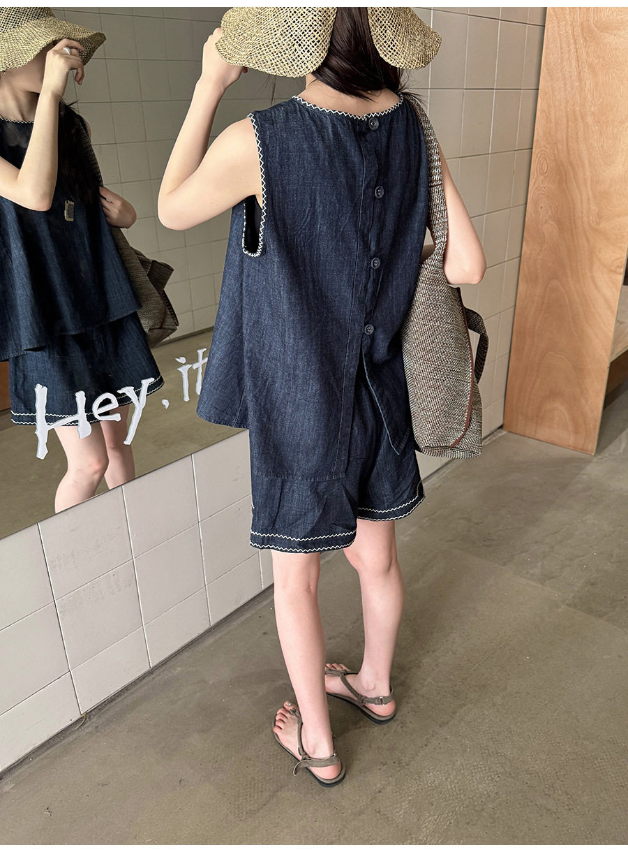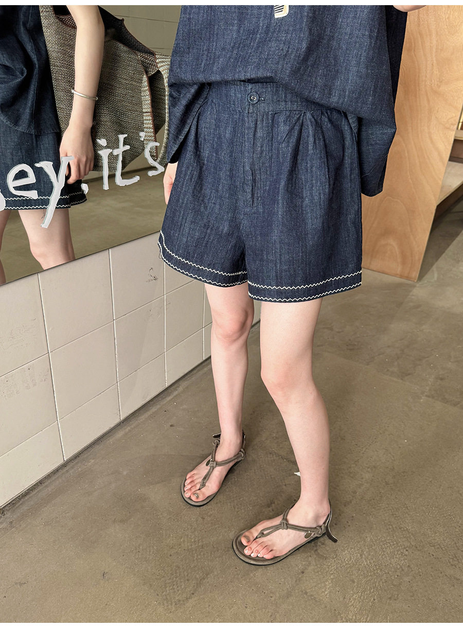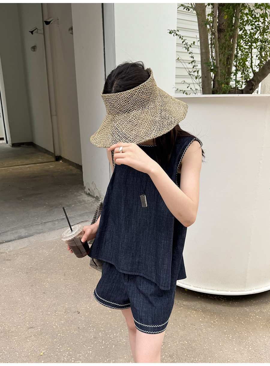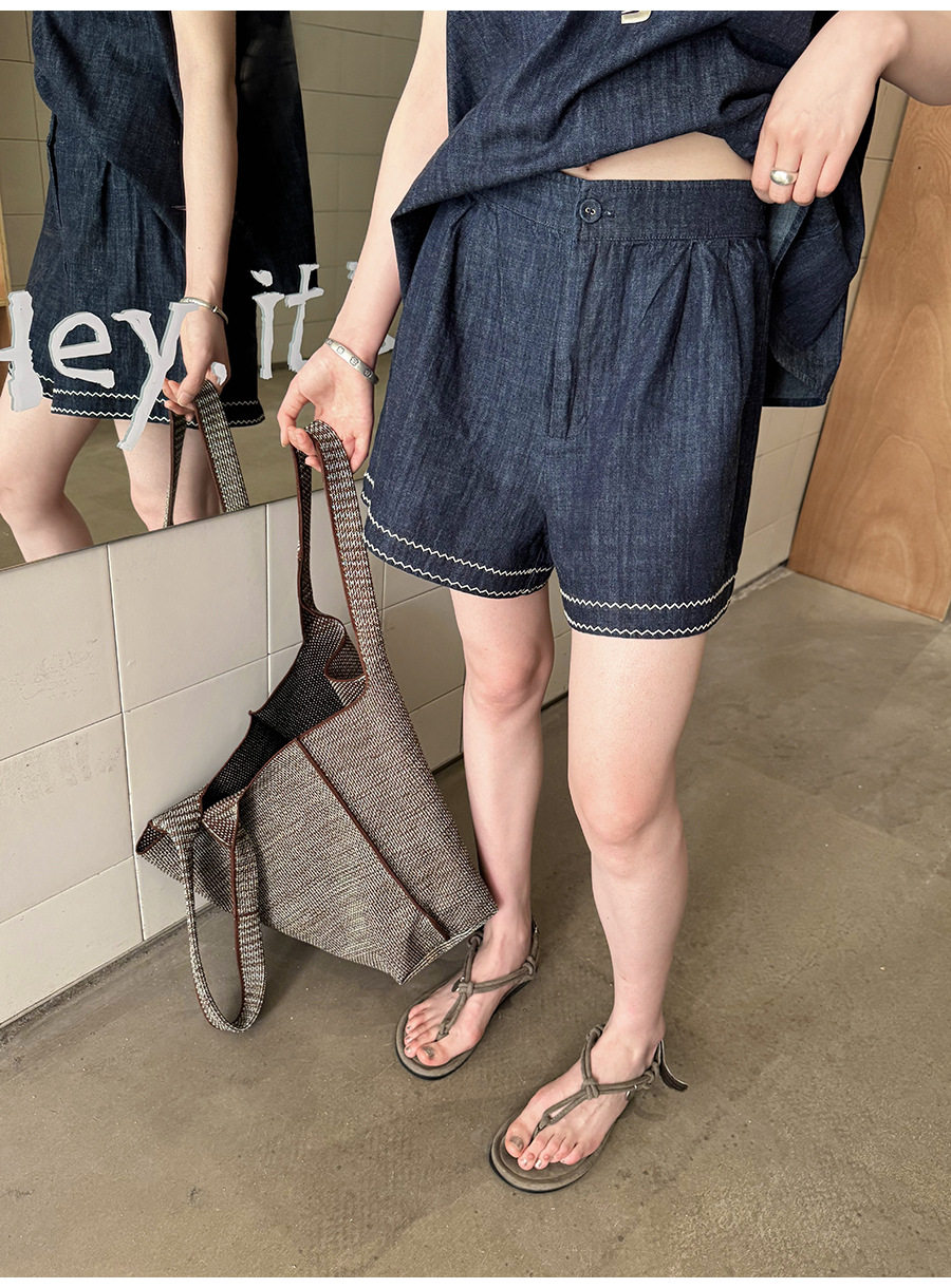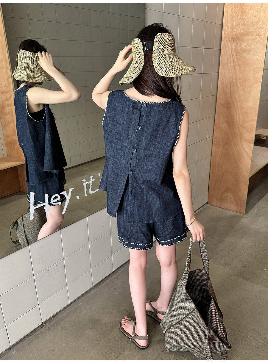 2点セット!【セットアップ】夏新作 韓国風 ベスト+ウエストゴムショートパンツ 配色デニム 上下セットアップ【JZシリーズ】