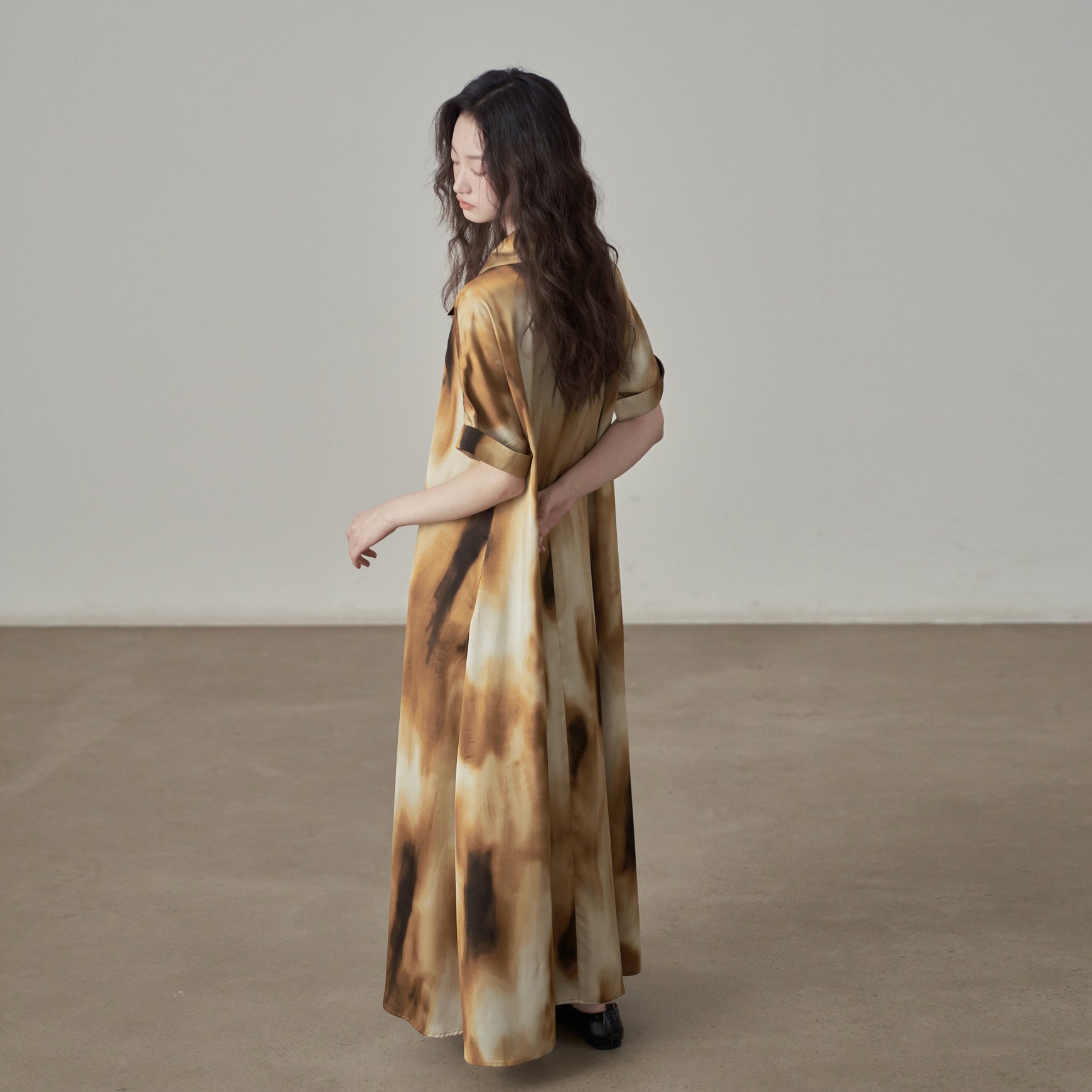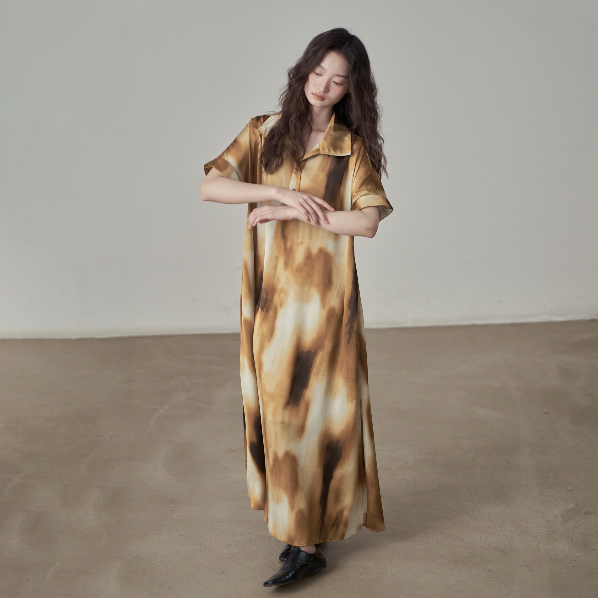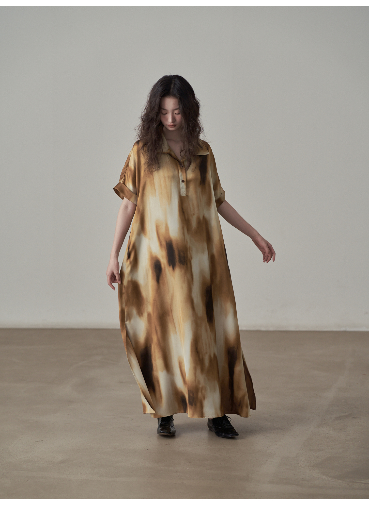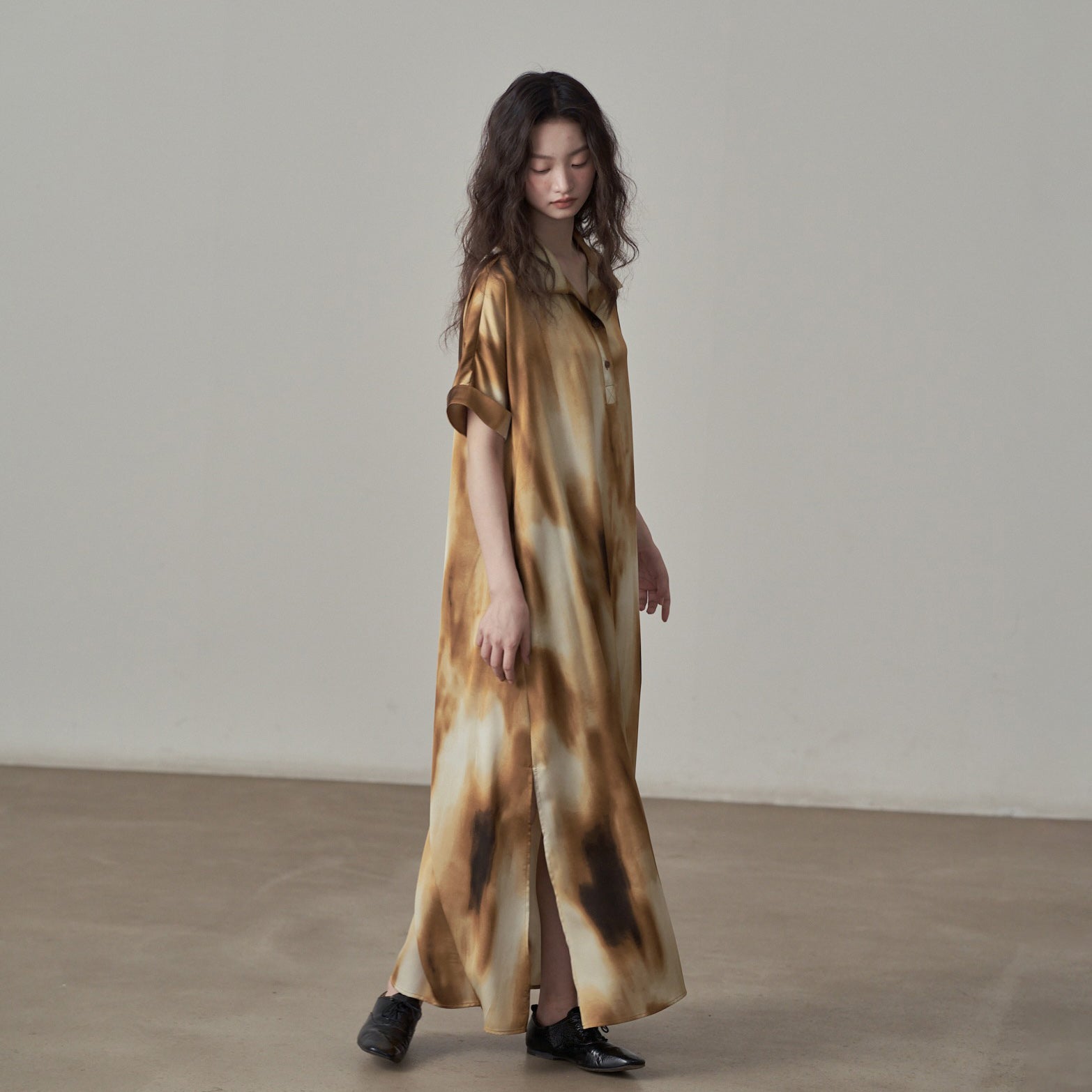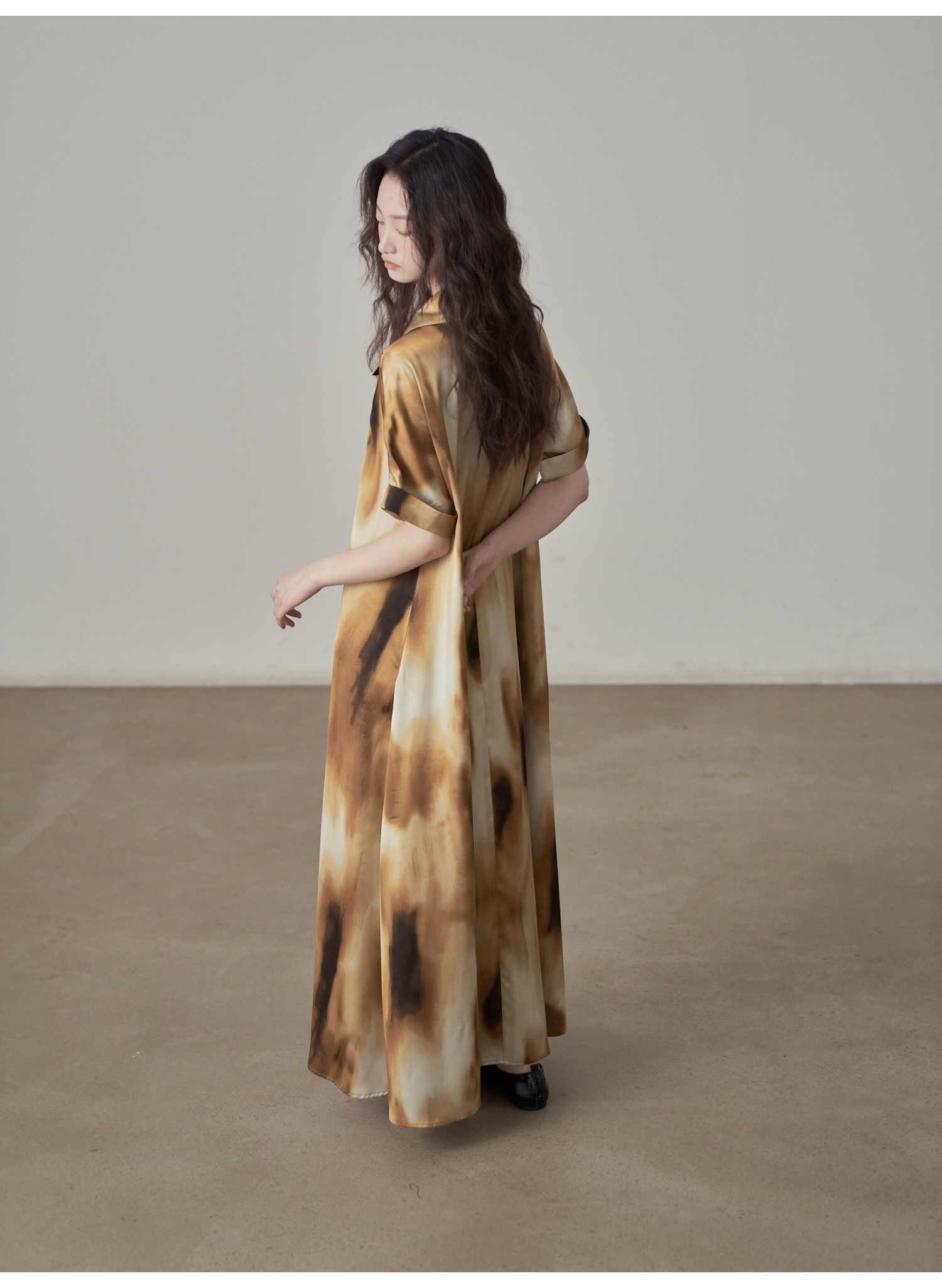 【ワンピース】新中式プリント 気品あるフィット感 ロング丈 半袖 シャツワンピース【SHシリーズ】