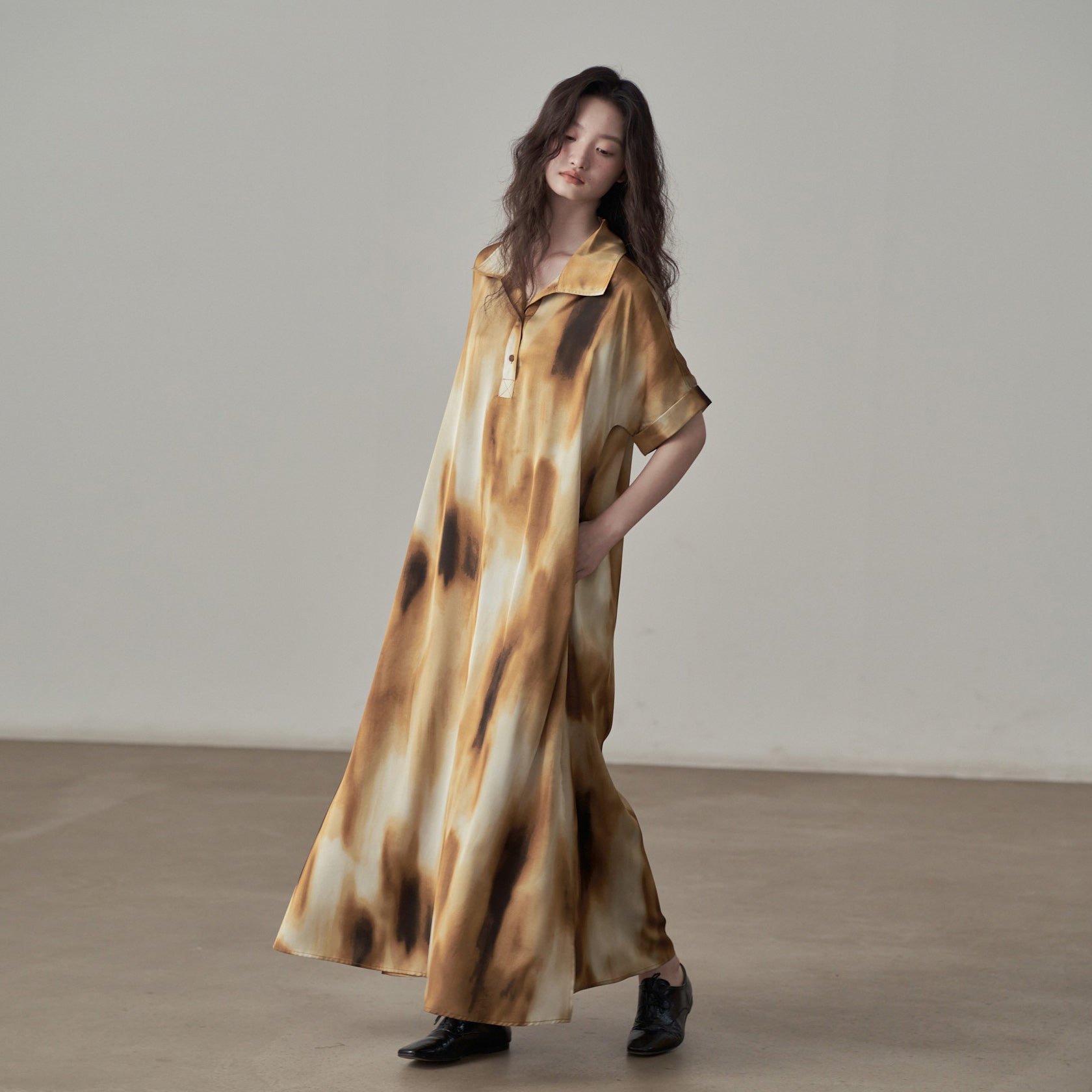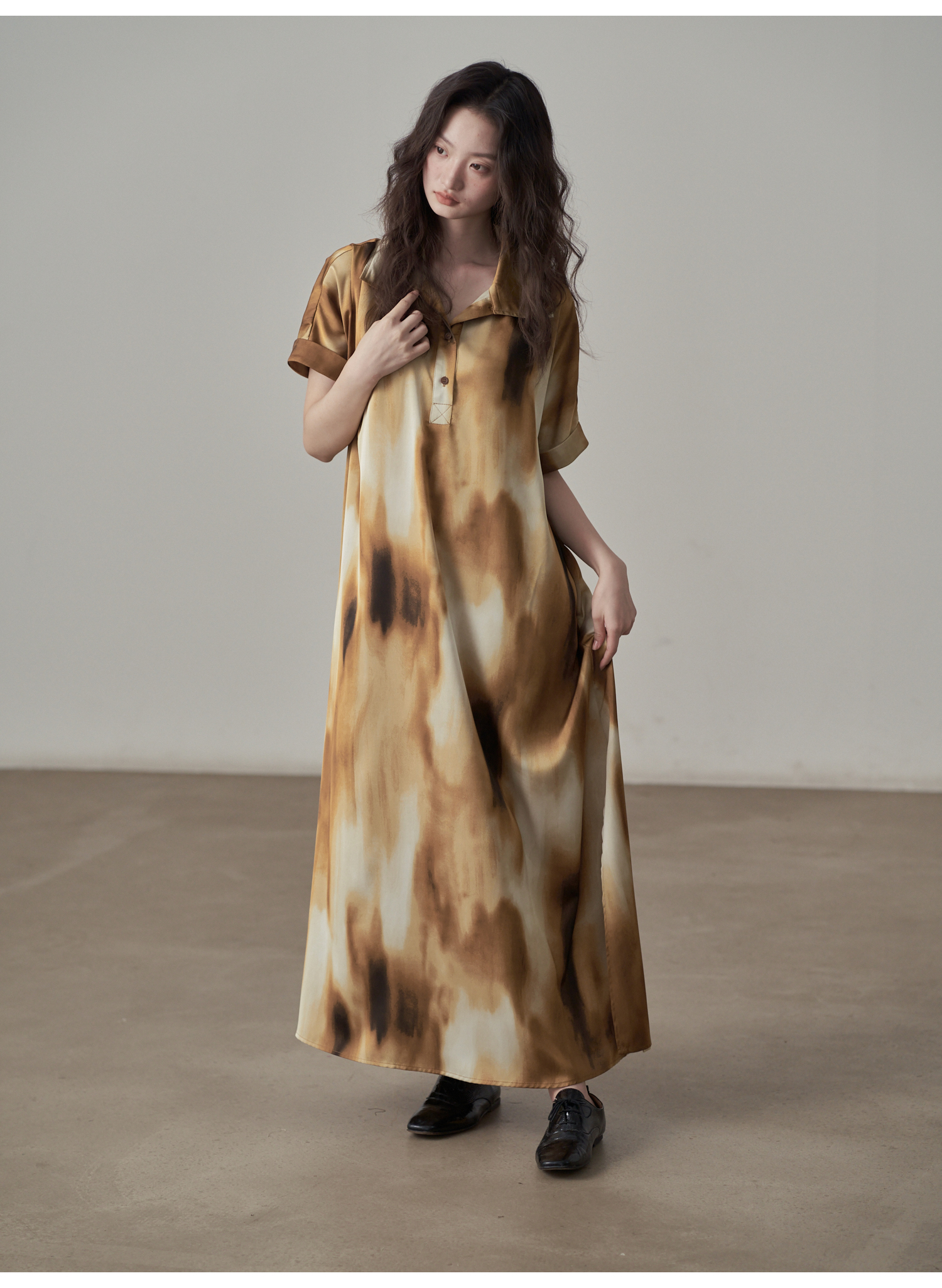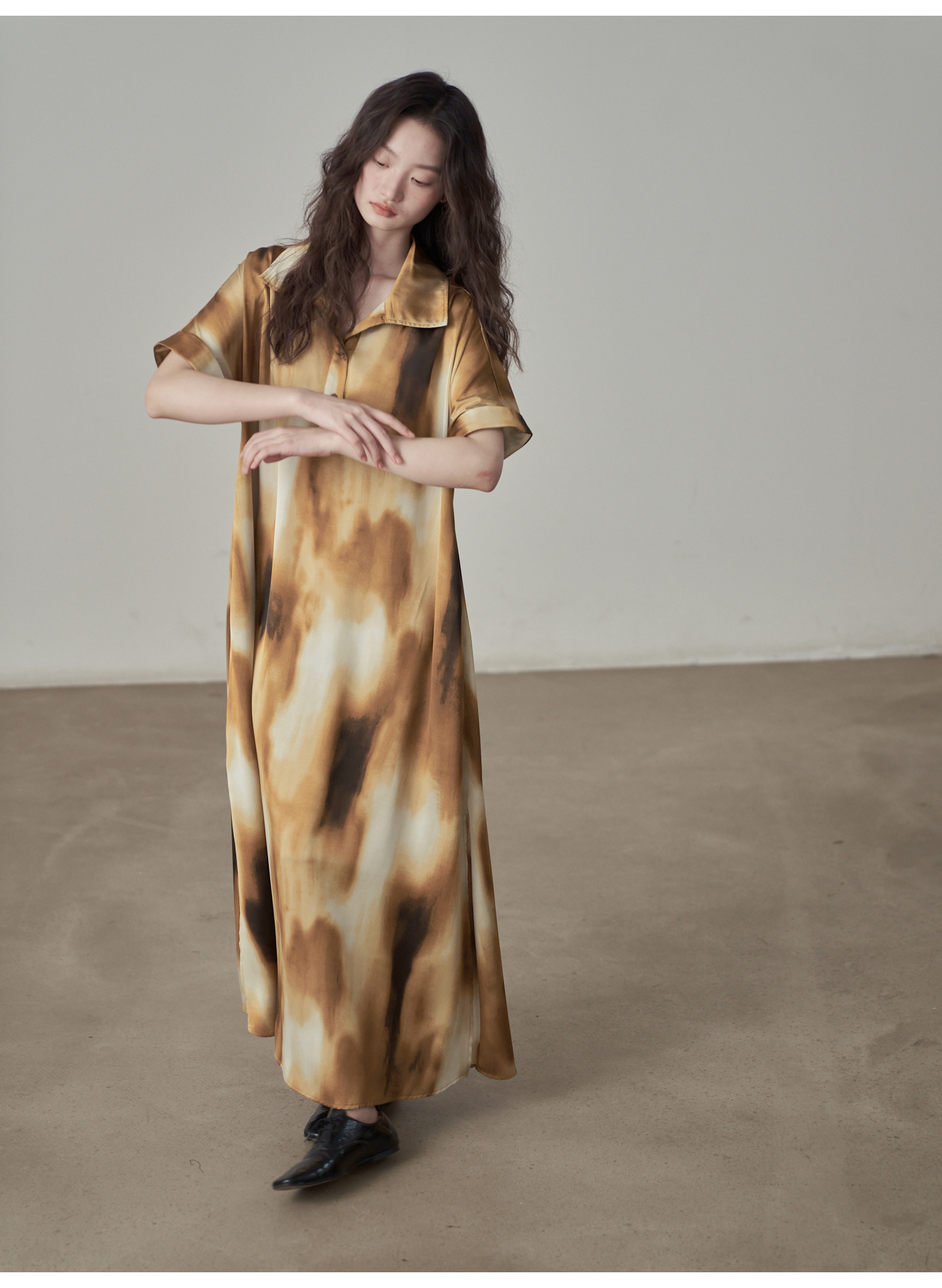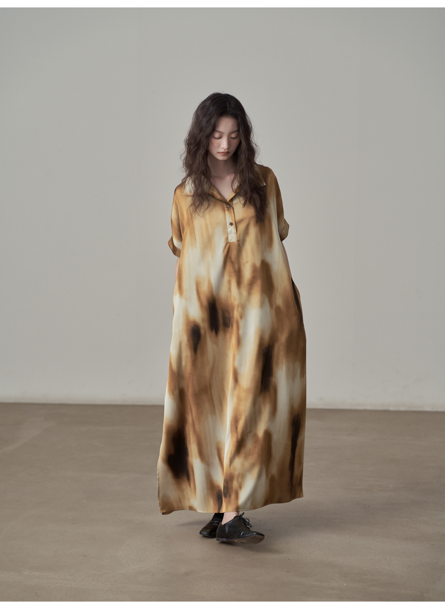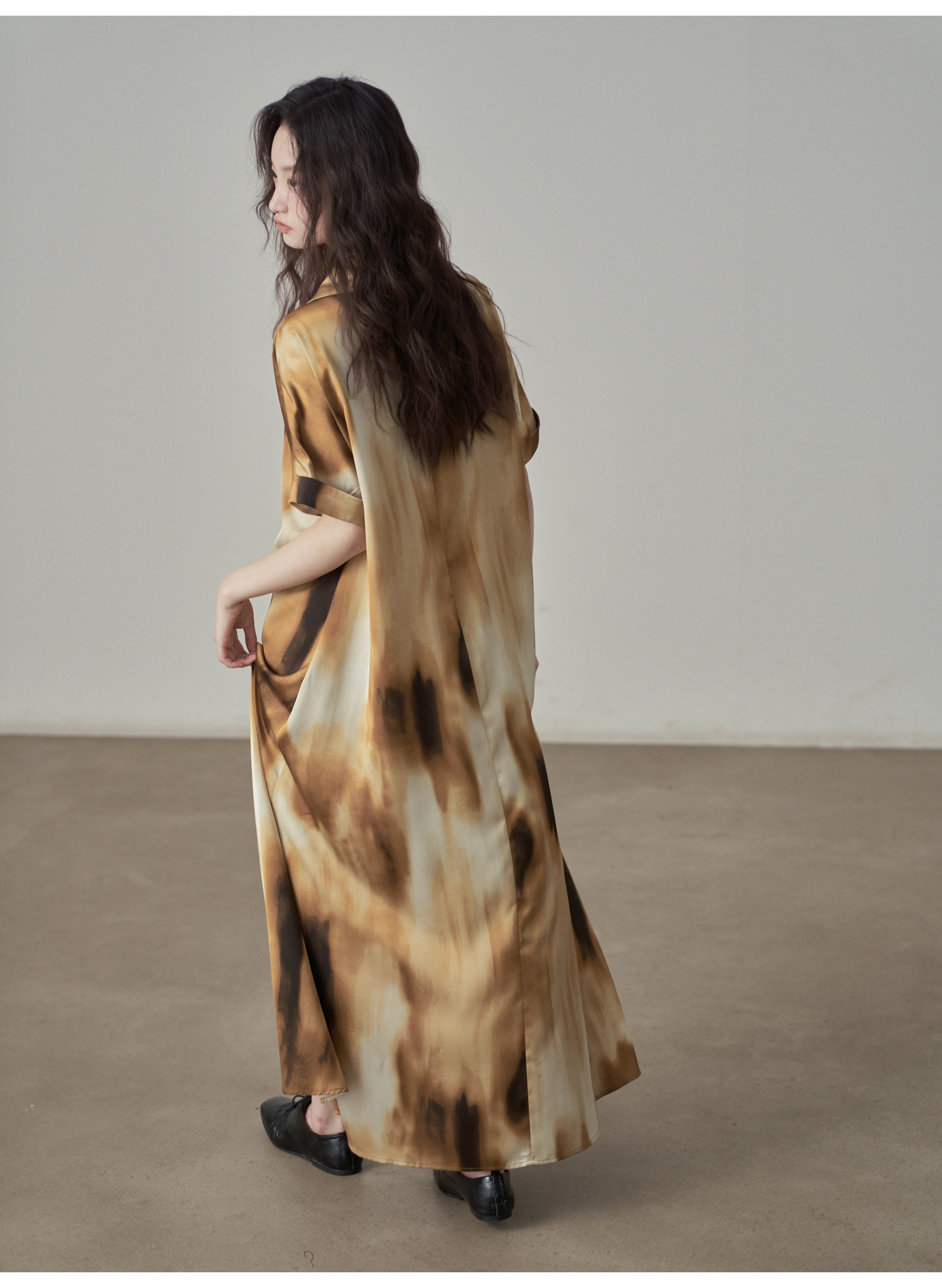 【ワンピース】新中式プリント 気品あるフィット感 ロング丈 半袖 シャツワンピース【SHシリーズ】
