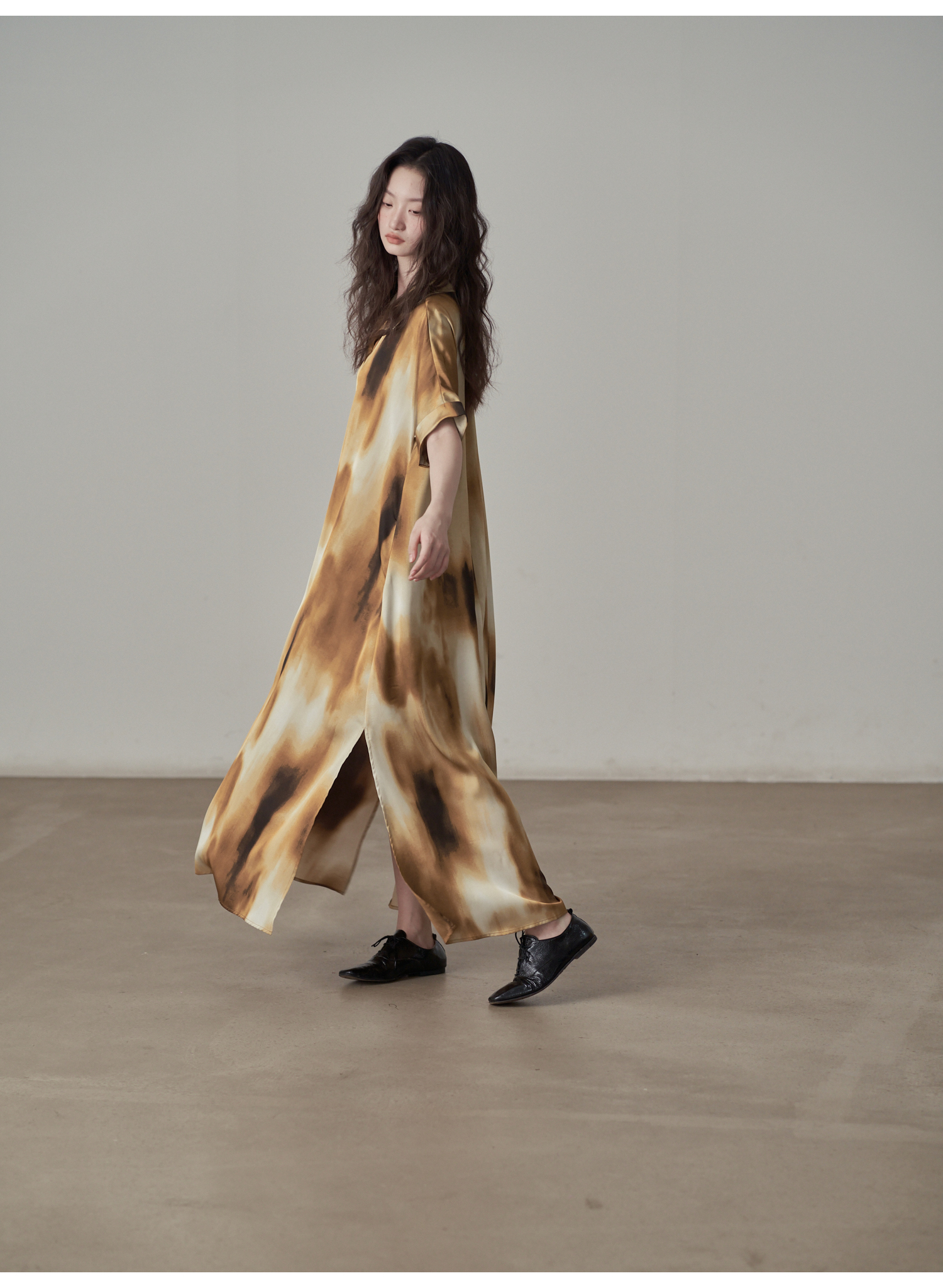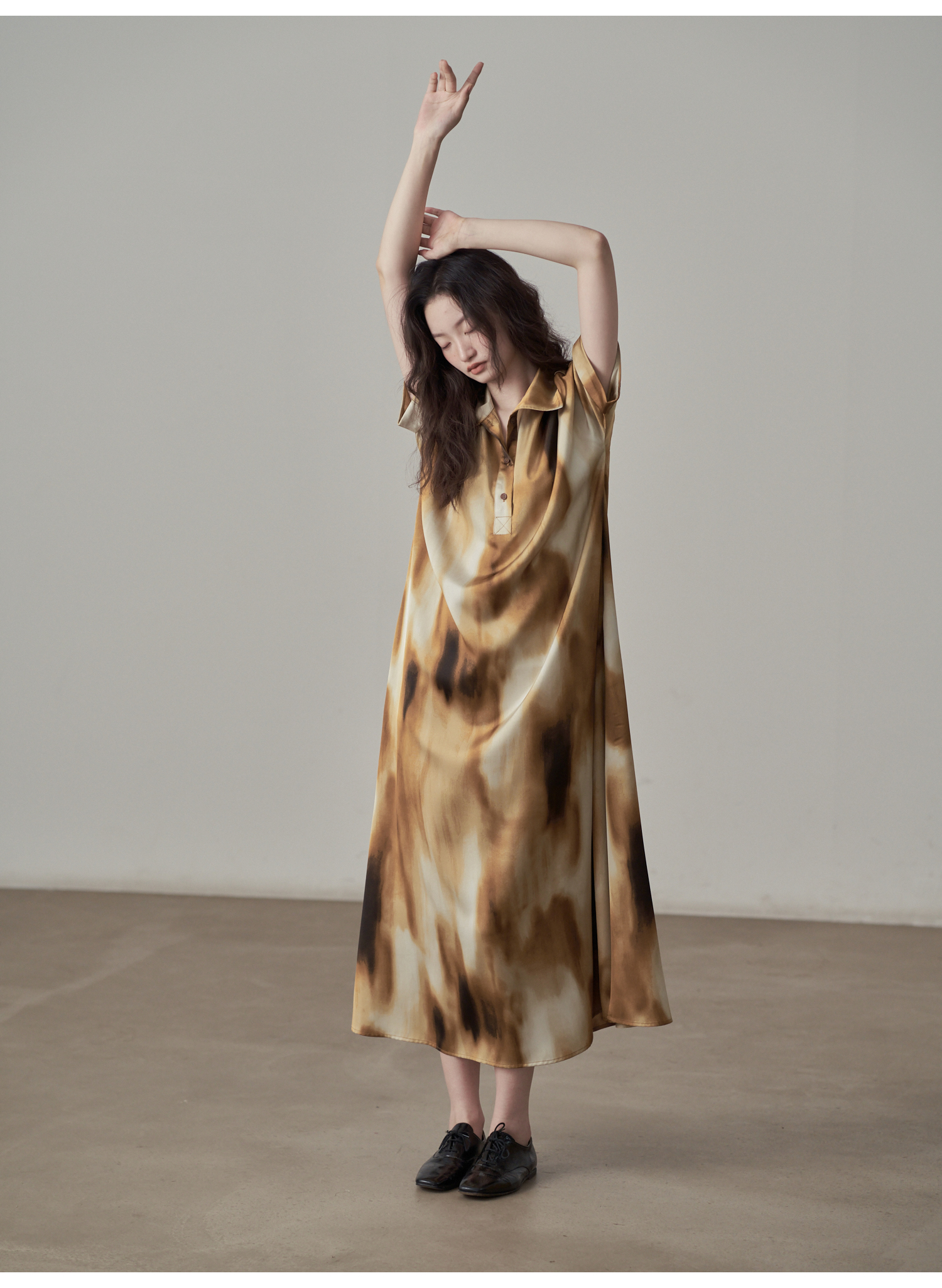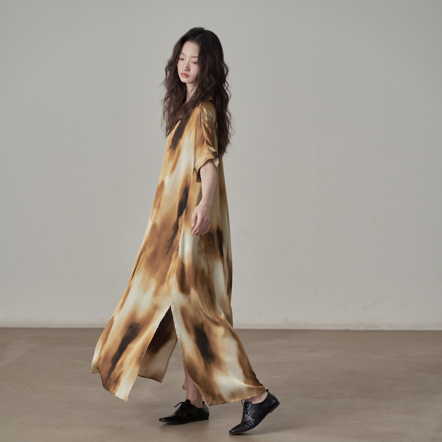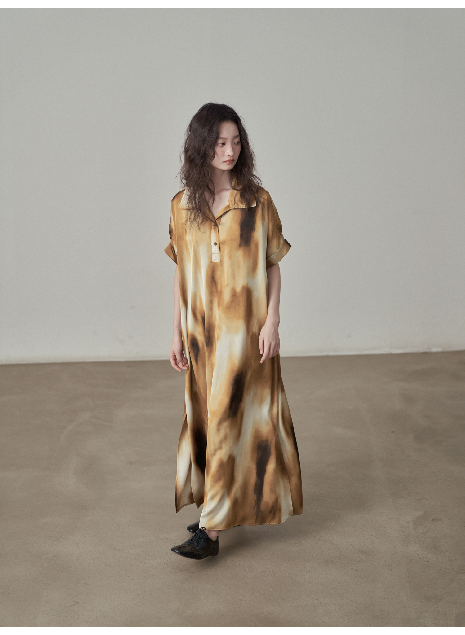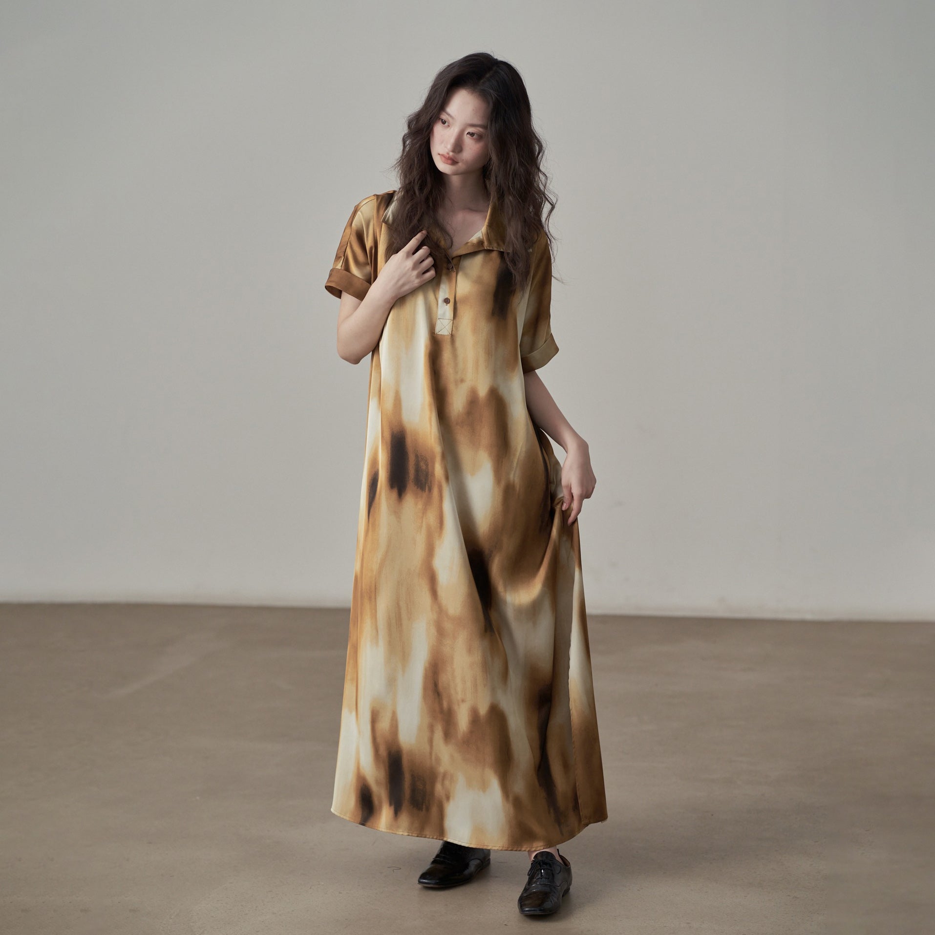 【ワンピース】新中式プリント 気品あるフィット感 ロング丈 半袖 シャツワンピース【SHシリーズ】