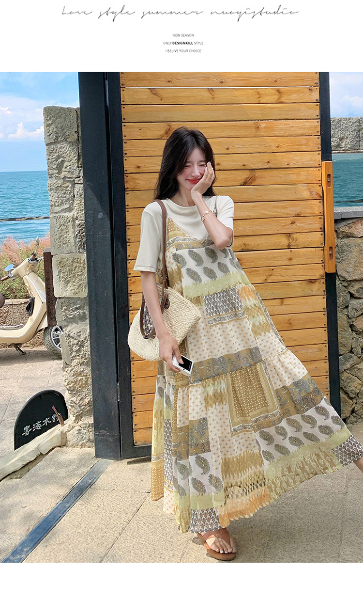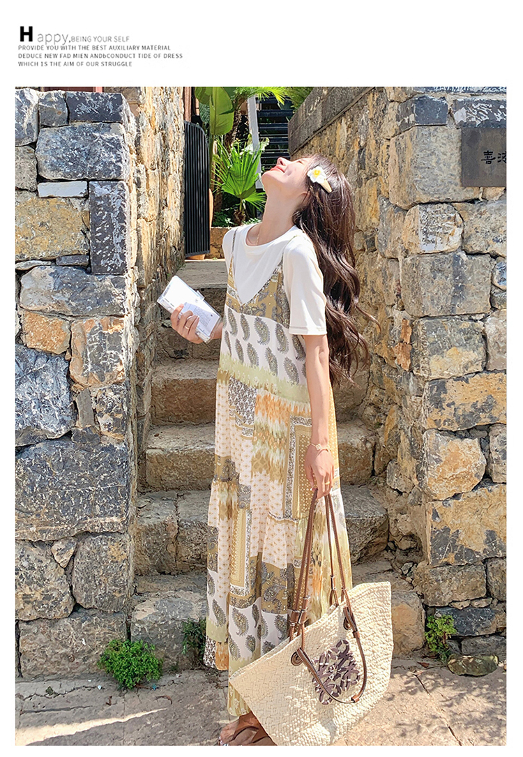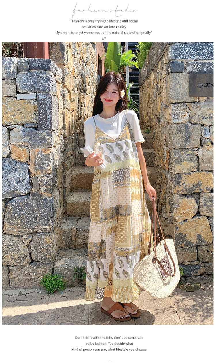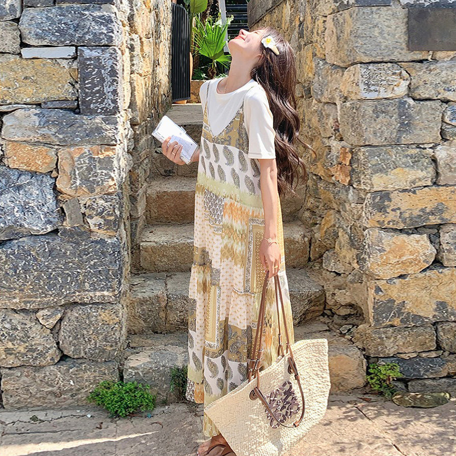 2点セット!【セットアップ】優しげリゾート風 夏新作 Tシャツ+花柄 ノースリーブワンピースセット【SHシリーズ】