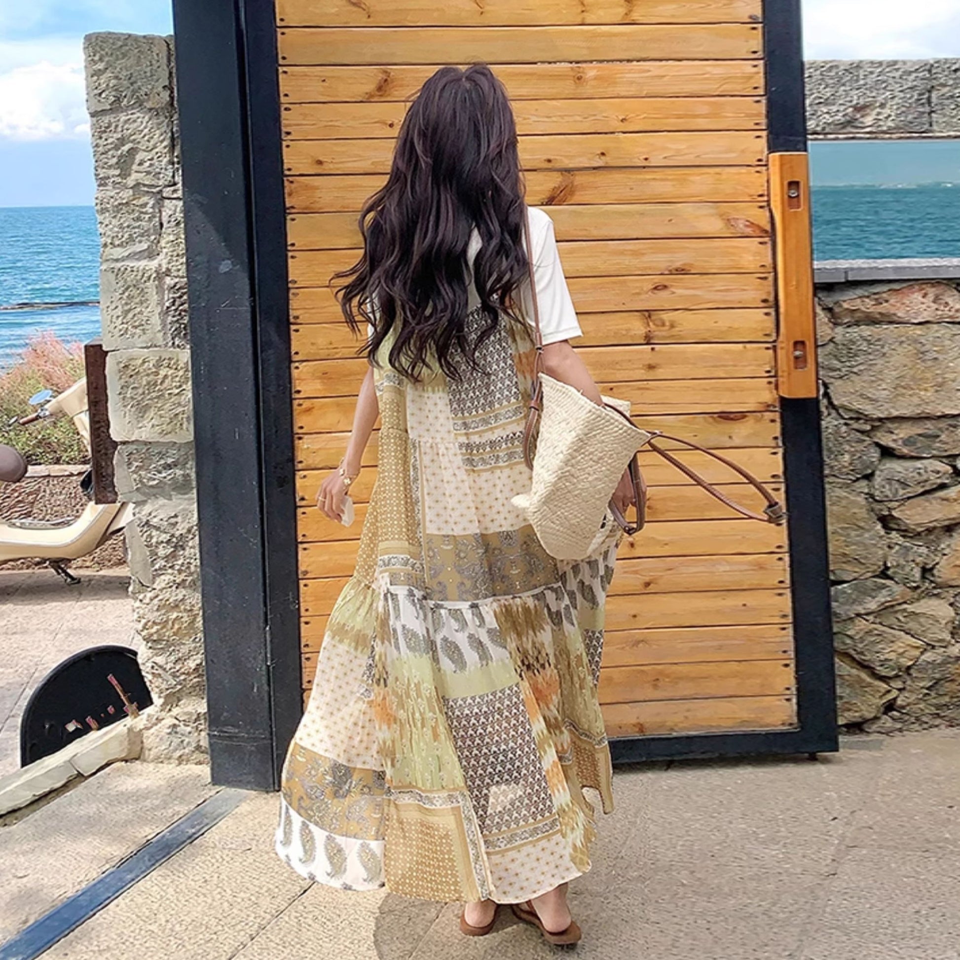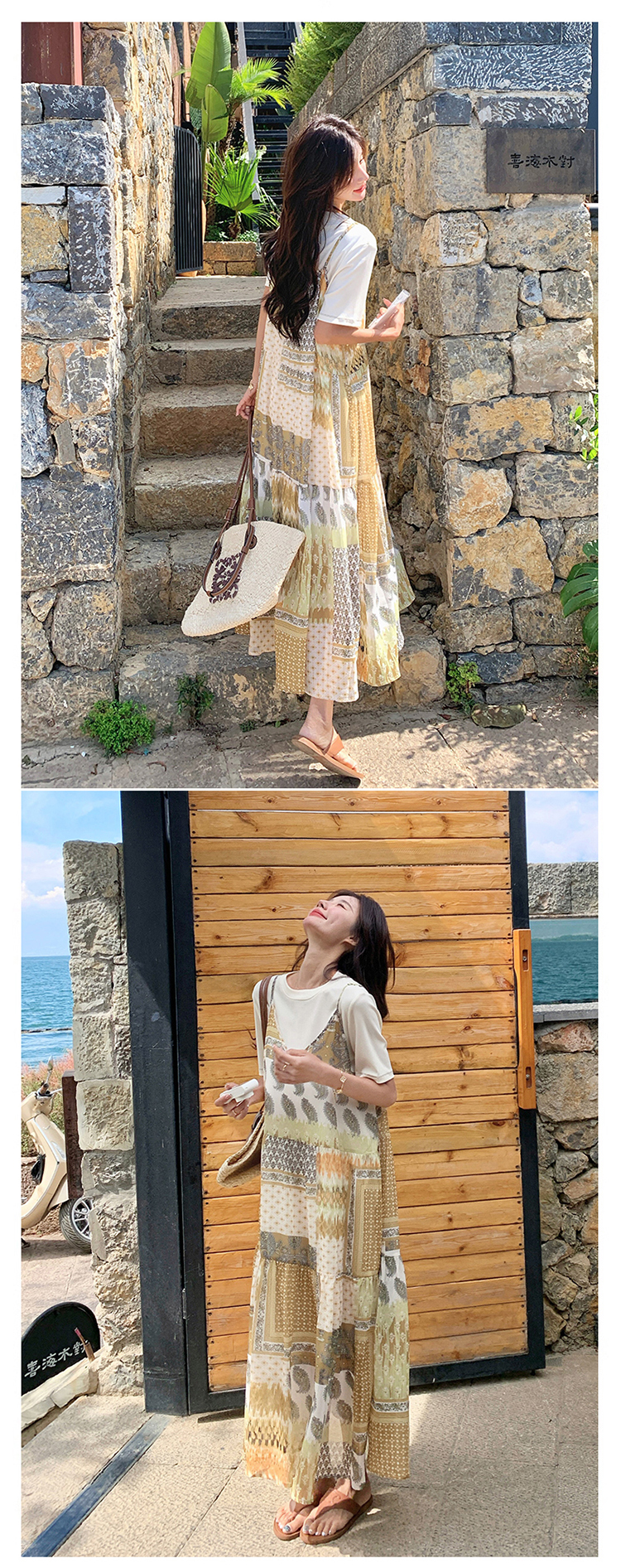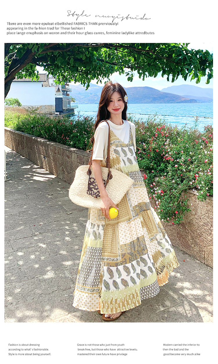 2点セット!【セットアップ】優しげリゾート風 夏新作 Tシャツ+花柄 ノースリーブワンピースセット【SHシリーズ】