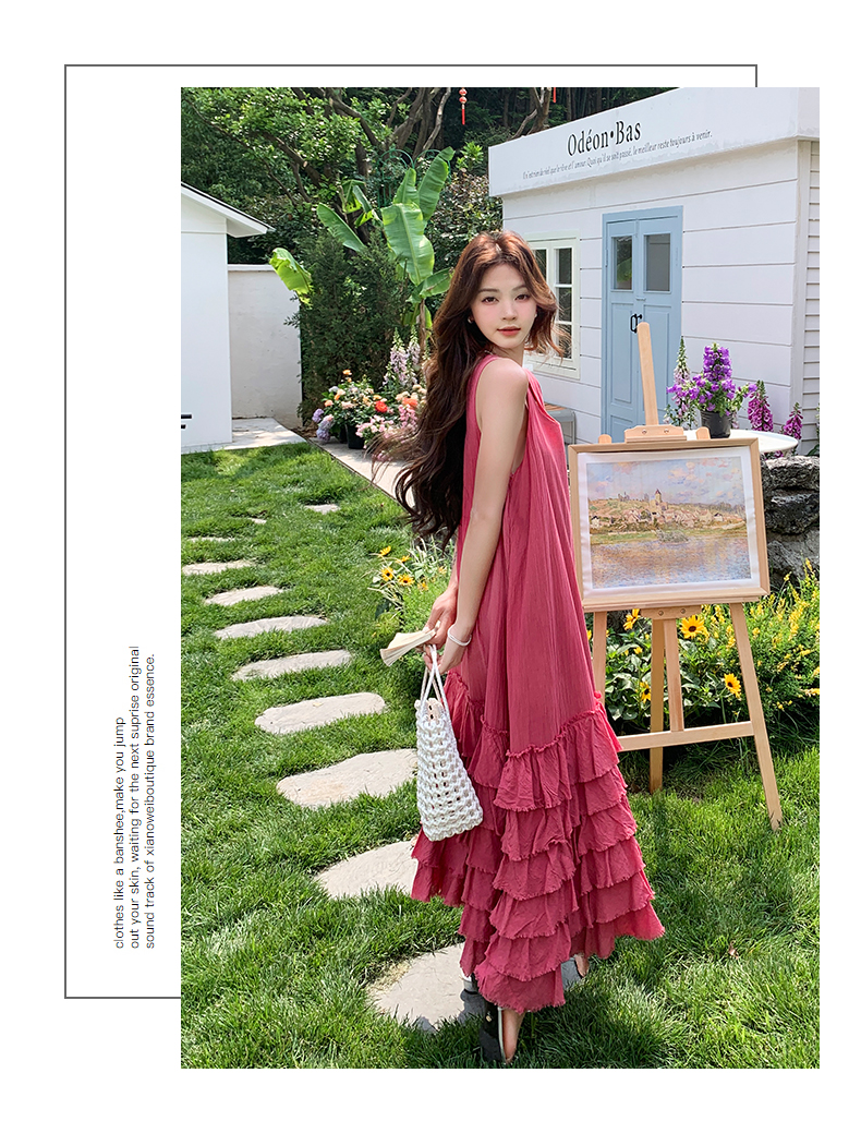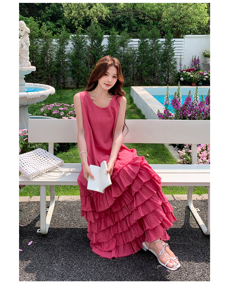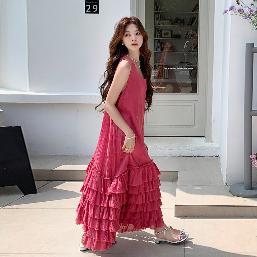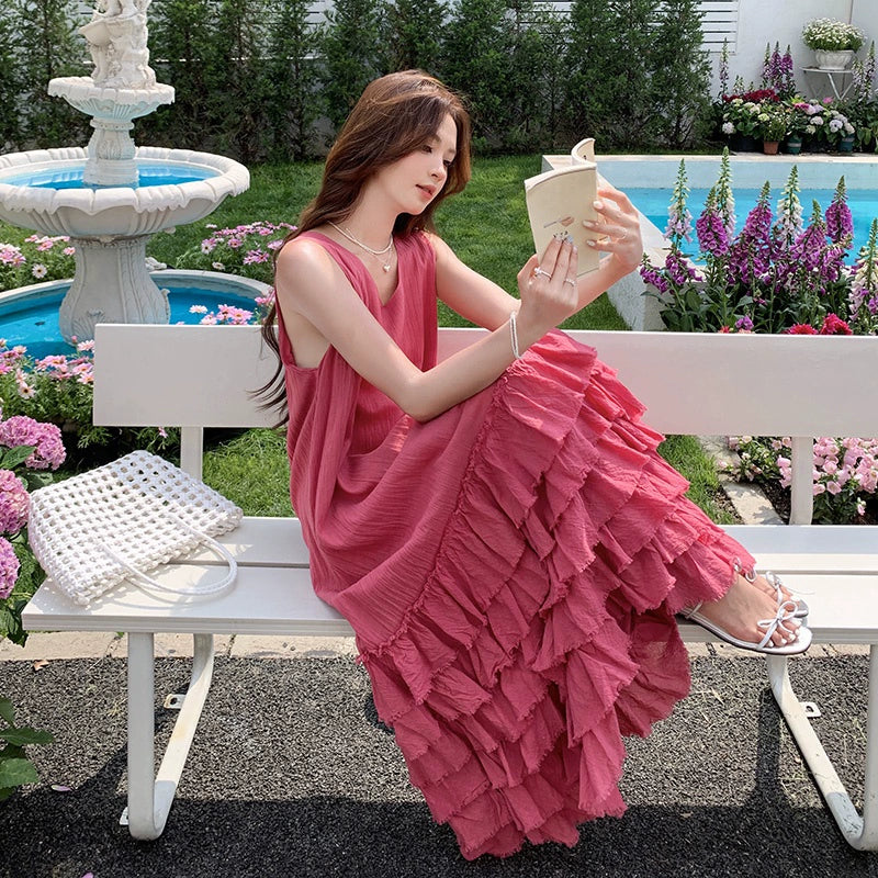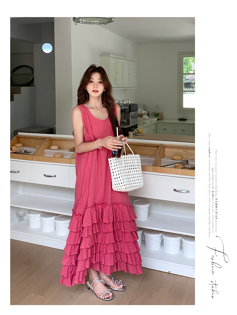 【ワンピース】夏 韓国系 気質 ケーキスカート フィリピンピンク ノースリーブ ワンピース