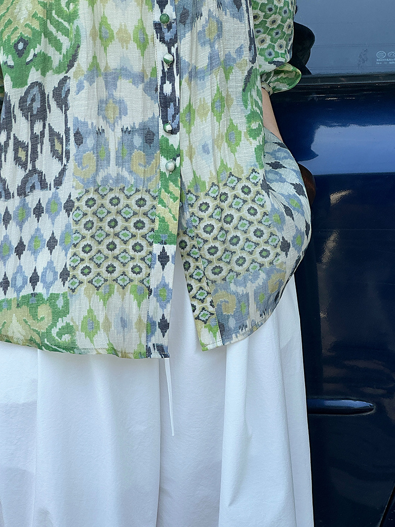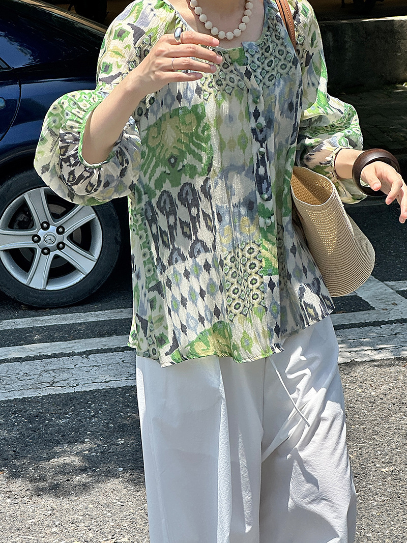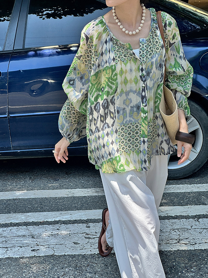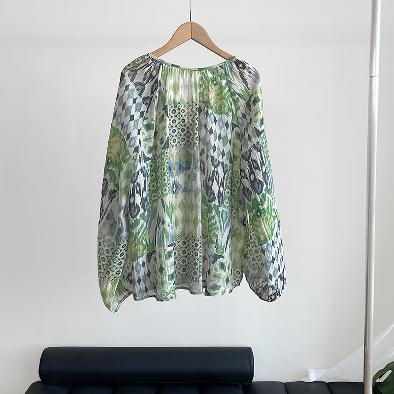 【商品名】【トップス】真夏の復古 グリーン油絵 ランタン袖 UVカットシャツ【JZシリーズ】【SHシリーズ】