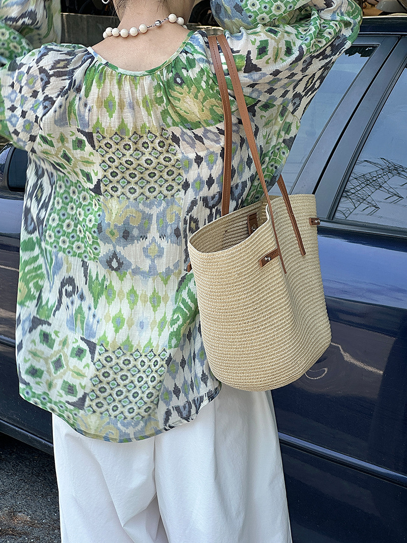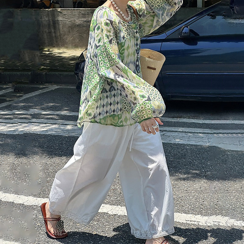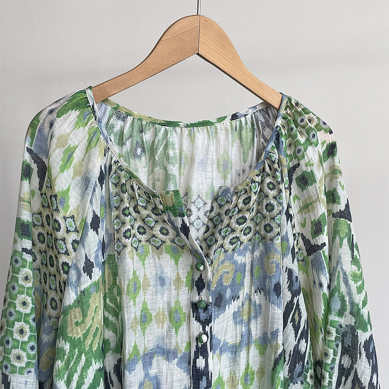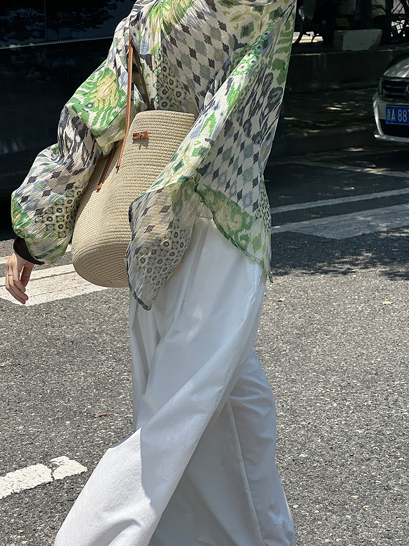 【商品名】【トップス】真夏の復古 グリーン油絵 ランタン袖 UVカットシャツ【JZシリーズ】【SHシリーズ】