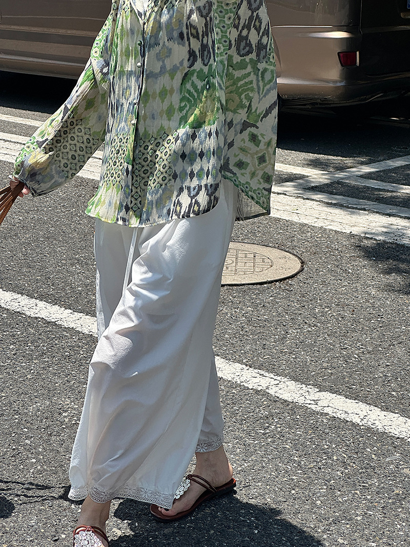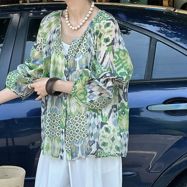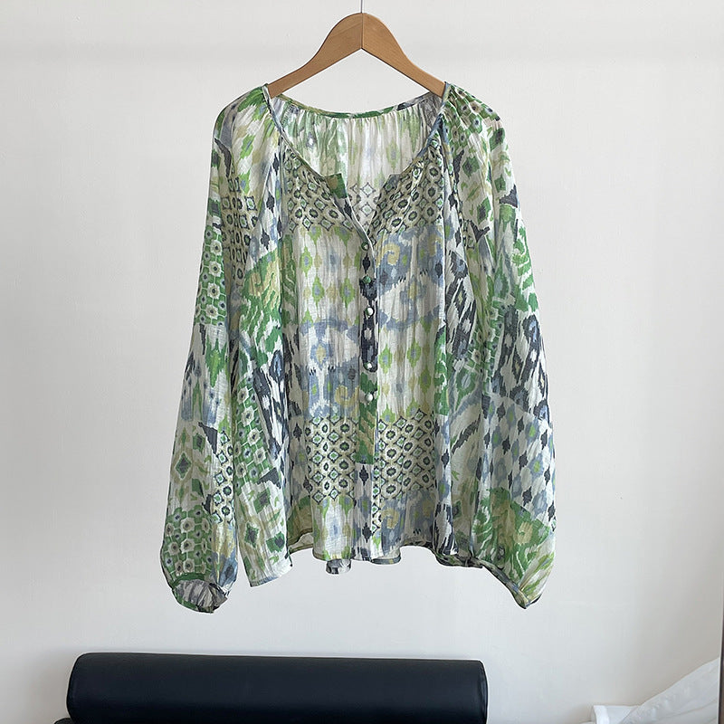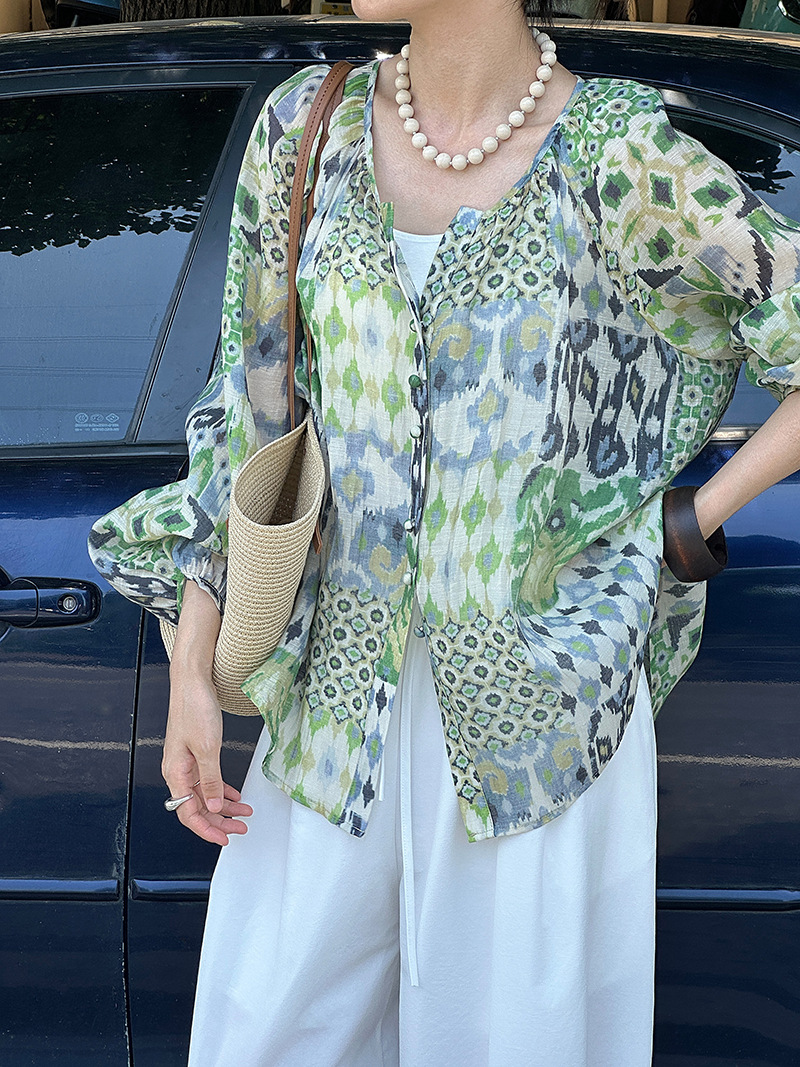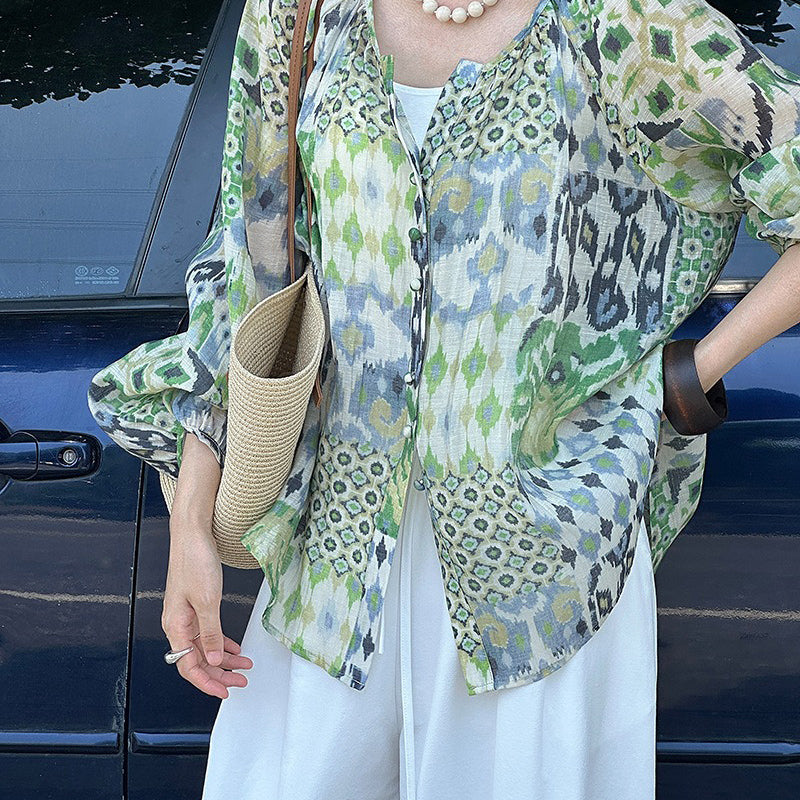 【トップス】真夏の復古 グリーン油絵 ランタン袖 UVカットシャツ【JZシリーズ】【SHシリーズ】