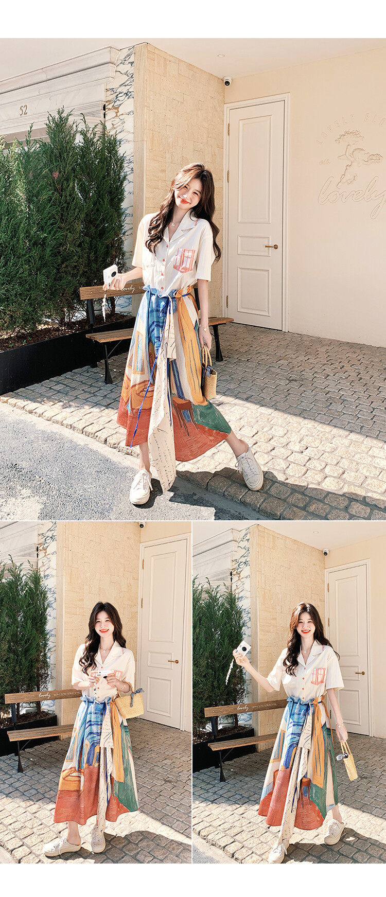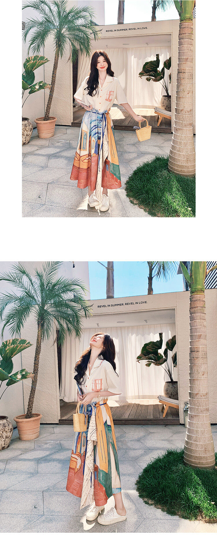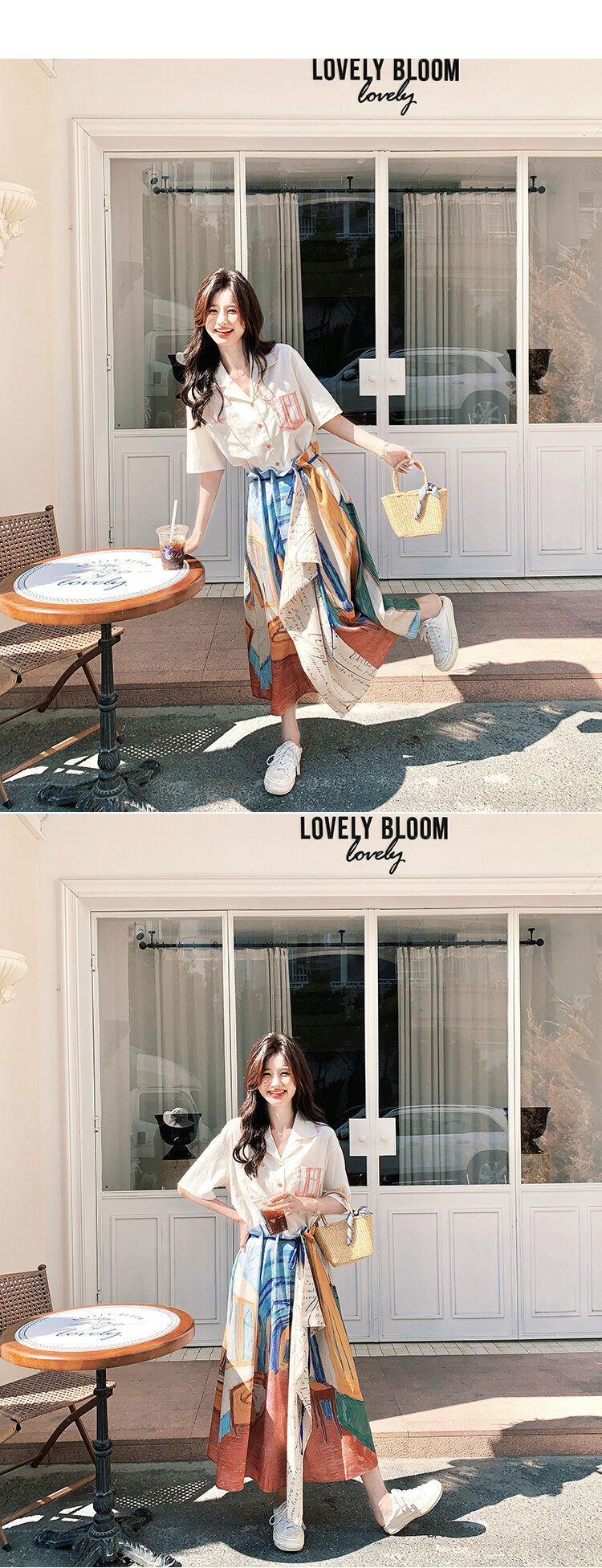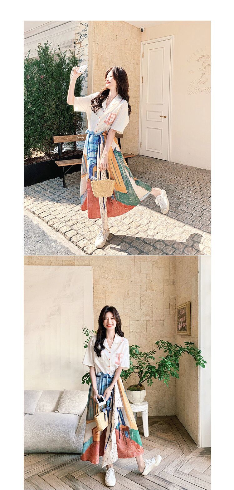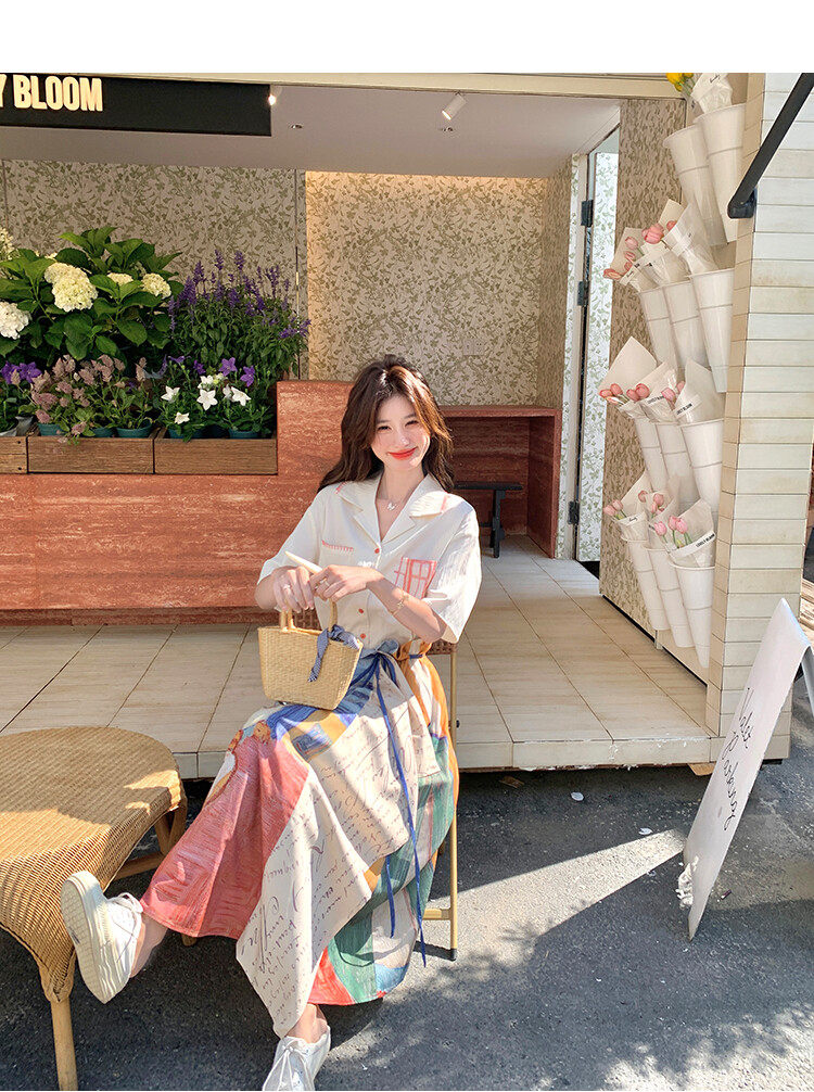 2点セット!【セットアップ】夏 ルーツ感のあるシャツ+油絵プリント ミディスカート 上下セット【SHシリーズ】