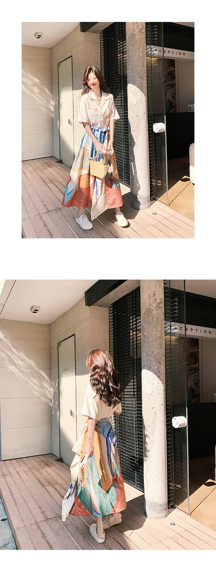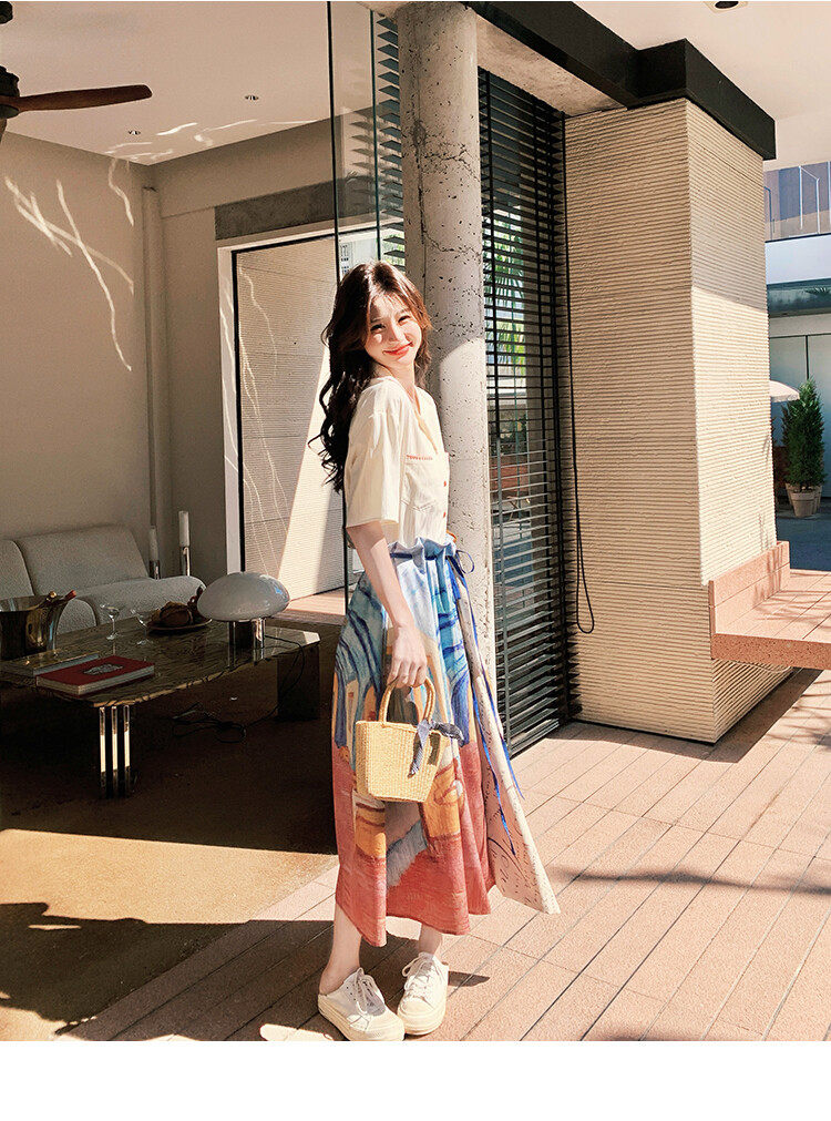 【商品名】2点セット!【ボトムス】夏 ルーツ感のあるシャツ+油絵プリント ミディスカート 2点セット【SHシリーズ】