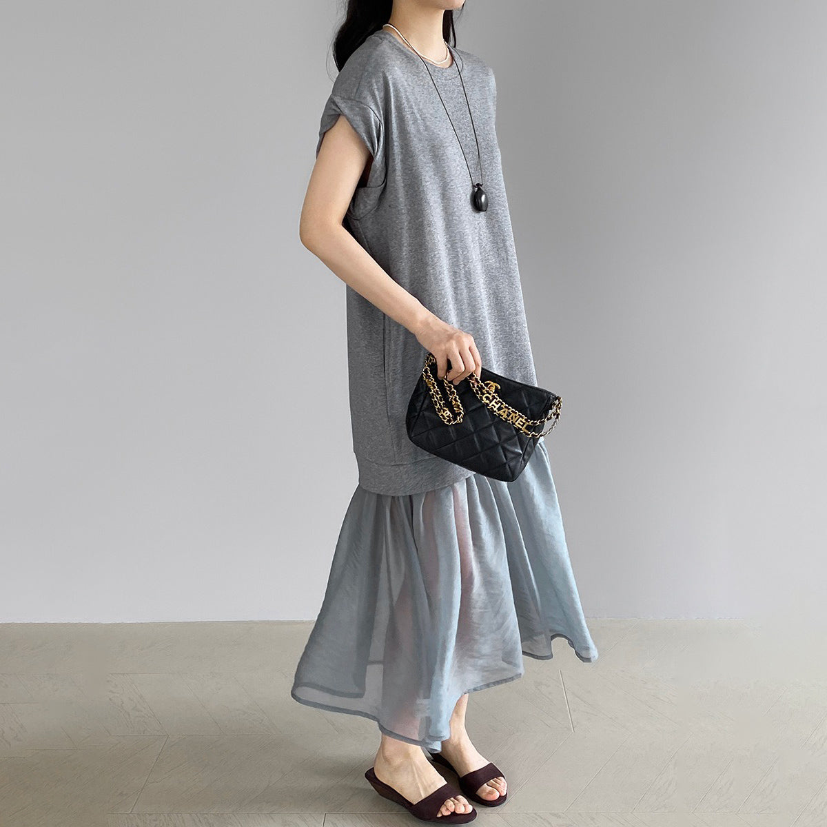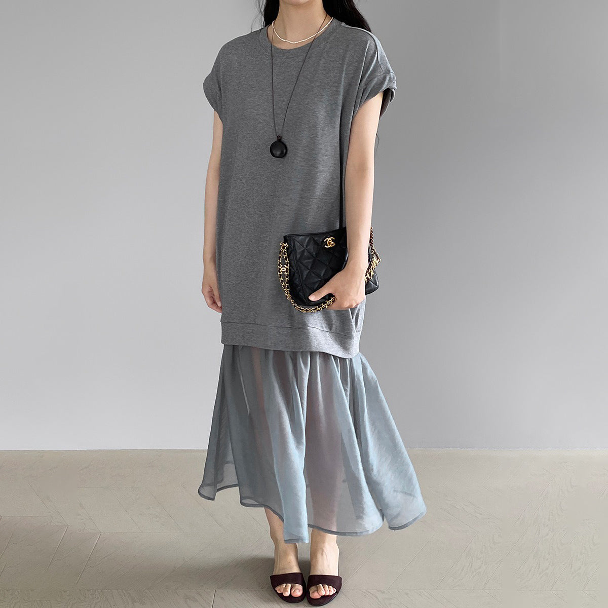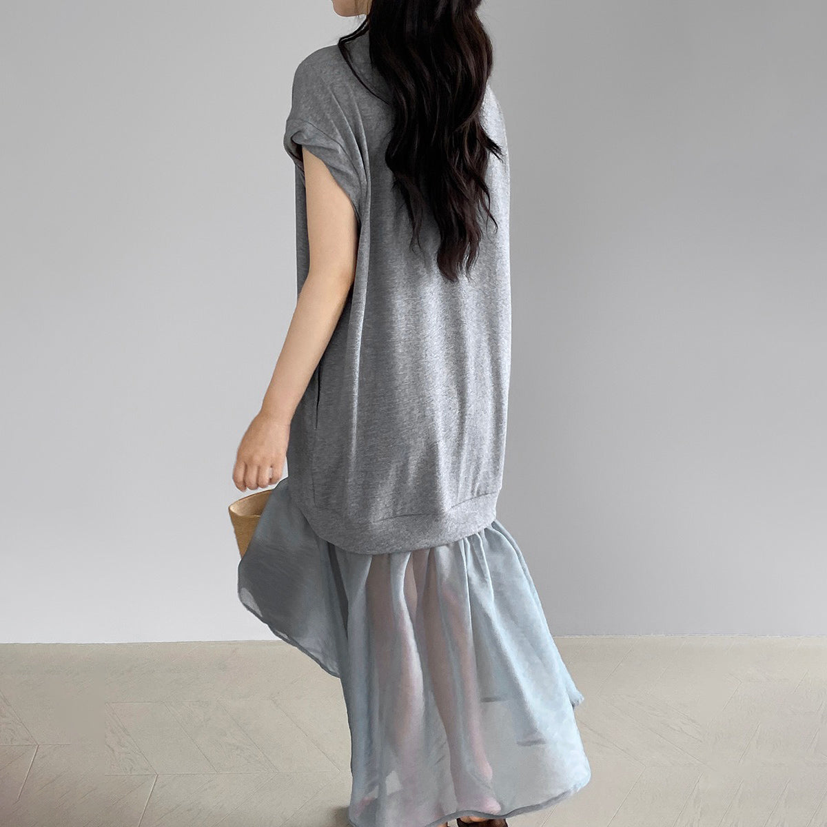 【ワンピース】カジュアル 夏 高級感 韓国風 フェイクツーイン ゆったり半袖Tシャツワンピース【JZシリーズ】