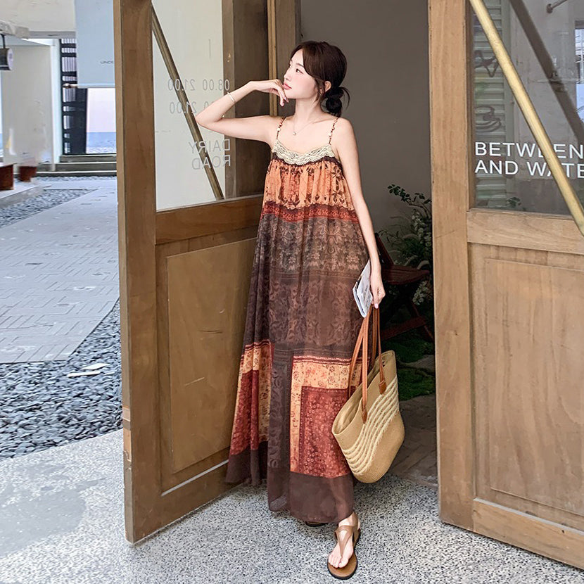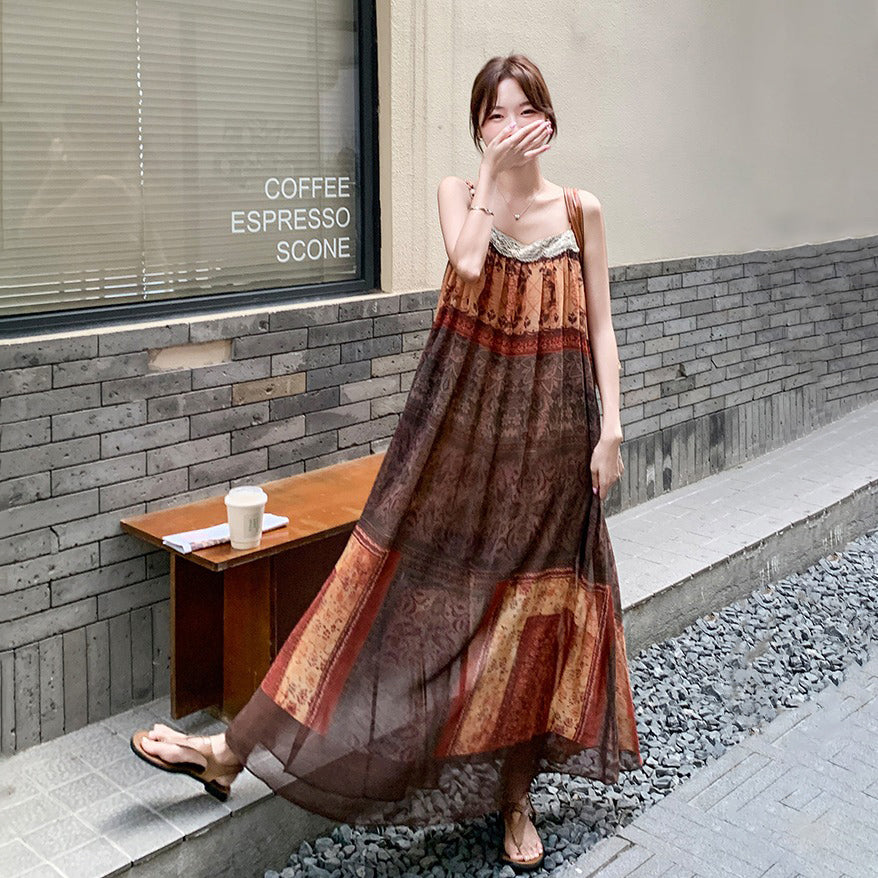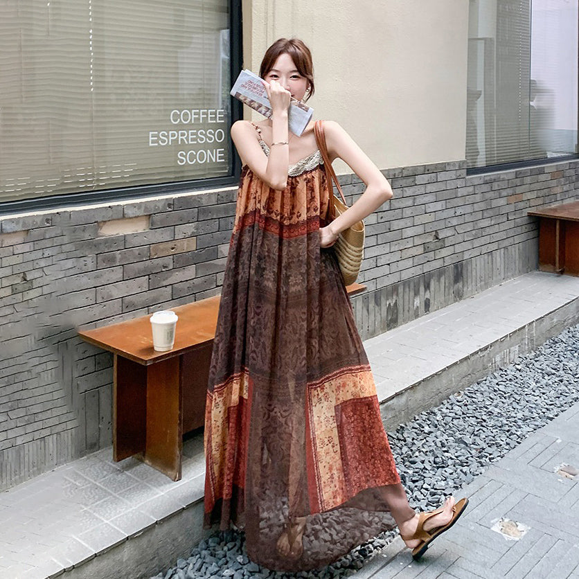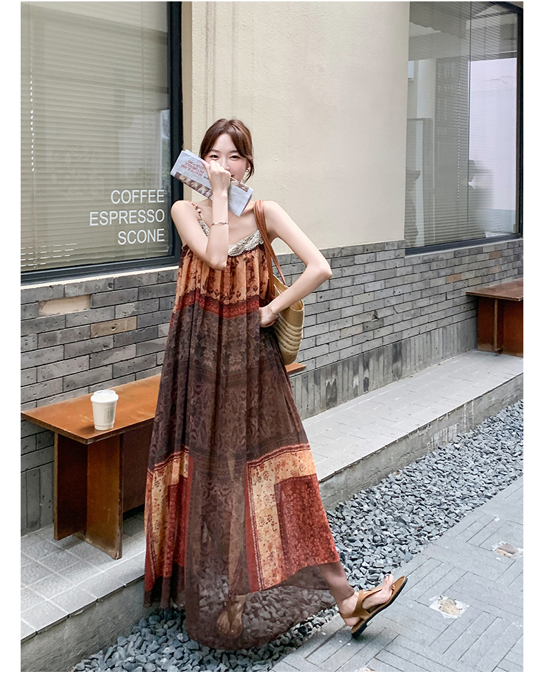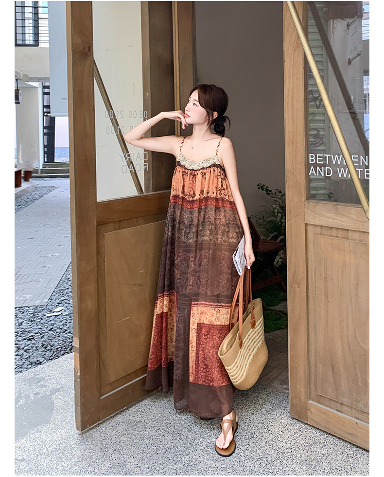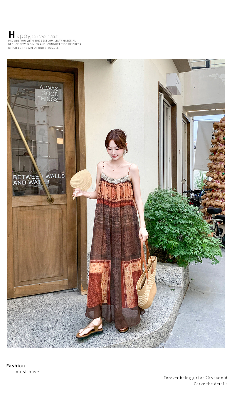 【ワンピース】フレンチ民族風 リゾート 色分けプリント ノースリーブキャミソールワンピース【SHシリーズ】