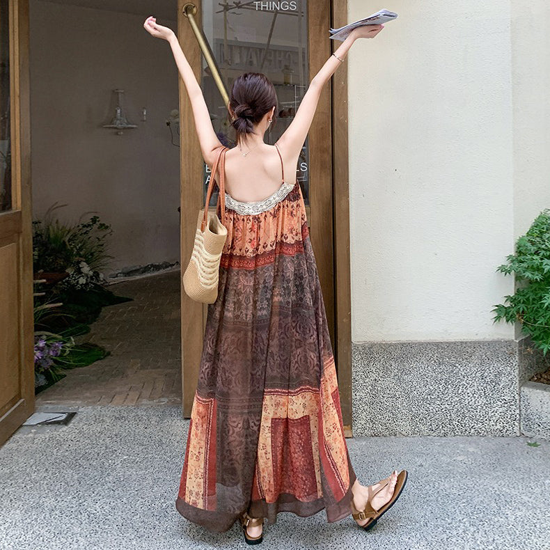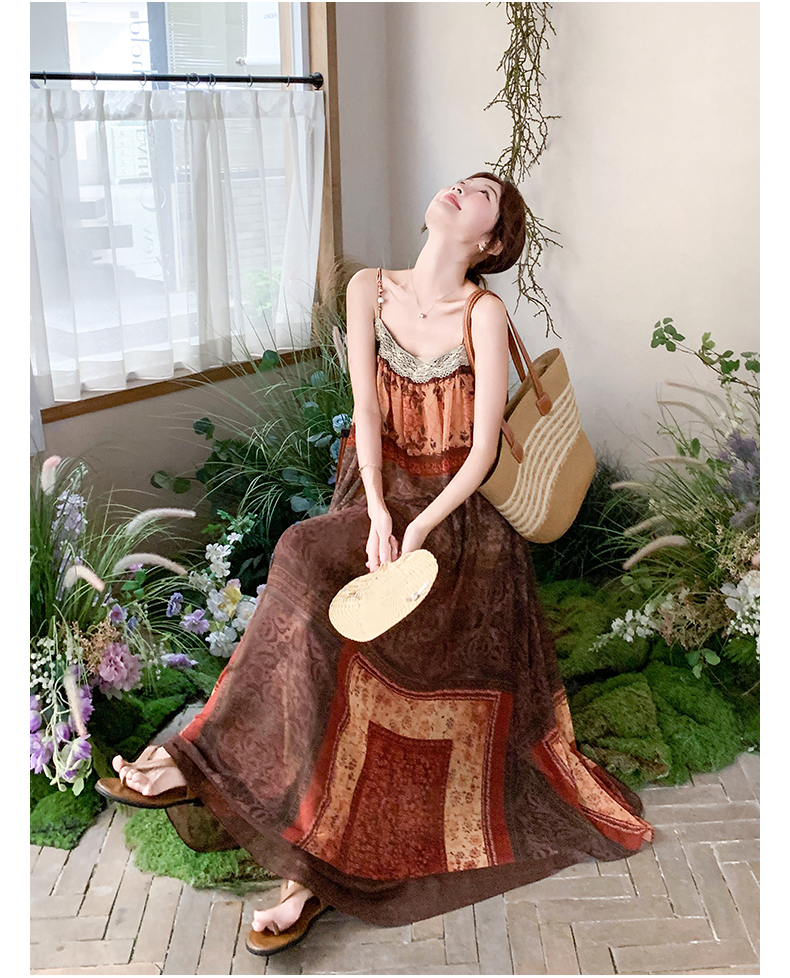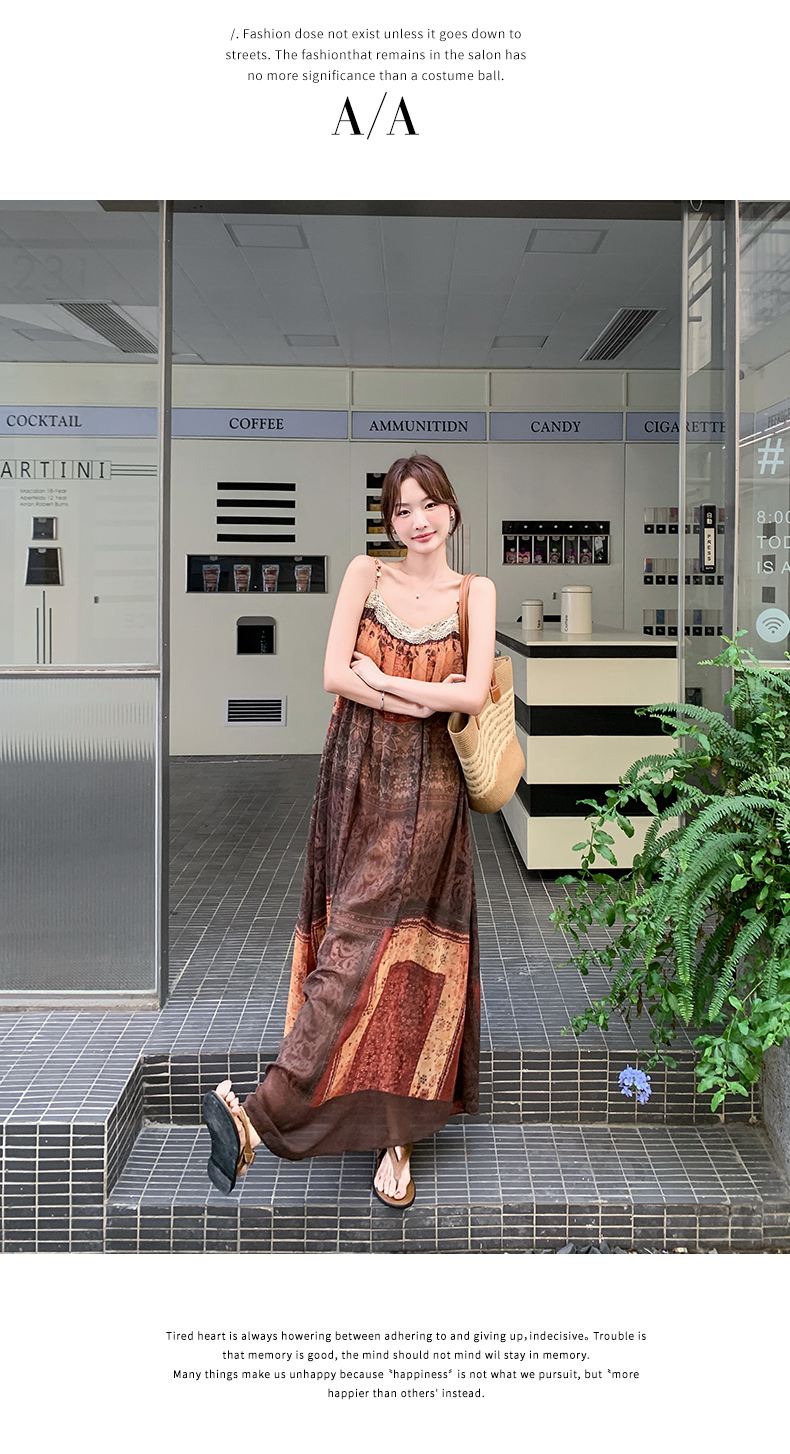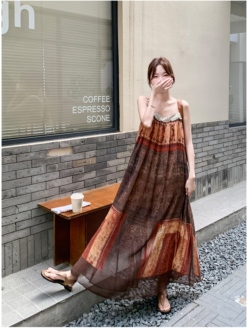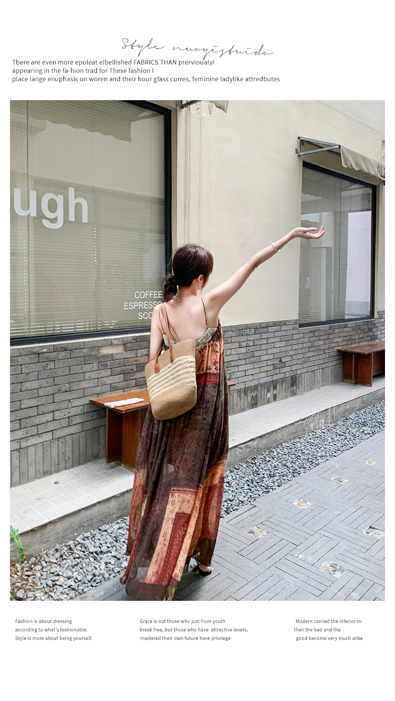 【ワンピース】フレンチ民族風 リゾート 色分けプリント ノースリーブキャミソールワンピース【SHシリーズ】