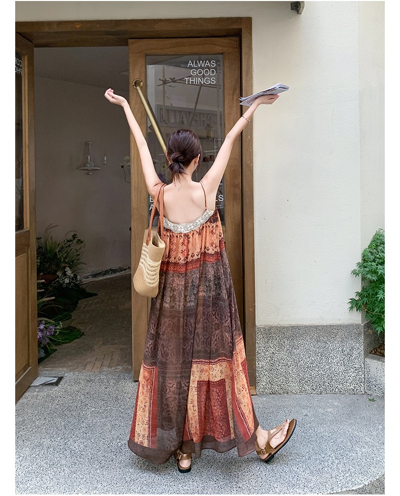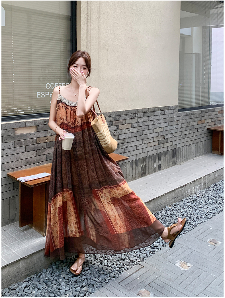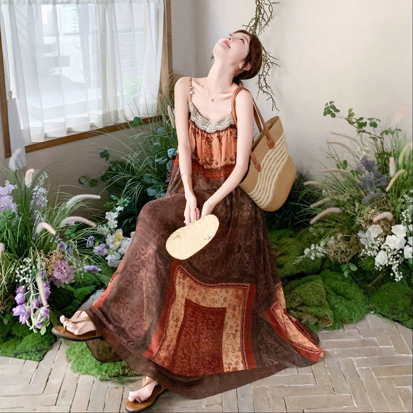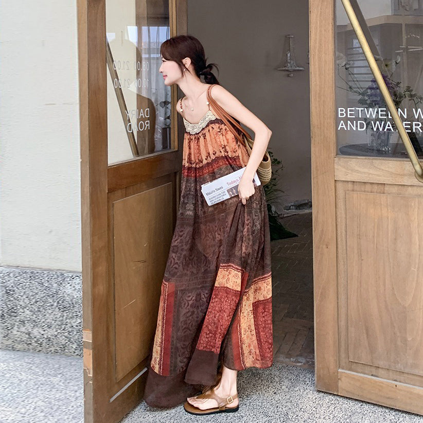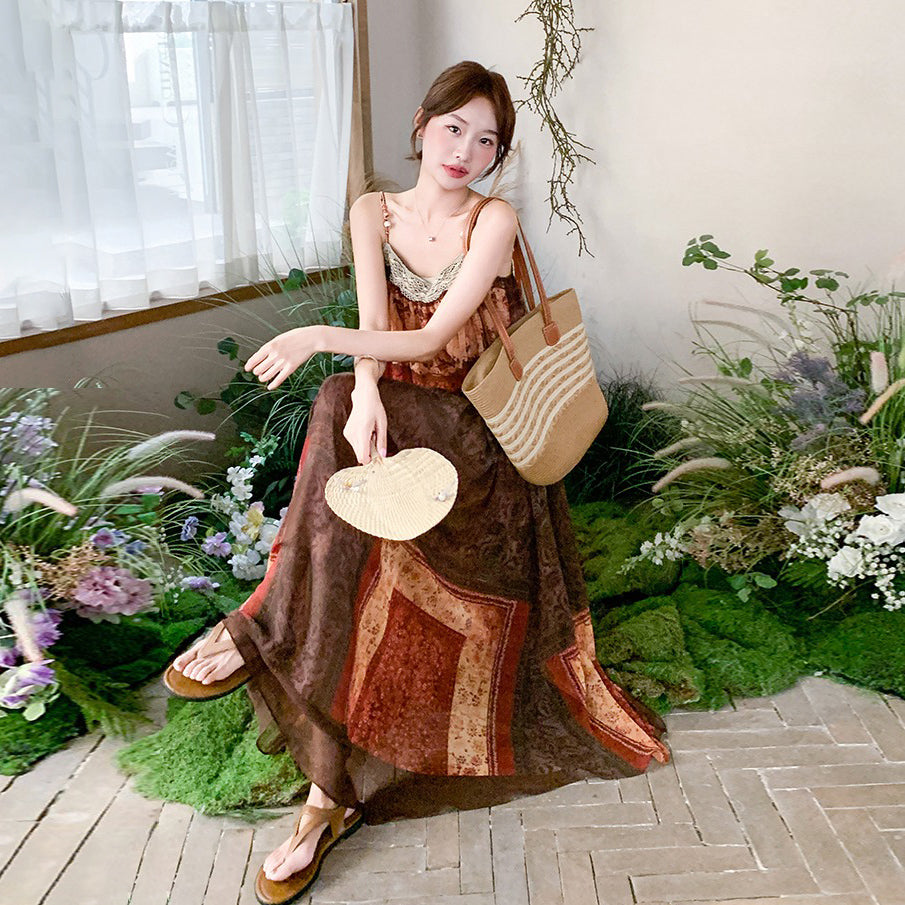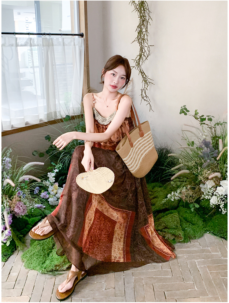 【ワンピース】フレンチ民族風 リゾート 色分けプリント ノースリーブキャミソールワンピース【SHシリーズ】