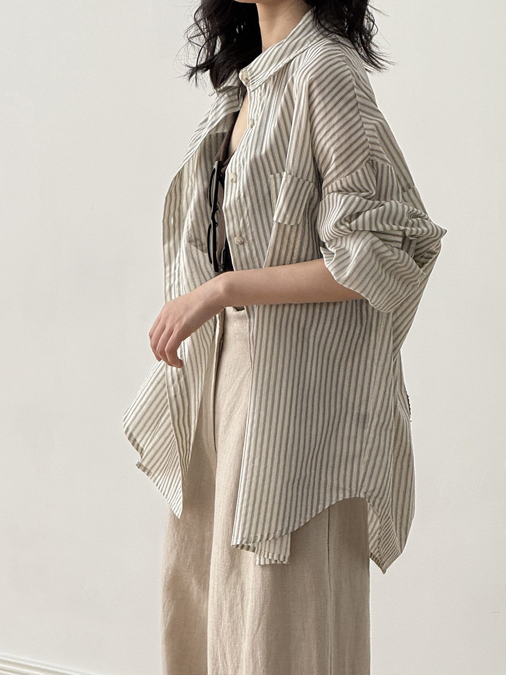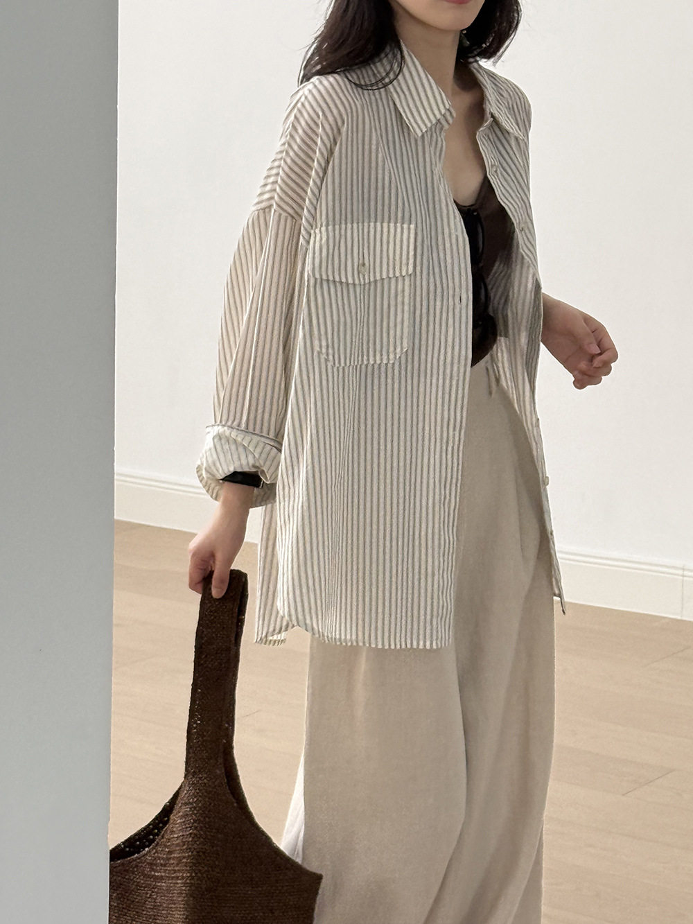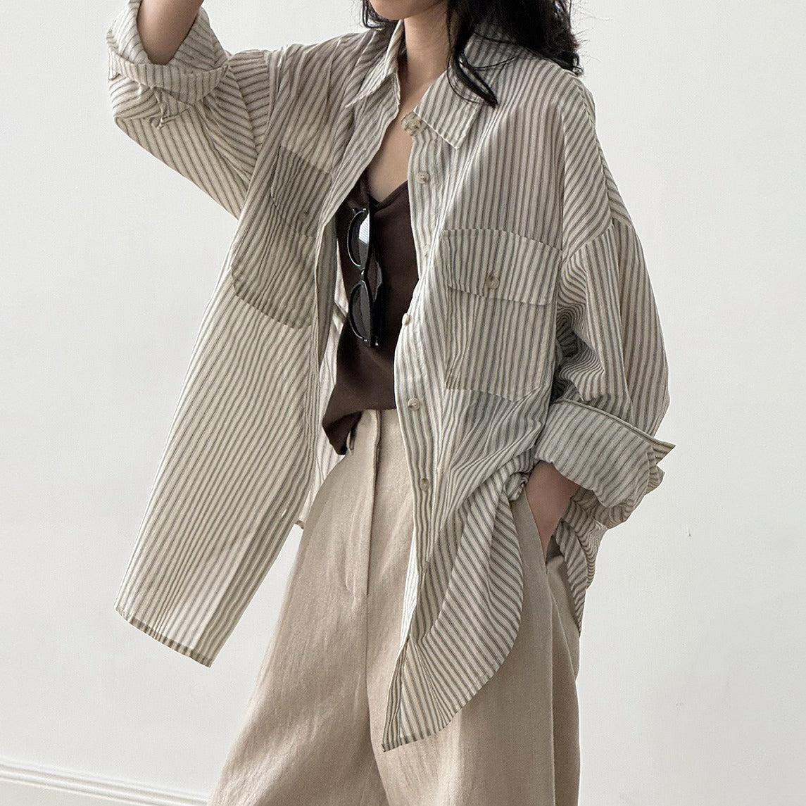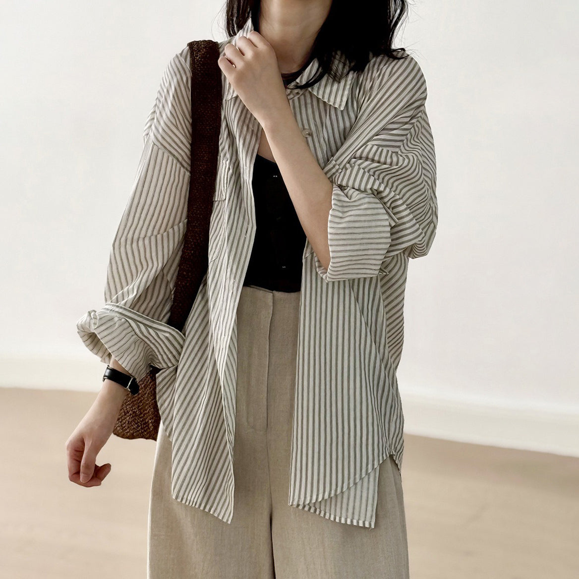 【トップス】カジュアル ヴィンテージ 夏 ゆったり 日焼け防止 ラフなストライプ 長袖シャツ【JZシリーズ】