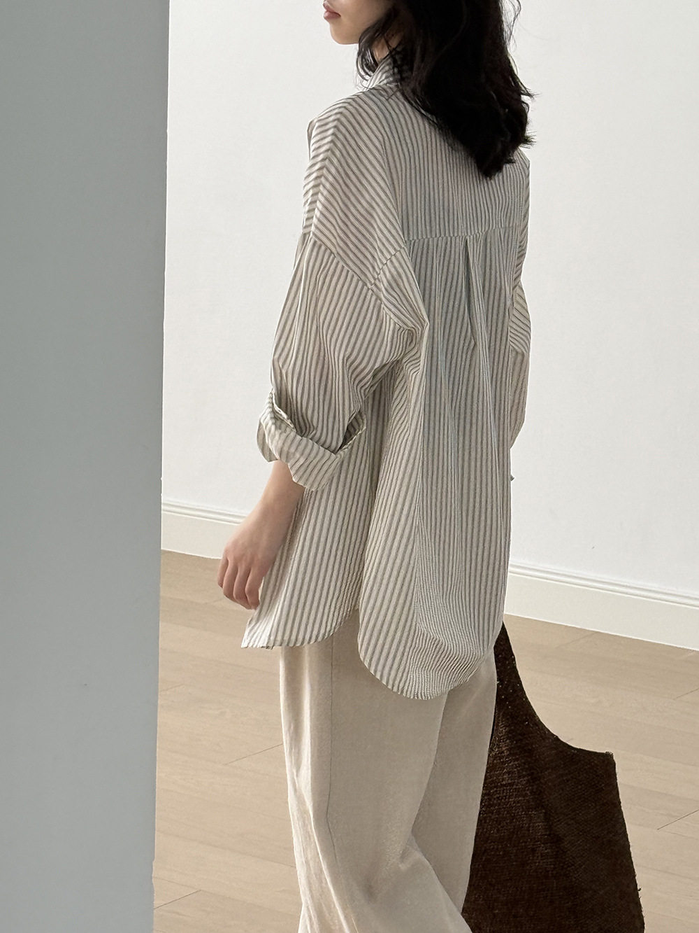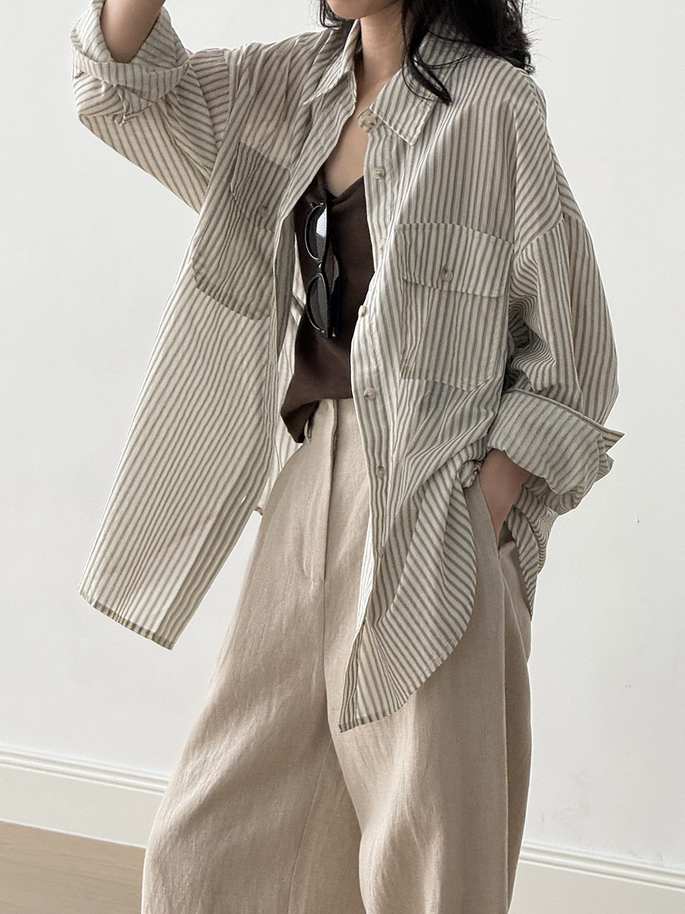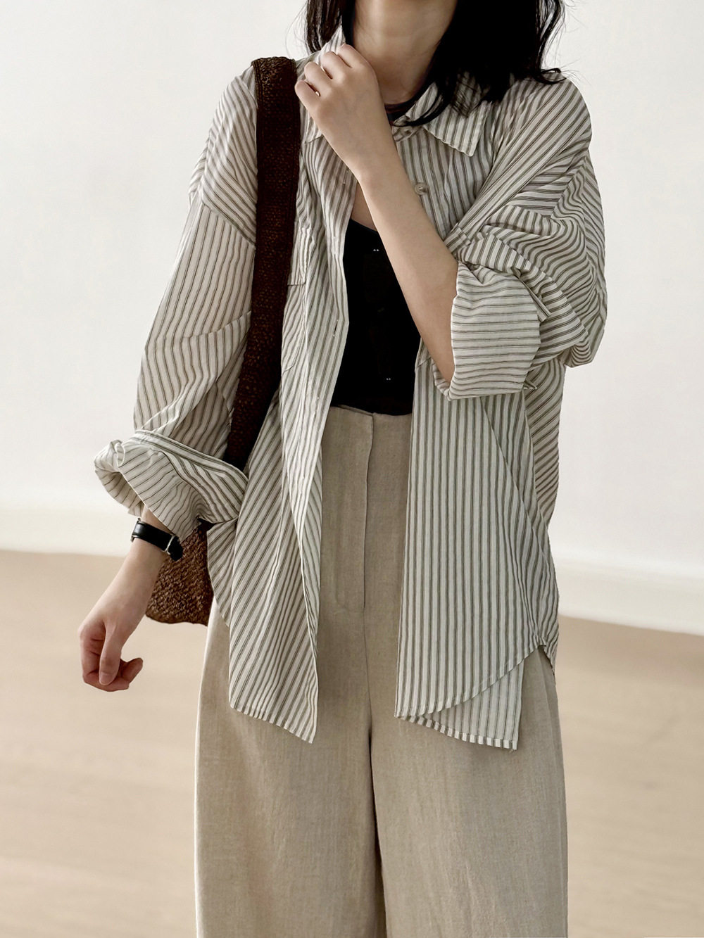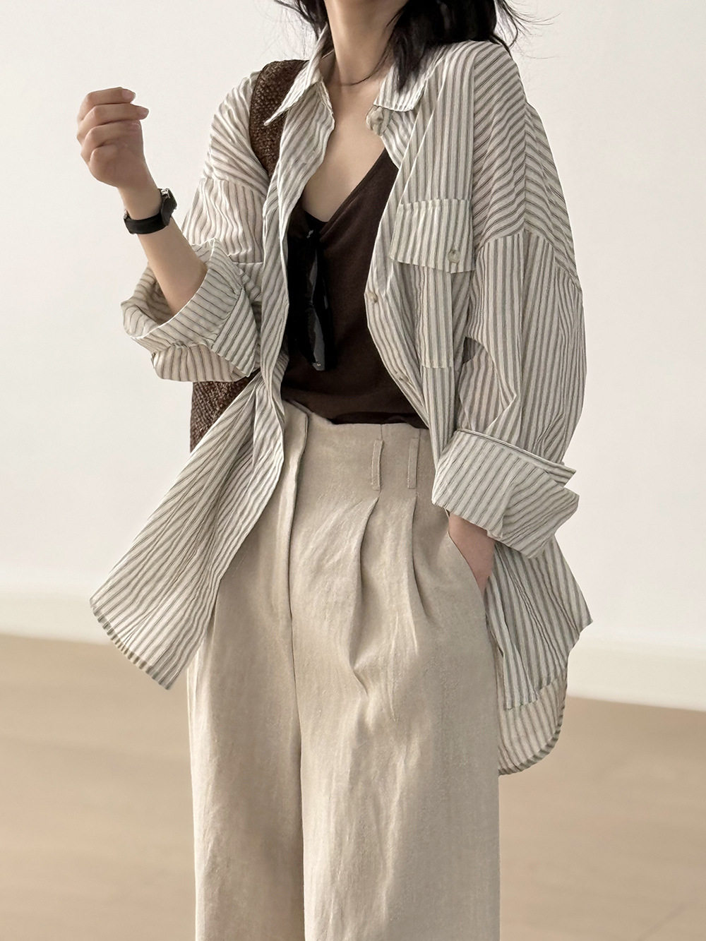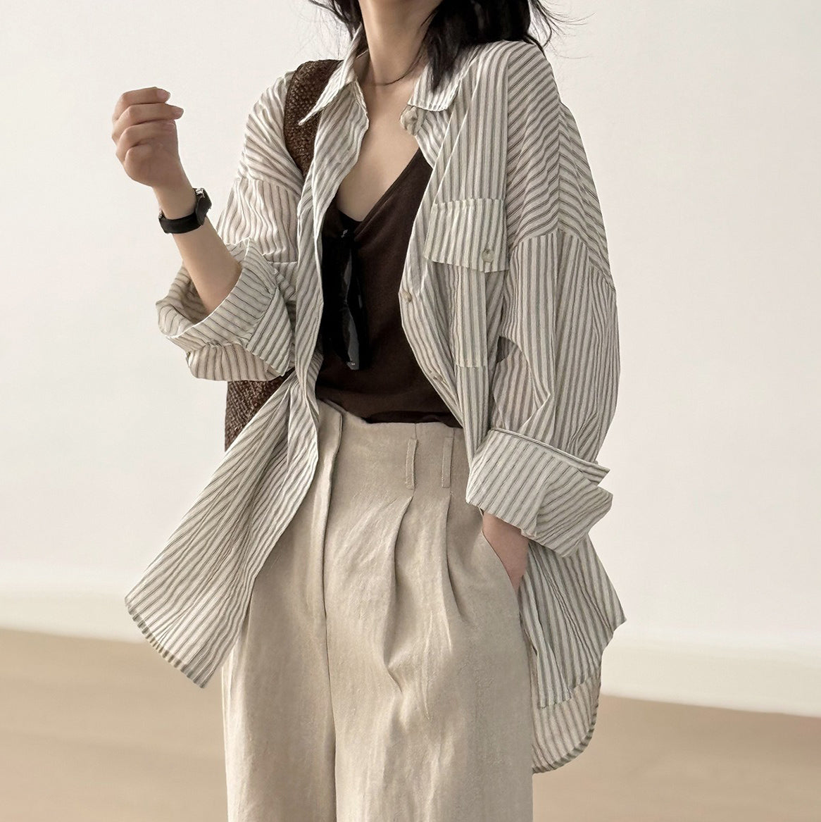 【トップス】カジュアル ヴィンテージ 夏 ゆったり 日焼け防止 ラフなストライプ 長袖シャツ【JZシリーズ】
