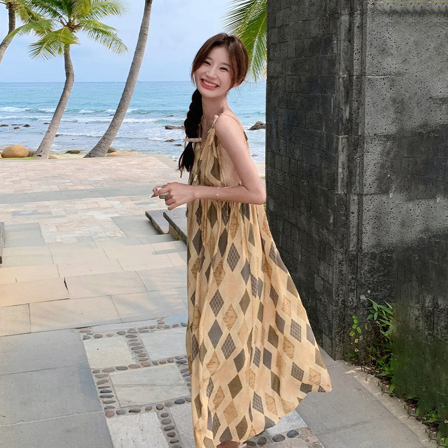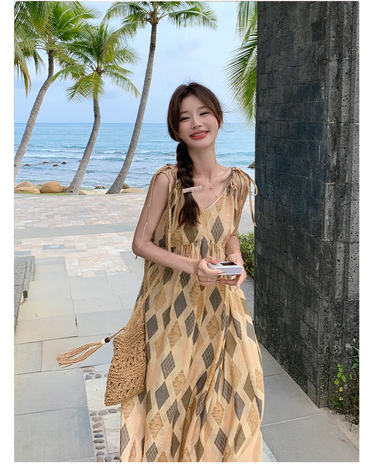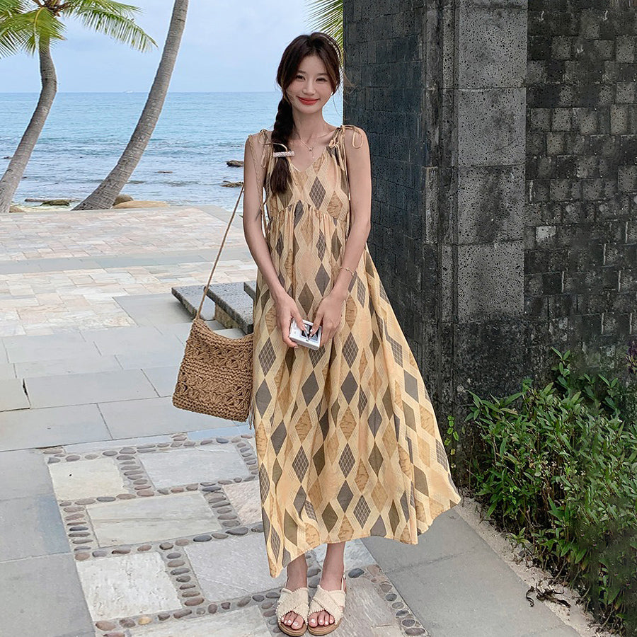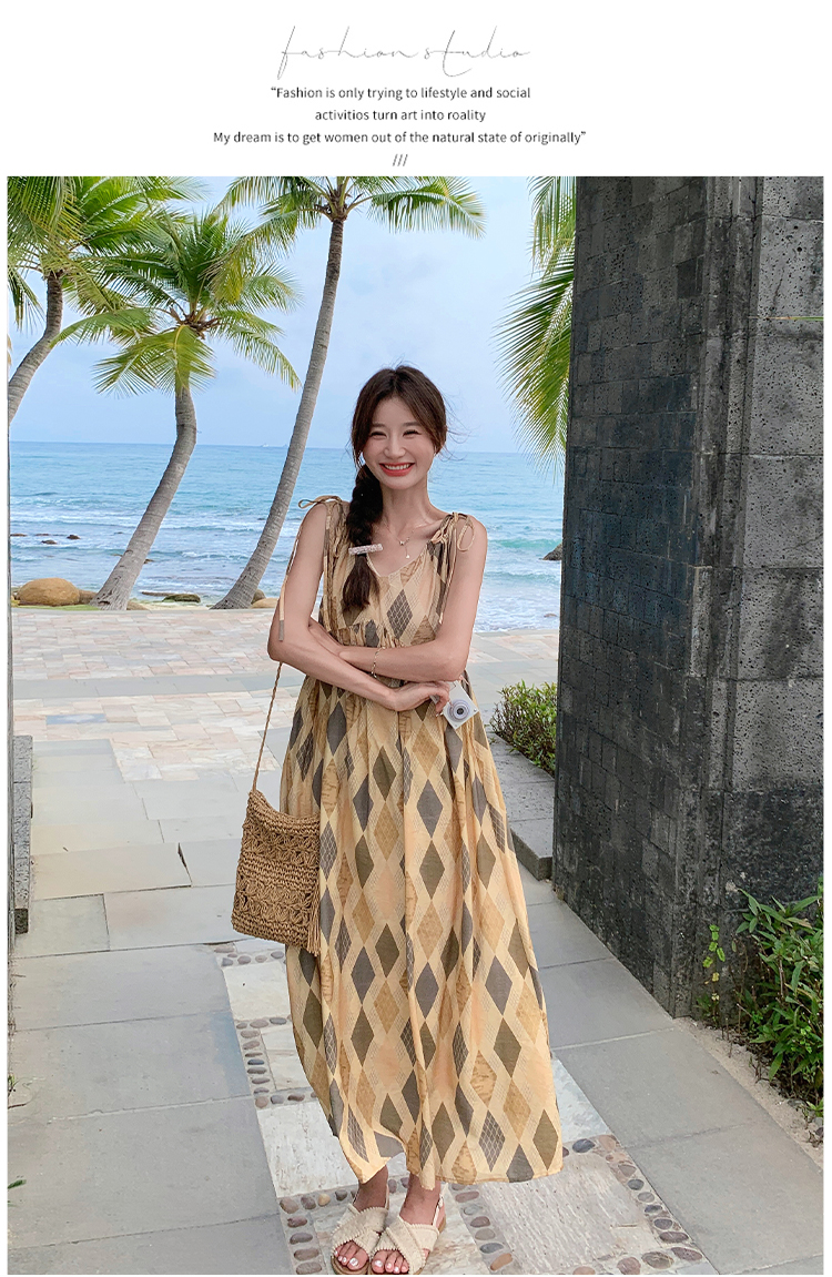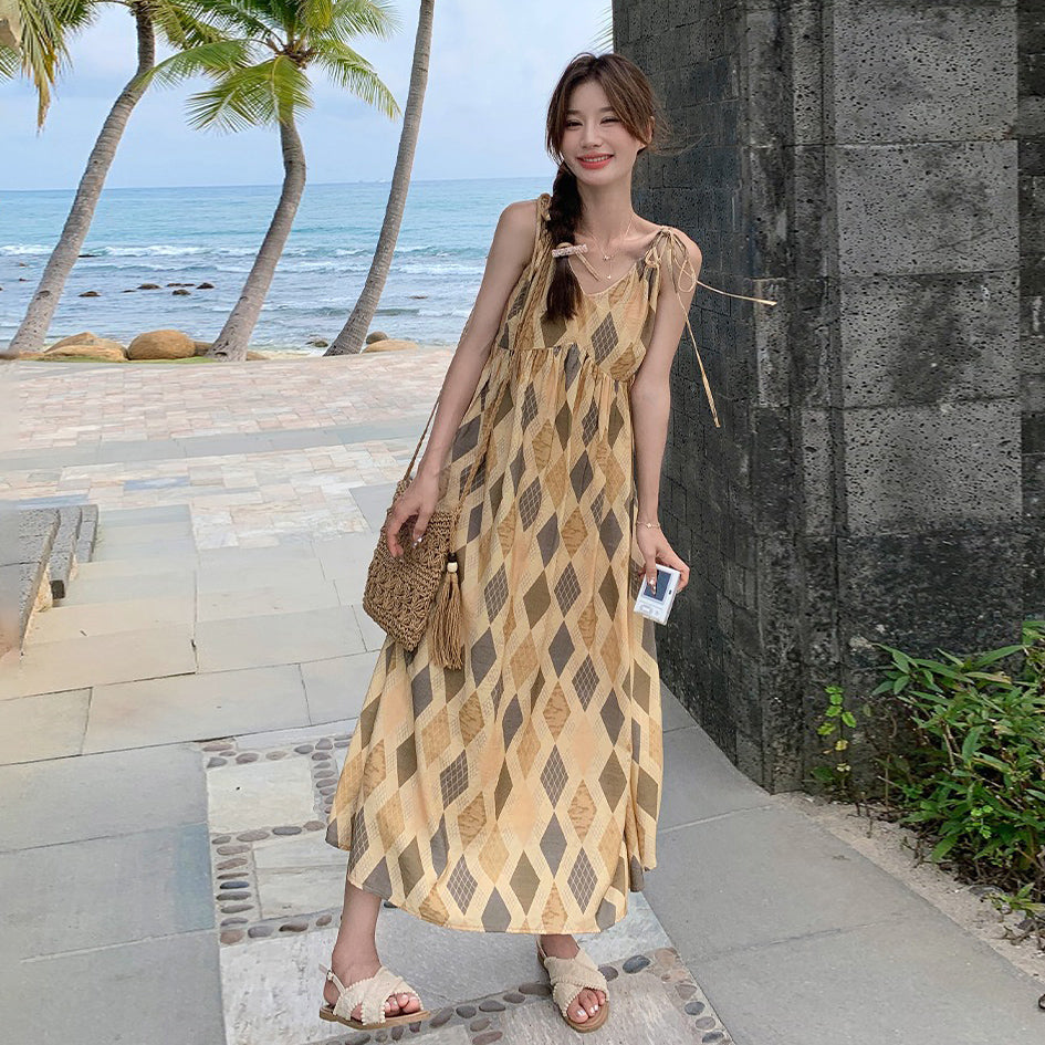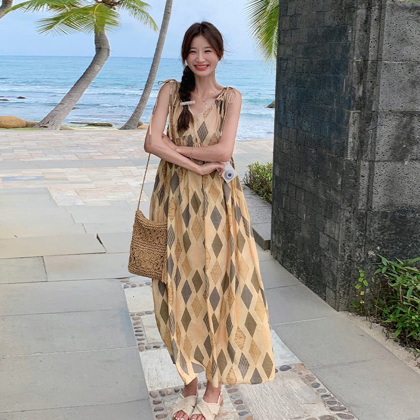 【ワンピース】夏 ビーチリゾート風 ダイヤモンドチェック ノースリーブキャミソールワンピース【SHシリーズ】
