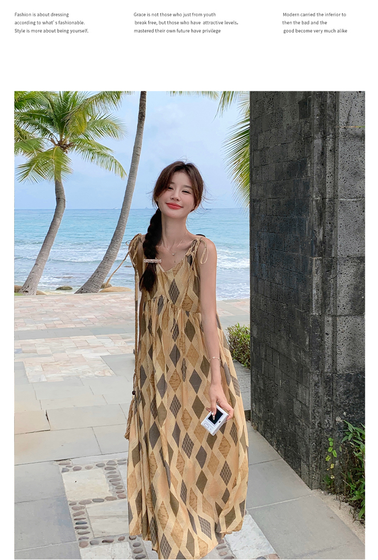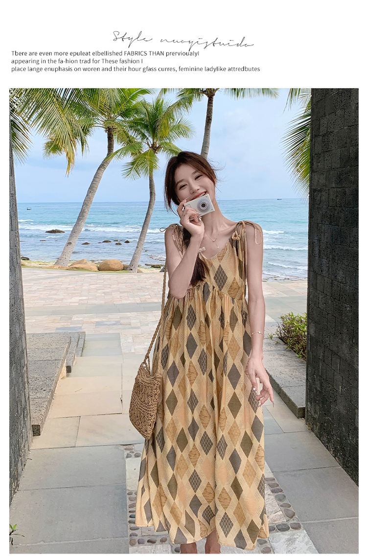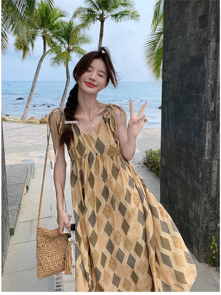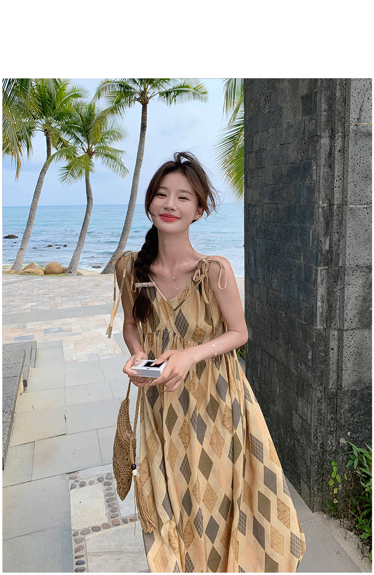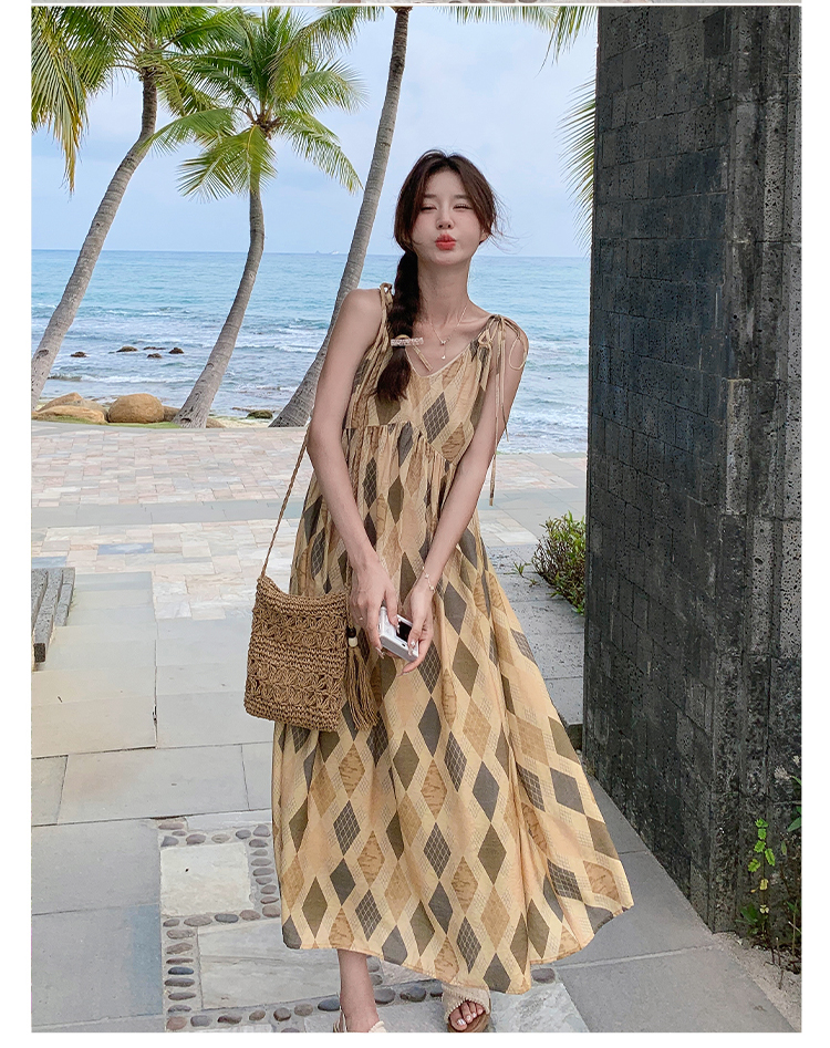【ワンピース】夏 ビーチリゾート風 ダイヤモンドチェック ノースリーブキャミソールワンピース【SHシリーズ】