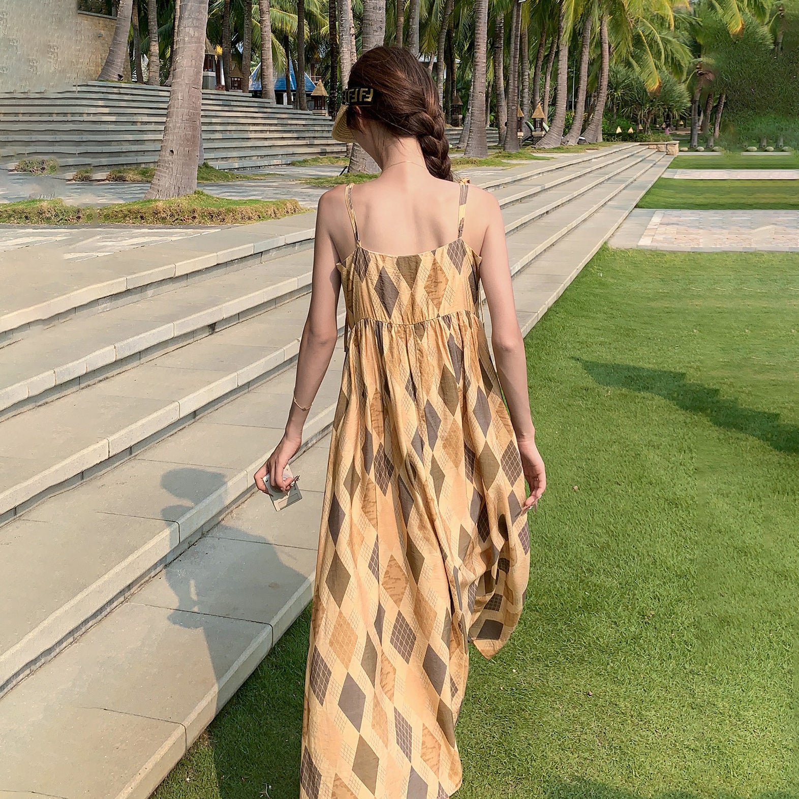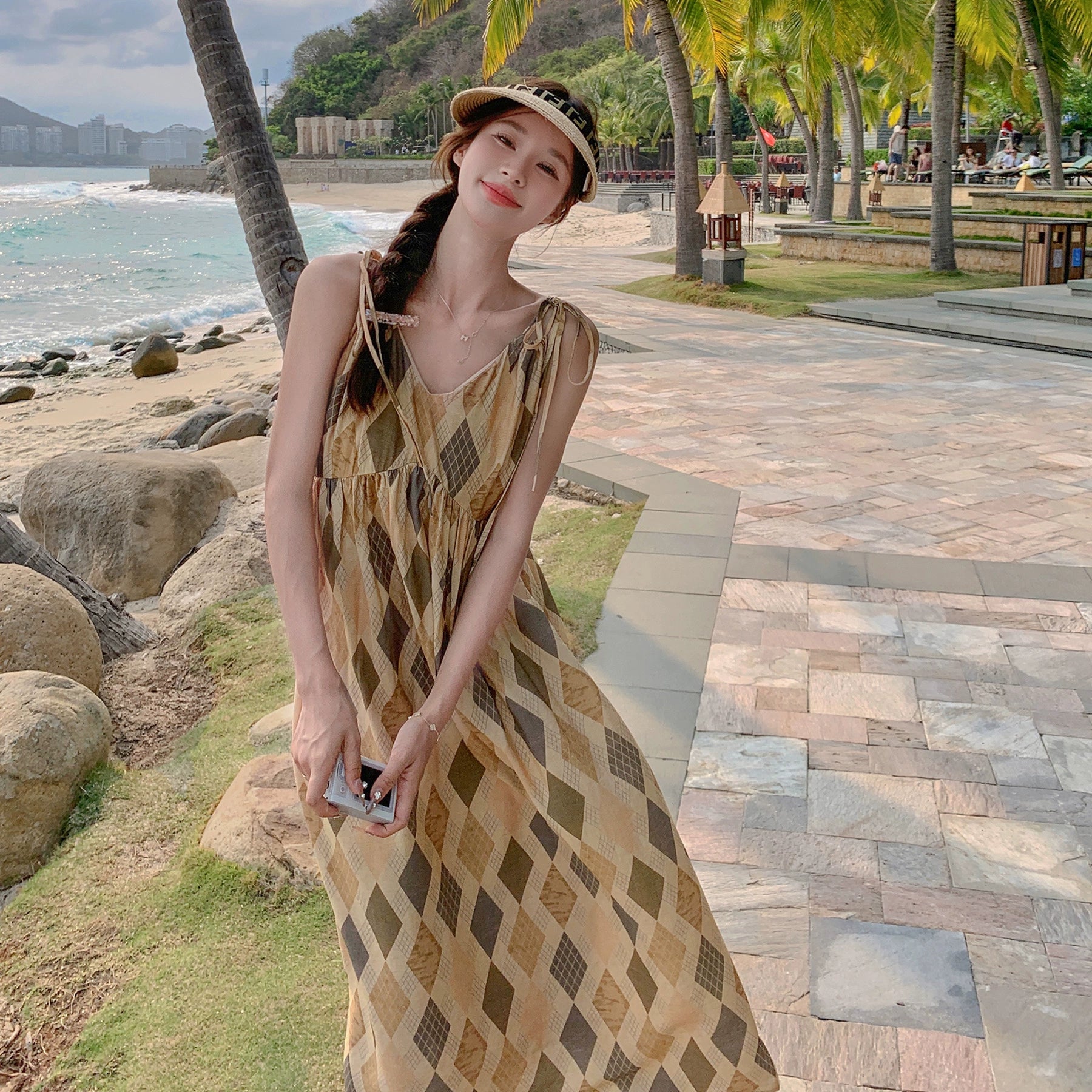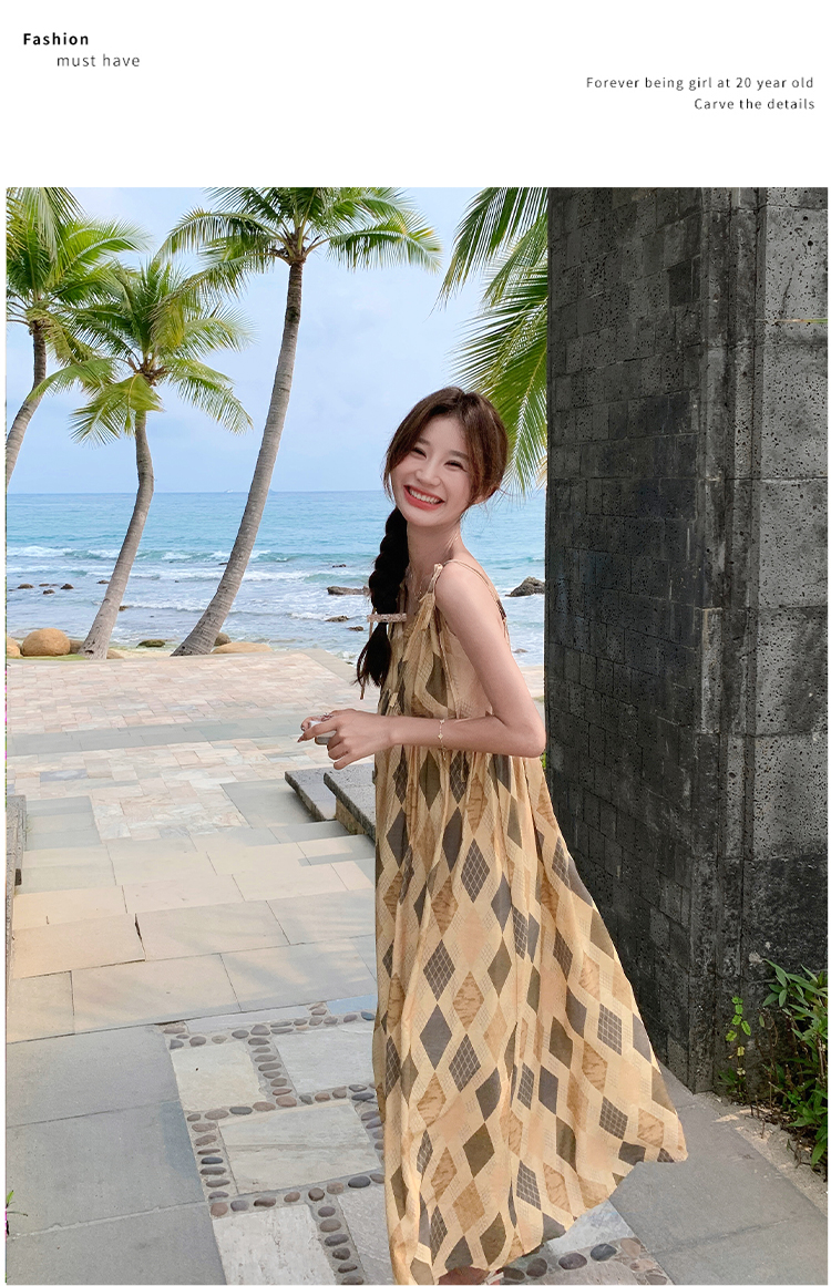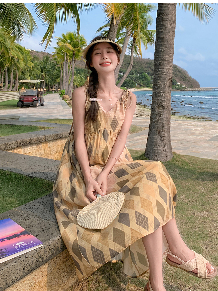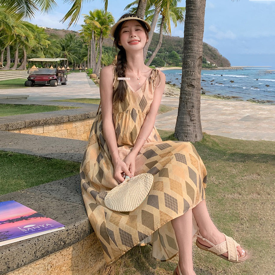 【ワンピース】夏 ビーチリゾート風 ダイヤモンドチェック ノースリーブキャミソールワンピース【SHシリーズ】