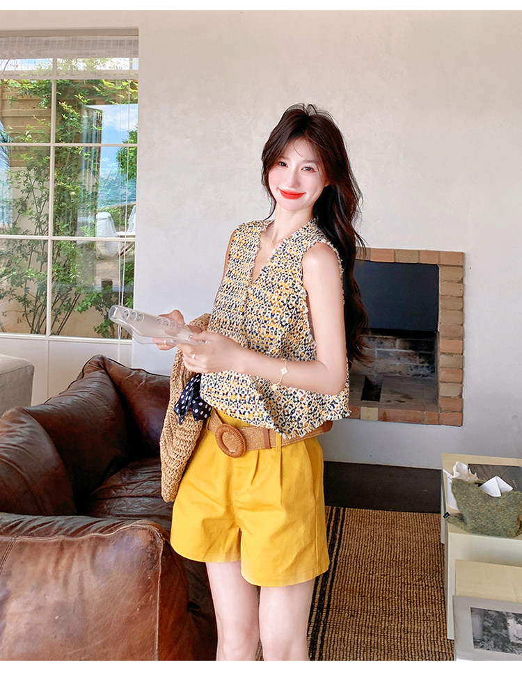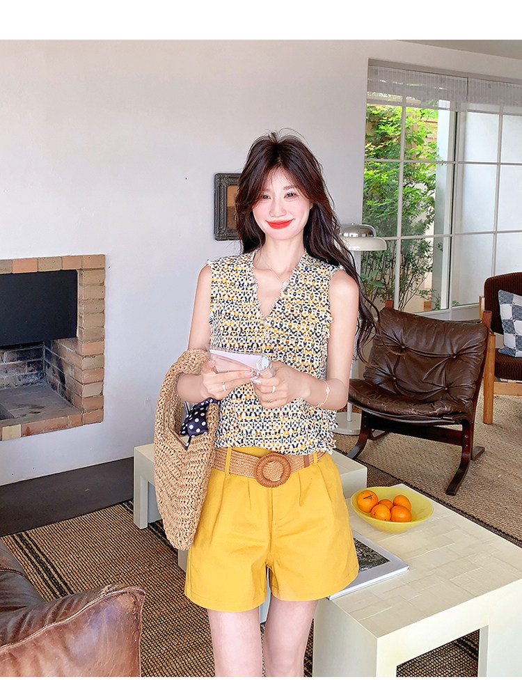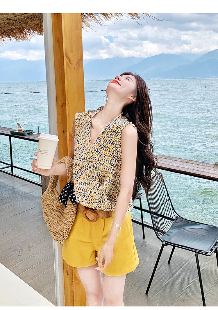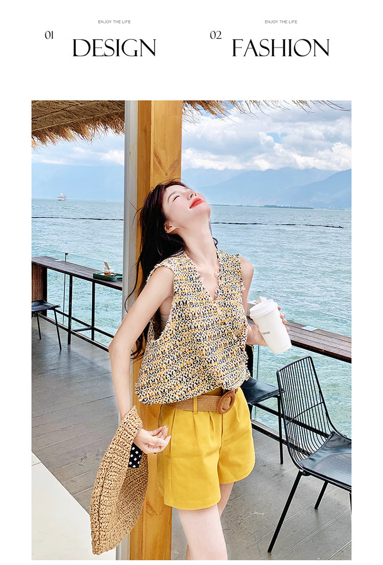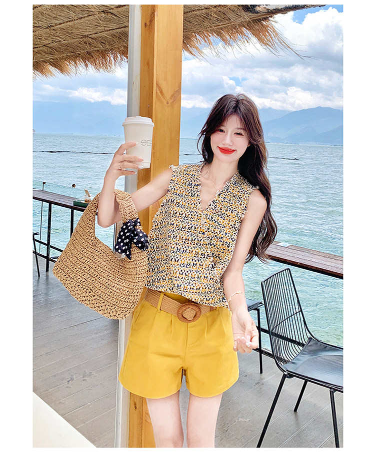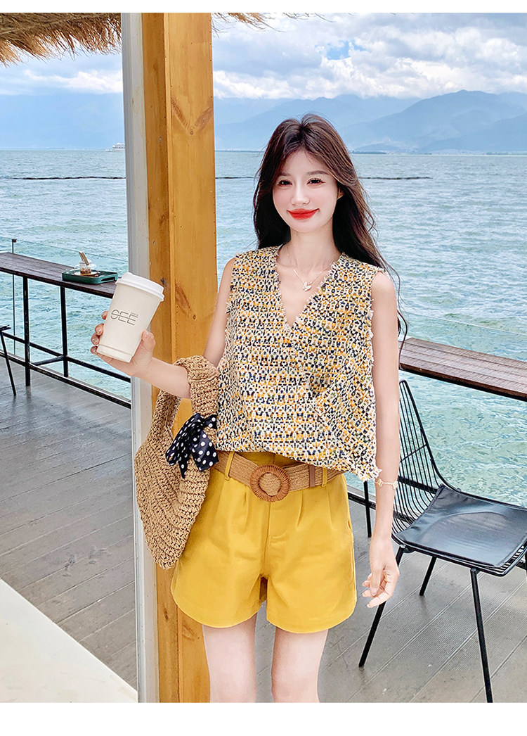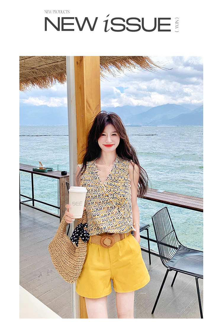 2点セット【セットアップ】ドーパミンコーデ シャネル風 ノースリーブトップス+ショートパンツ 上下セット【SHシリーズ】