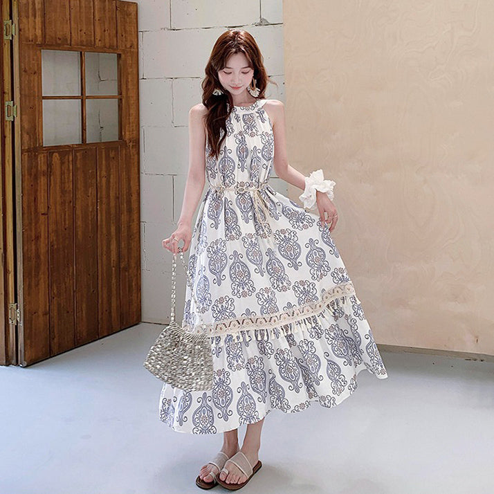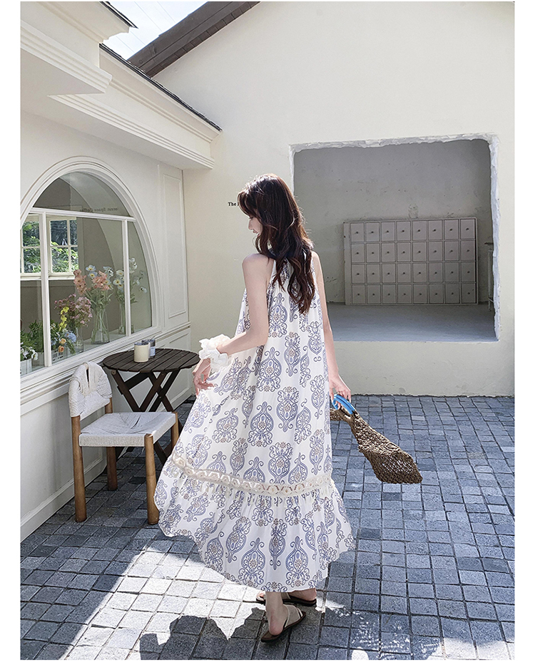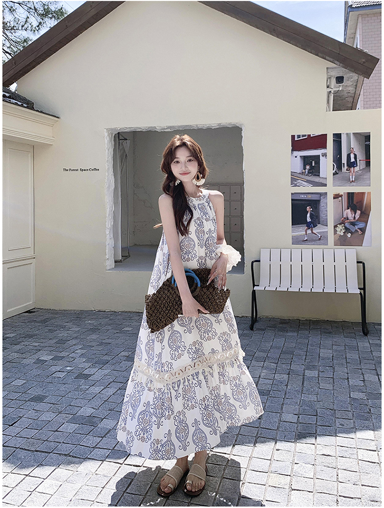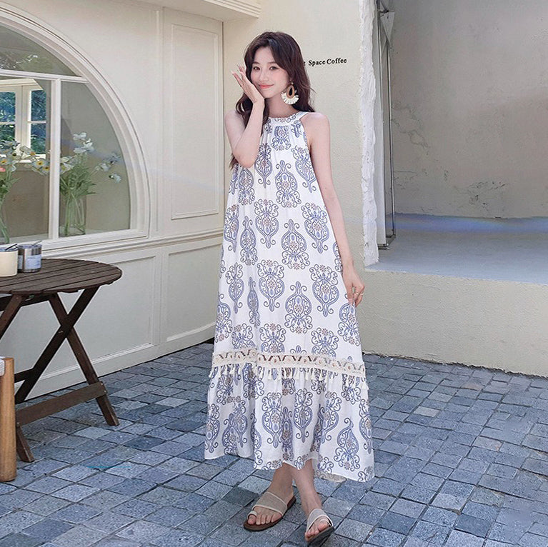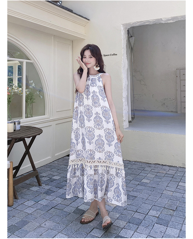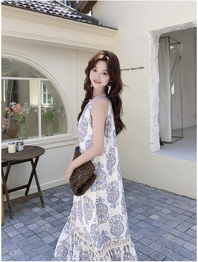 【ワンピース】高級感 青花瓷プリント 夏 刺繍 フリンジ ドレープ ノースリーブワンピース【SHシリーズ】