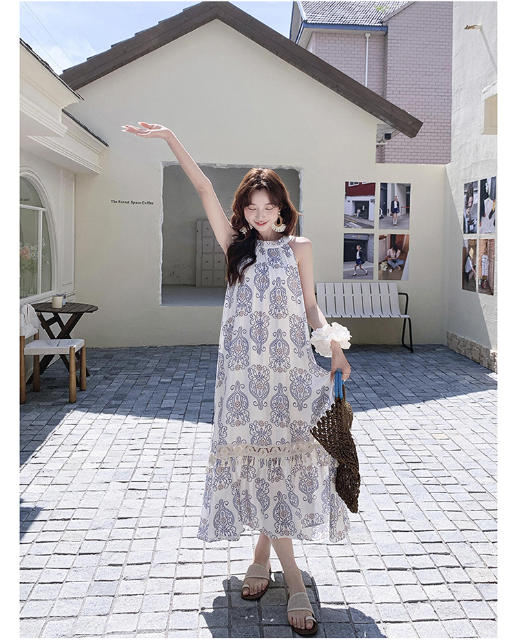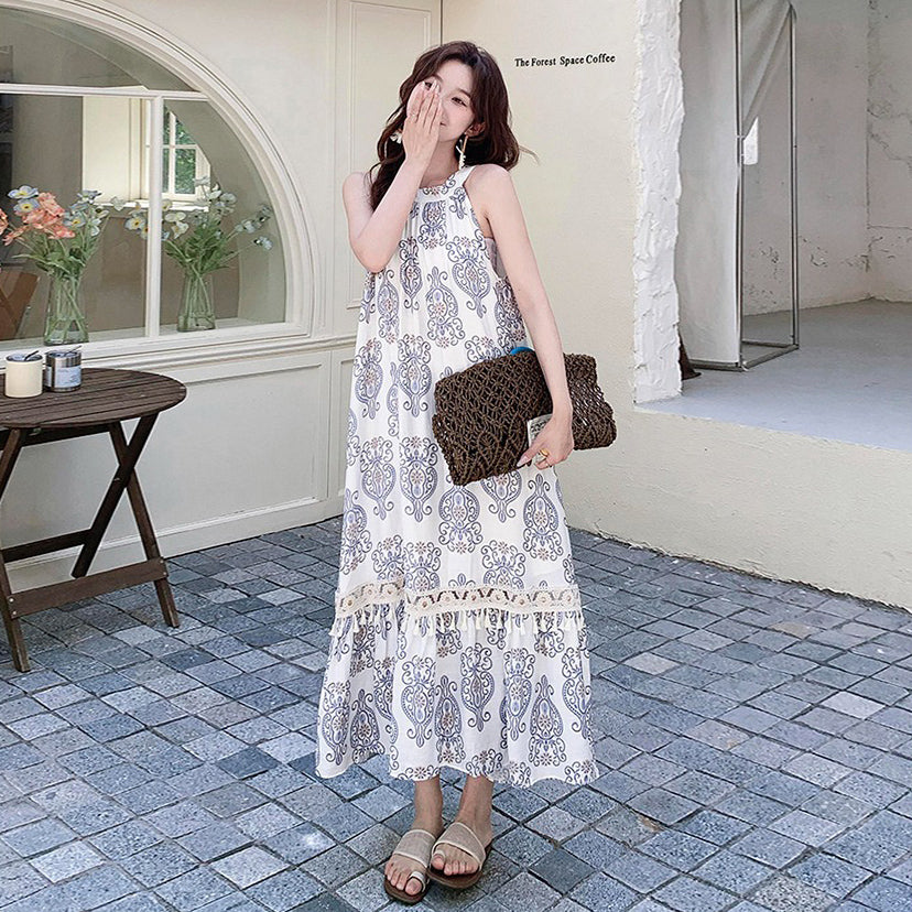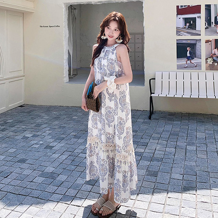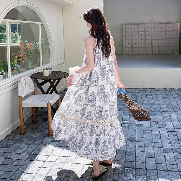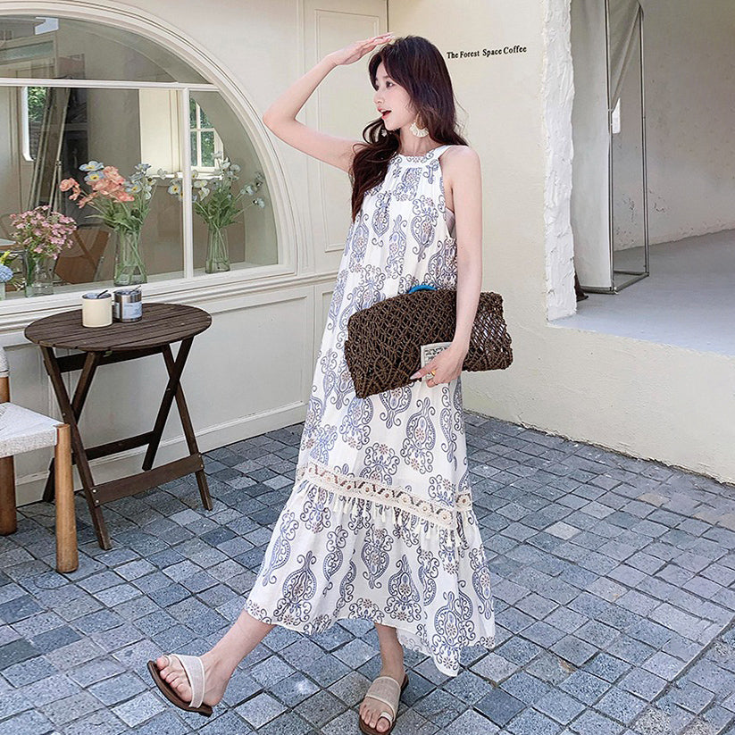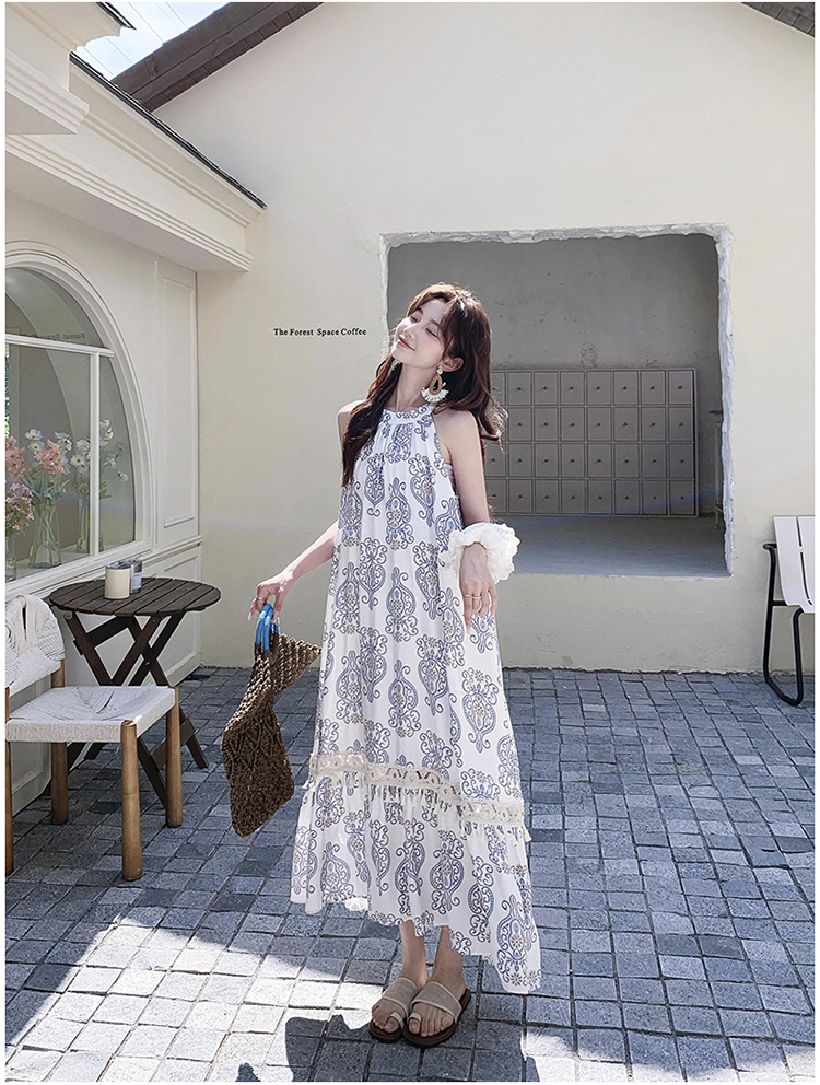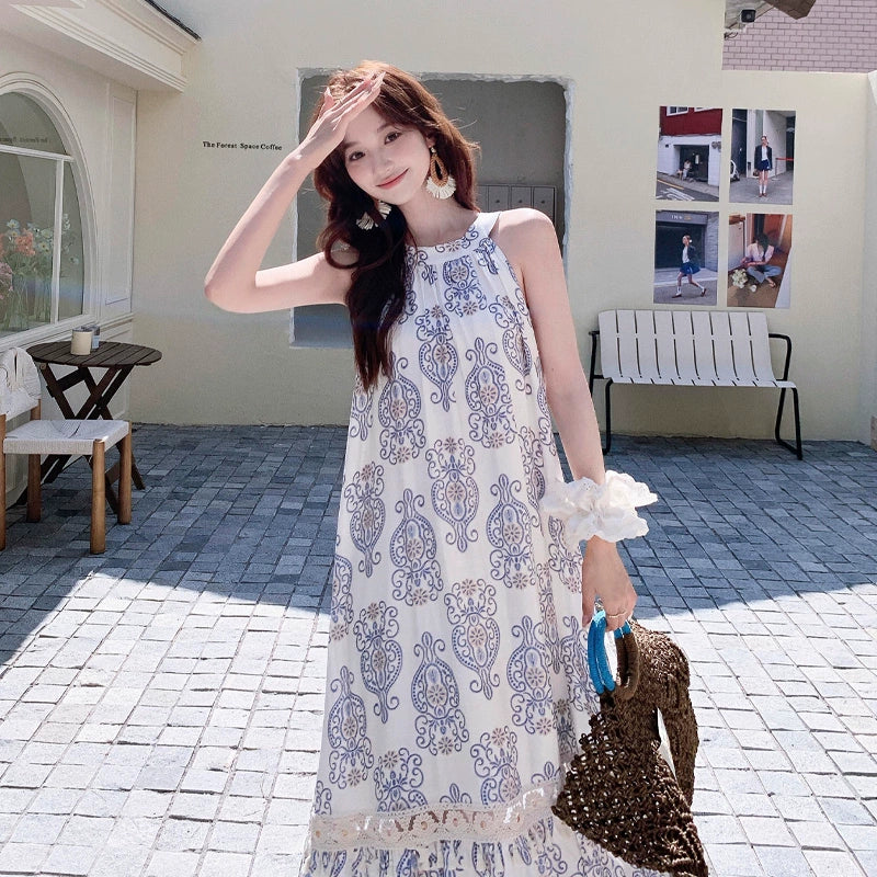 【ワンピース】高級感 青花瓷プリント 夏 刺繍 フリンジ ドレープ ノースリーブワンピース【SHシリーズ】