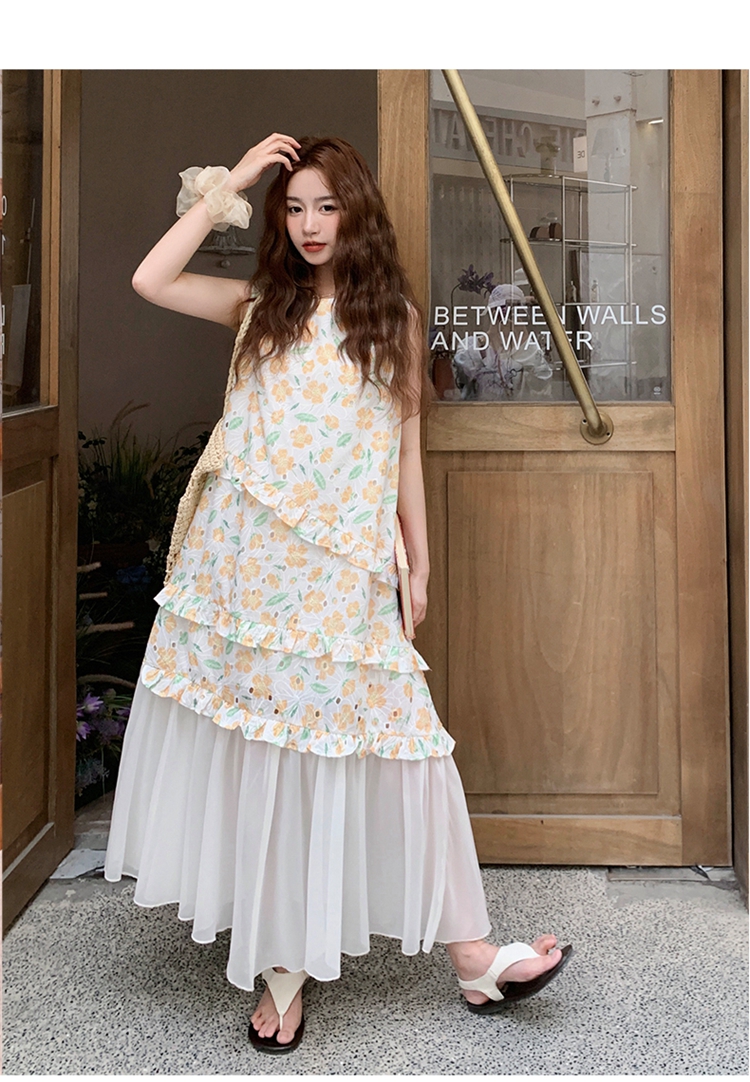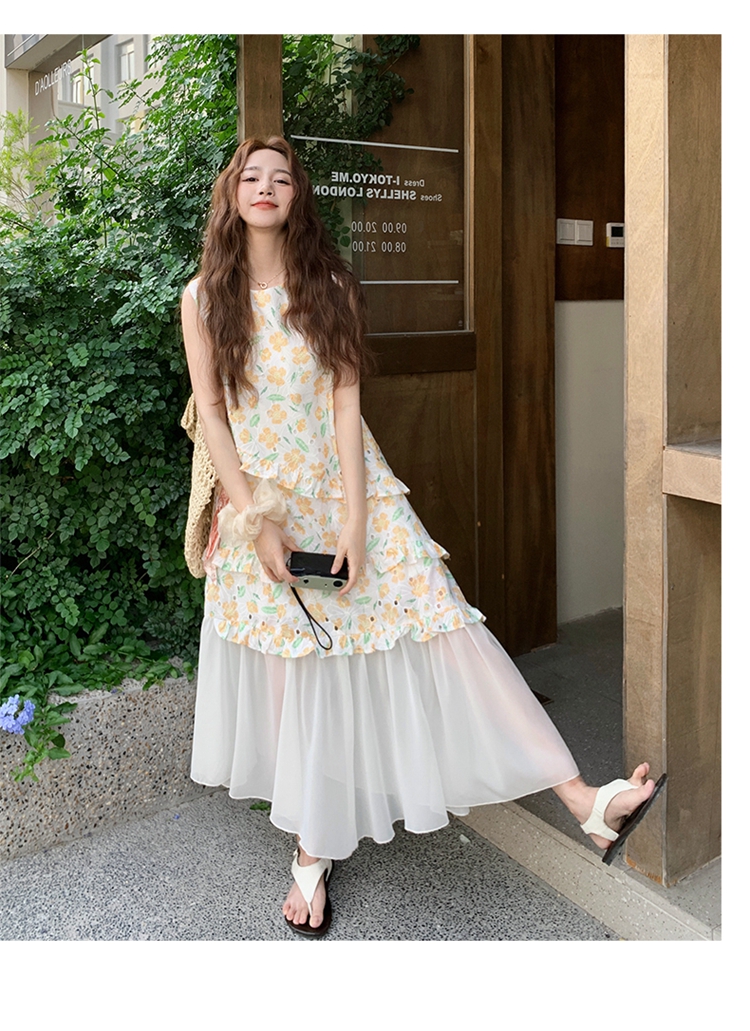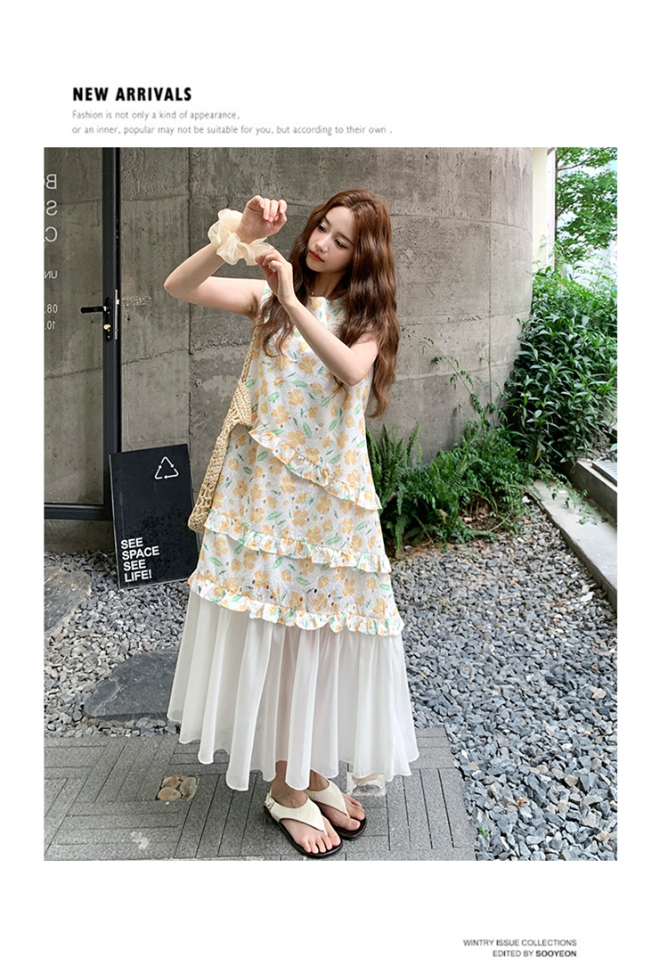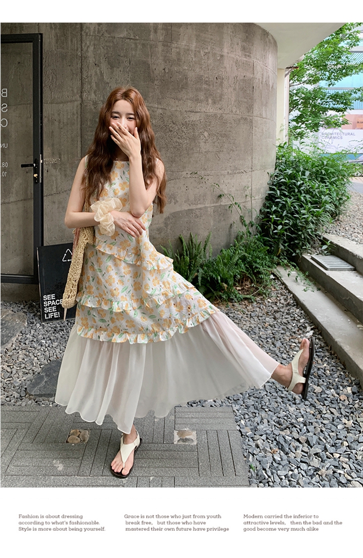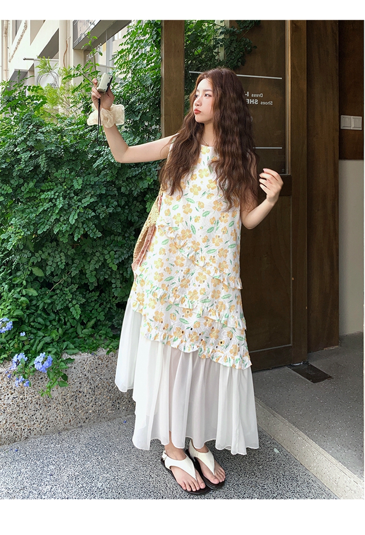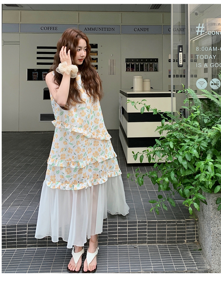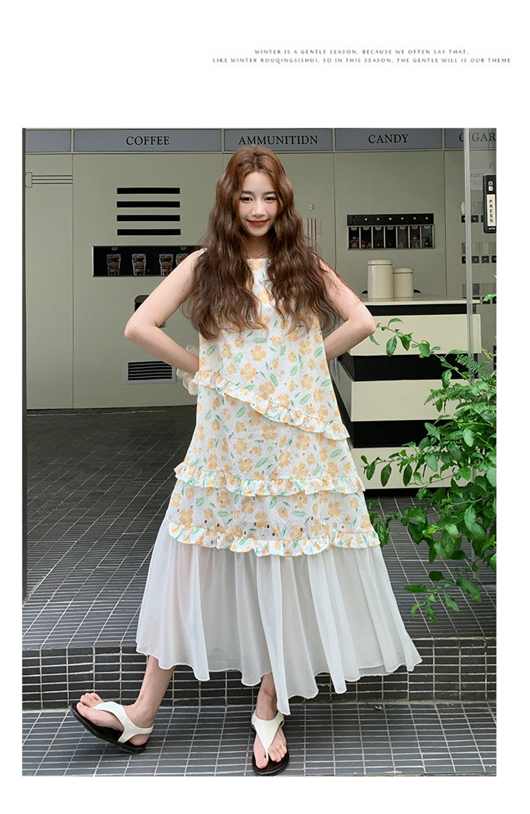 【商品名】【ワンピース】夏 かわいい メッシュ切替 ゆったり ノースリーブ フラワーワンピース【SHシリーズ】