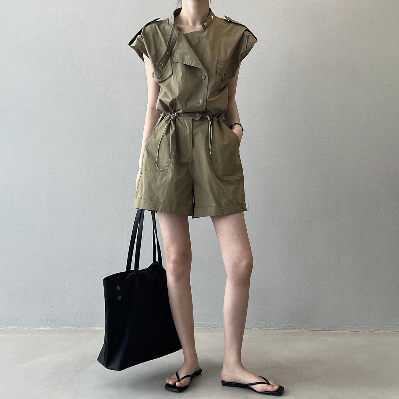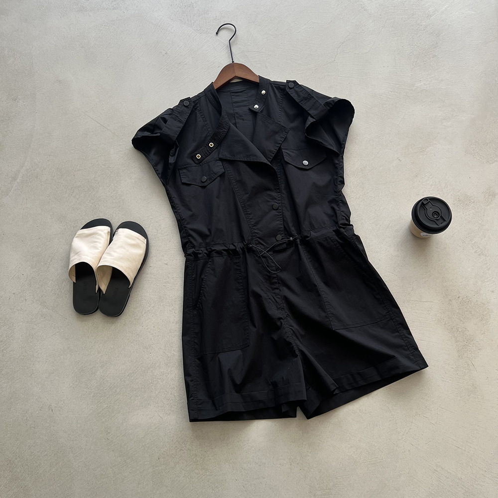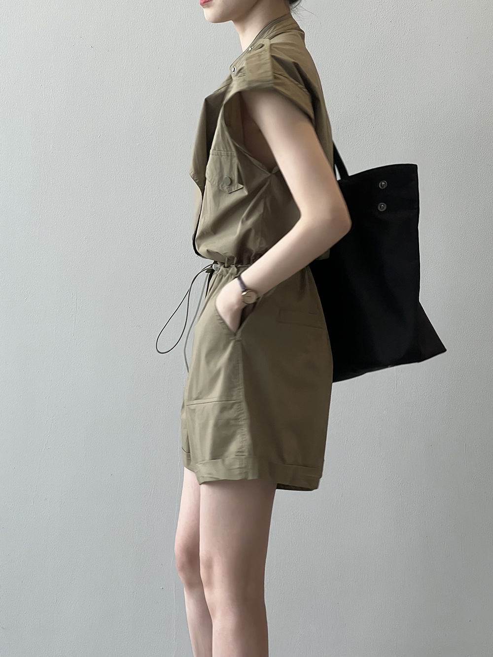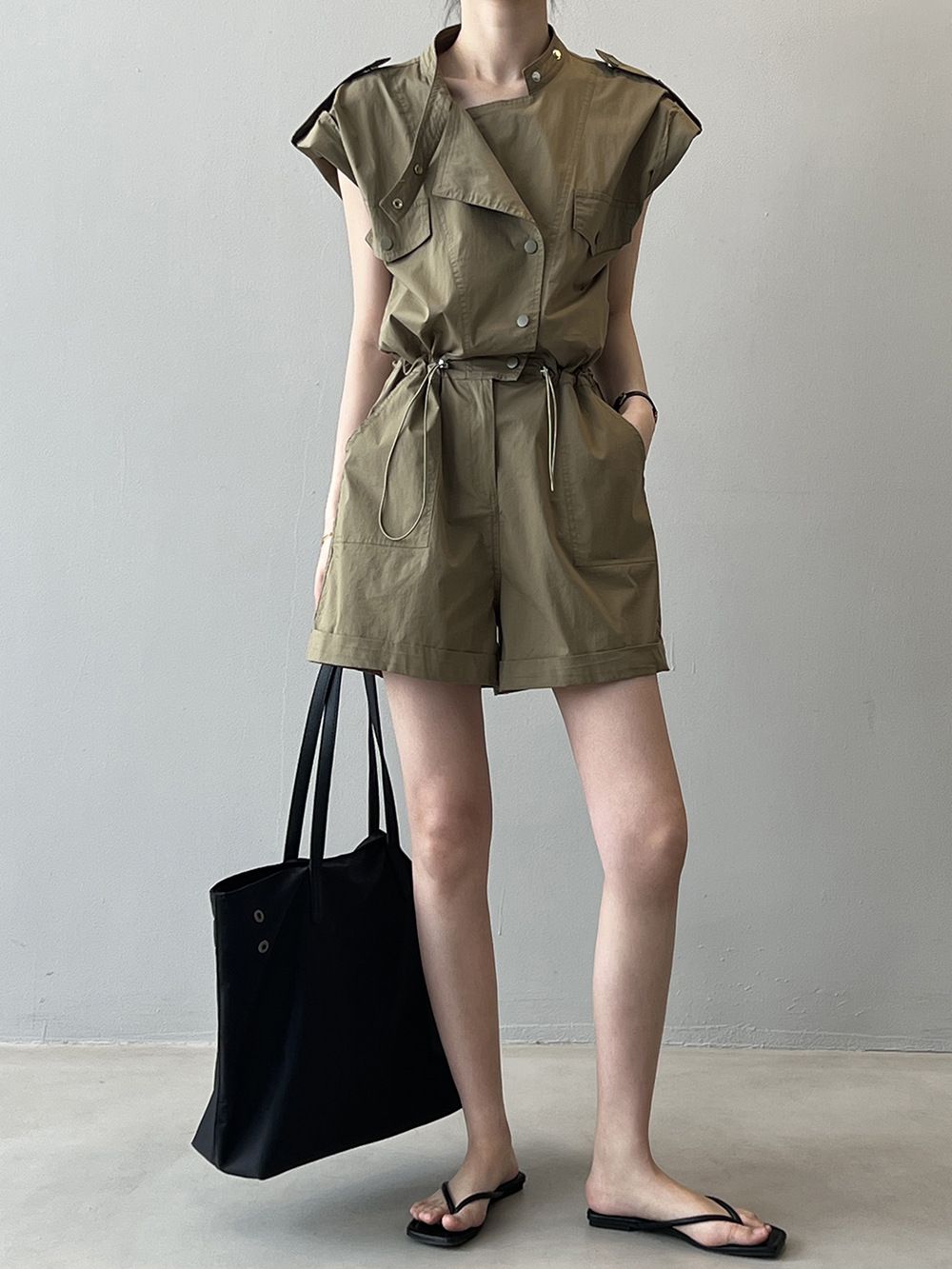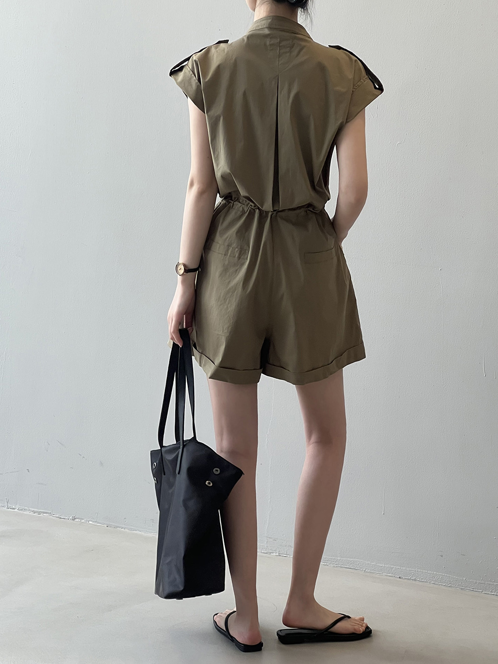 【ボトムス】ハイウエスト 夏 ワーク風 オールインワン スタンドカラー フリルスリーブ シャツ風 ショート丈ジャンプスーツ【JZシリーズ】
