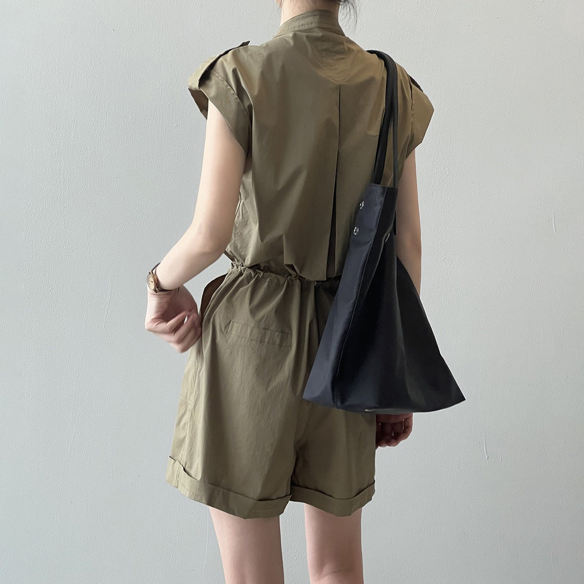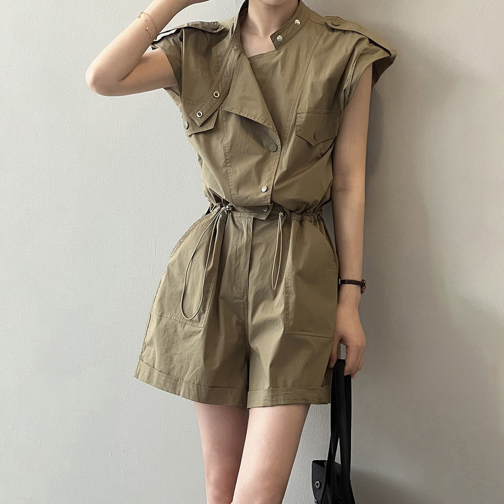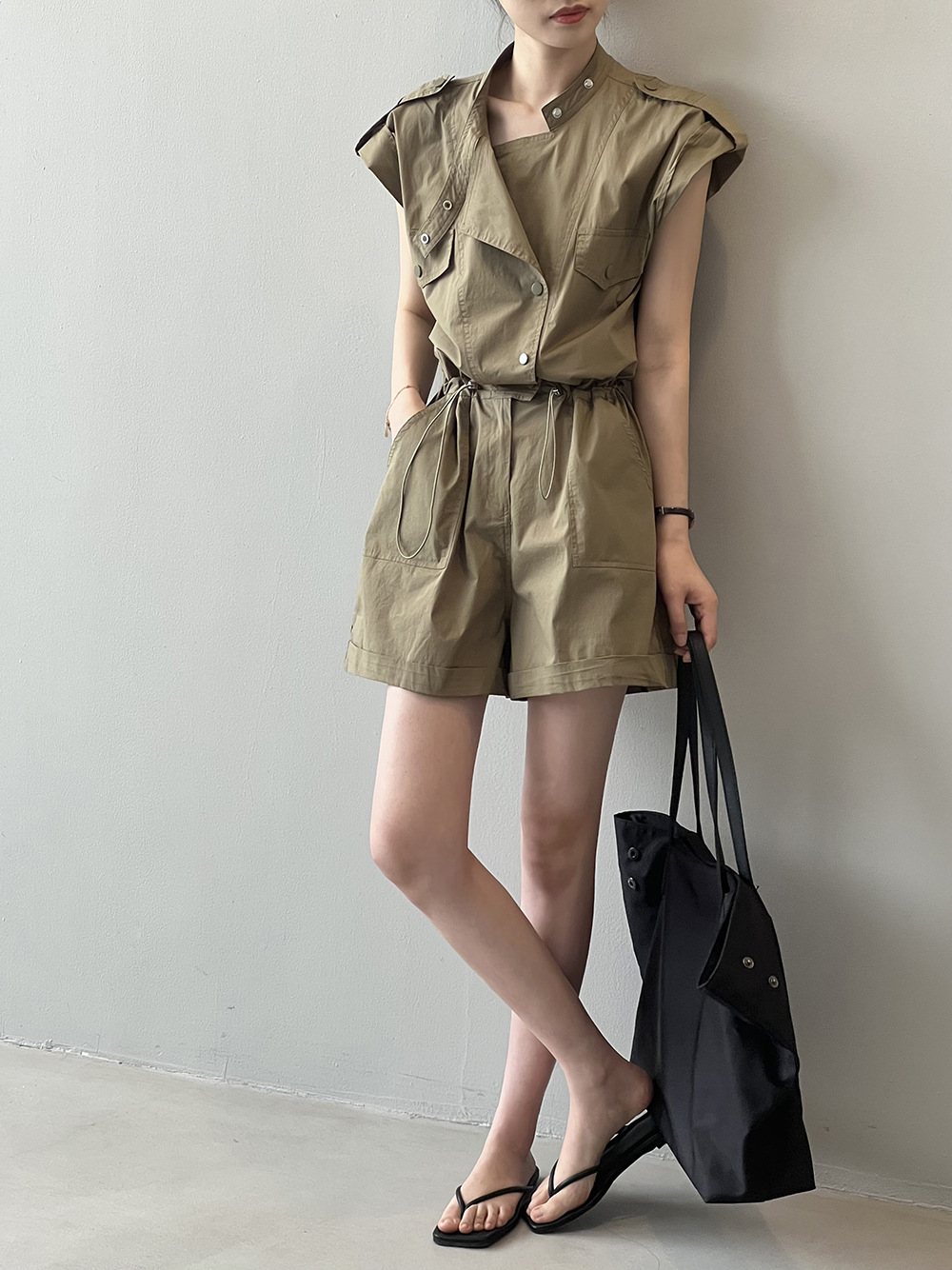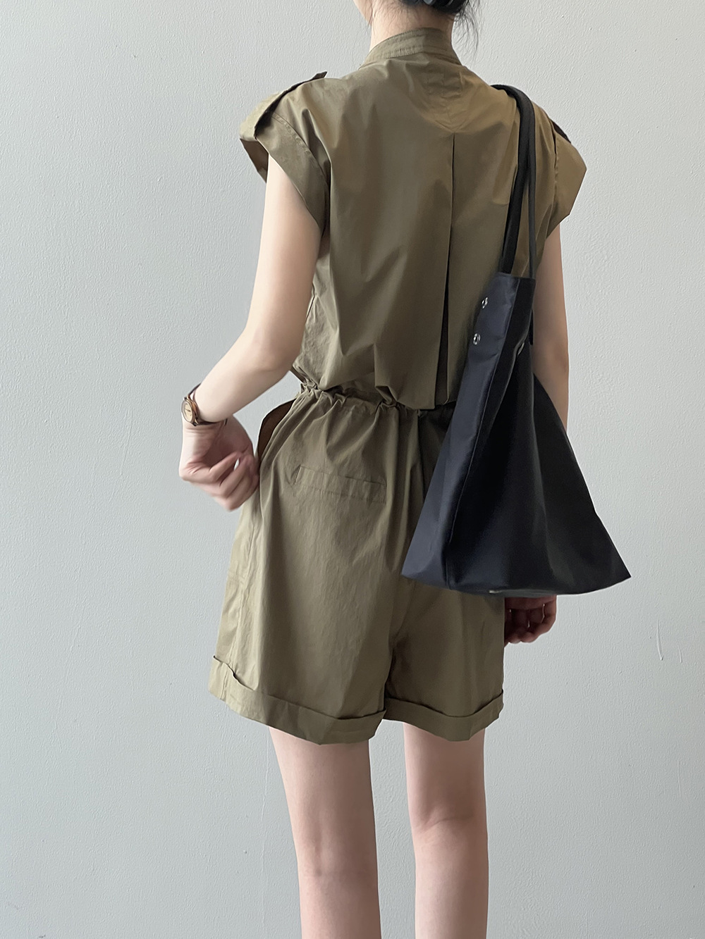 【ボトムス】ハイウエスト 夏 ワーク風 オールインワン スタンドカラー フリルスリーブ シャツ風 ショート丈ジャンプスーツ【JZシリーズ】