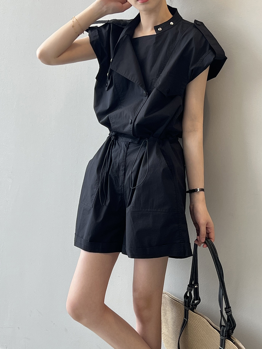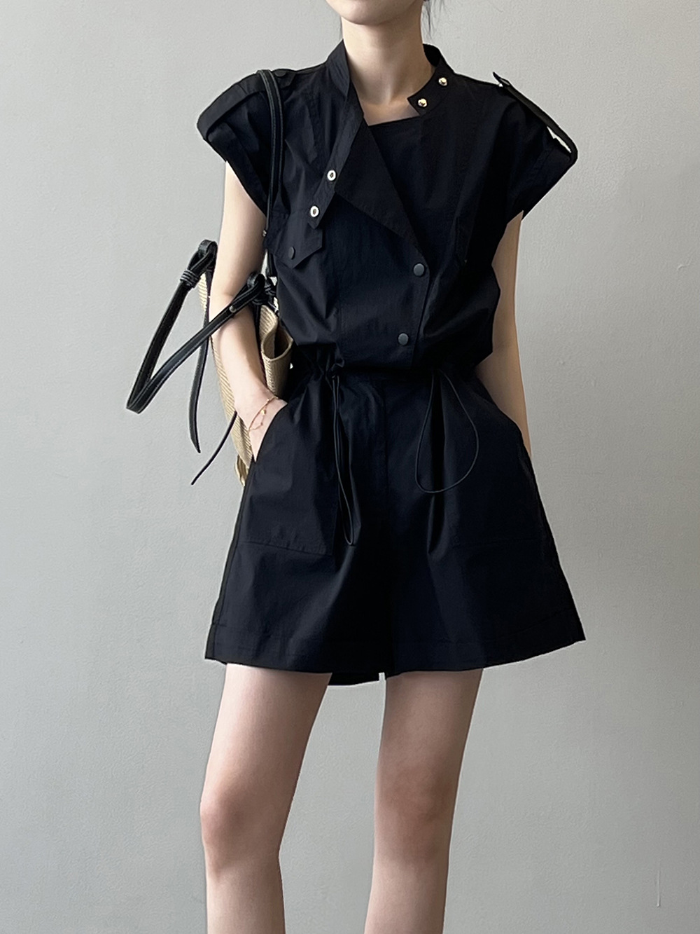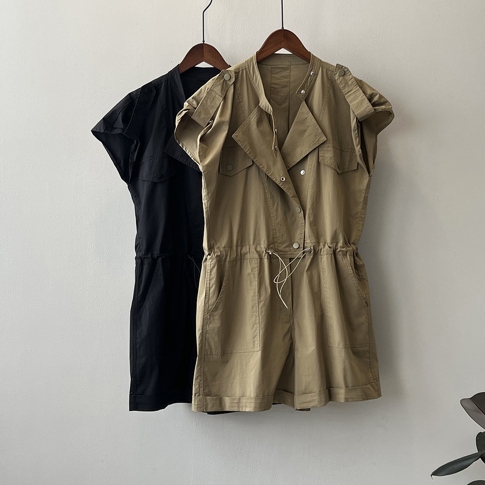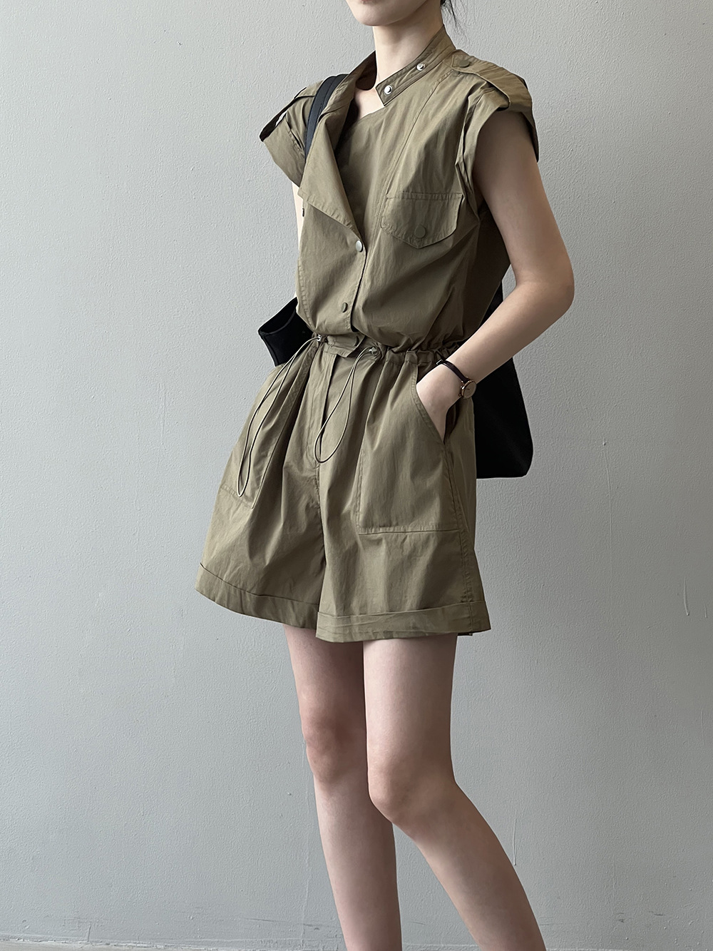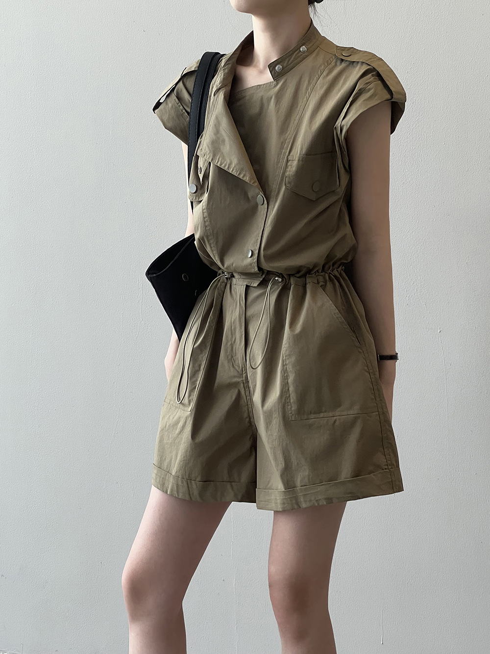 【ボトムス】ハイウエスト 夏 ワーク風 オールインワン スタンドカラー フリルスリーブ シャツ風 ショート丈ジャンプスーツ【JZシリーズ】