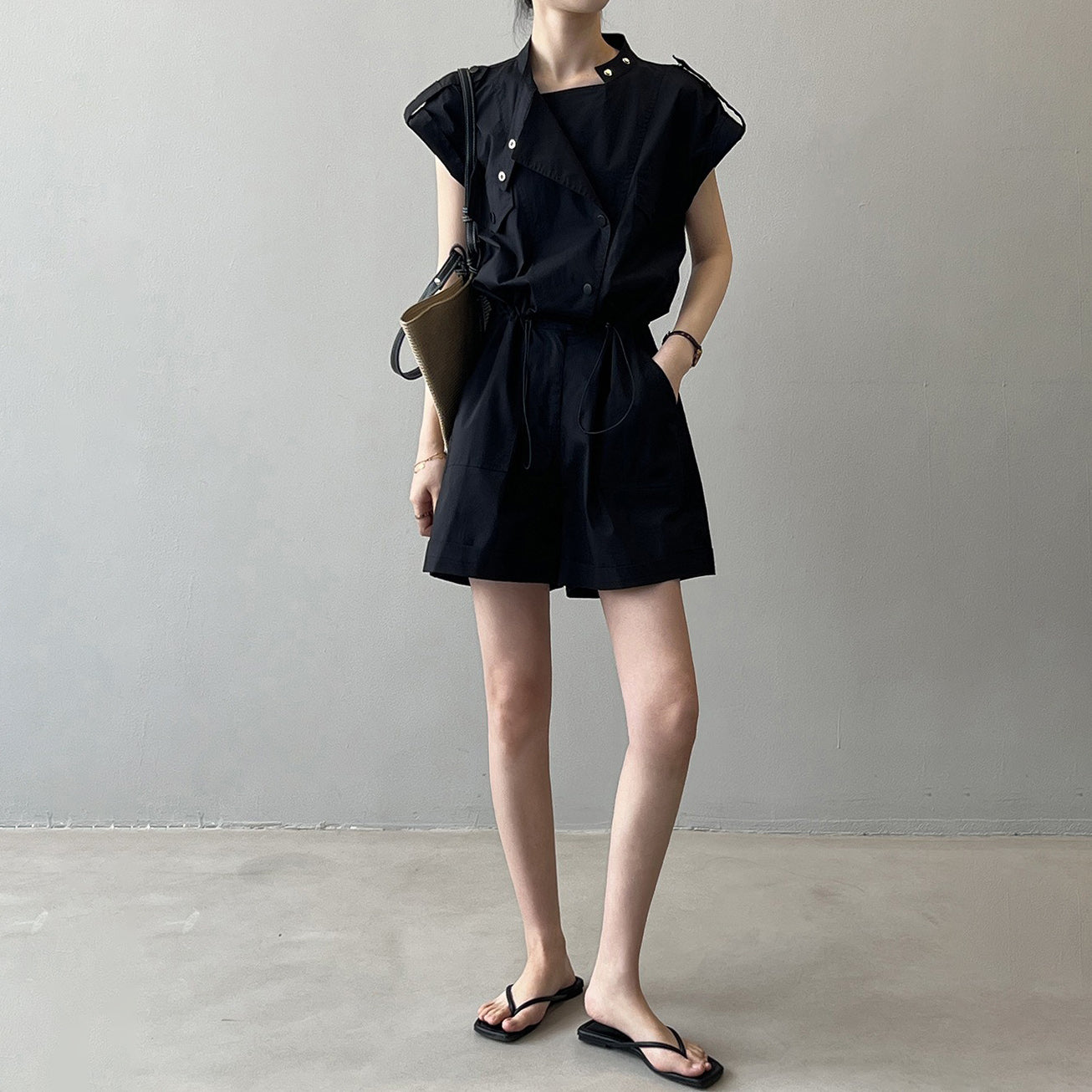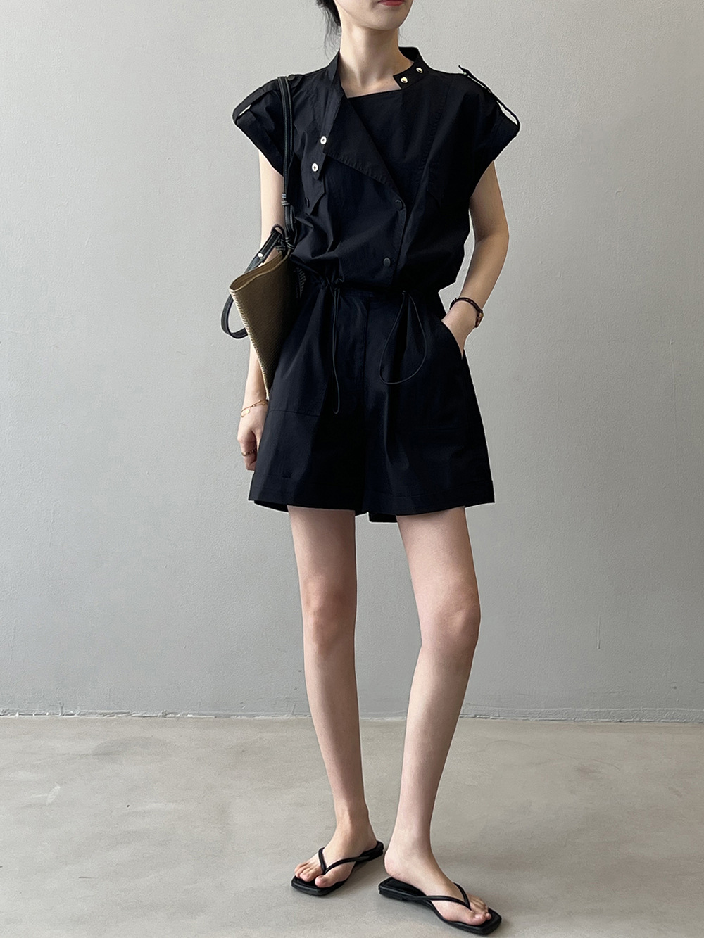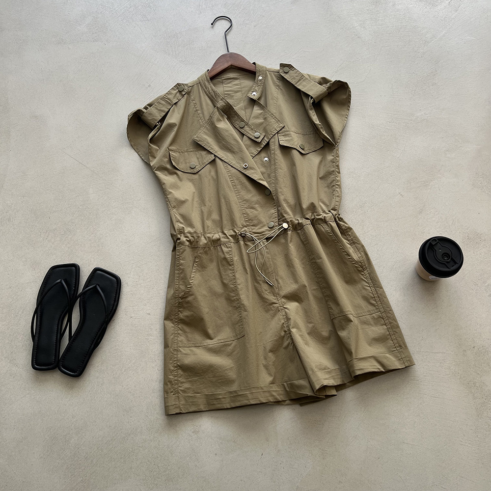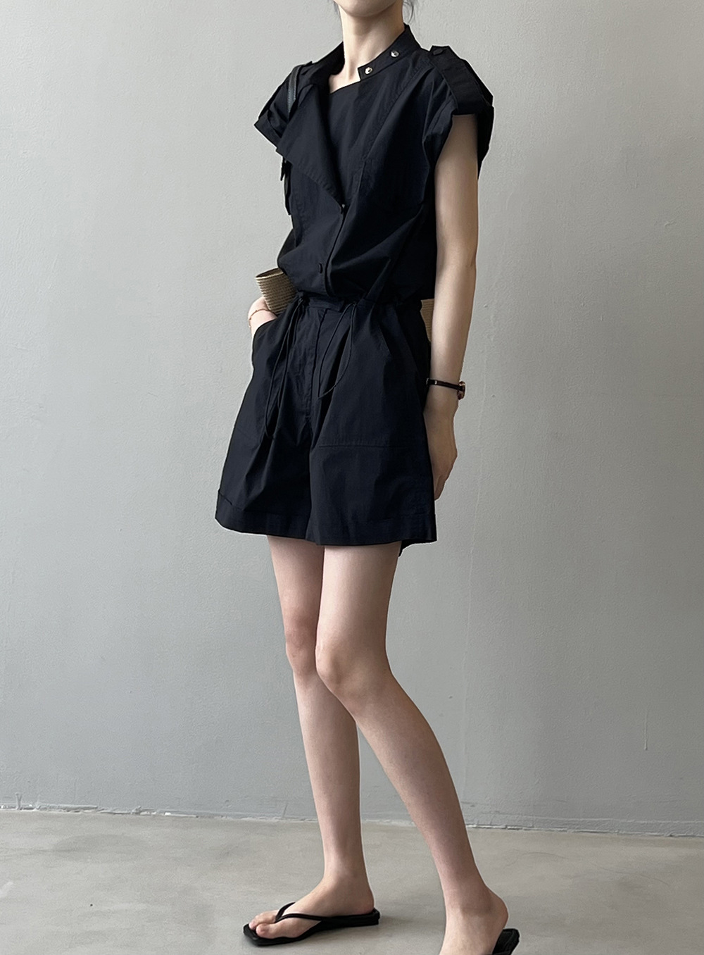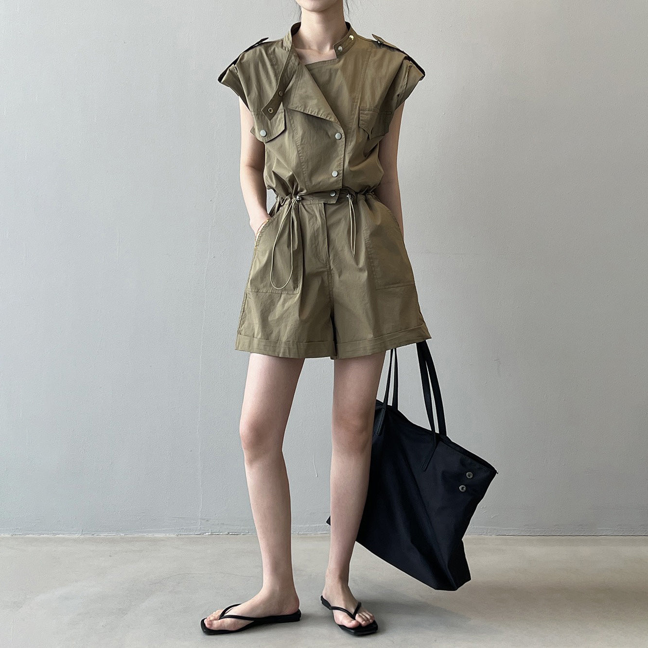 【ボトムス】ハイウエスト 夏 ワーク風 オールインワン スタンドカラー フリルスリーブ シャツ風 ショート丈ジャンプスーツ【JZシリーズ】