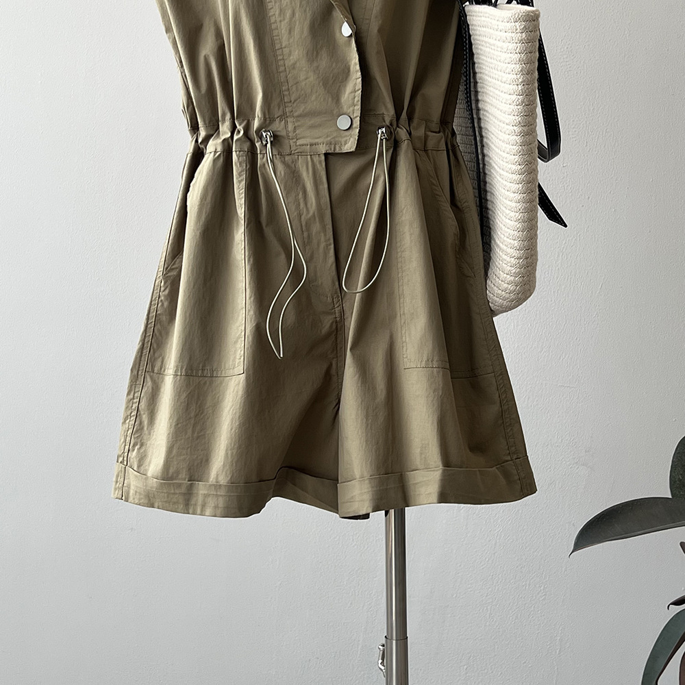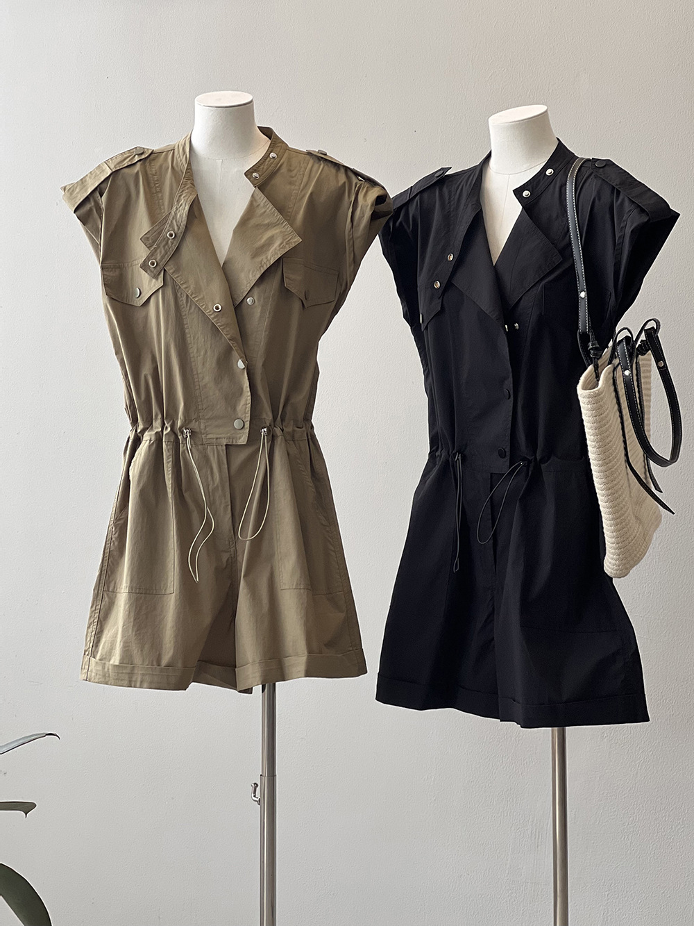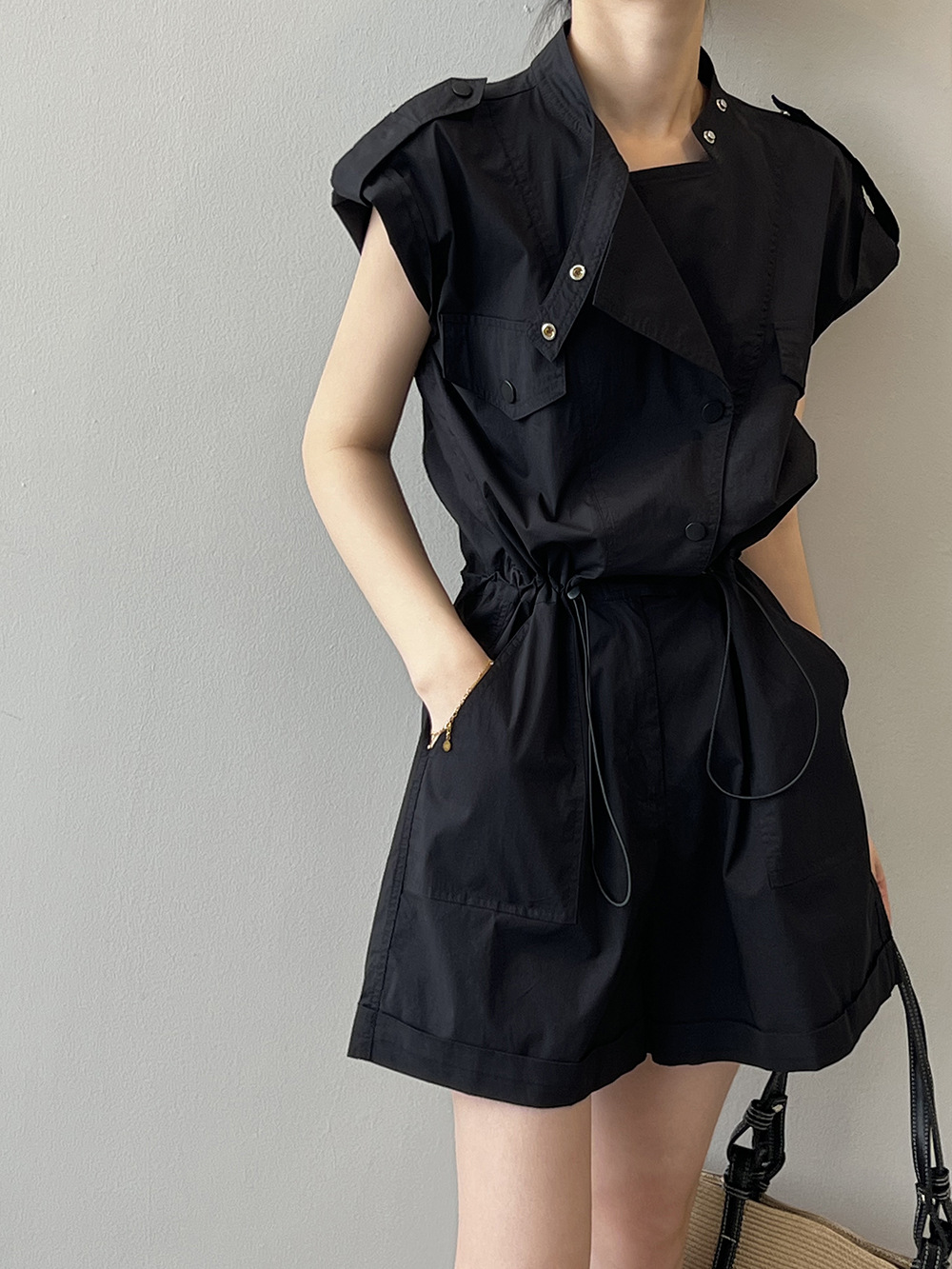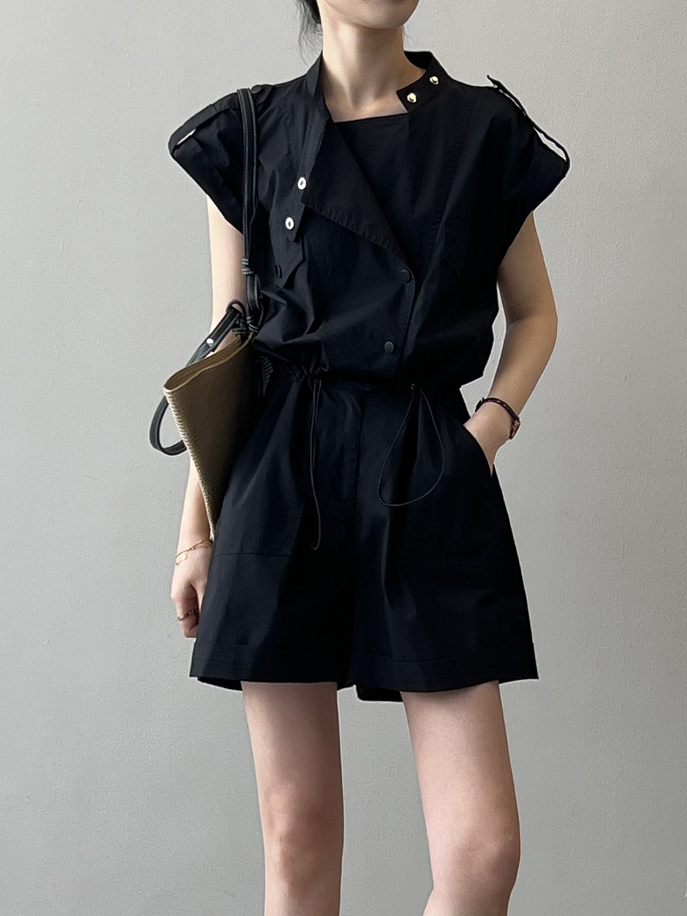 【ボトムス】ハイウエスト 夏 ワーク風 オールインワン スタンドカラー フリルスリーブ シャツ風 ショート丈ジャンプスーツ【JZシリーズ】