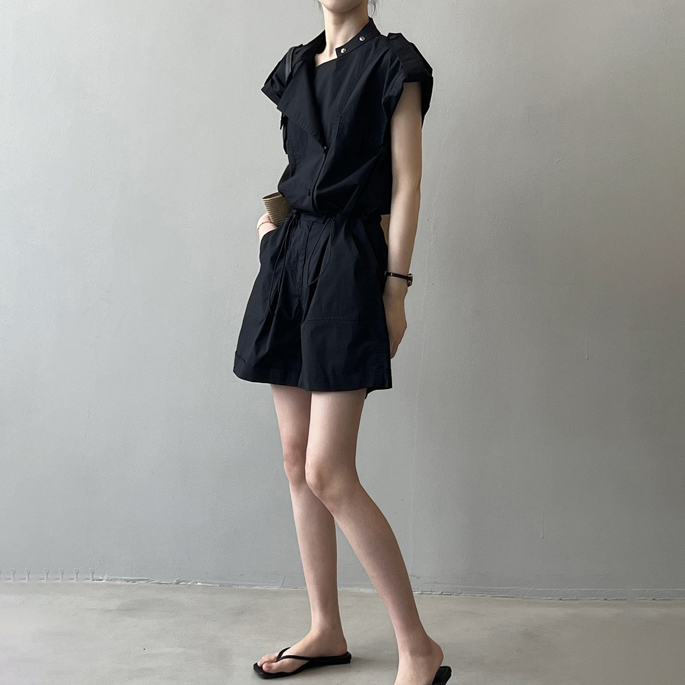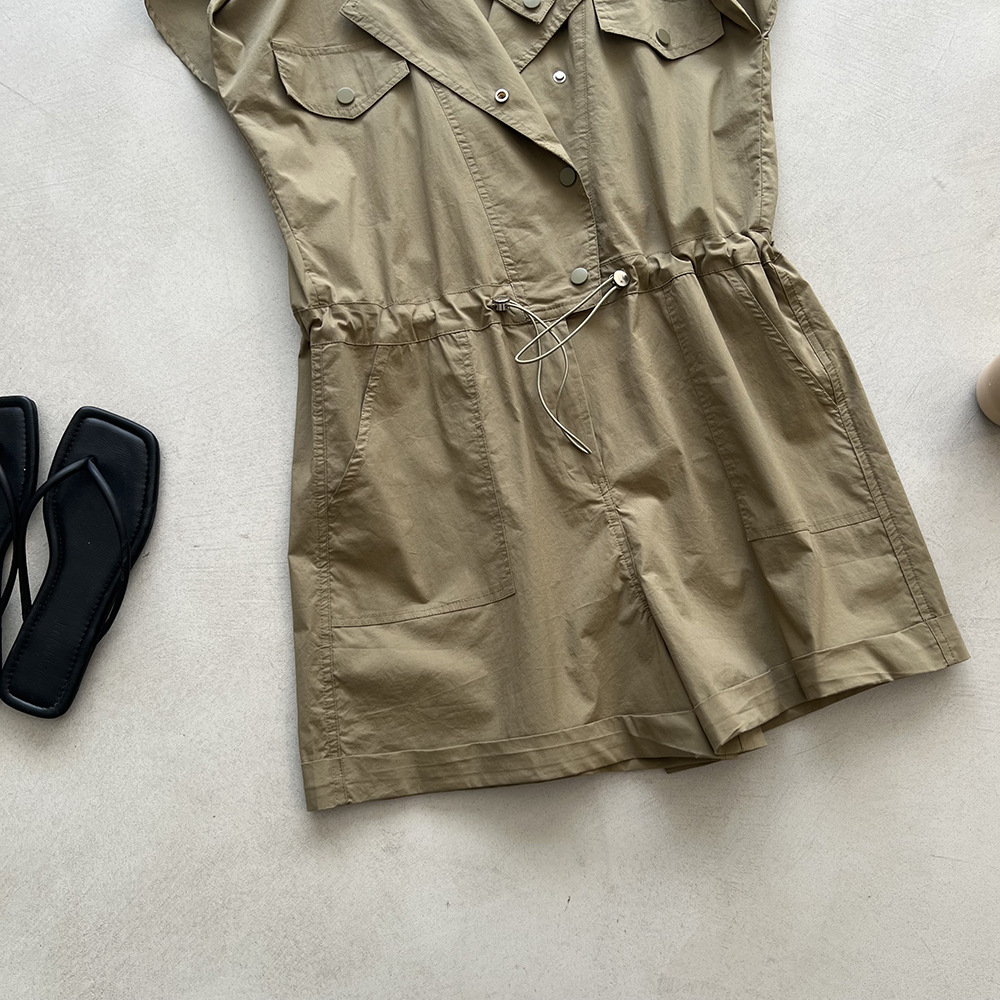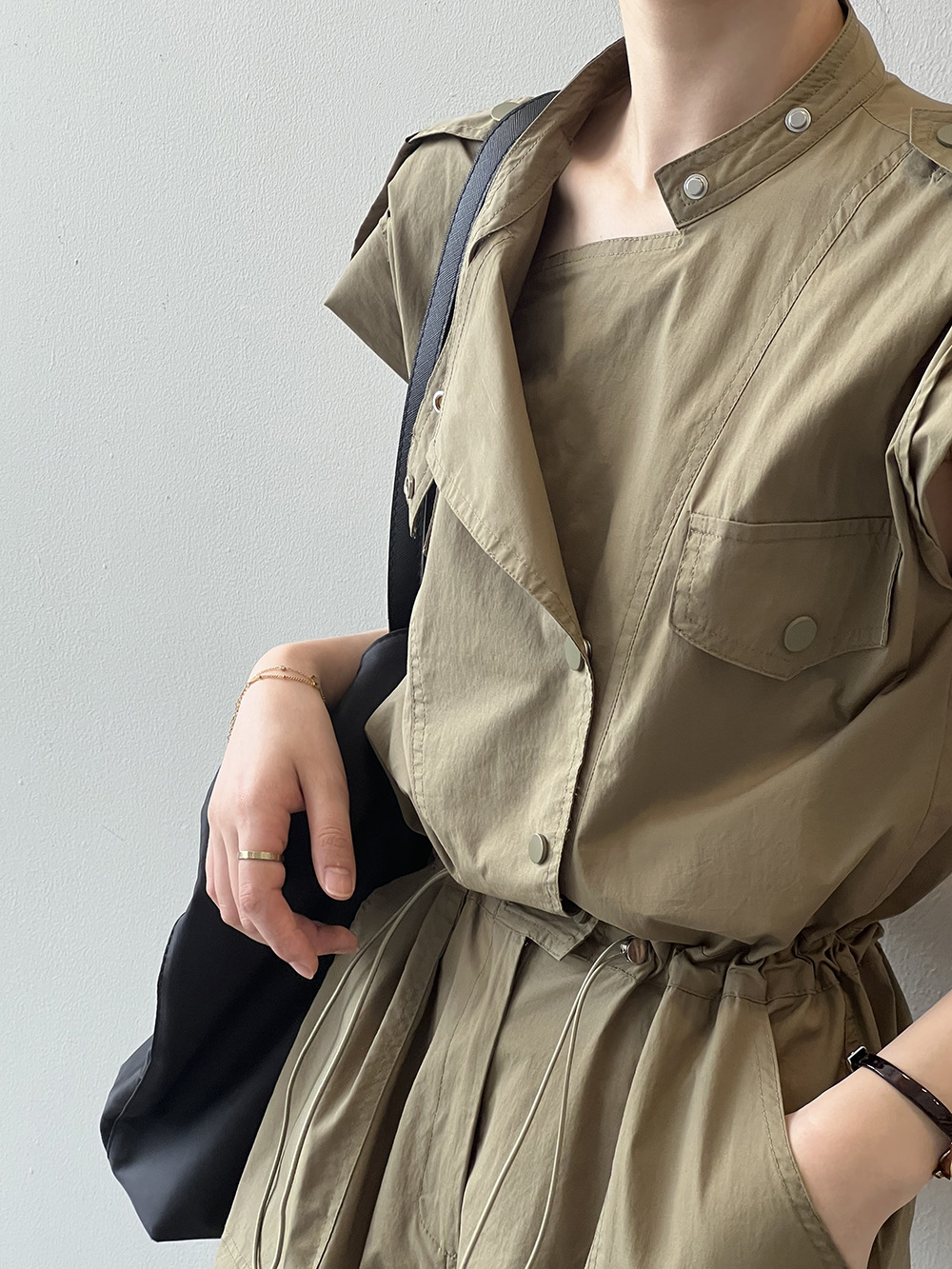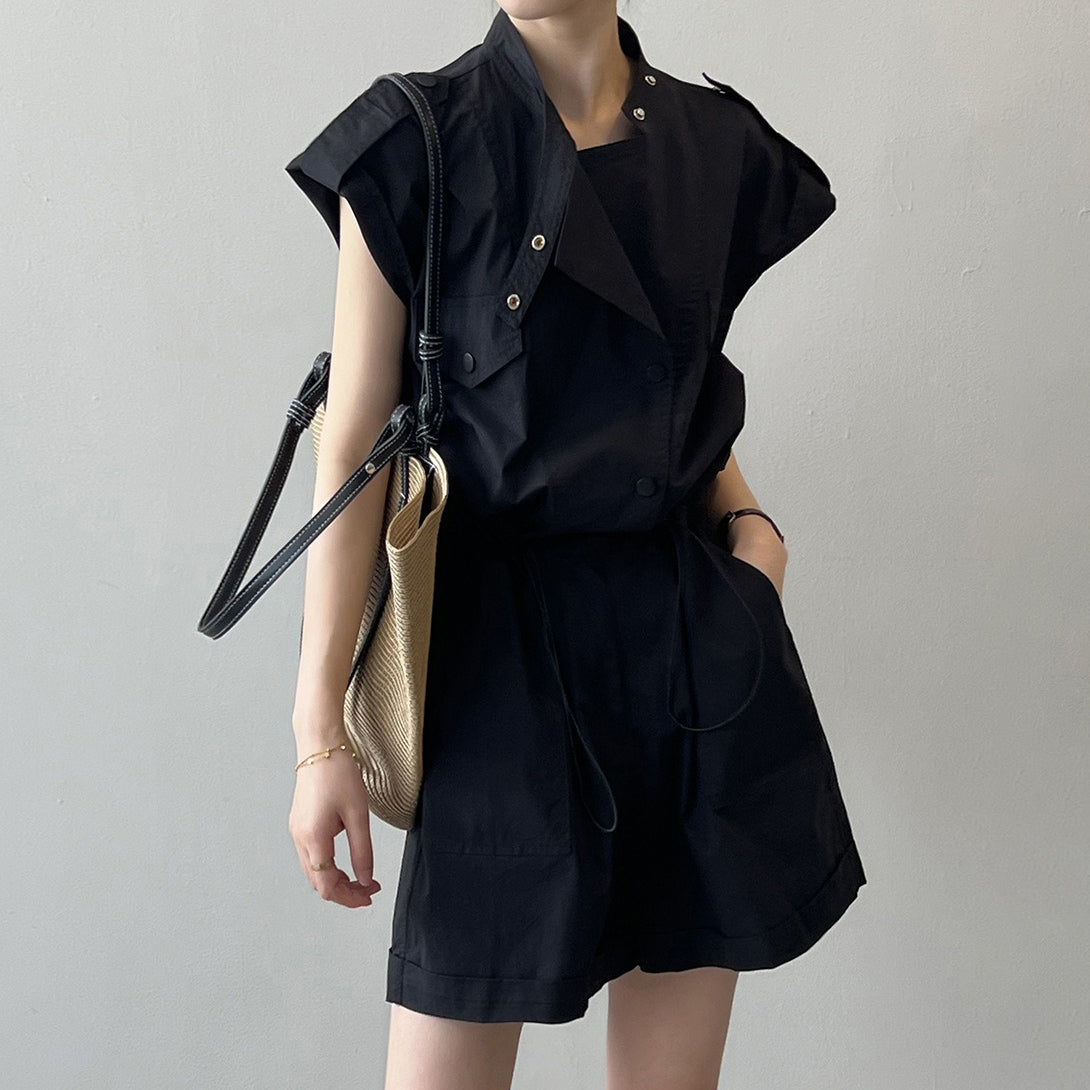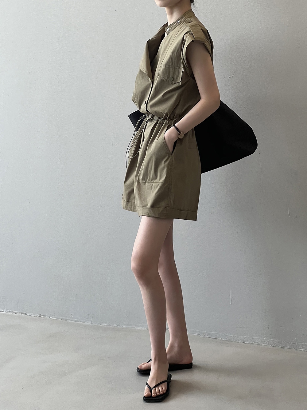 【ボトムス】ハイウエスト 夏 ワーク風 オールインワン スタンドカラー フリルスリーブ シャツ風 ショート丈ジャンプスーツ【JZシリーズ】