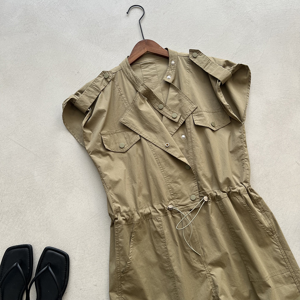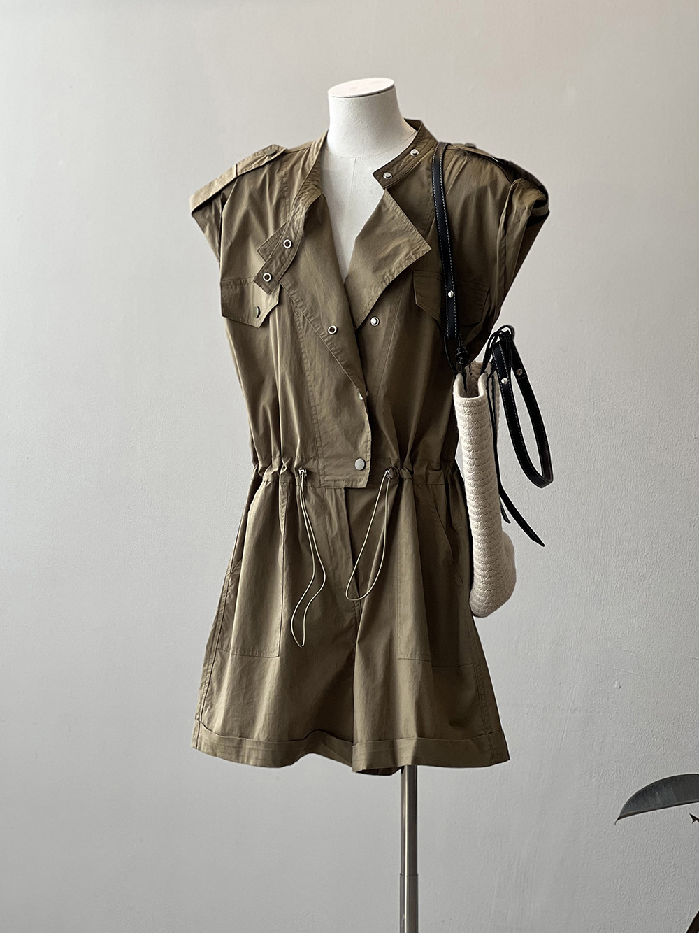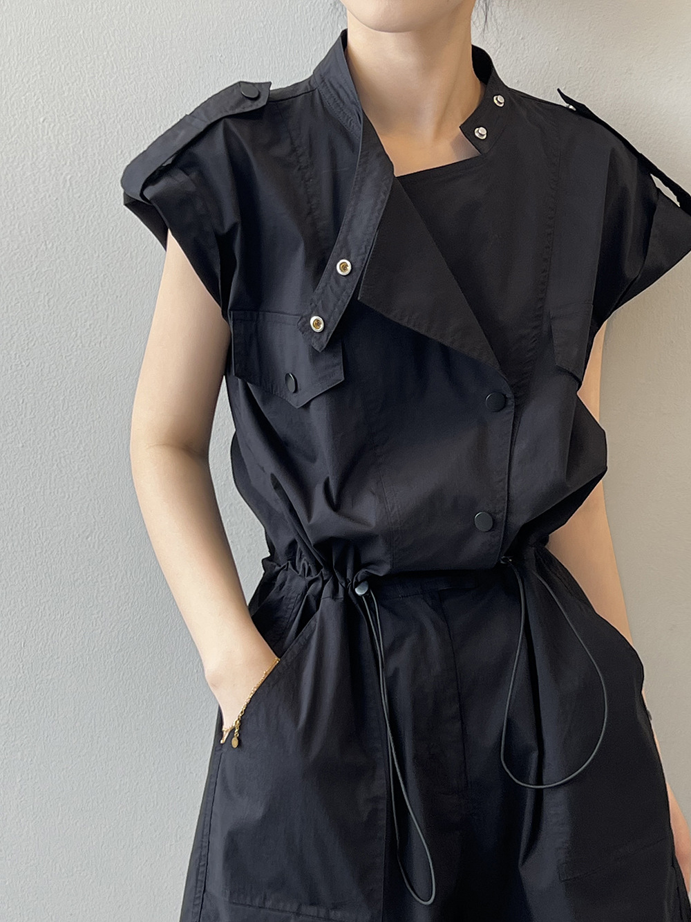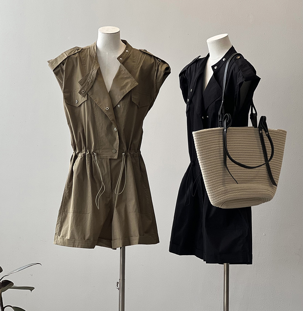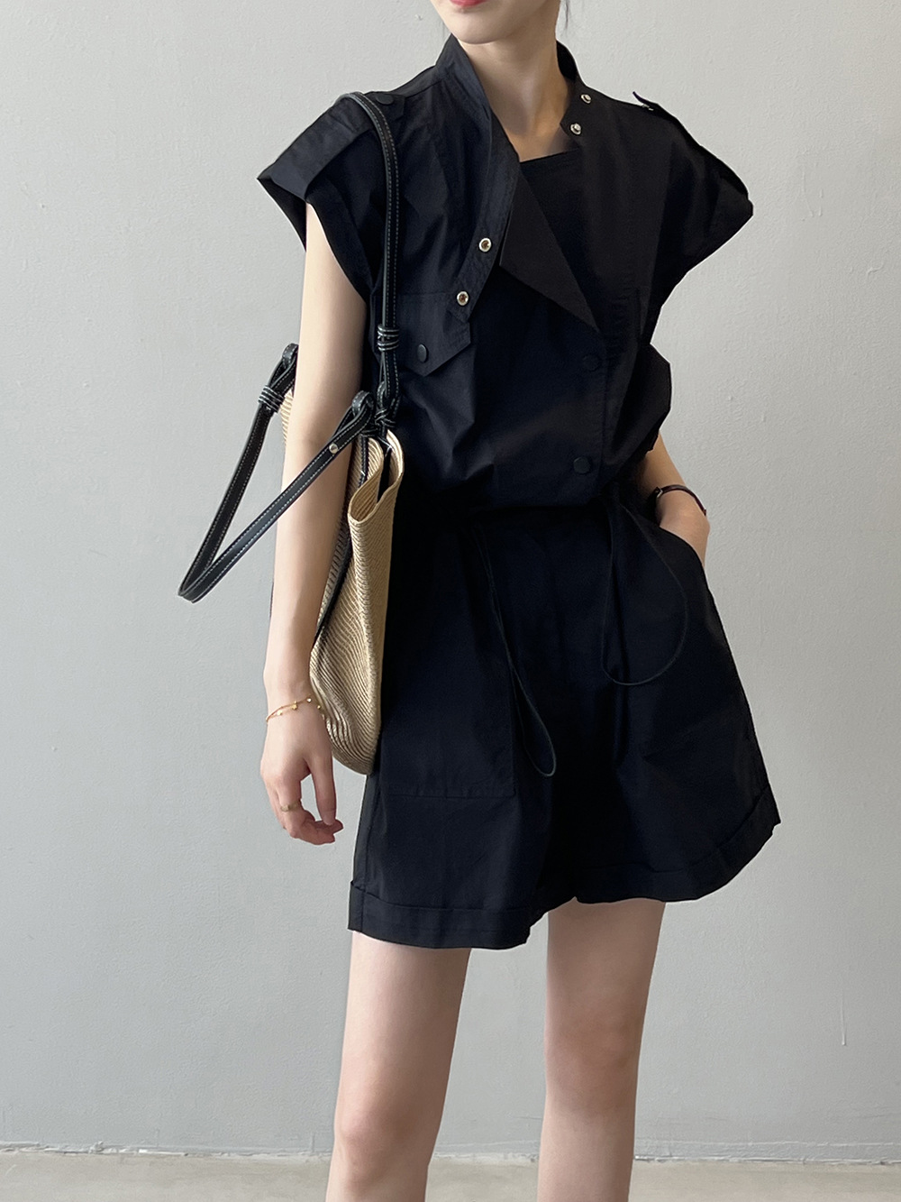【ボトムス】ハイウエスト 夏 ワーク風 オールインワン スタンドカラー フリルスリーブ シャツ風 ショート丈ジャンプスーツ【JZシリーズ】